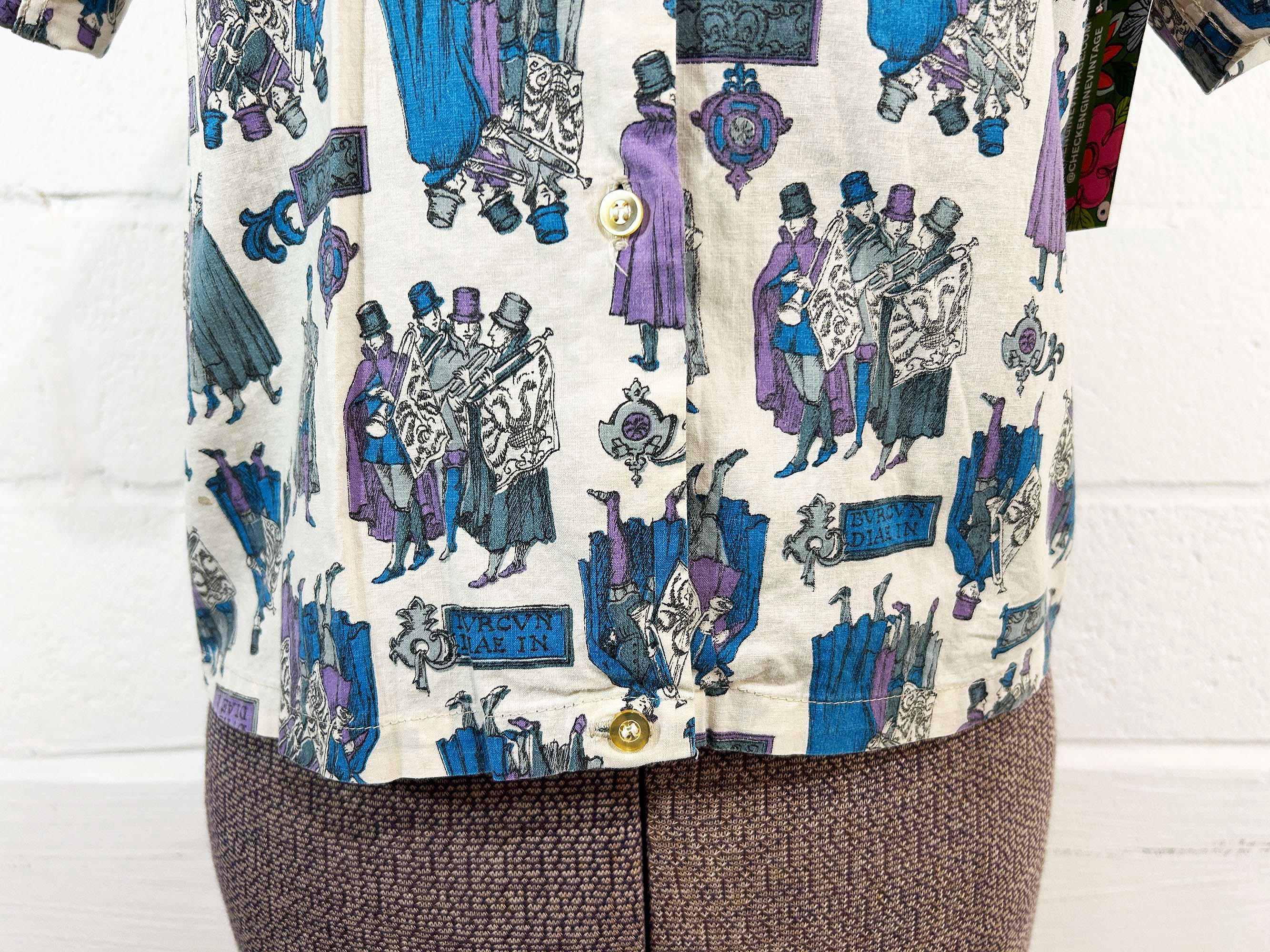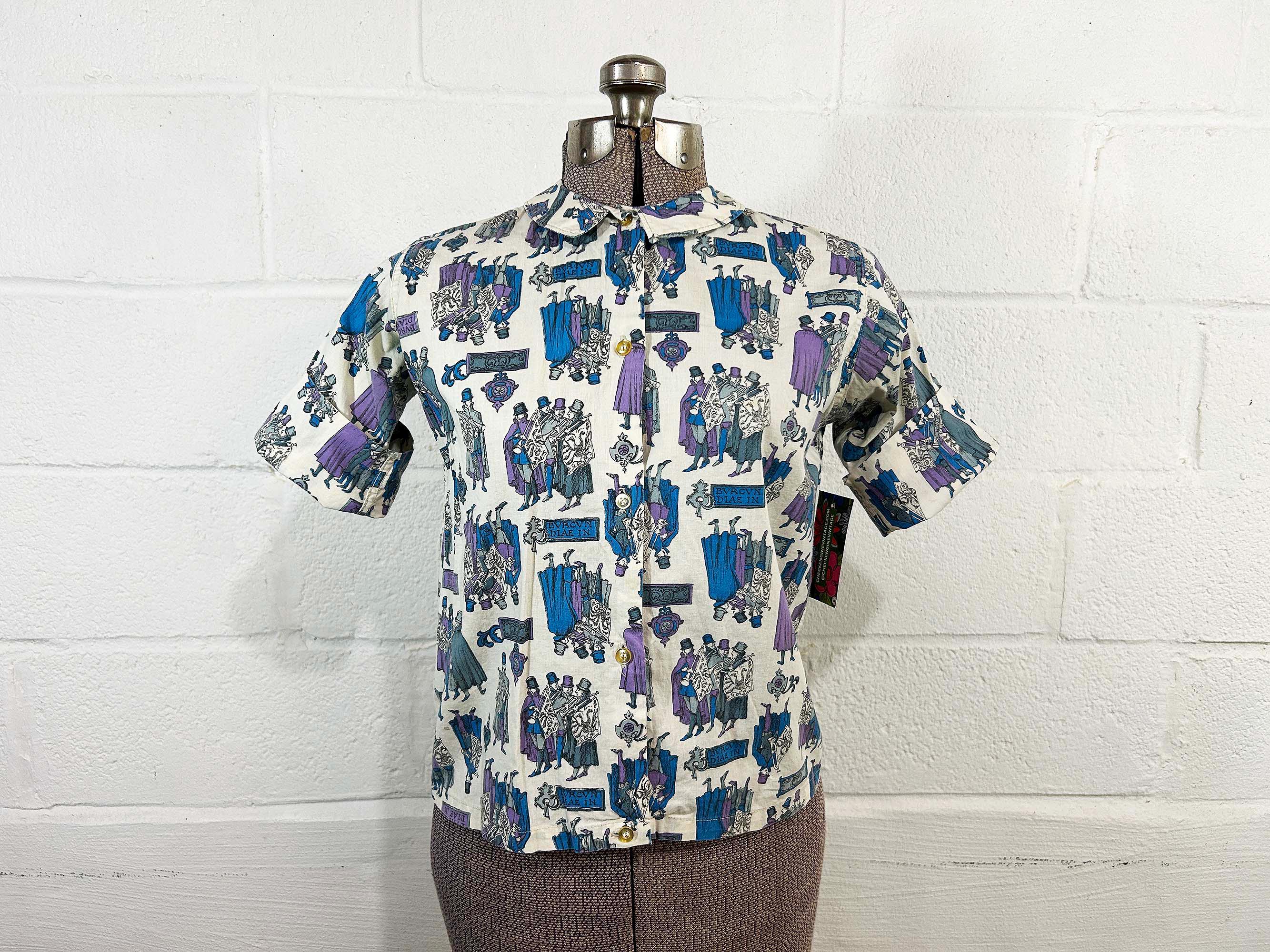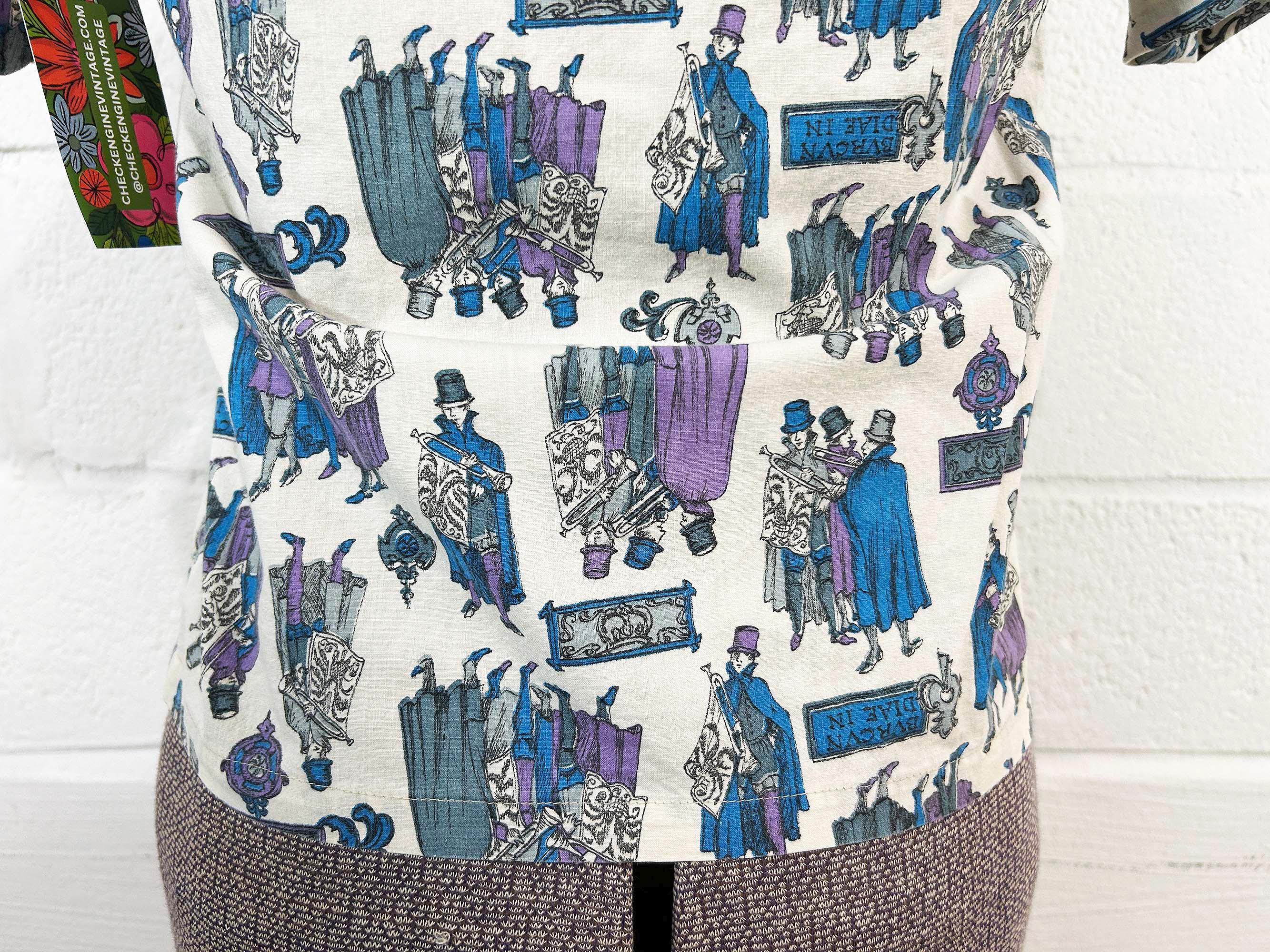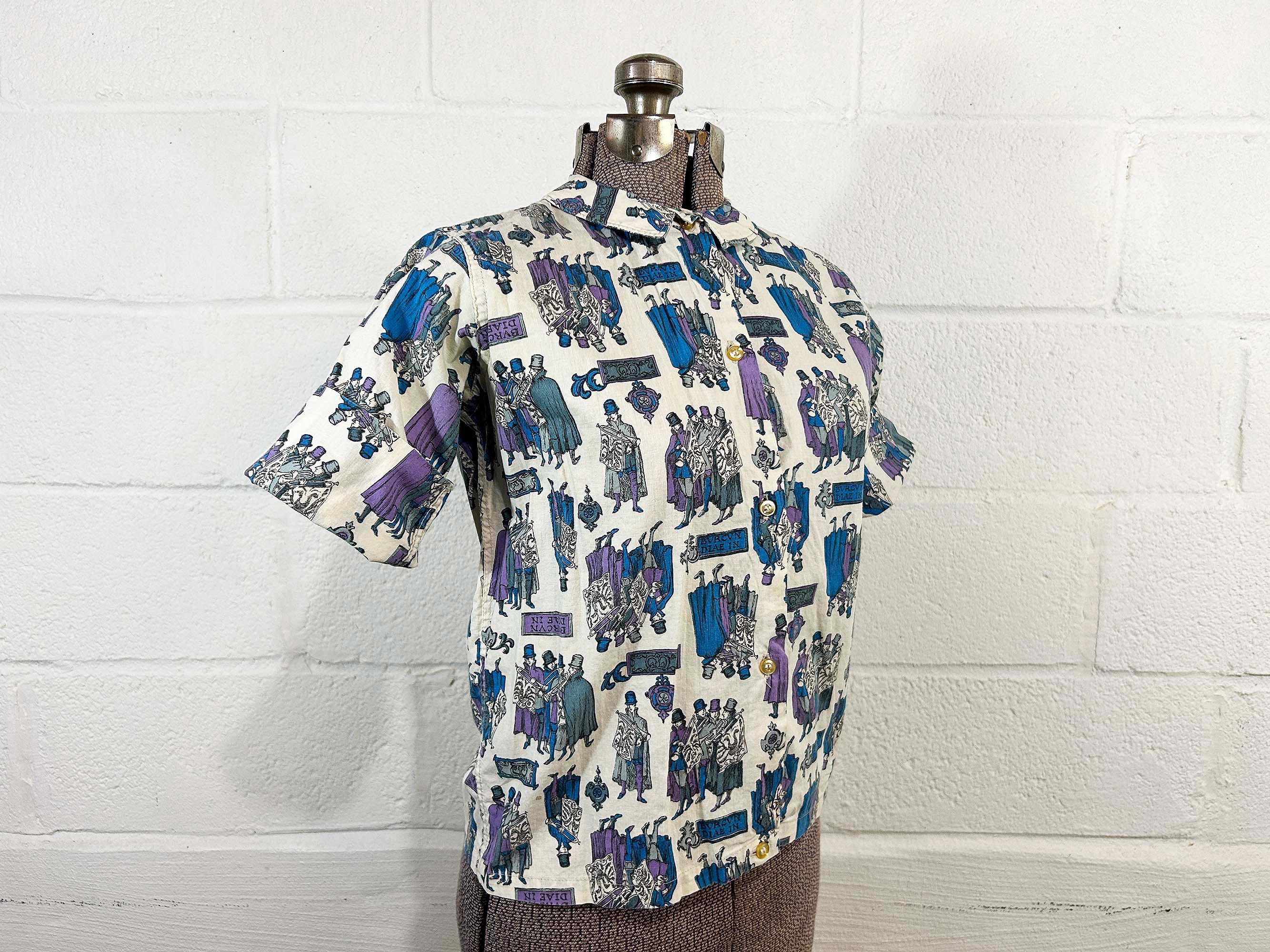 Cute short sleeve button down shirt with a pattern showing fashionable Victorian era musicians. Straight bottom hem with a cute small collar. In good shape with no significant flaws. Fabric has no stretch.