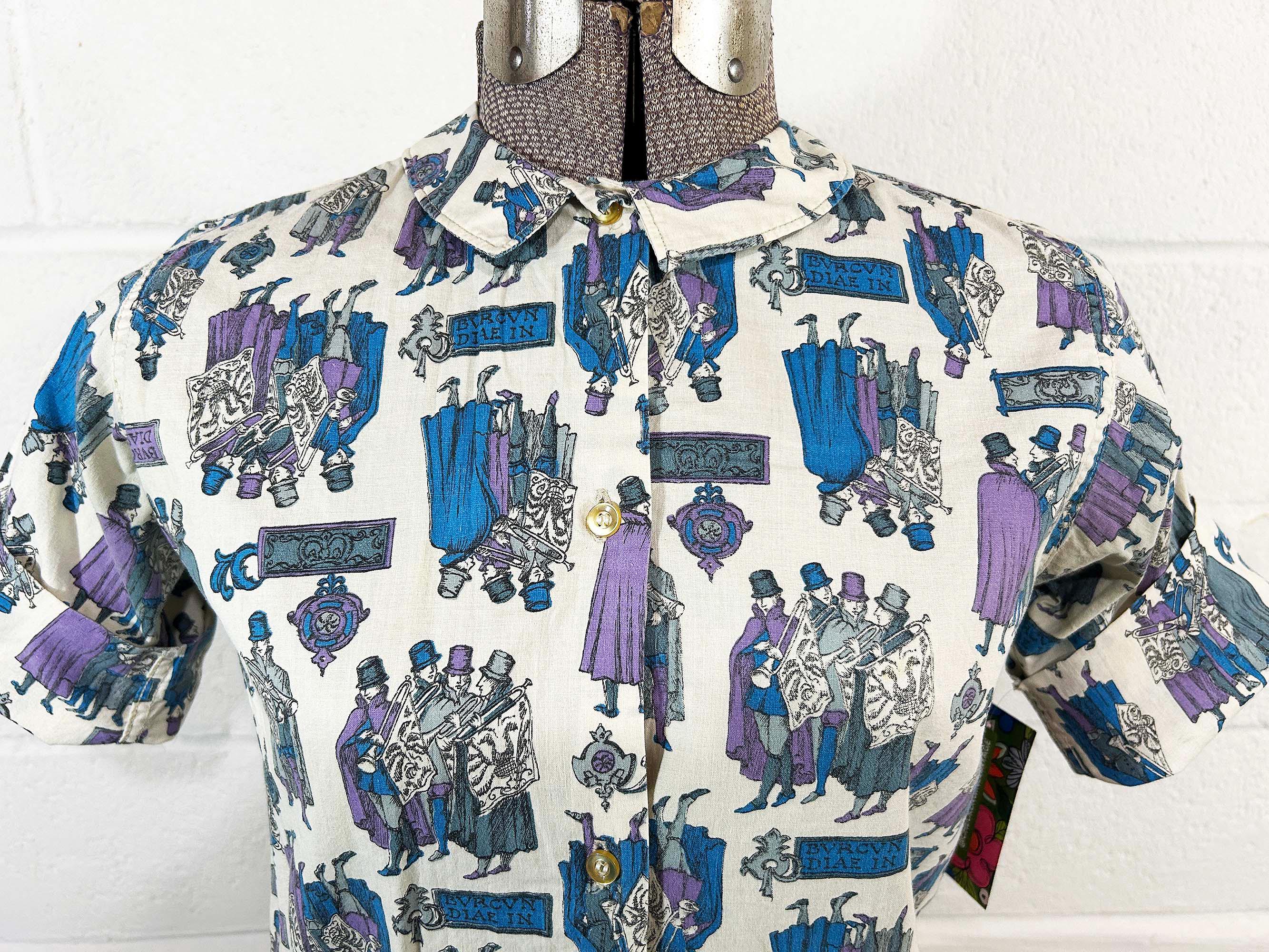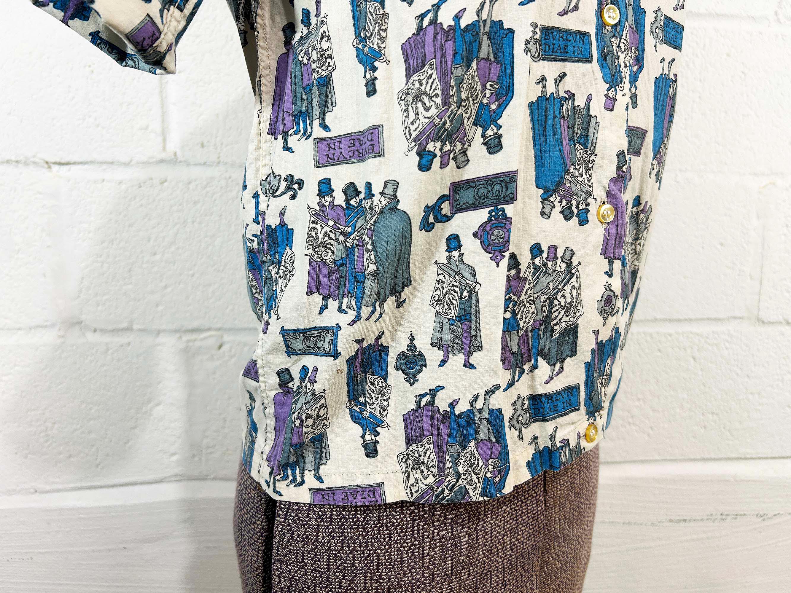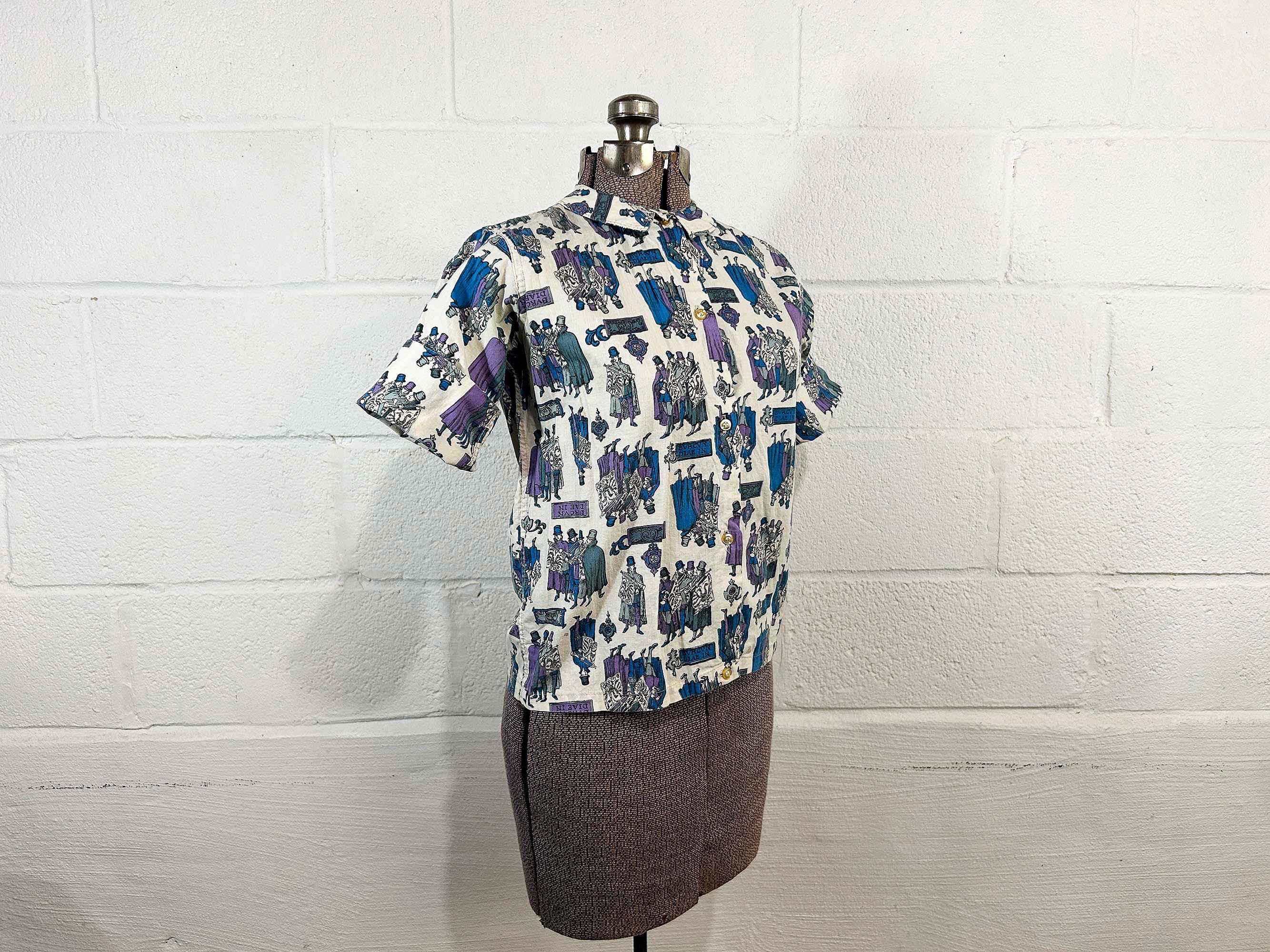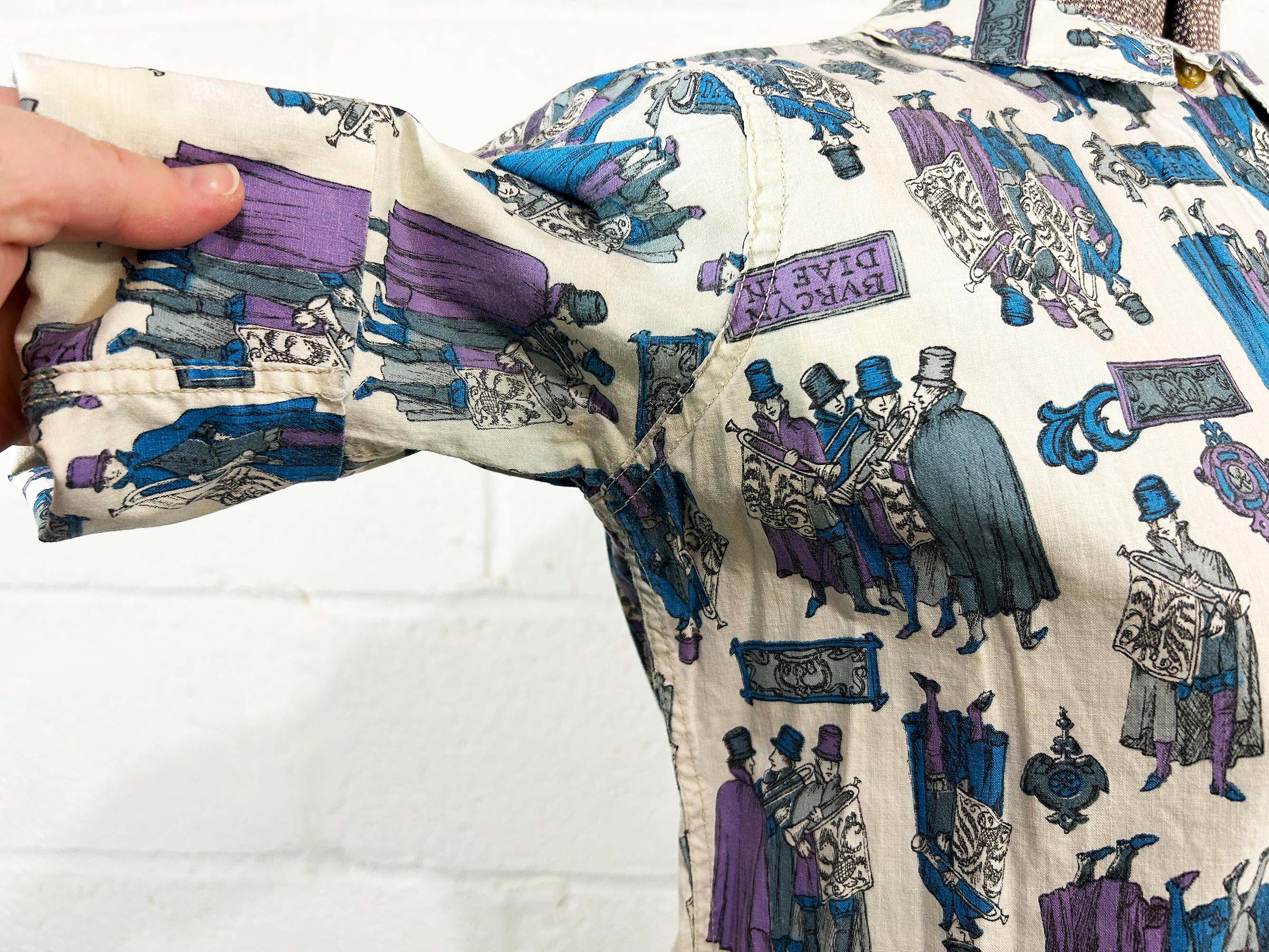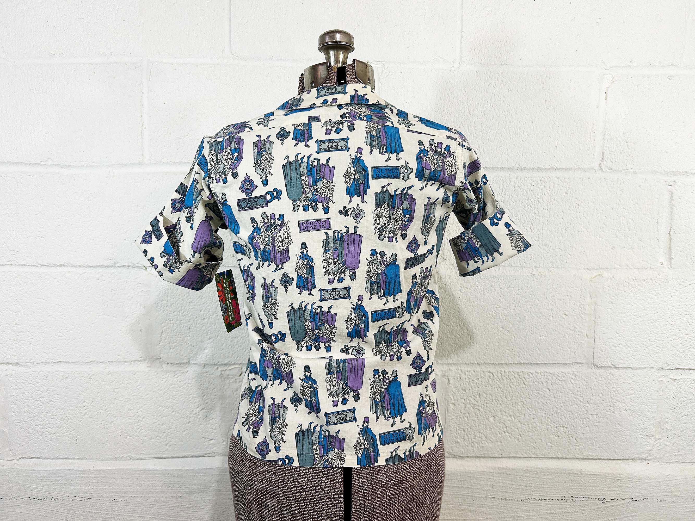 Cute short sleeve button down shirt with a pattern showing fashionable Victorian era musicians. Straight bottom hem with a cute small collar. In good shape with no significant flaws. Fabric has no stretch.
