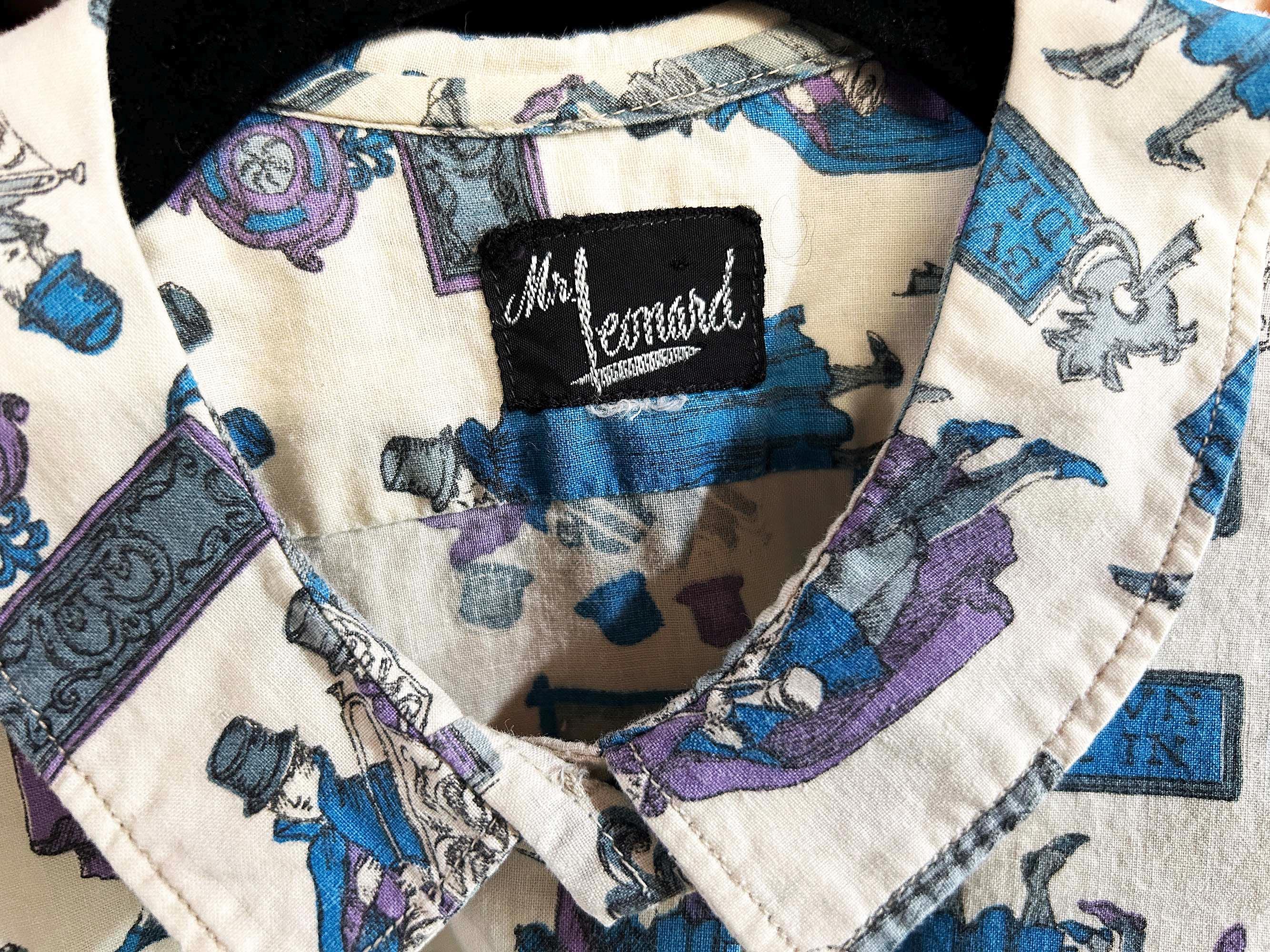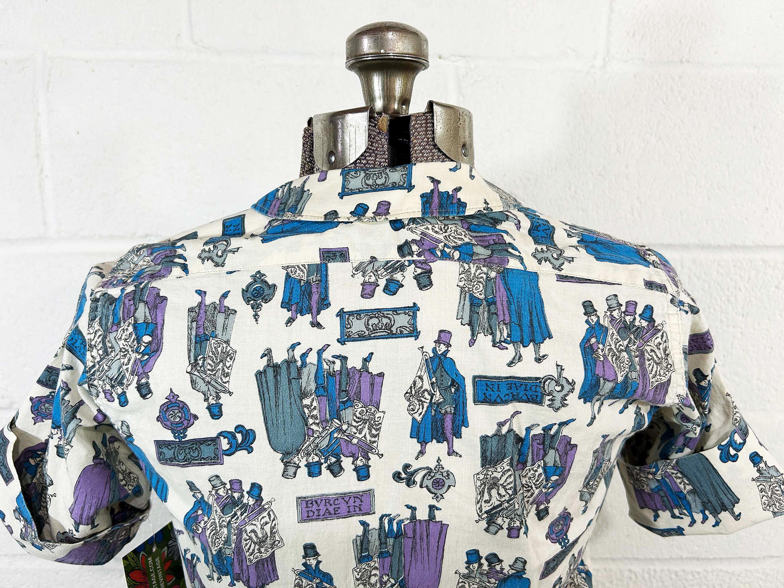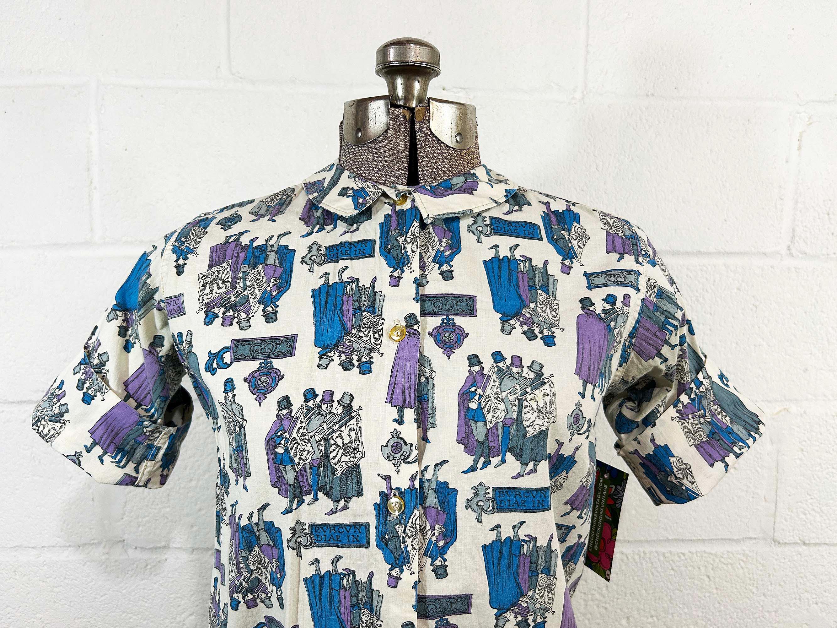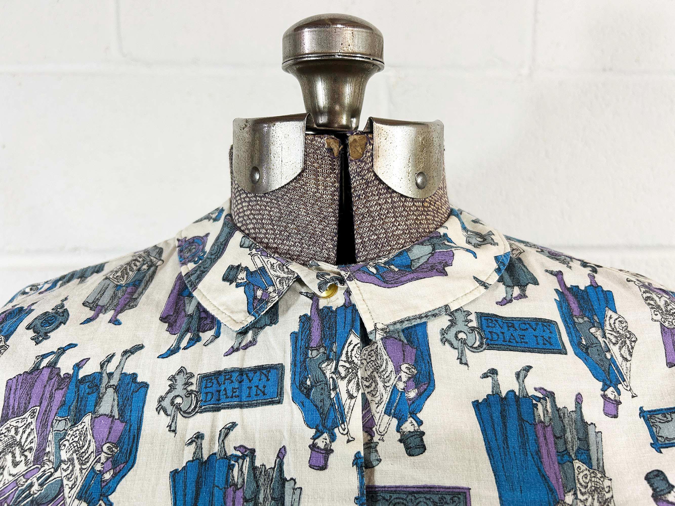 Cute short sleeve button down shirt with a pattern showing fashionable Victorian era musicians. Straight bottom hem with a cute small collar. In good shape with no significant flaws. Fabric has no stretch.