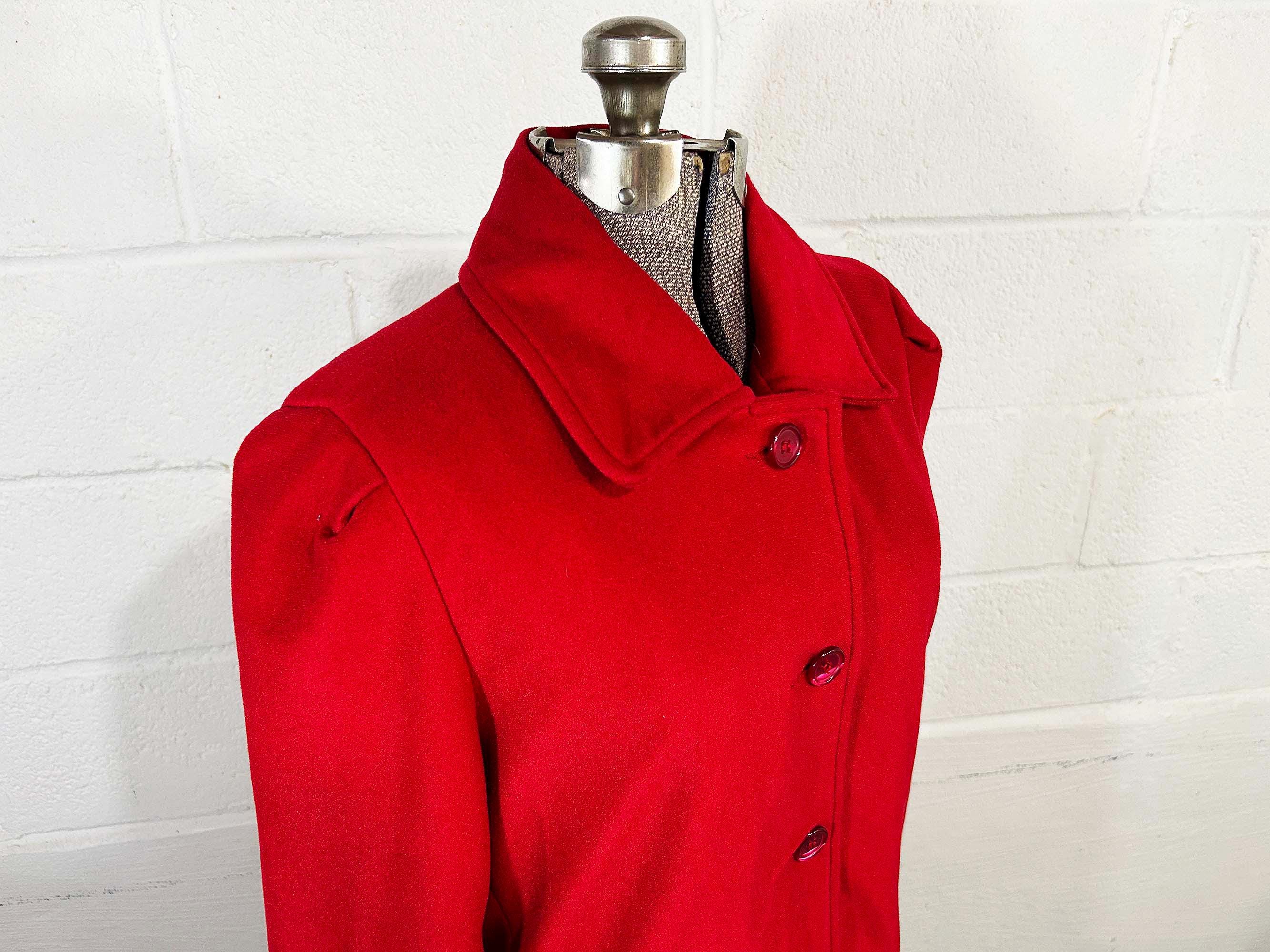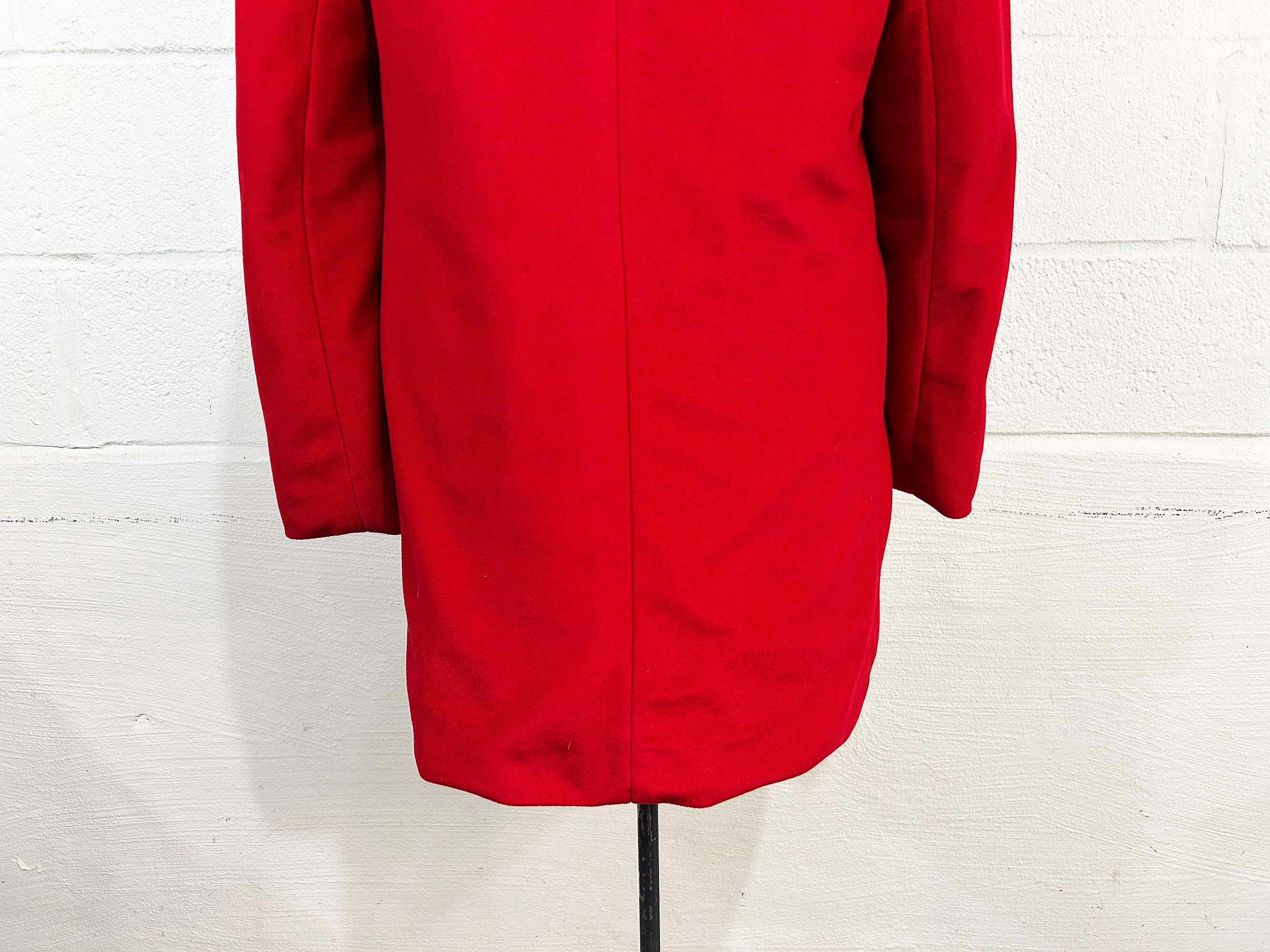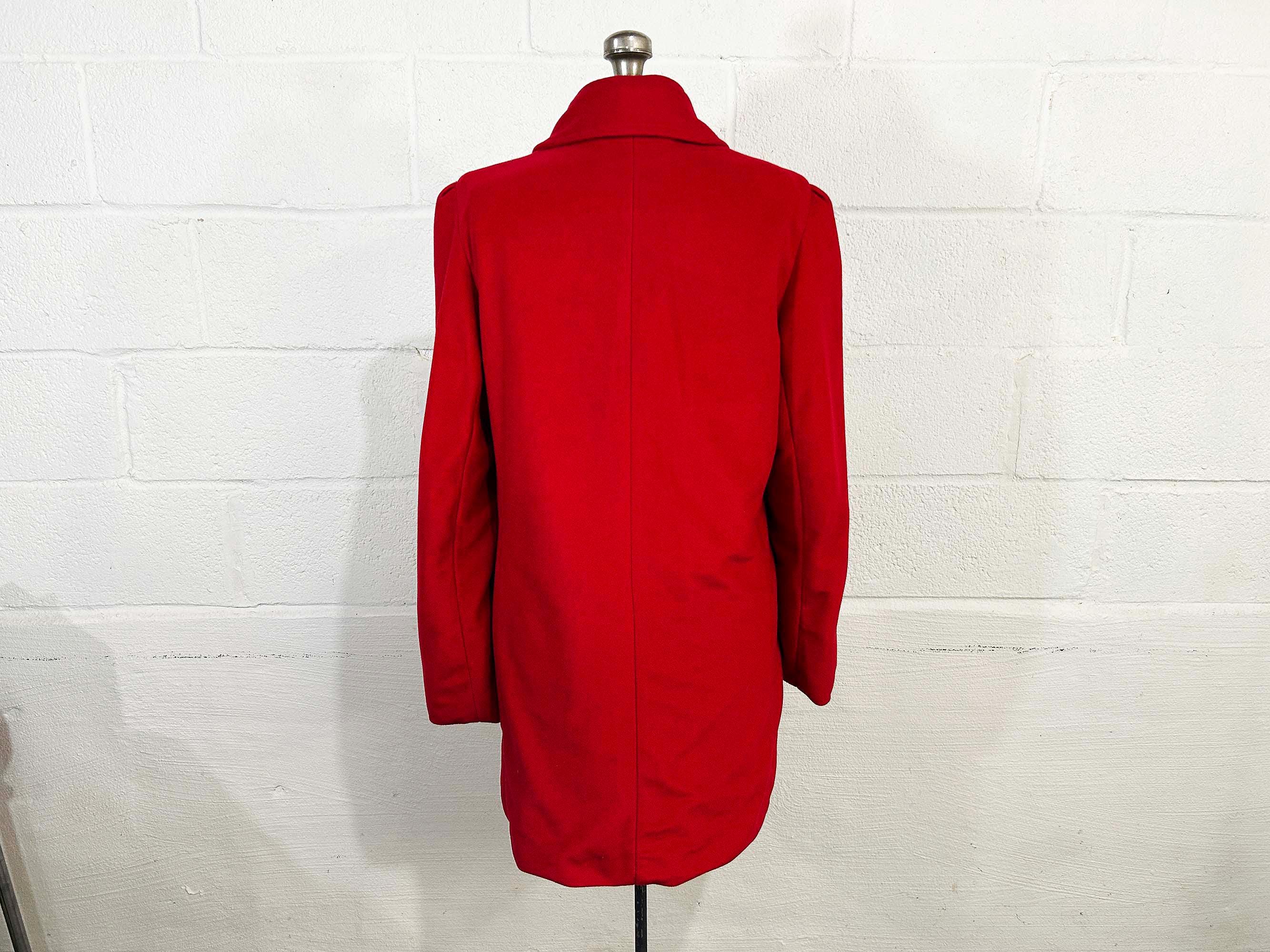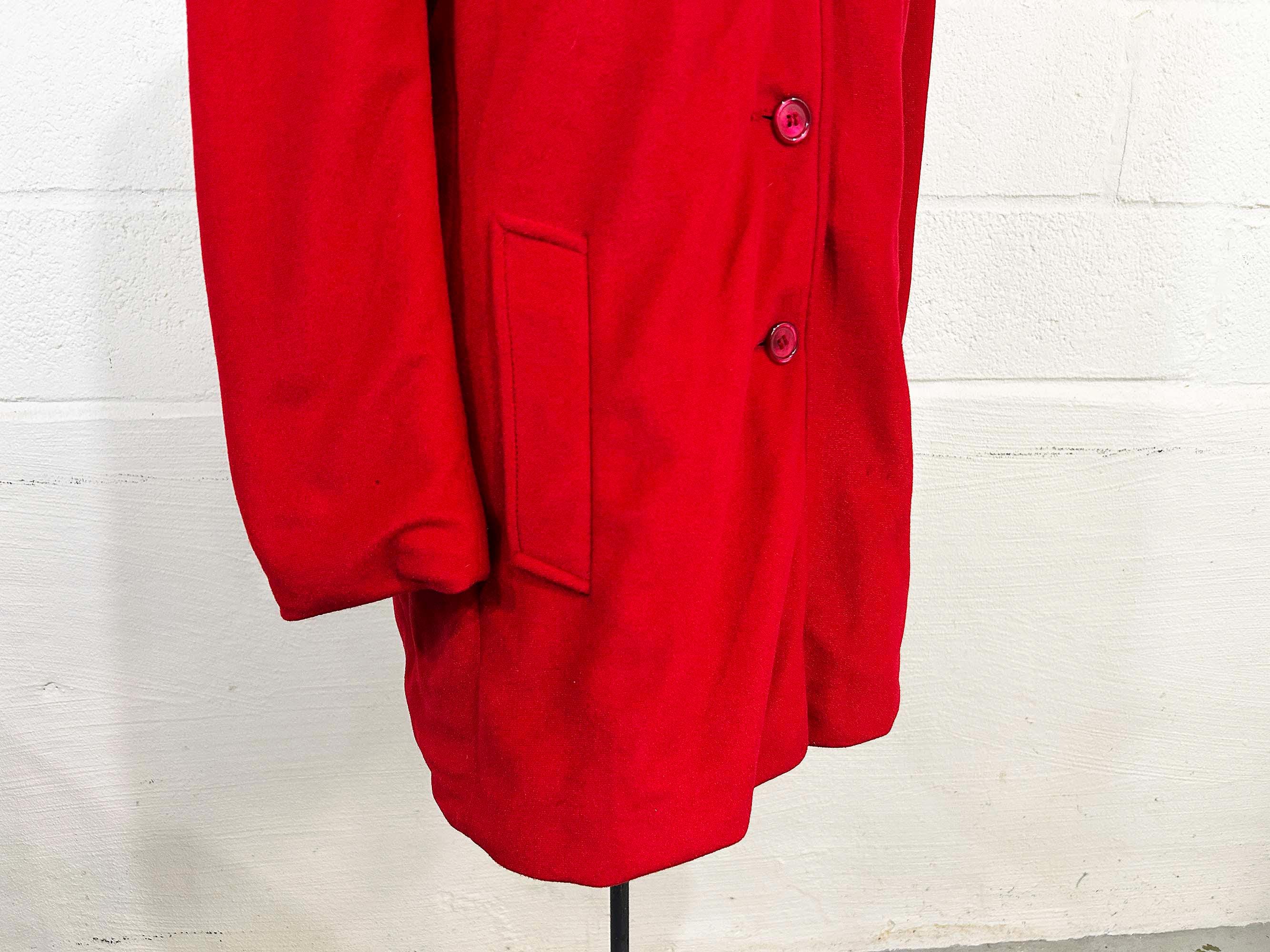 Cozy red lightweight peacoat. There are two front pockets and collar at the neckline. Coat is in good shape and lined with a satin-like fabric. The coat has no significant flaws. Fabric has NO stretch.