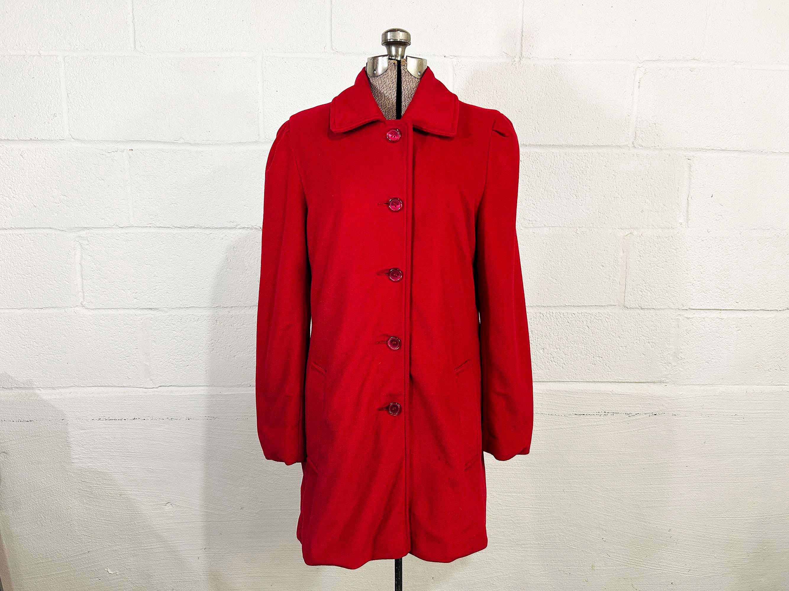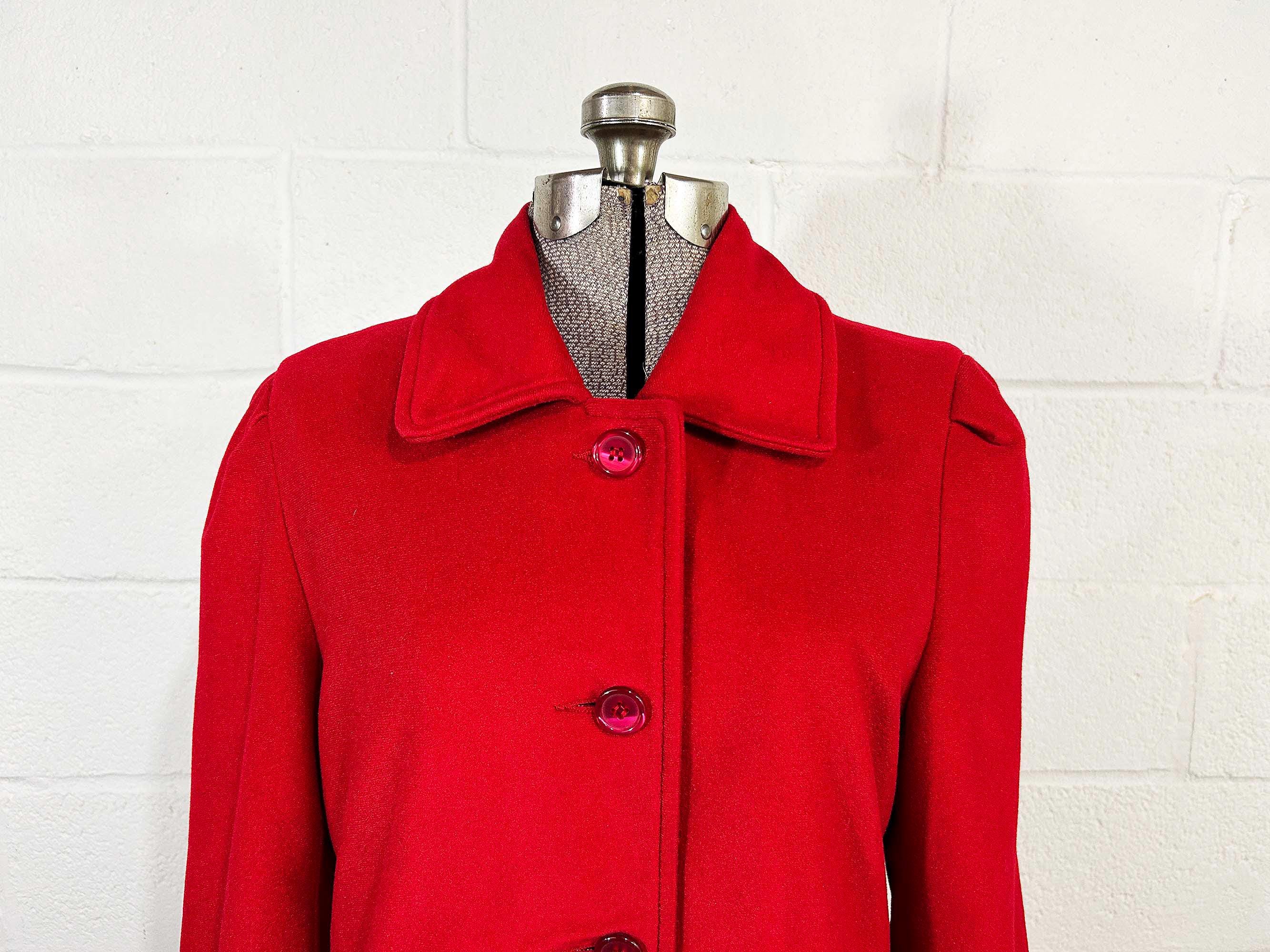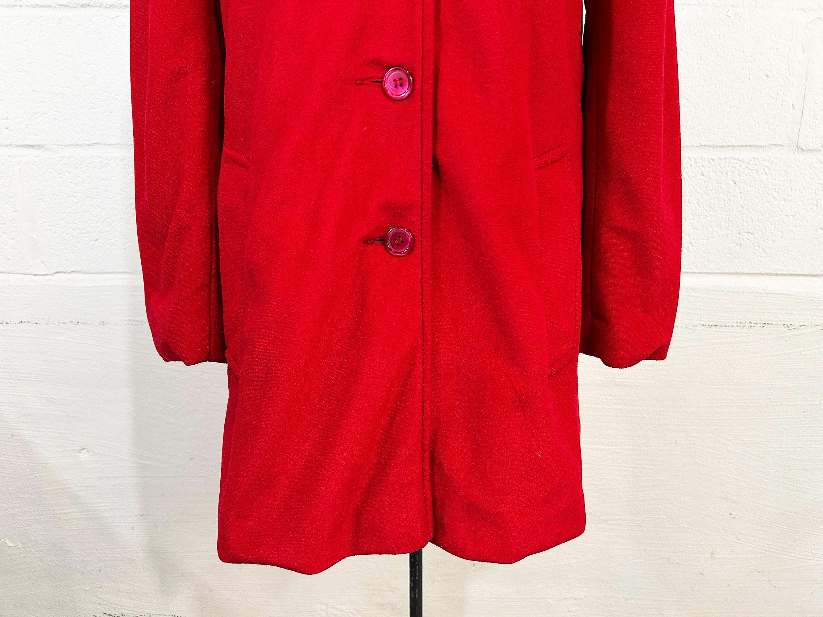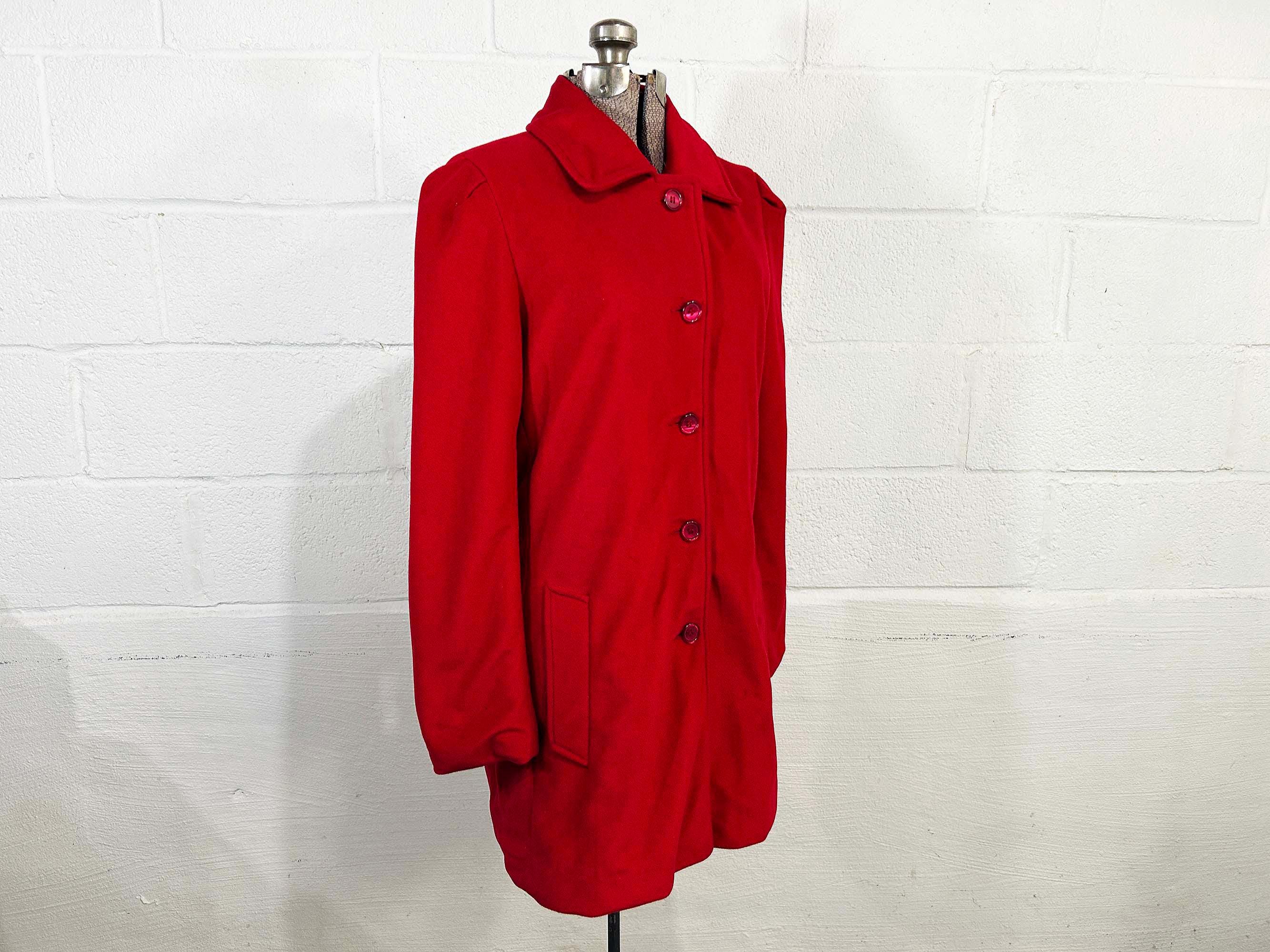 Cozy red lightweight peacoat. There are two front pockets and collar at the neckline. Coat is in good shape and lined with a satin-like fabric. The coat has no significant flaws. Fabric has NO stretch.