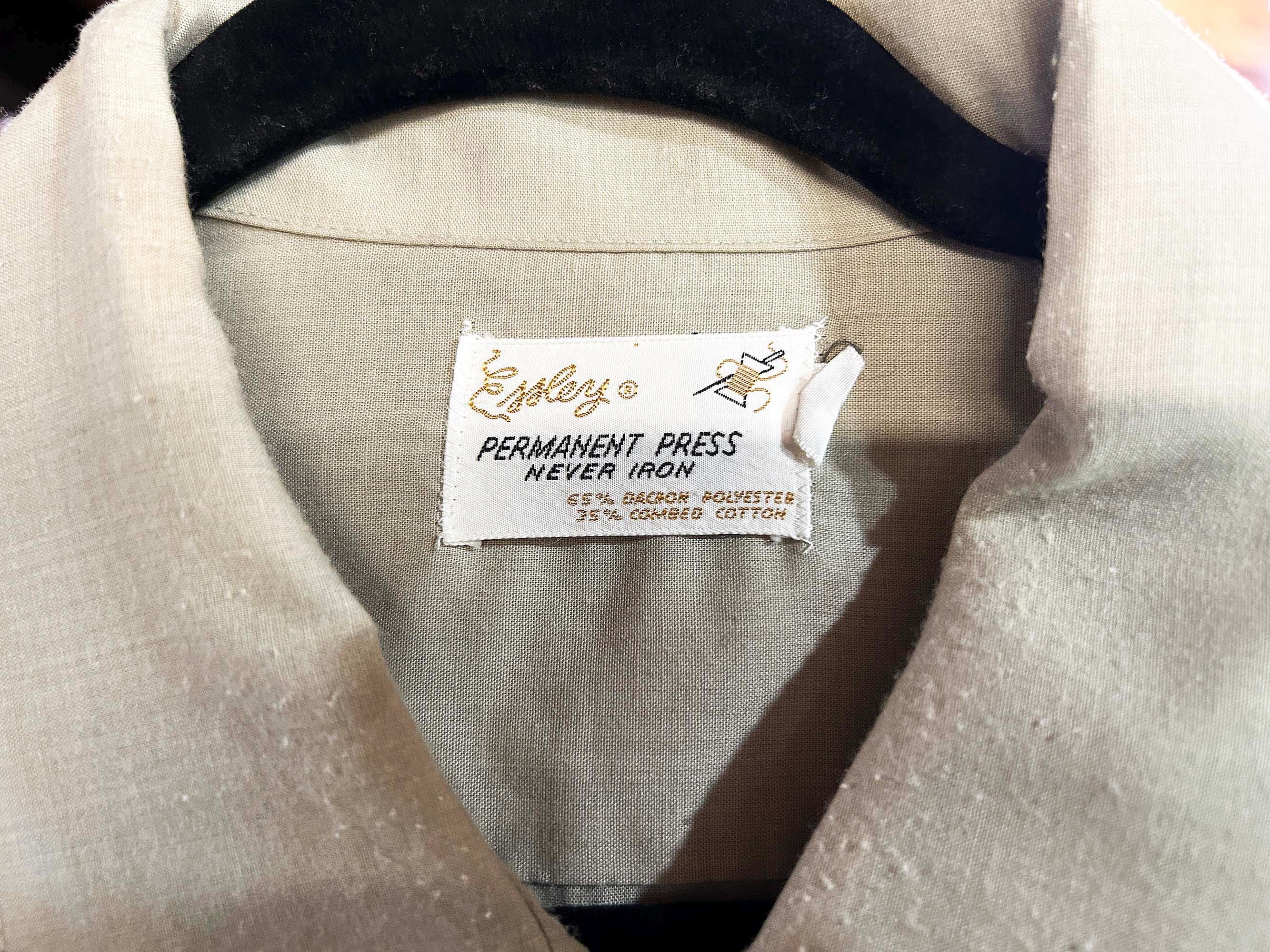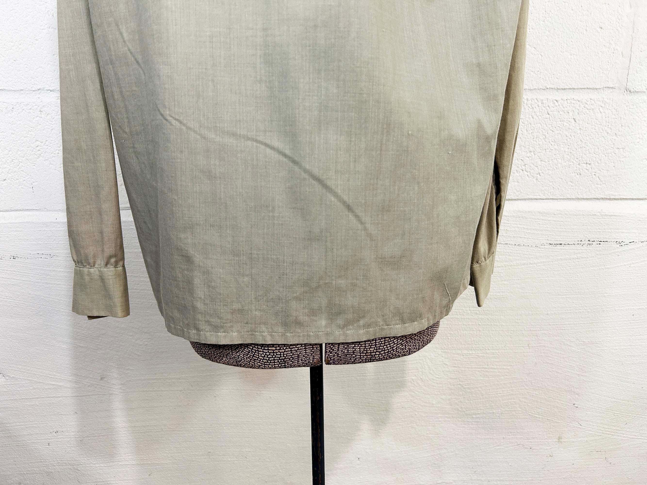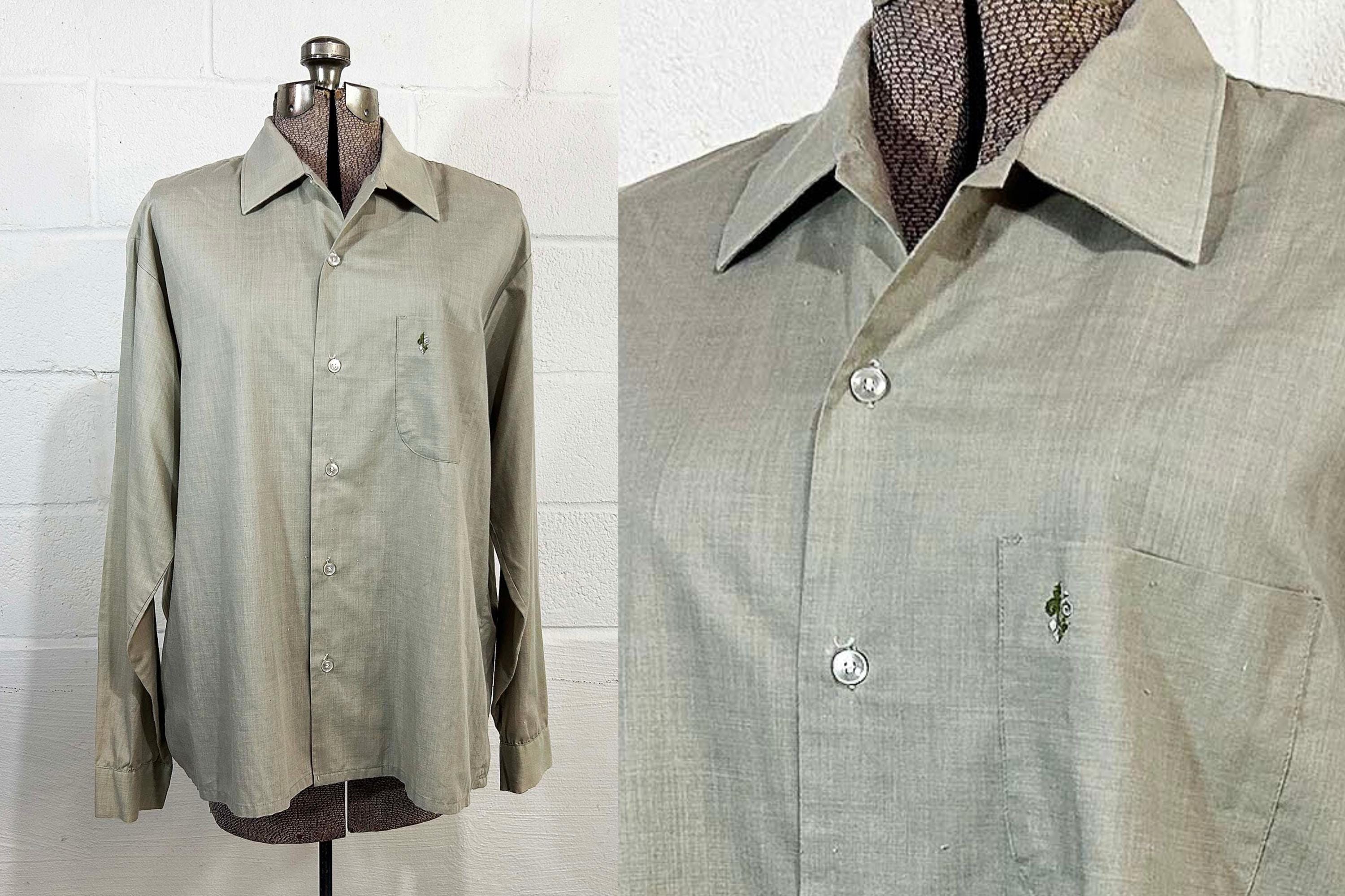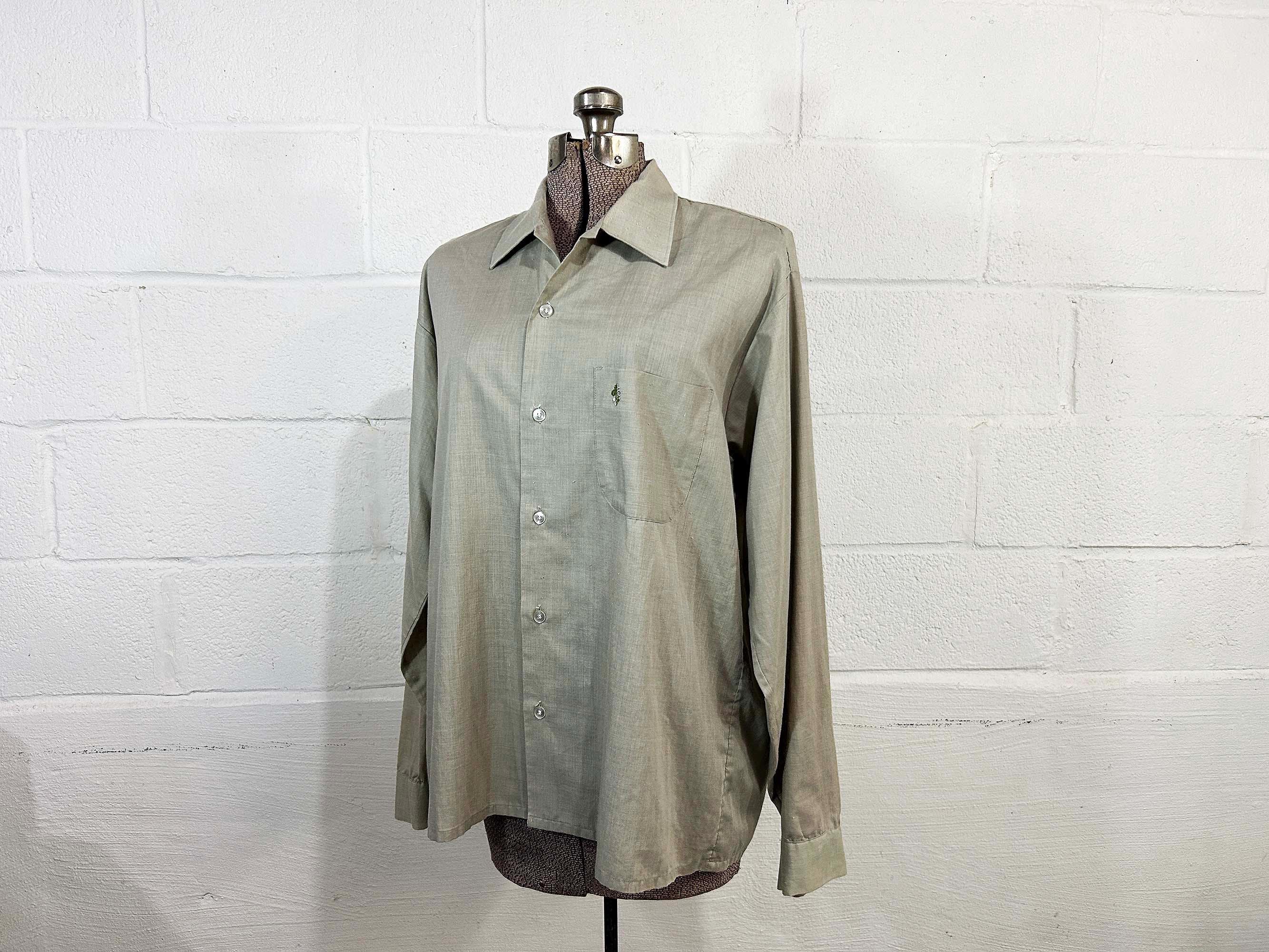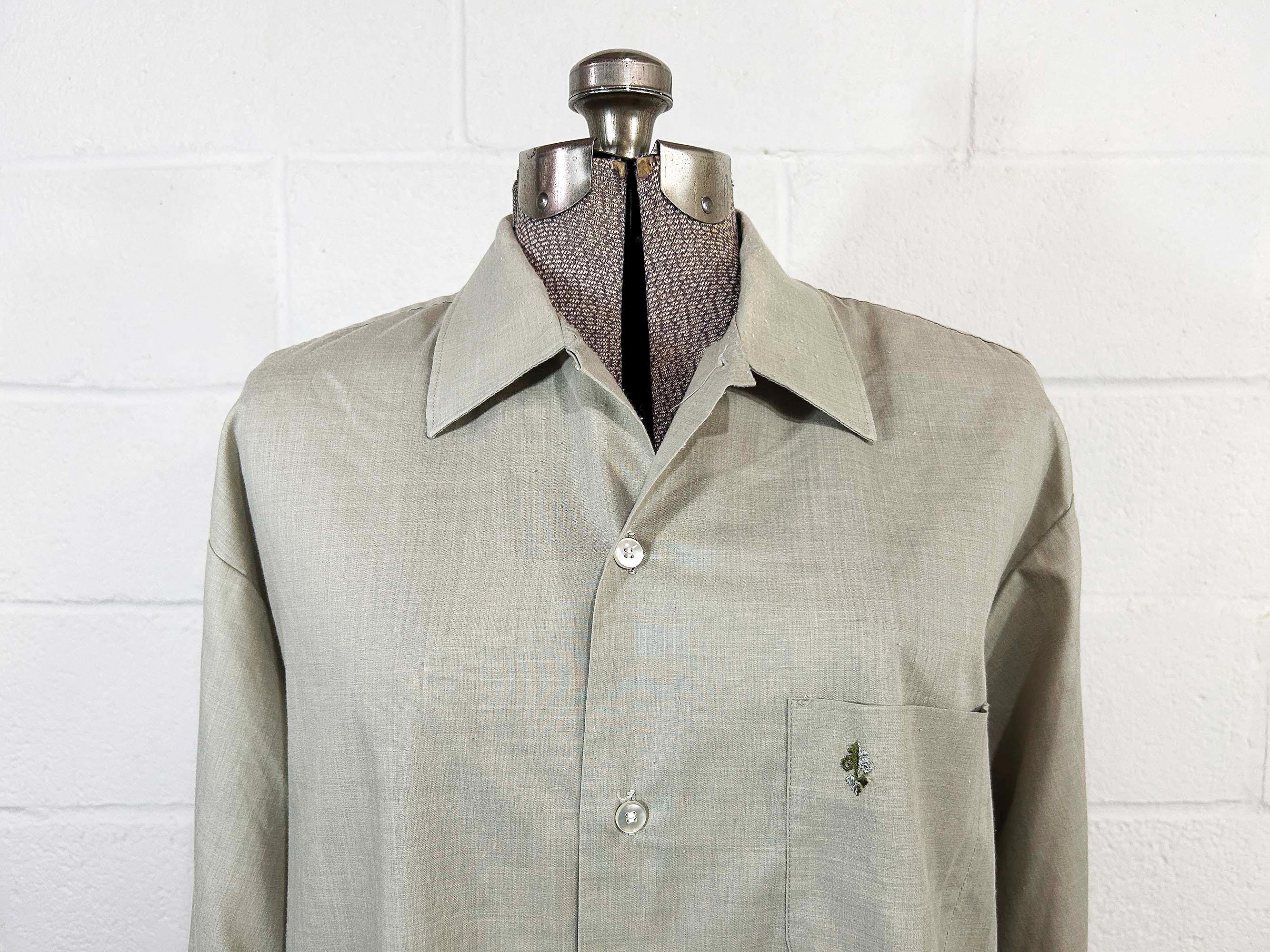 Silverish sage green button front shirt with long sleeves. Straight bottom hem and one front pocket with embroidery. In good shape with a bit of pilling - please be sure to inspect all photos closely. Fabric has no stretch.