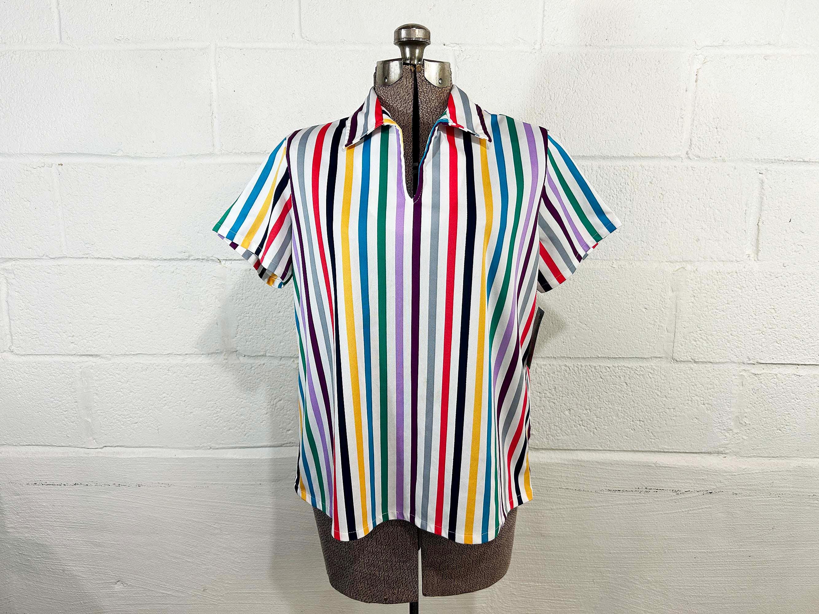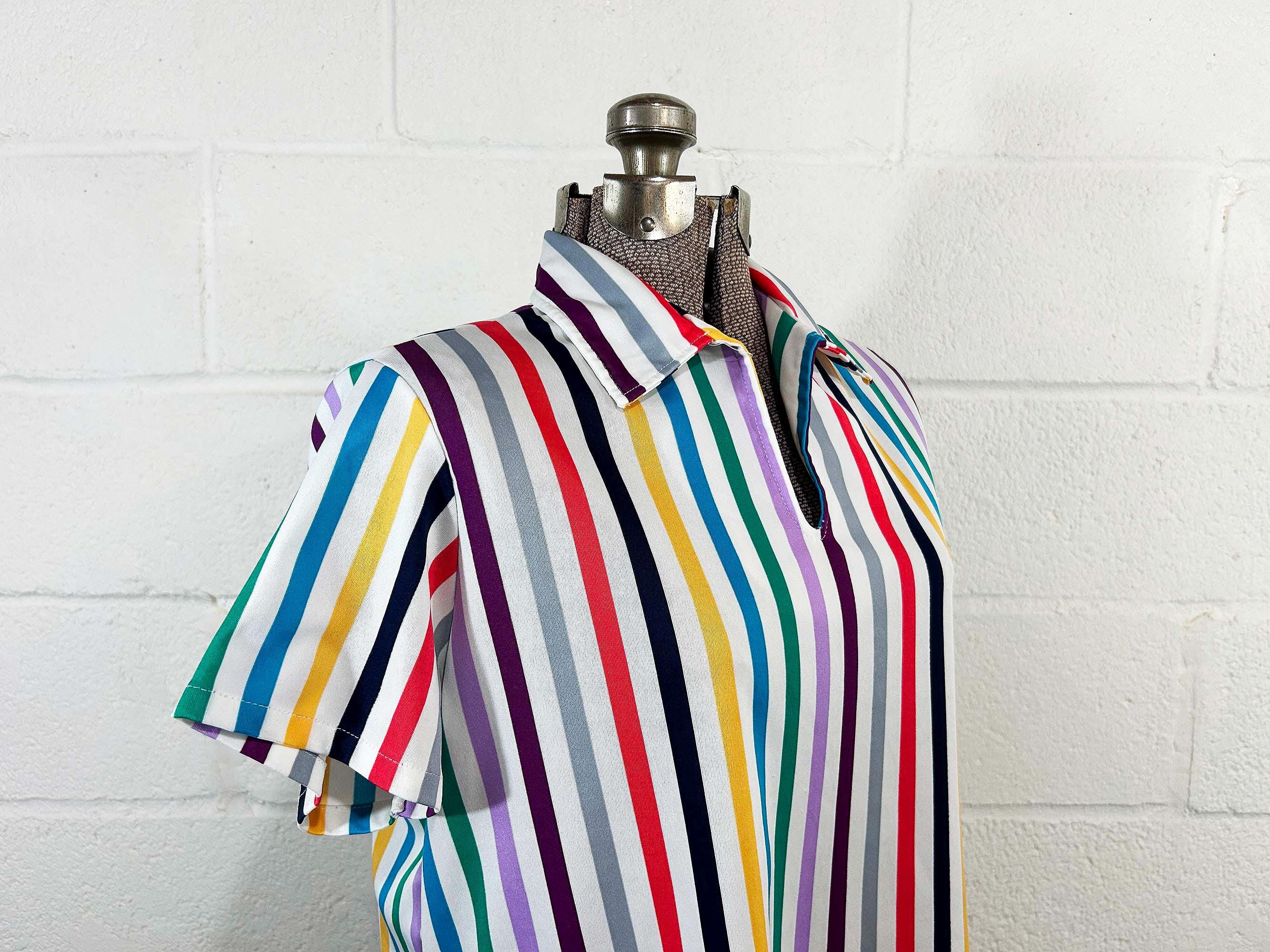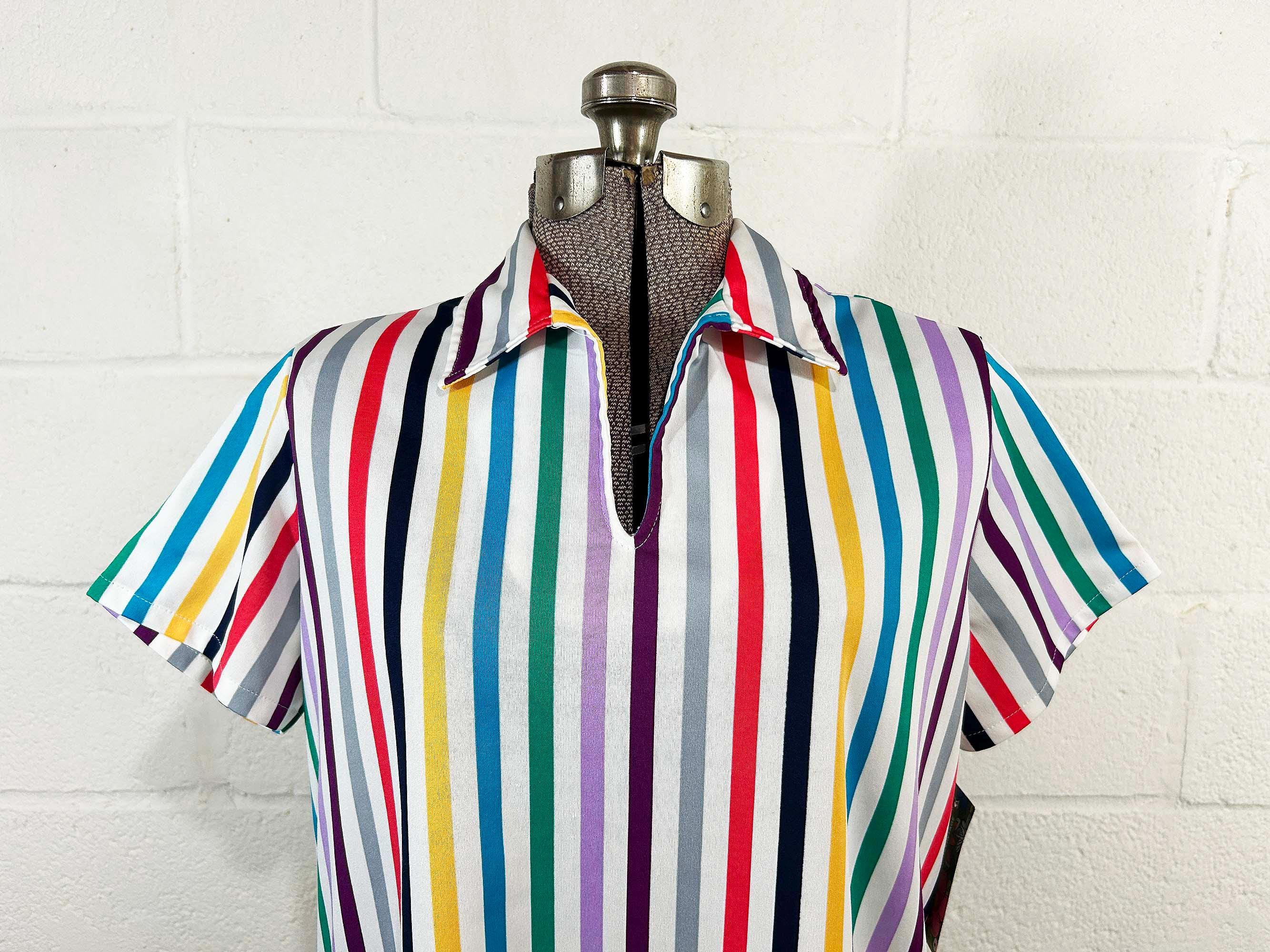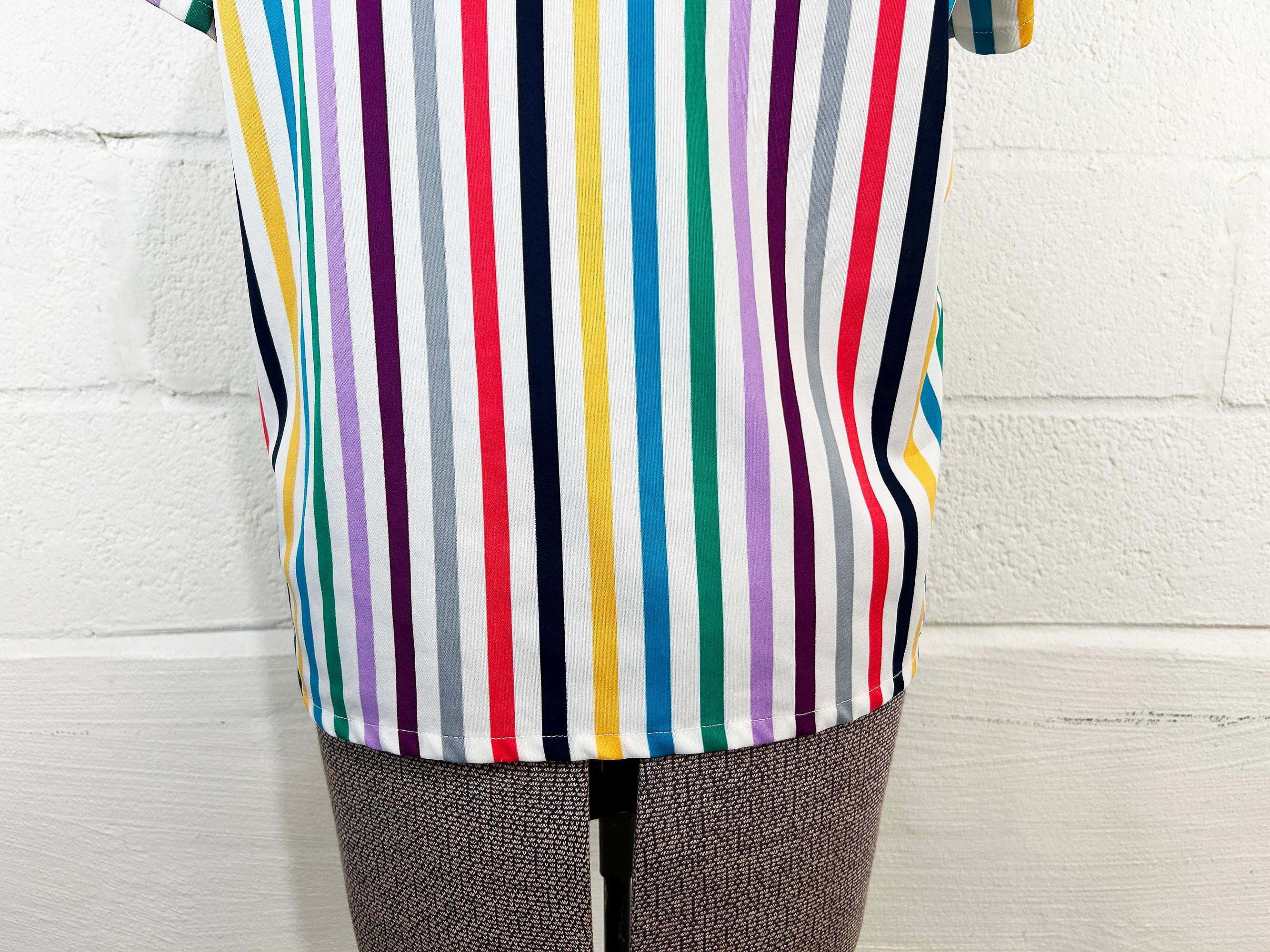 Cute rainbow striped lightweight polyester top. Top is in great shape with no significant wear. Pullover style with a v neck and collar. Fabric has stretch.