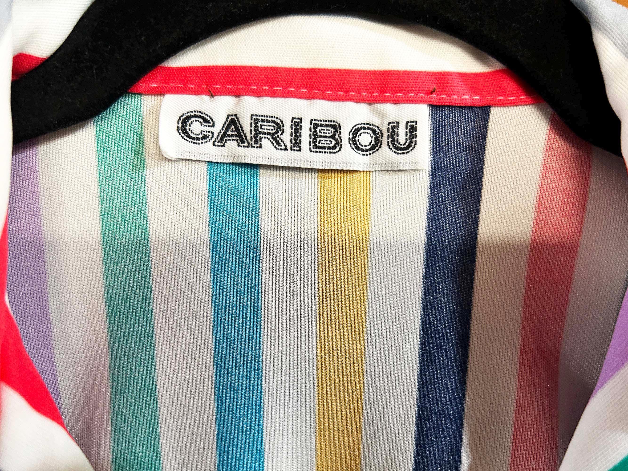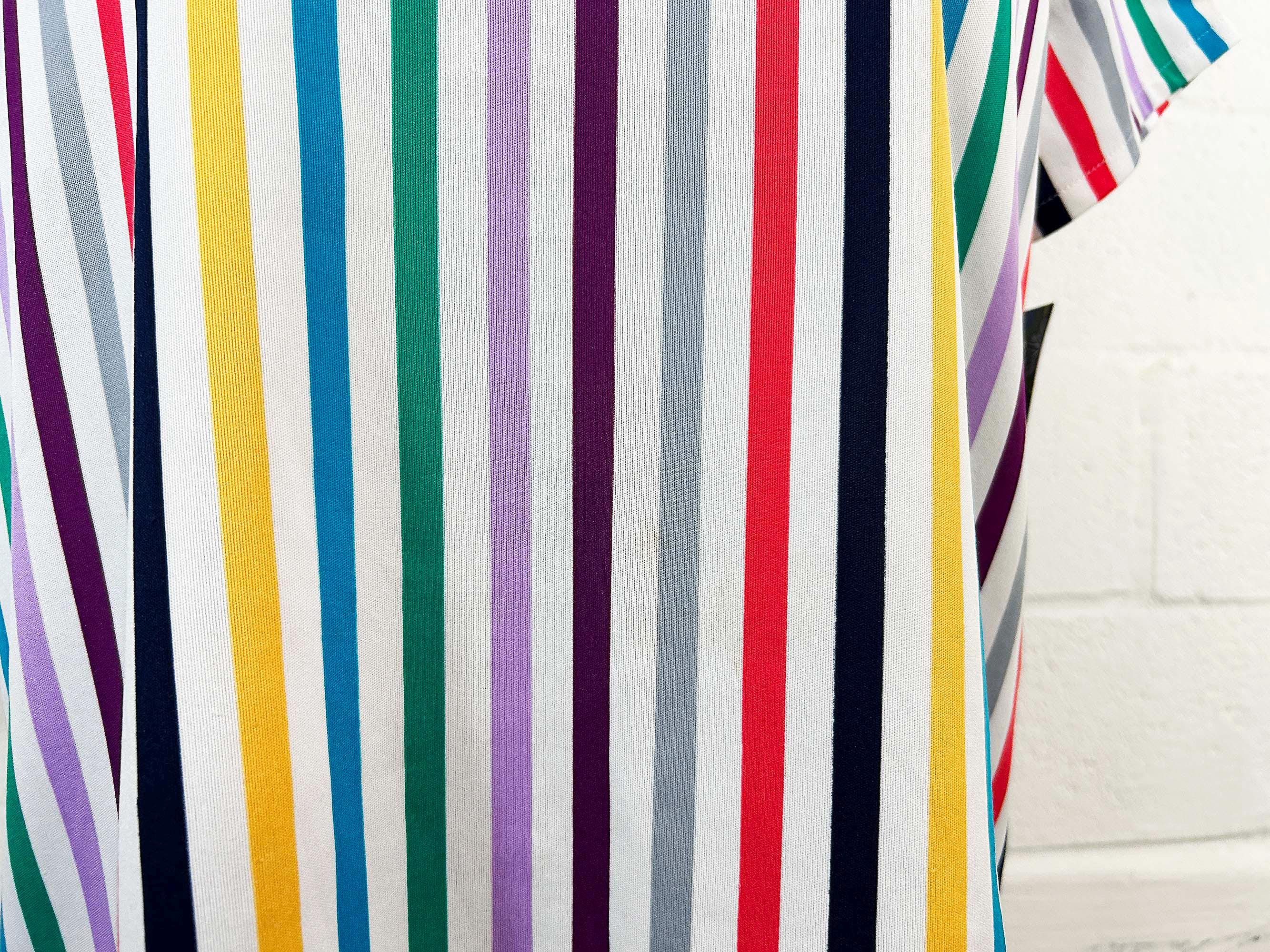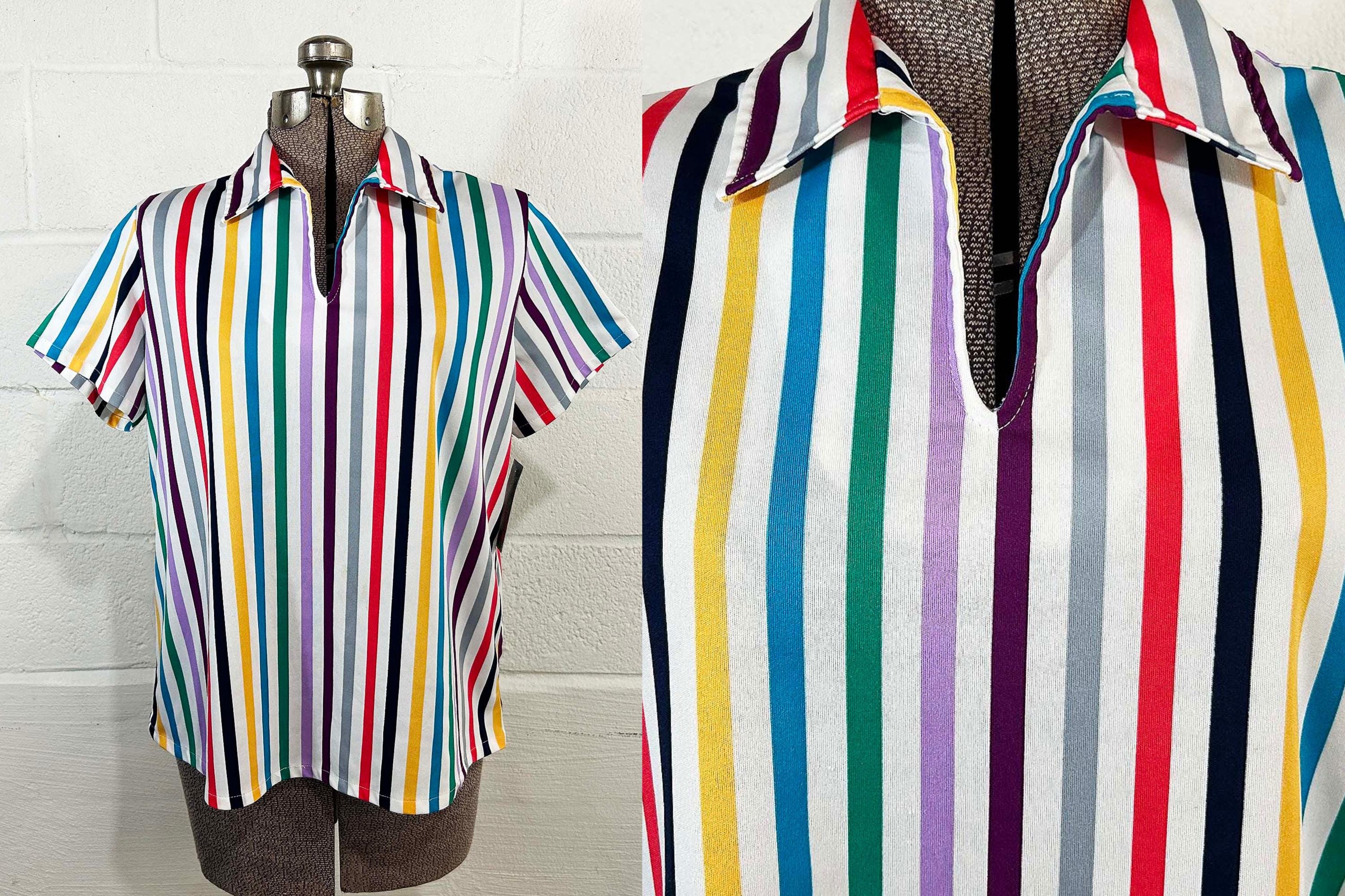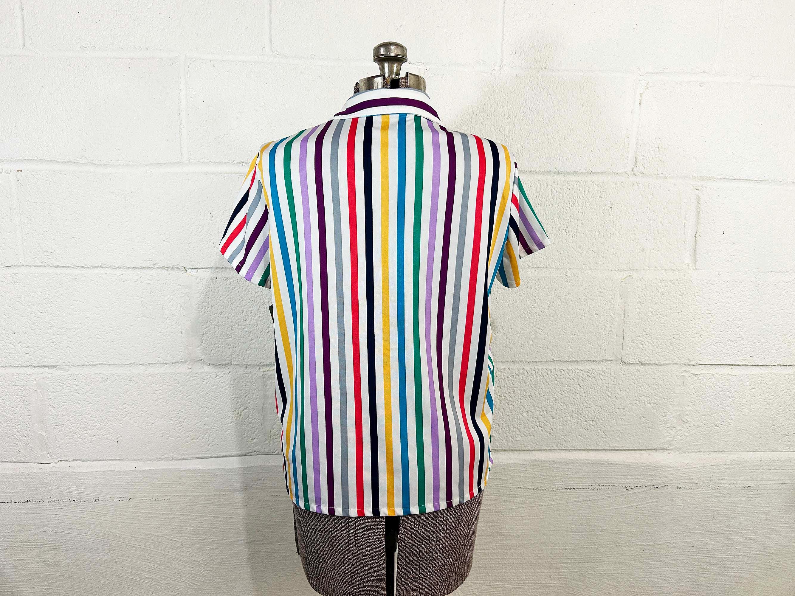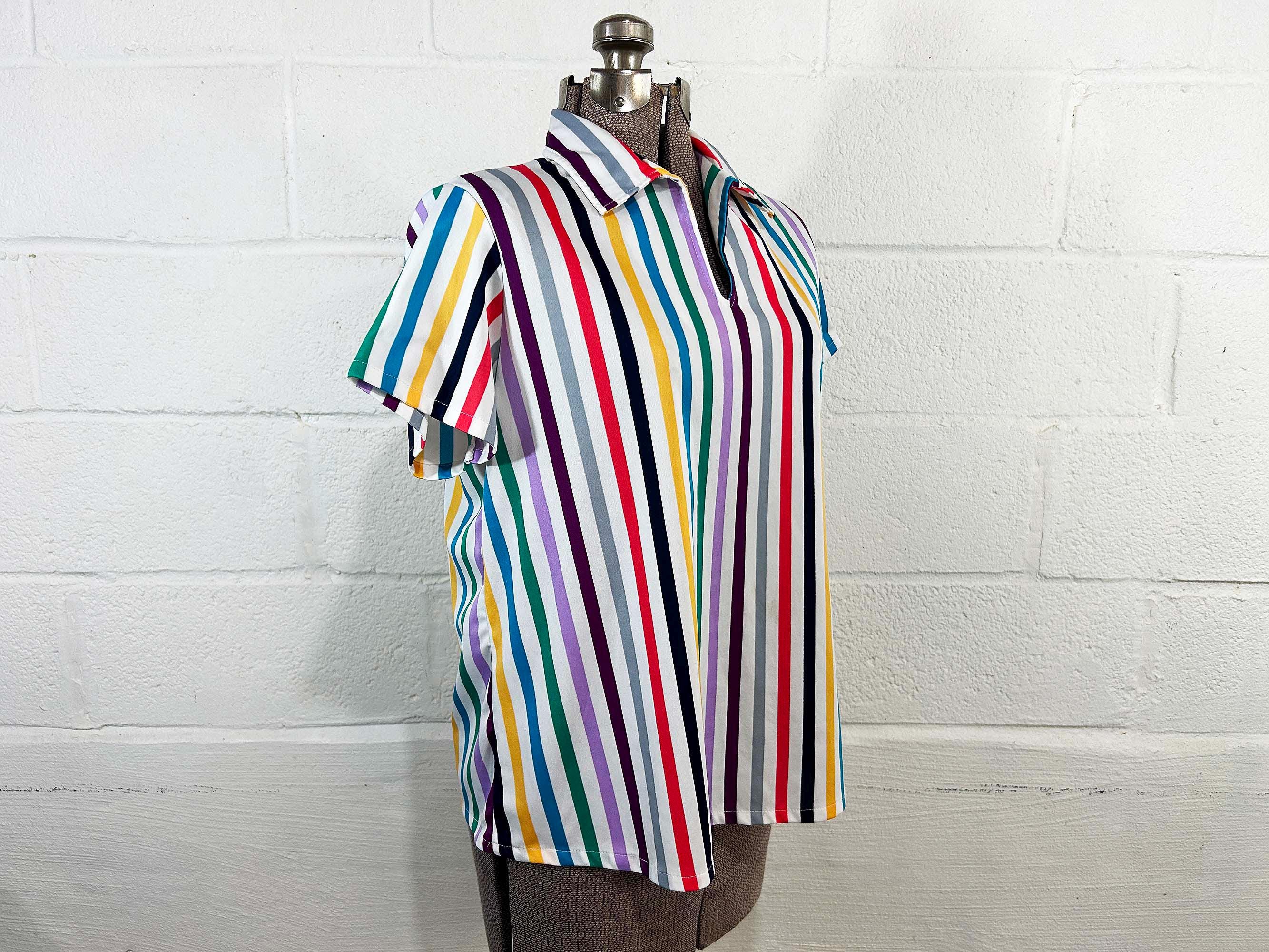 Cute rainbow striped lightweight polyester top. Top is in great shape with no significant wear. Pullover style with a v neck and collar. Fabric has stretch.