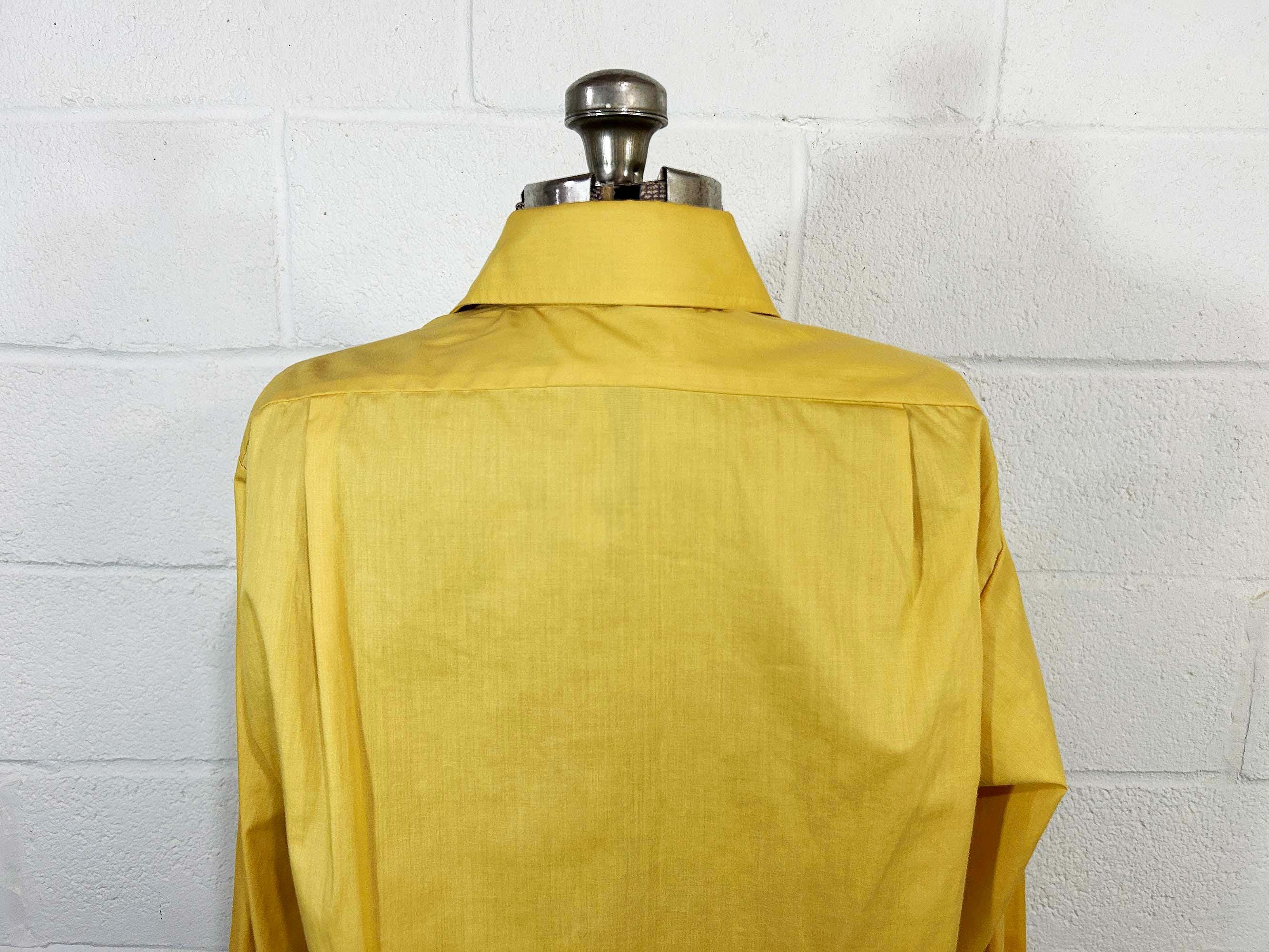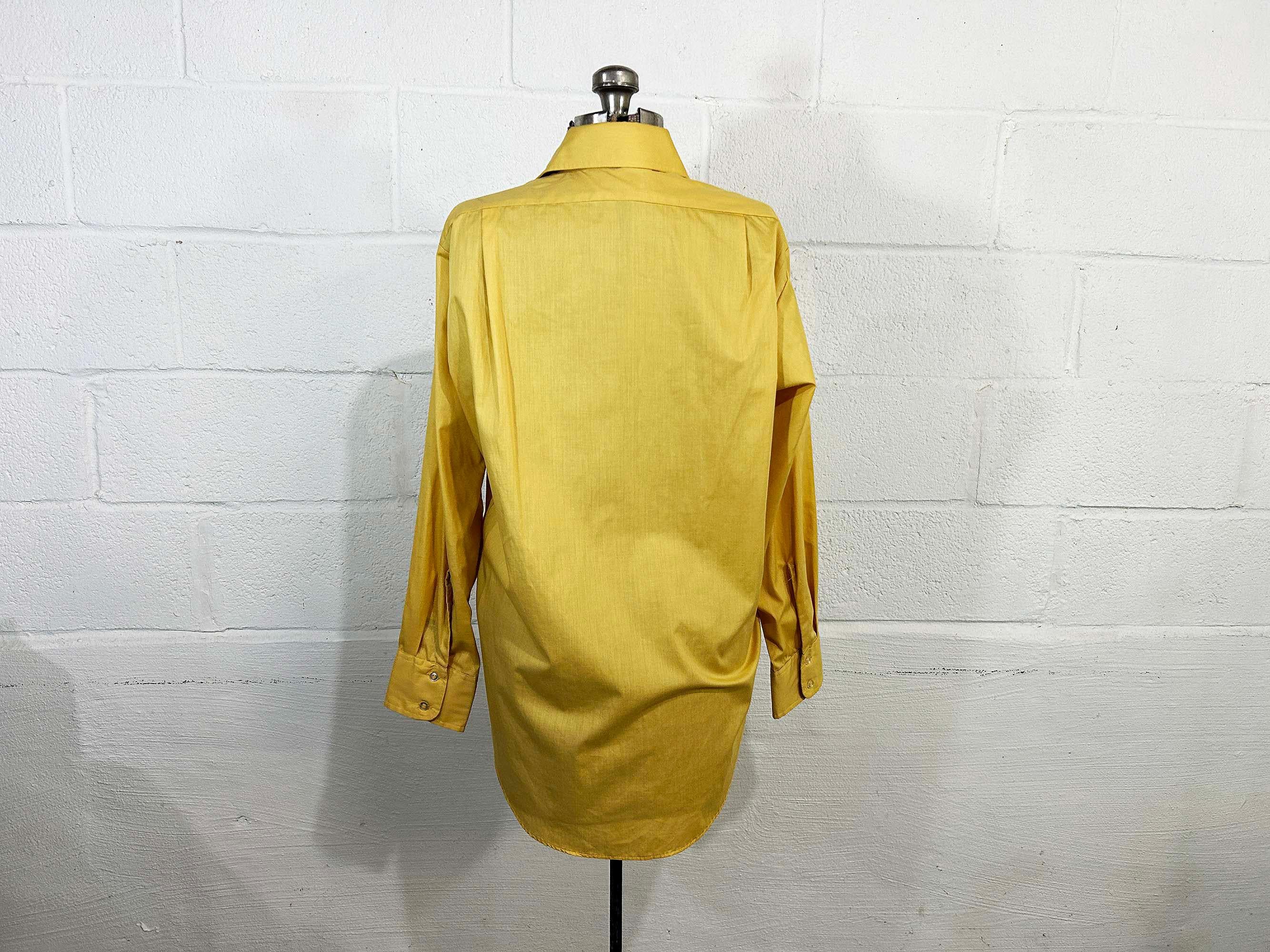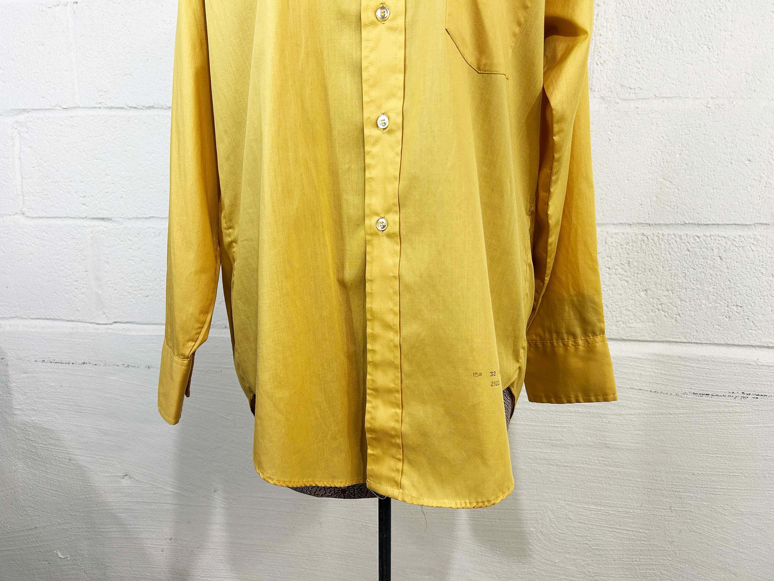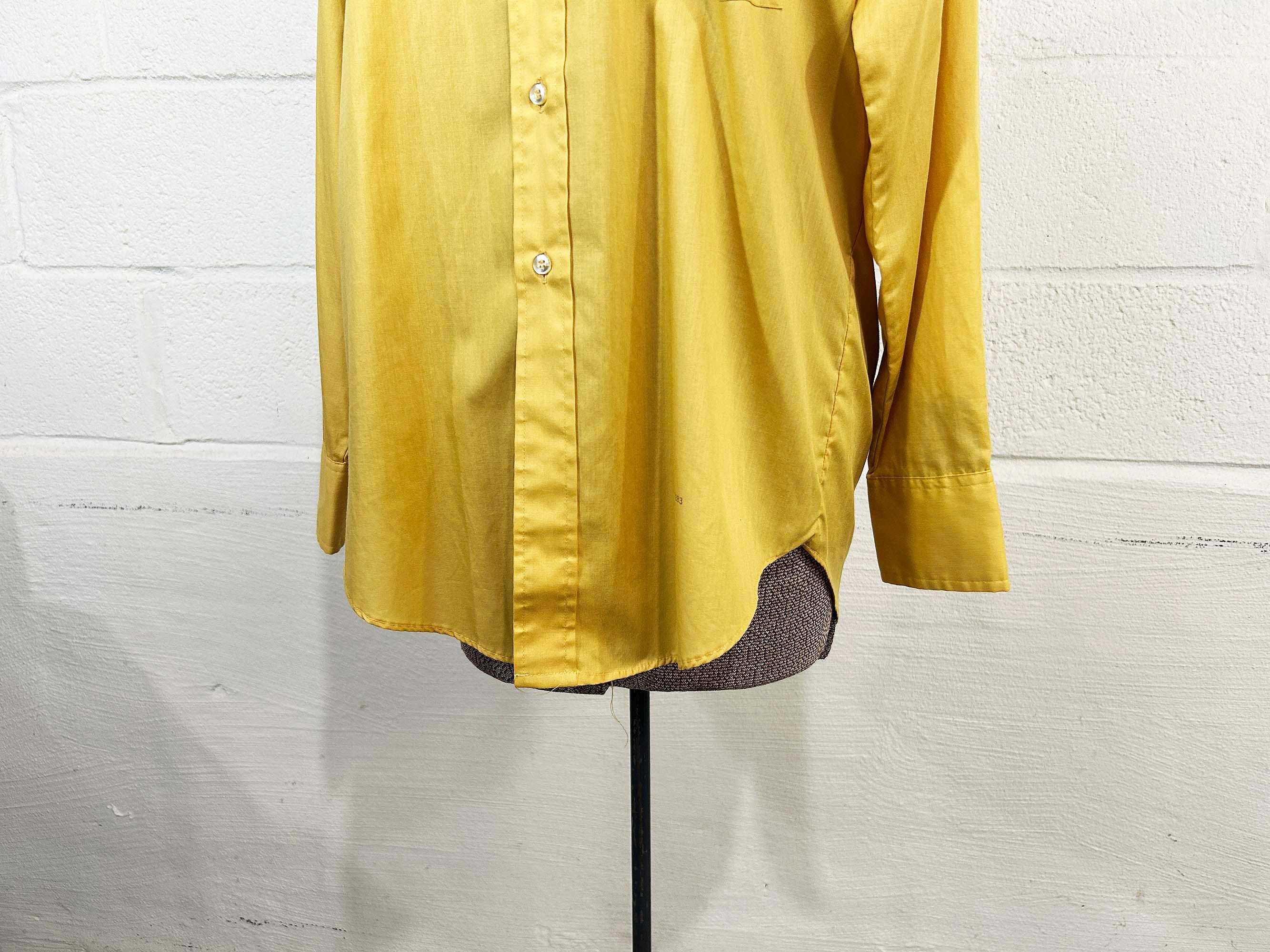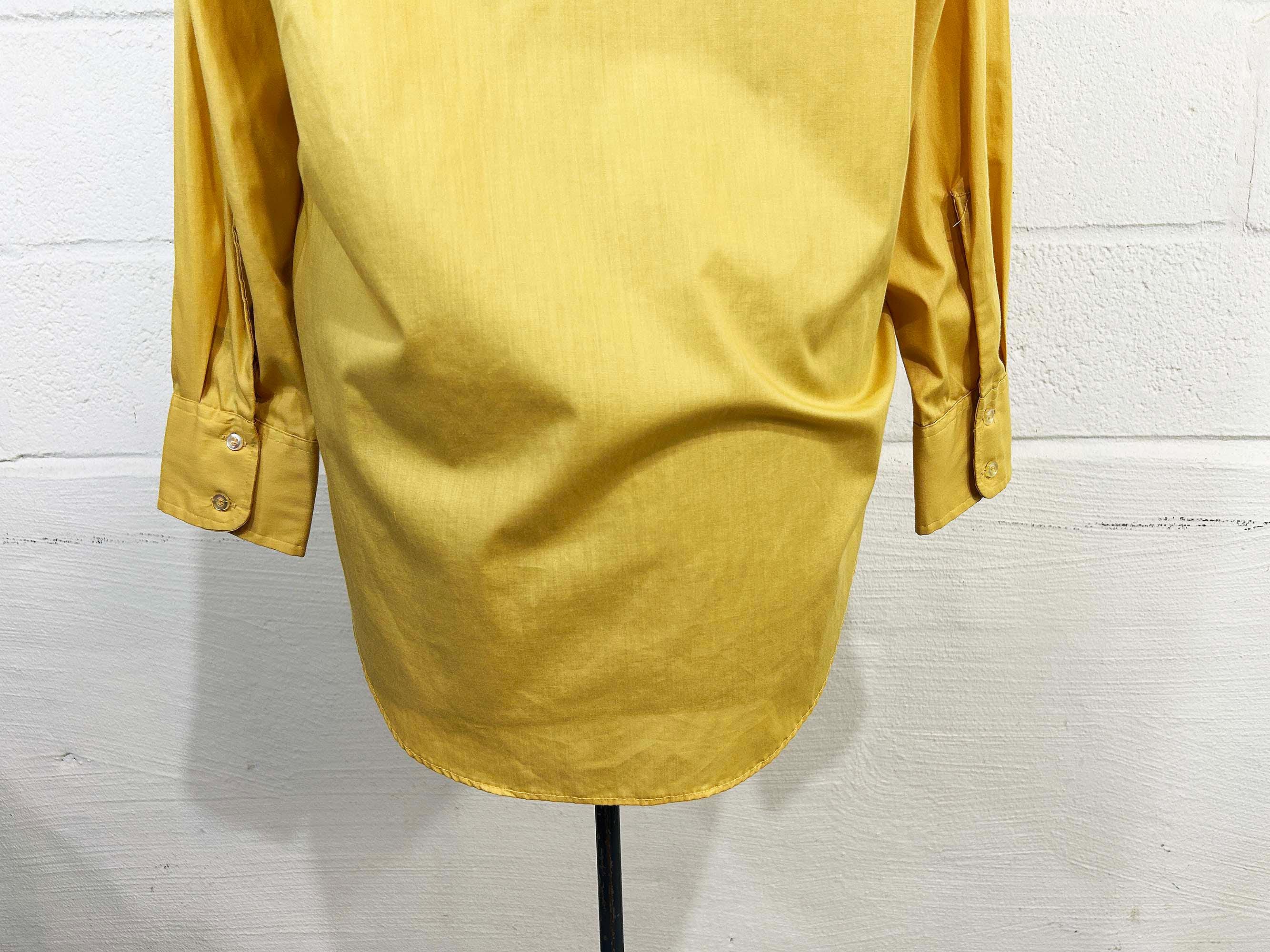Lightweight mustard yellow button front shirt with long sleeves. Curved bottom hem and one front patch pocket. In good shape with no significant wear. Fabric has no stretch.