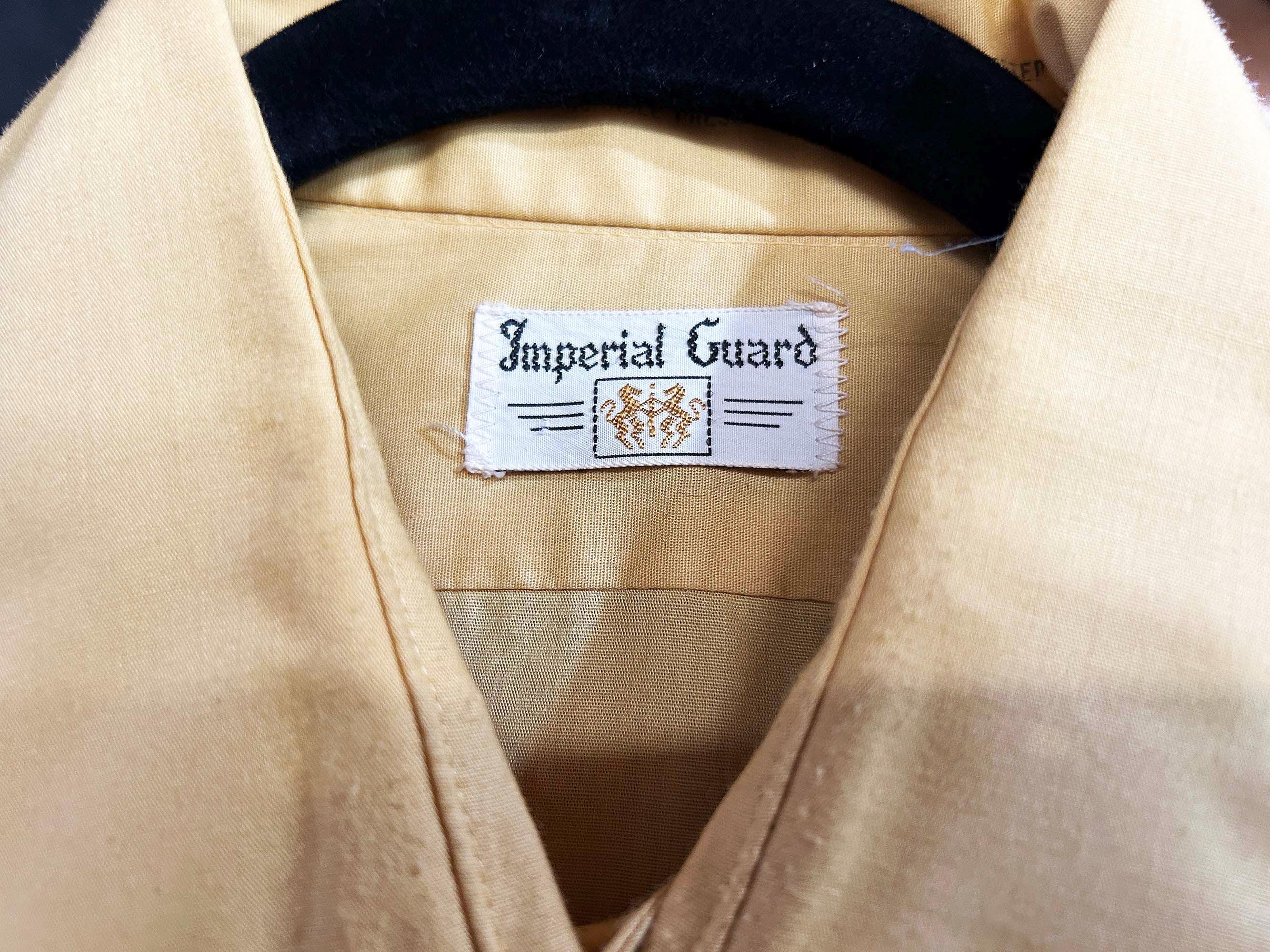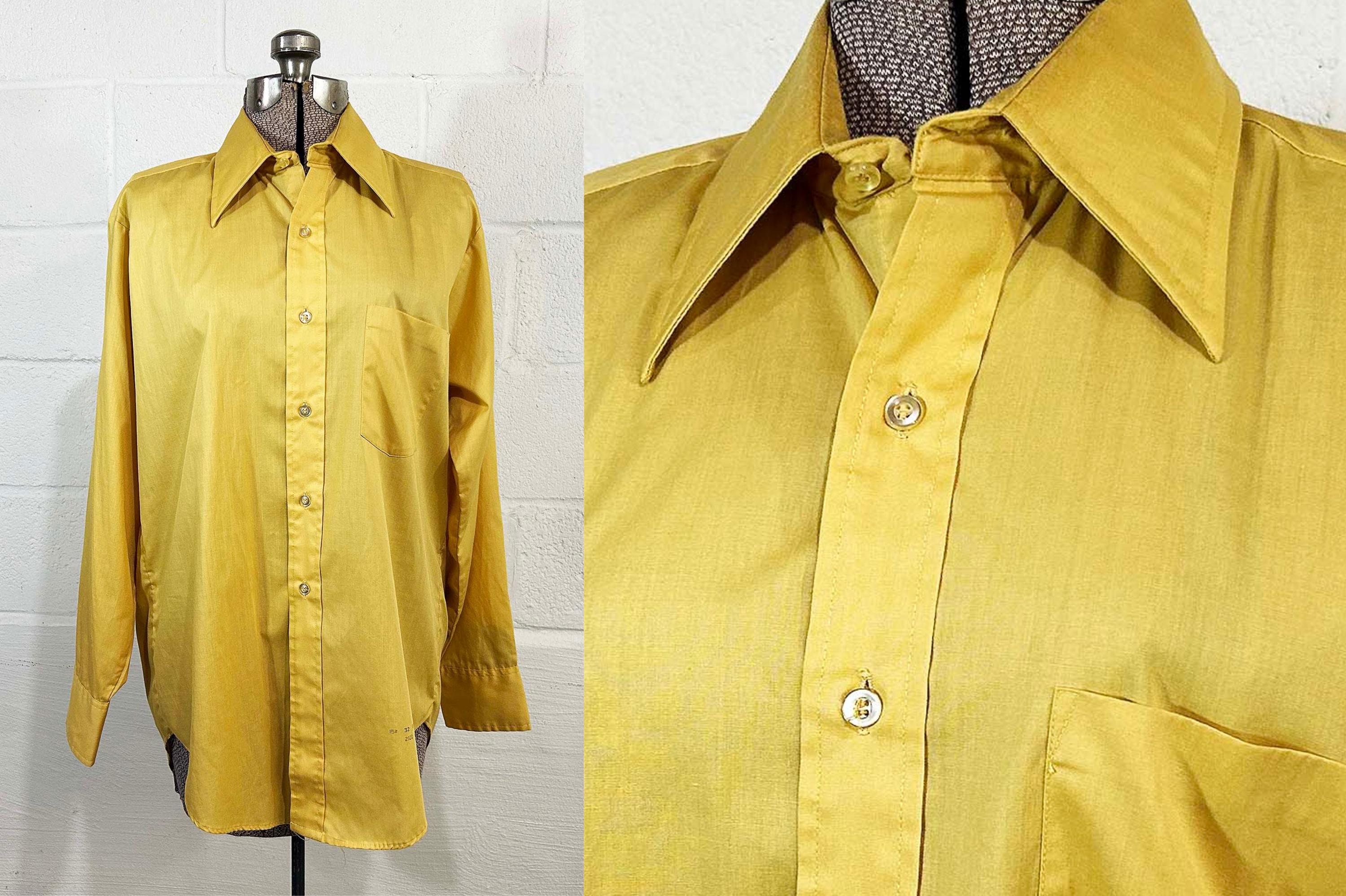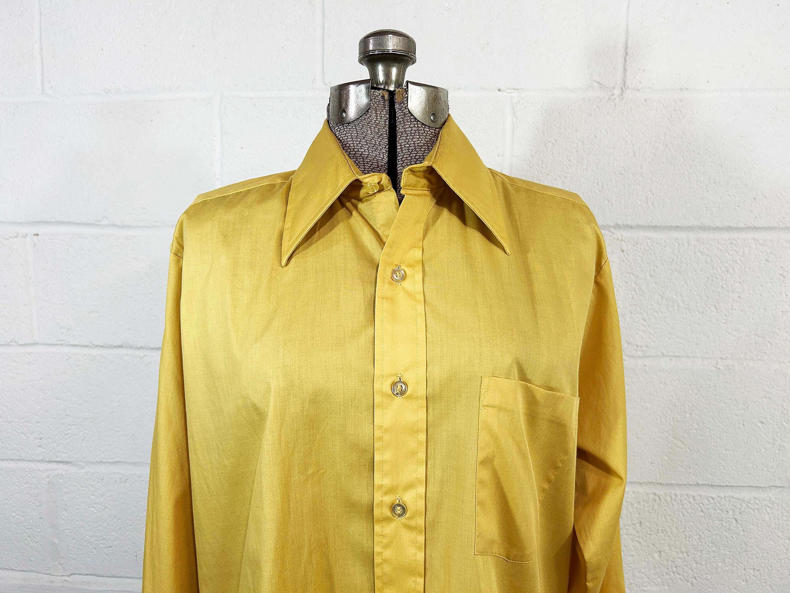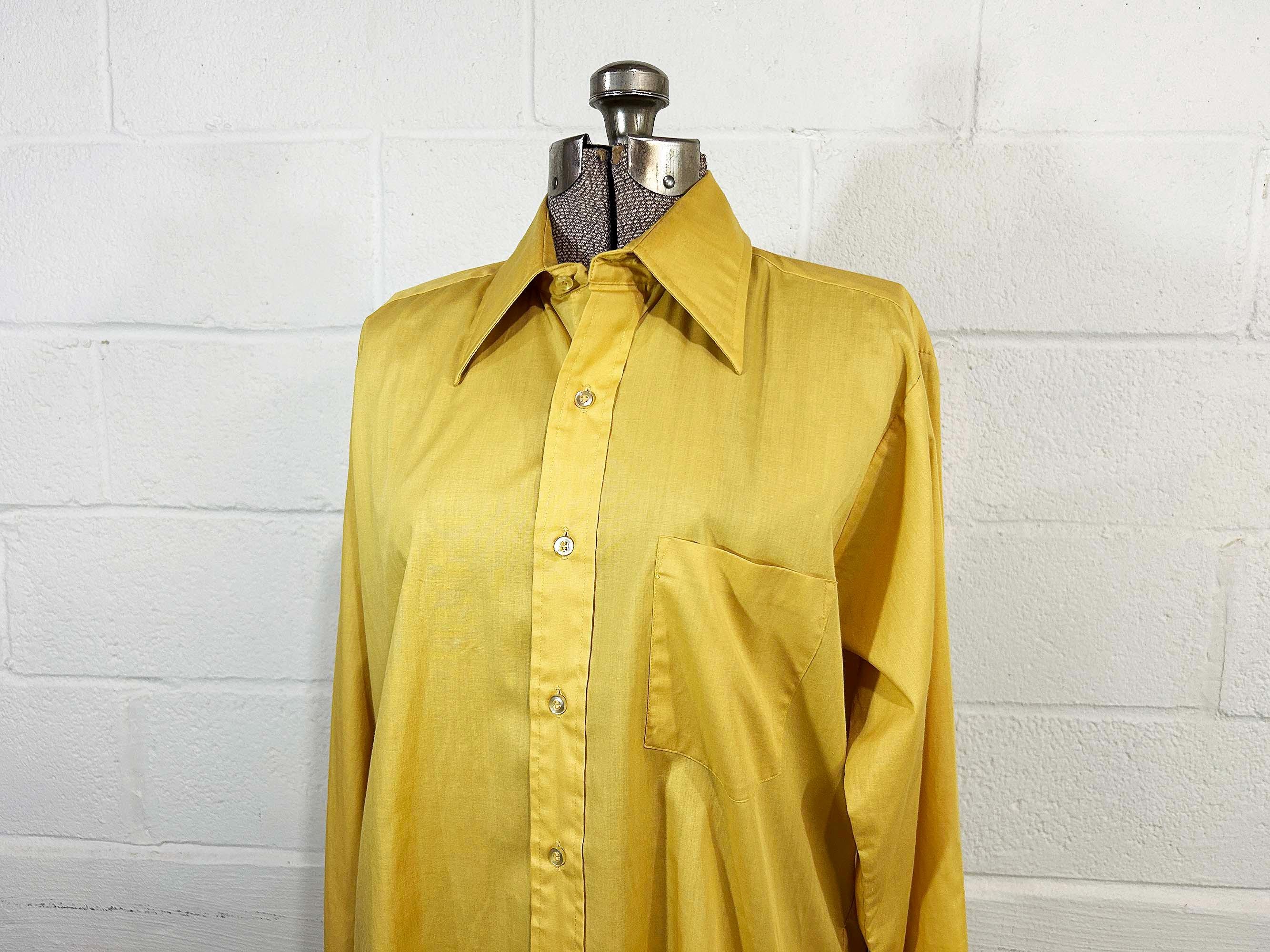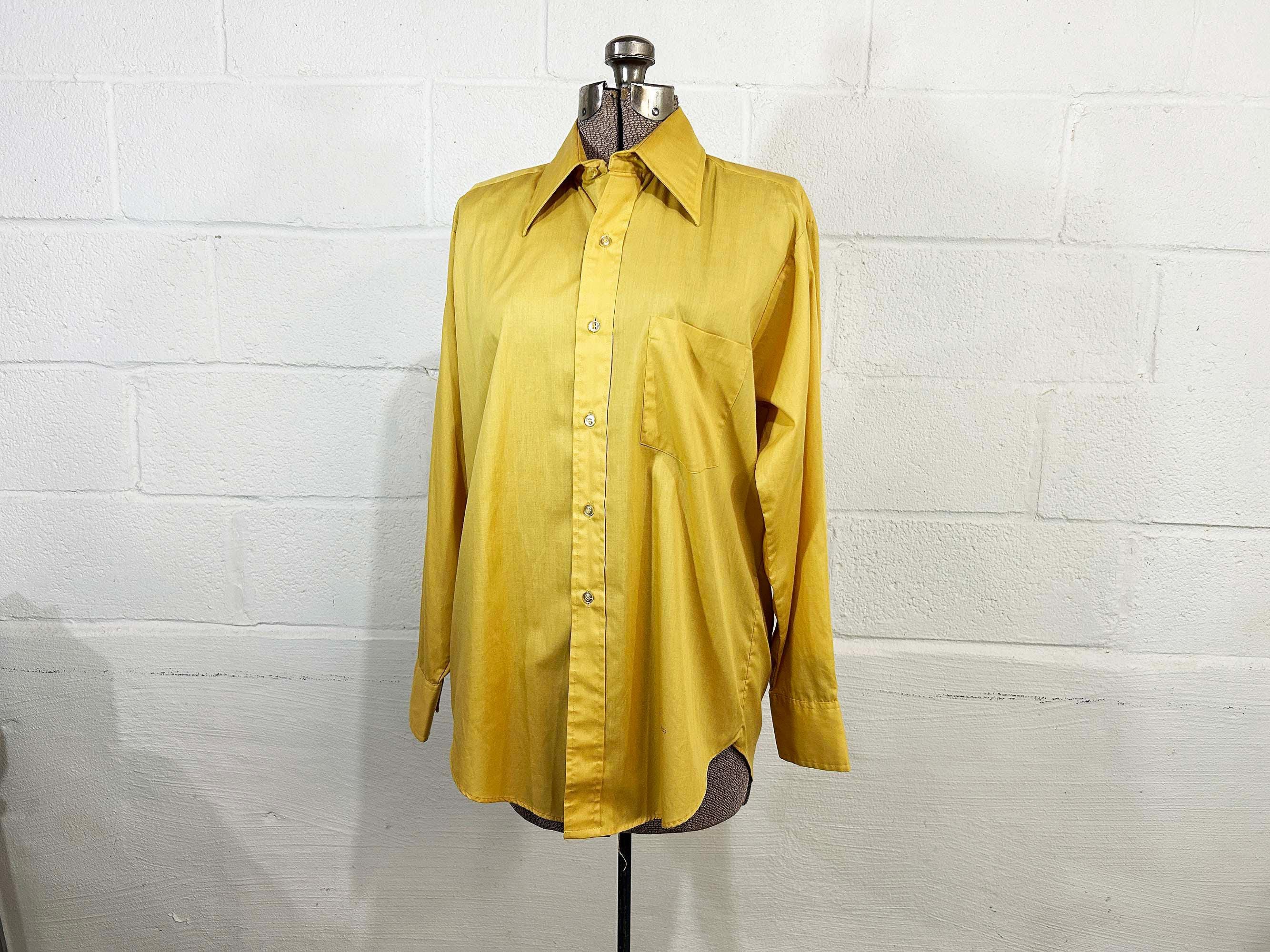 Lightweight mustard yellow button front shirt with long sleeves. Curved bottom hem and one front patch pocket. In good shape with no significant wear. Fabric has no stretch.