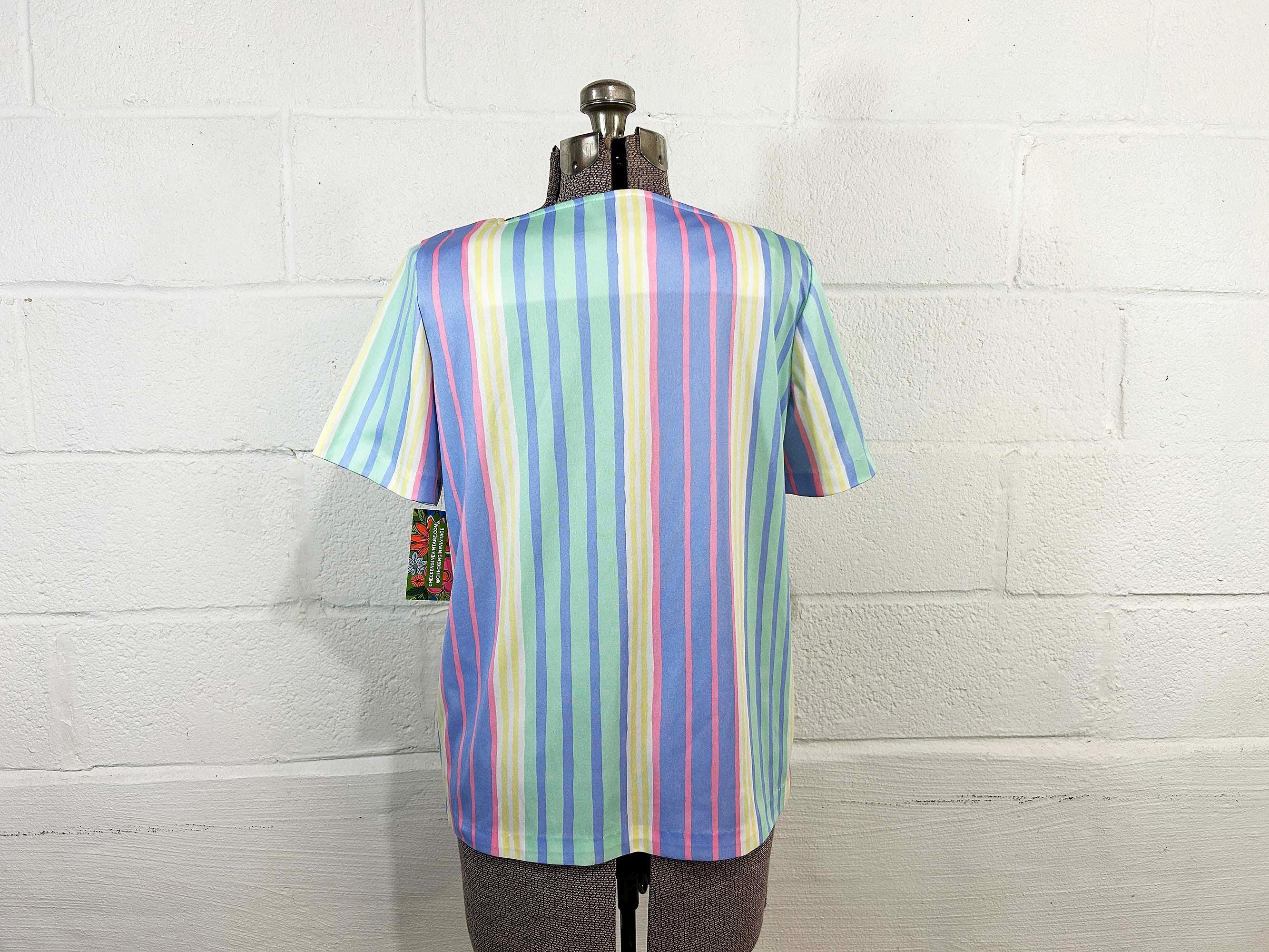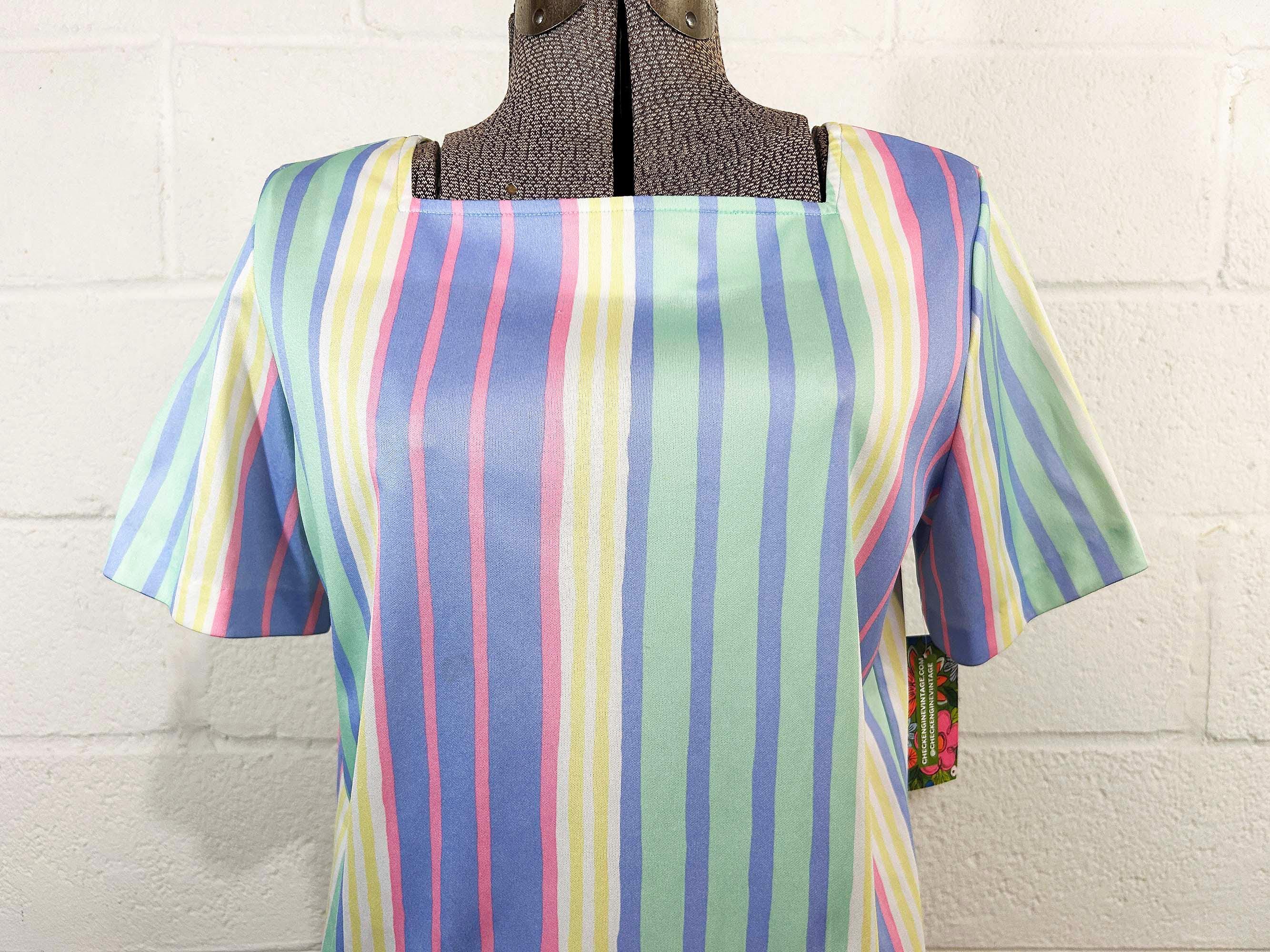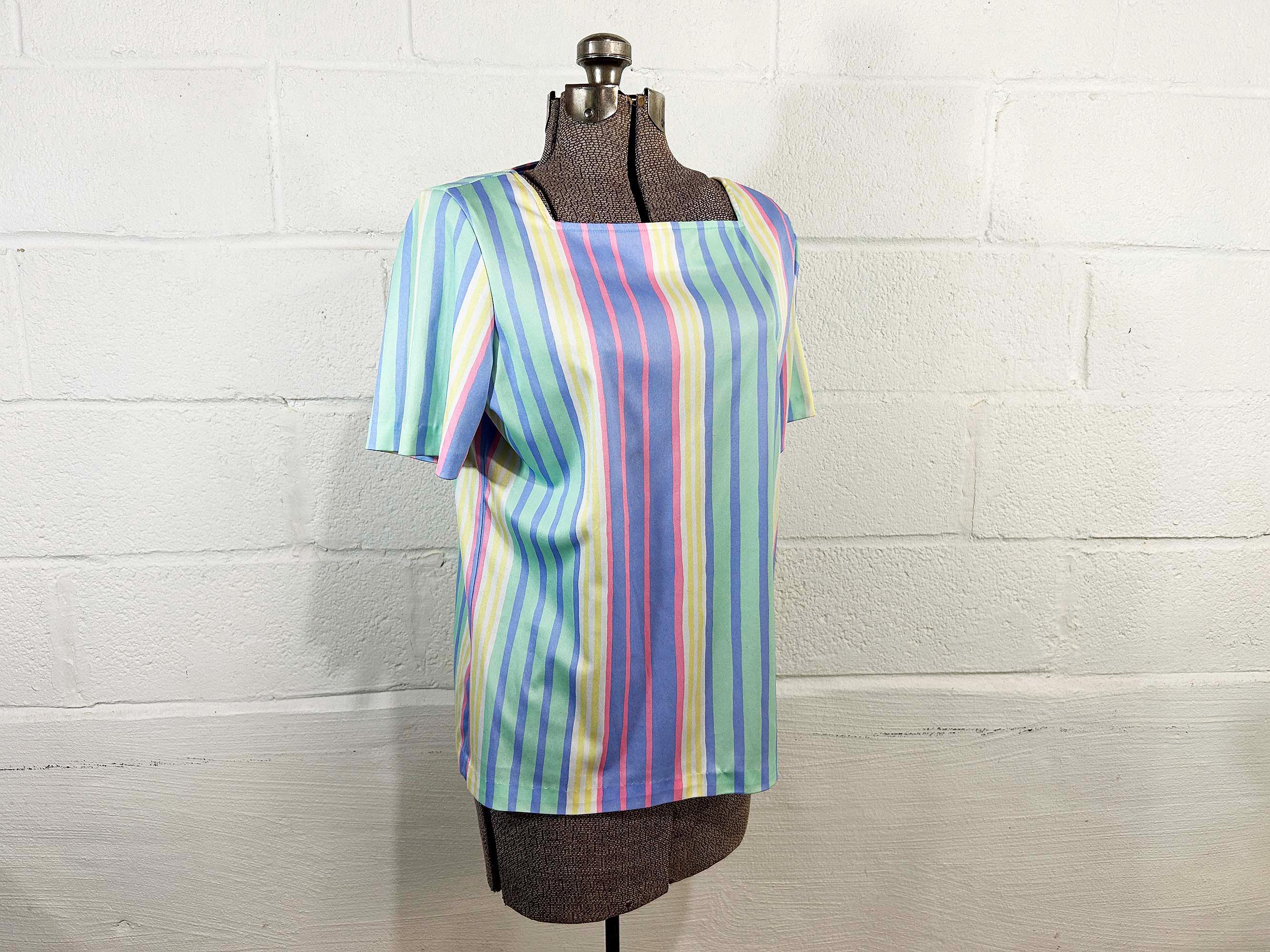 Cute pastel rainbow vertical striped lightweight polyester top. Top is in good shape with a few tiny snags - please be sure to inspect all photos closely. Pullover style with a square neckline and short sleeves. Fabric has stretch.