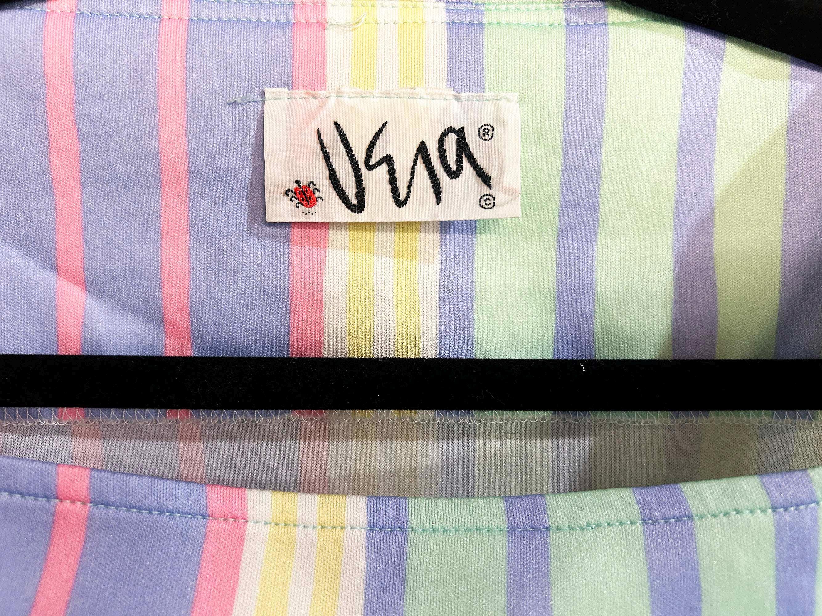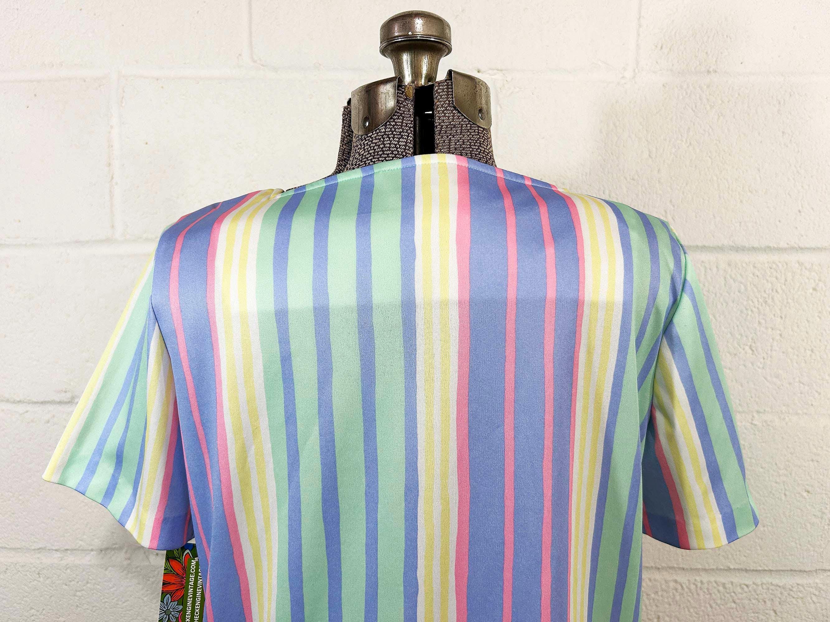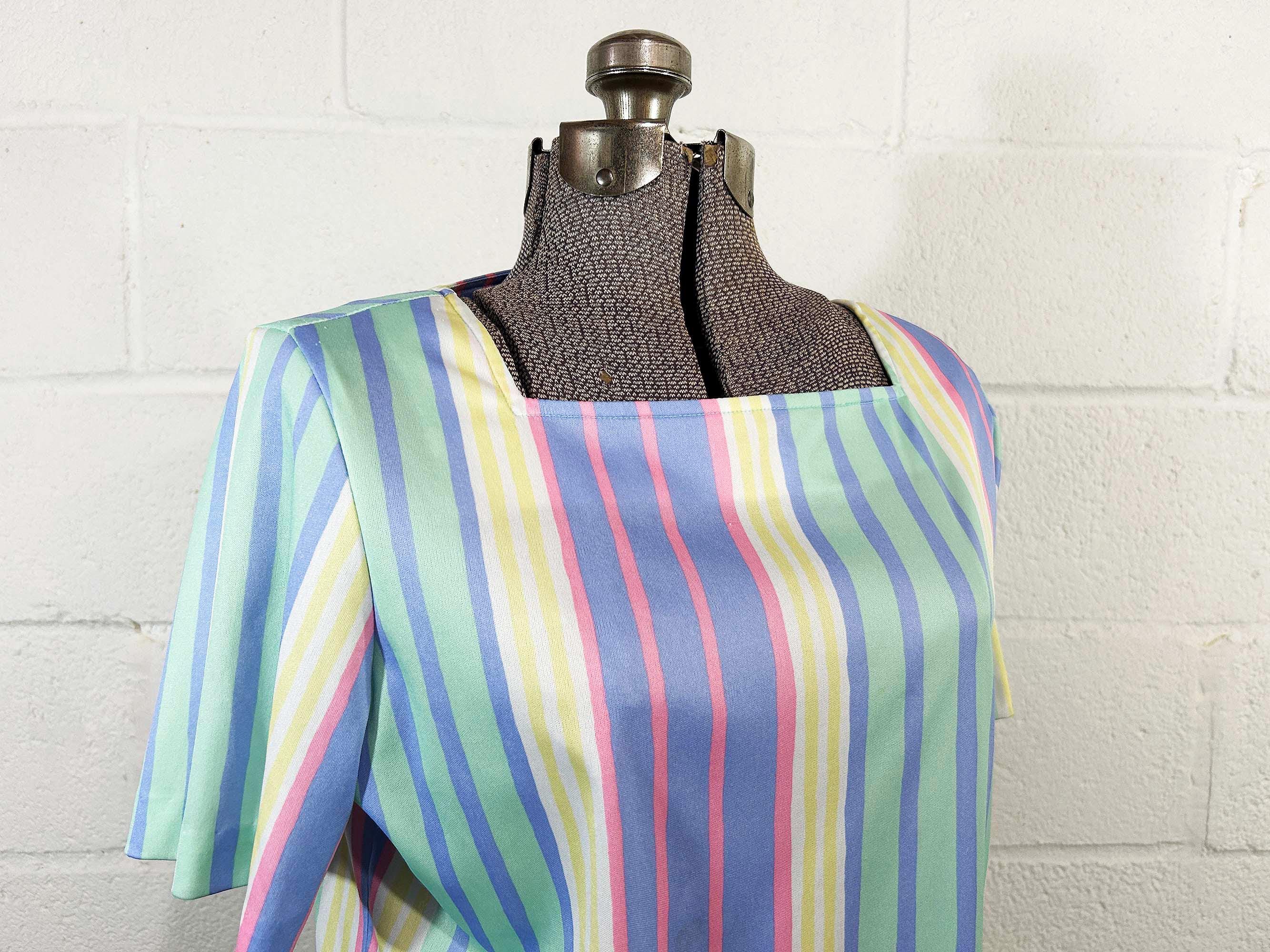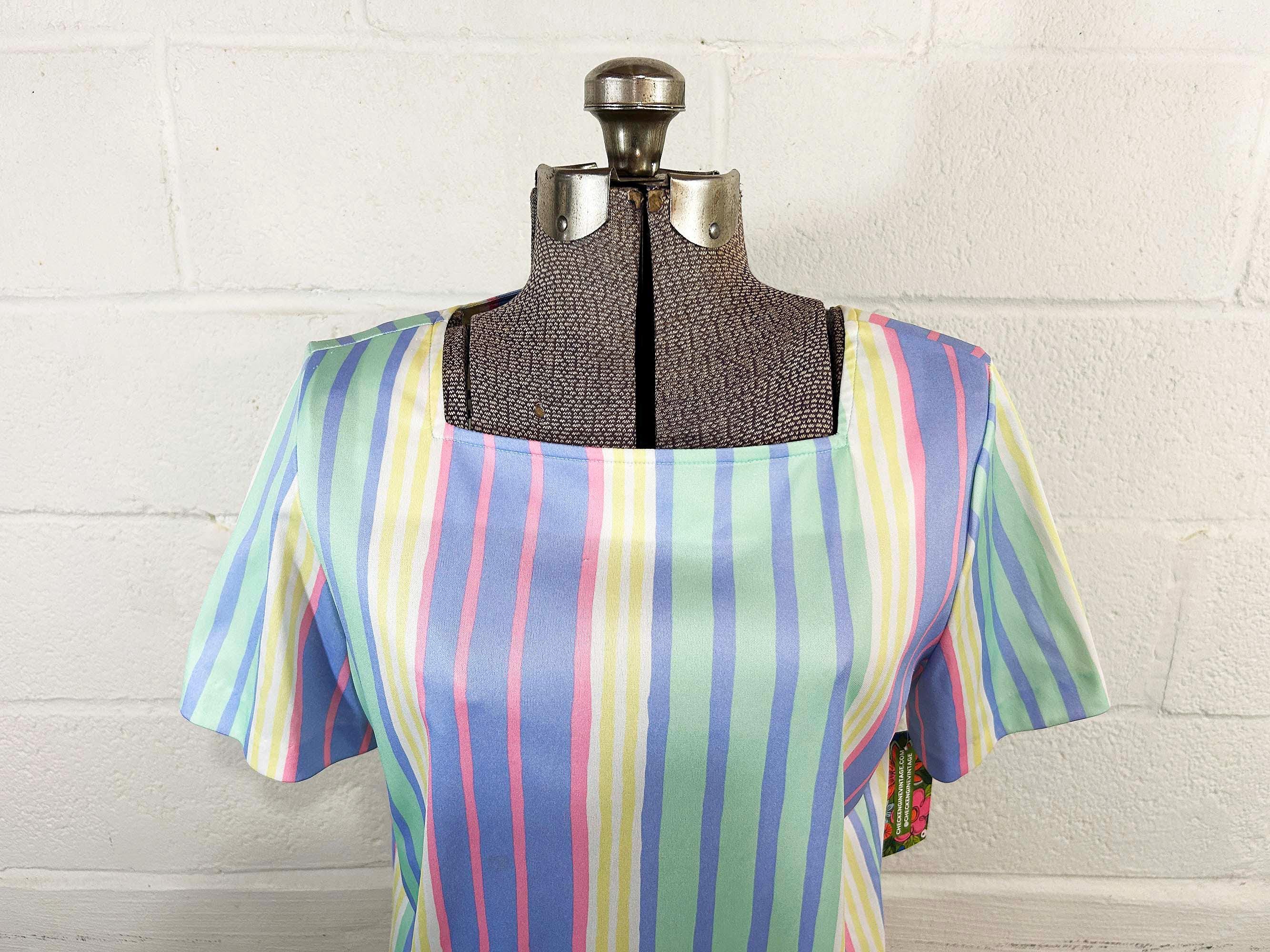 Cute pastel rainbow vertical striped lightweight polyester top. Top is in good shape with a few tiny snags - please be sure to inspect all photos closely. Pullover style with a square neckline and short sleeves. Fabric has stretch.