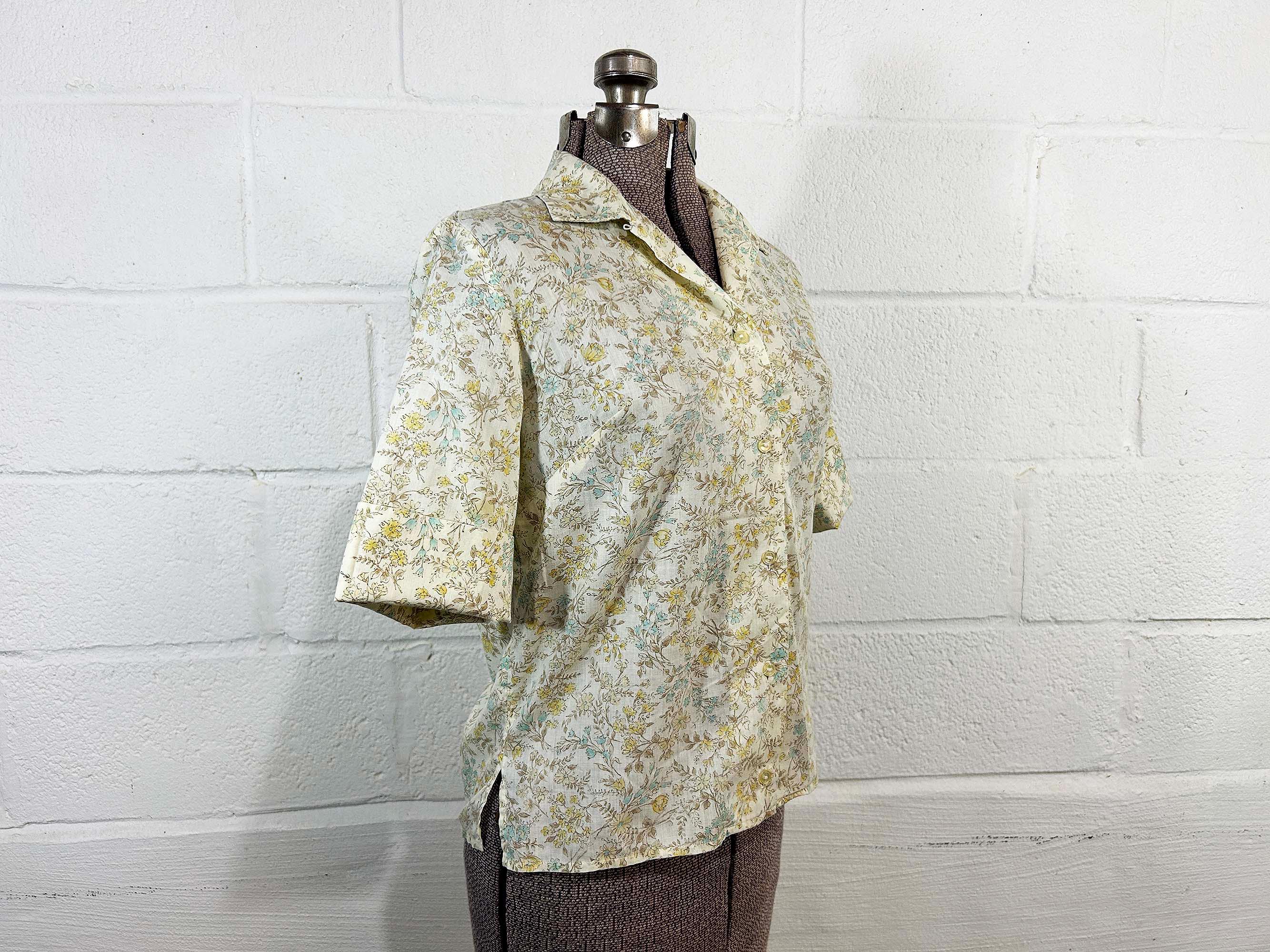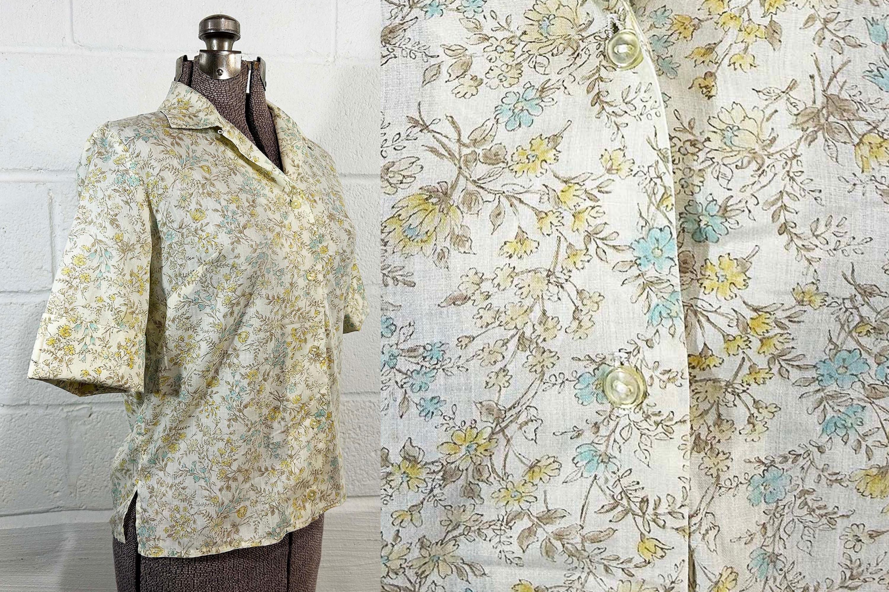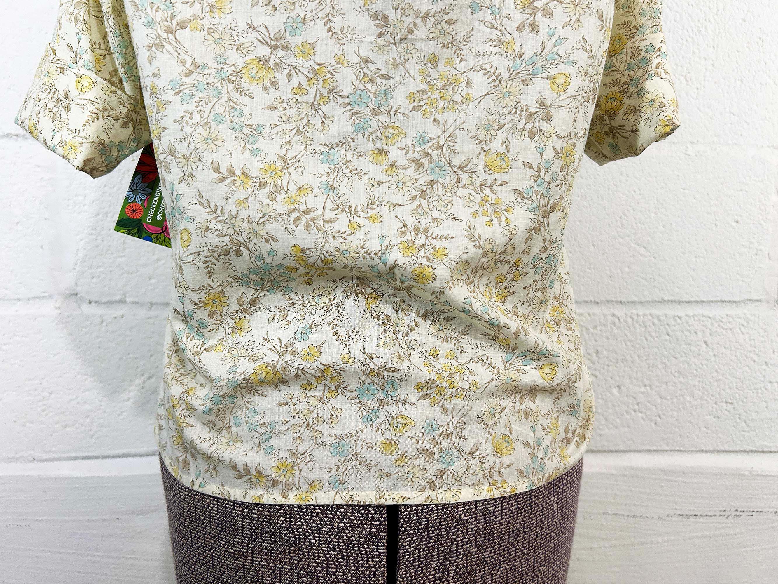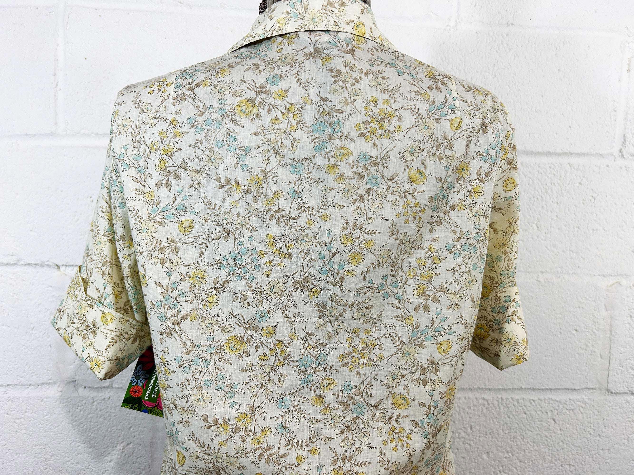 Super cute yellow floral button front shirt. The shirt has a delicate floral print. It has a collar, half sleeves, and a straight bottom hem. Shirt is in good vintage condition - it has some all over fading. Fabric is lightweight, has no stretch, and is slightly sheer. There are 2 1/2 inch slits at each side of the bottom hem