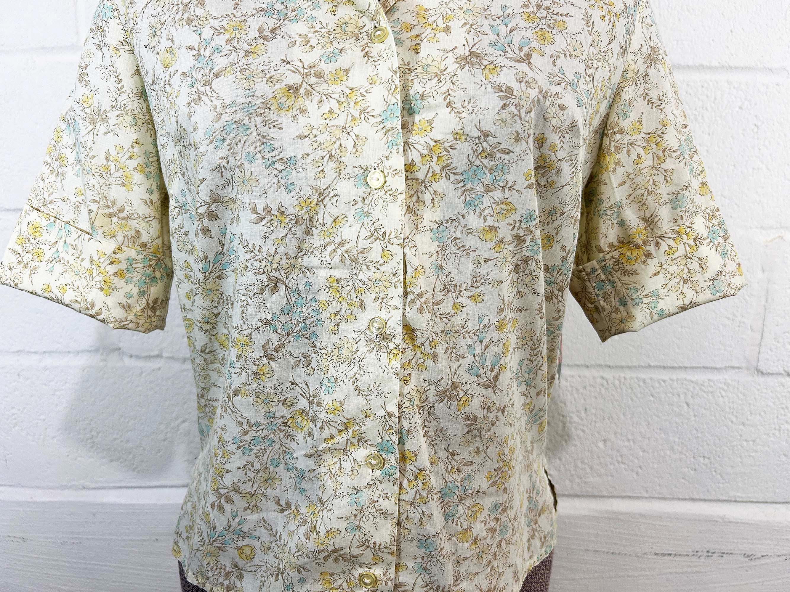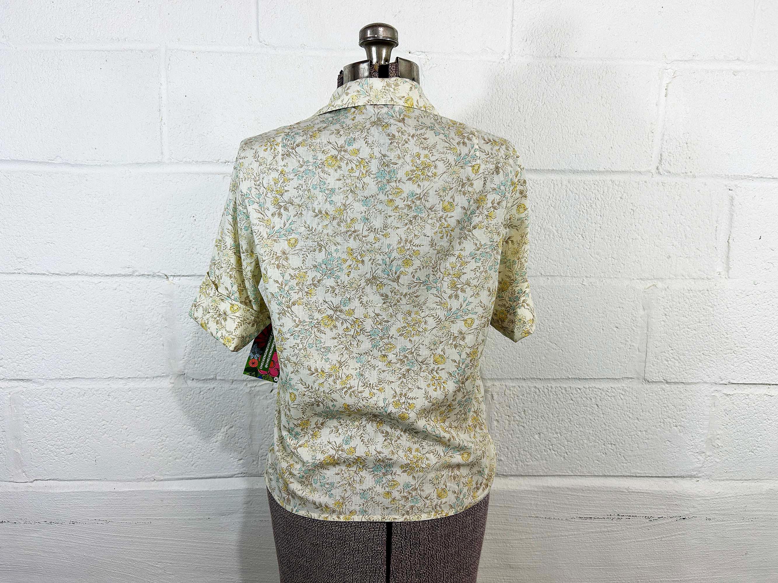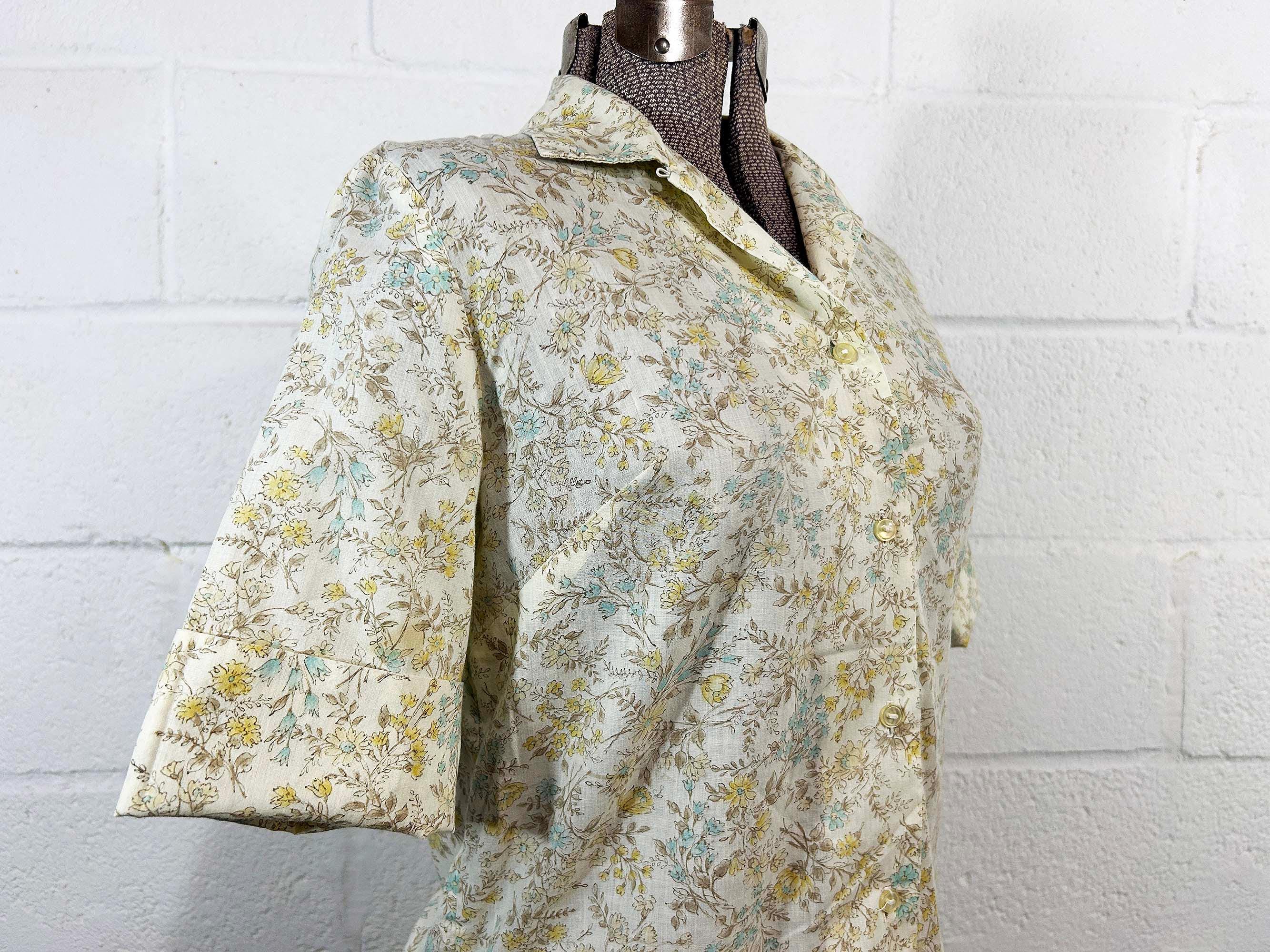 Super cute yellow floral button front shirt. The shirt has a delicate floral print. It has a collar, half sleeves, and a straight bottom hem. Shirt is in good vintage condition - it has some all over fading. Fabric is lightweight, has no stretch, and is slightly sheer. There are 2 1/2 inch slits at each side of the bottom hem