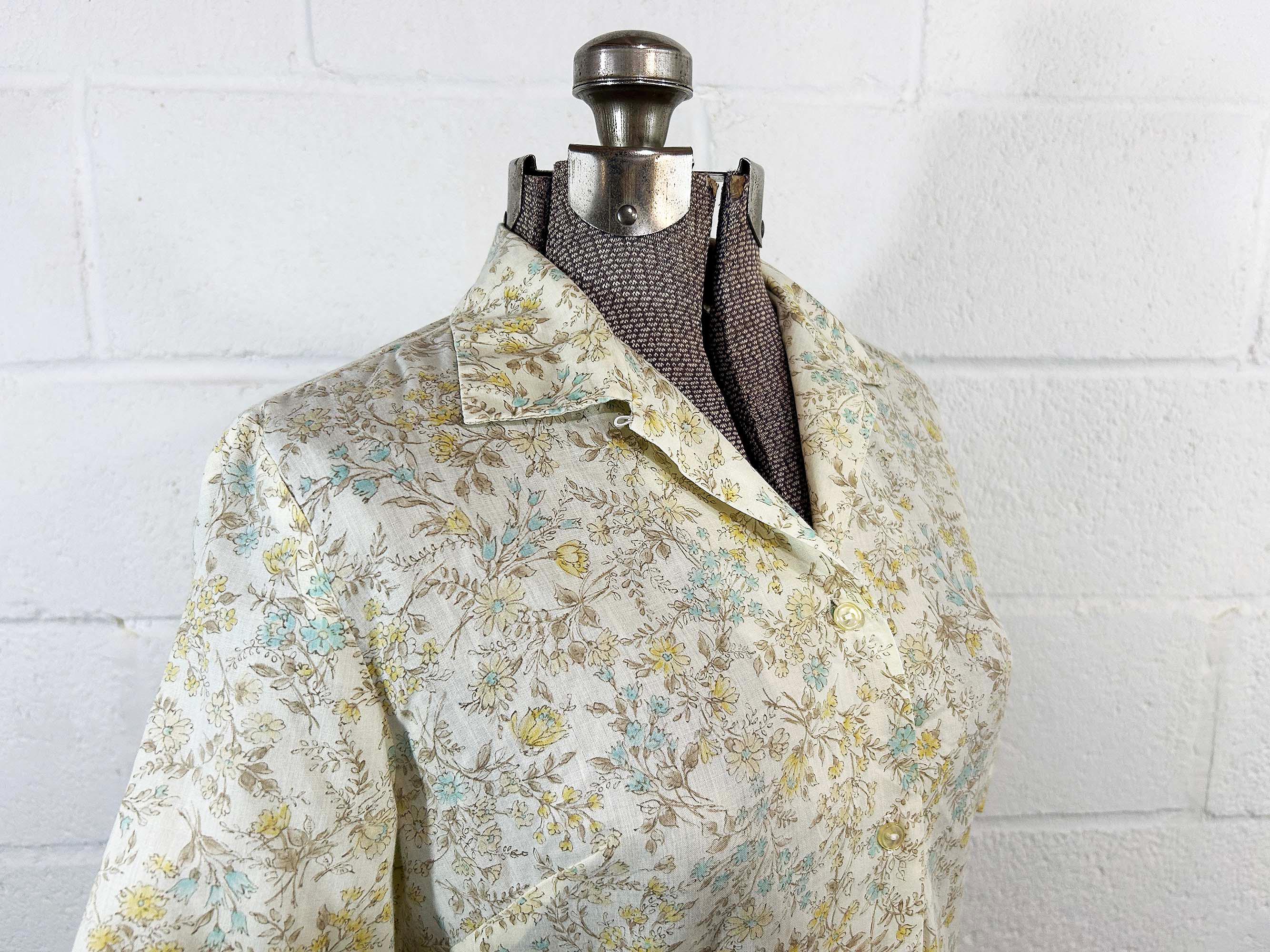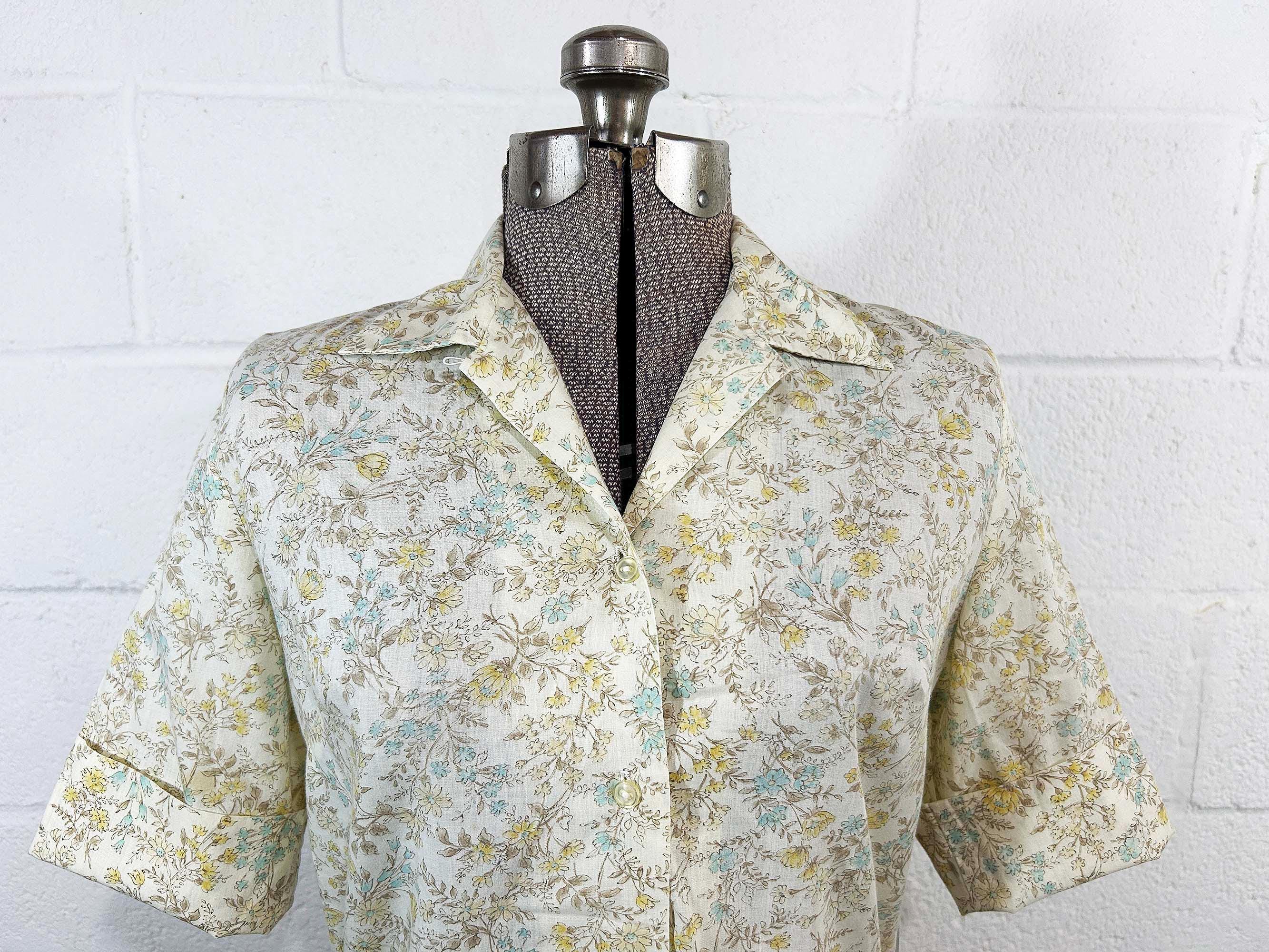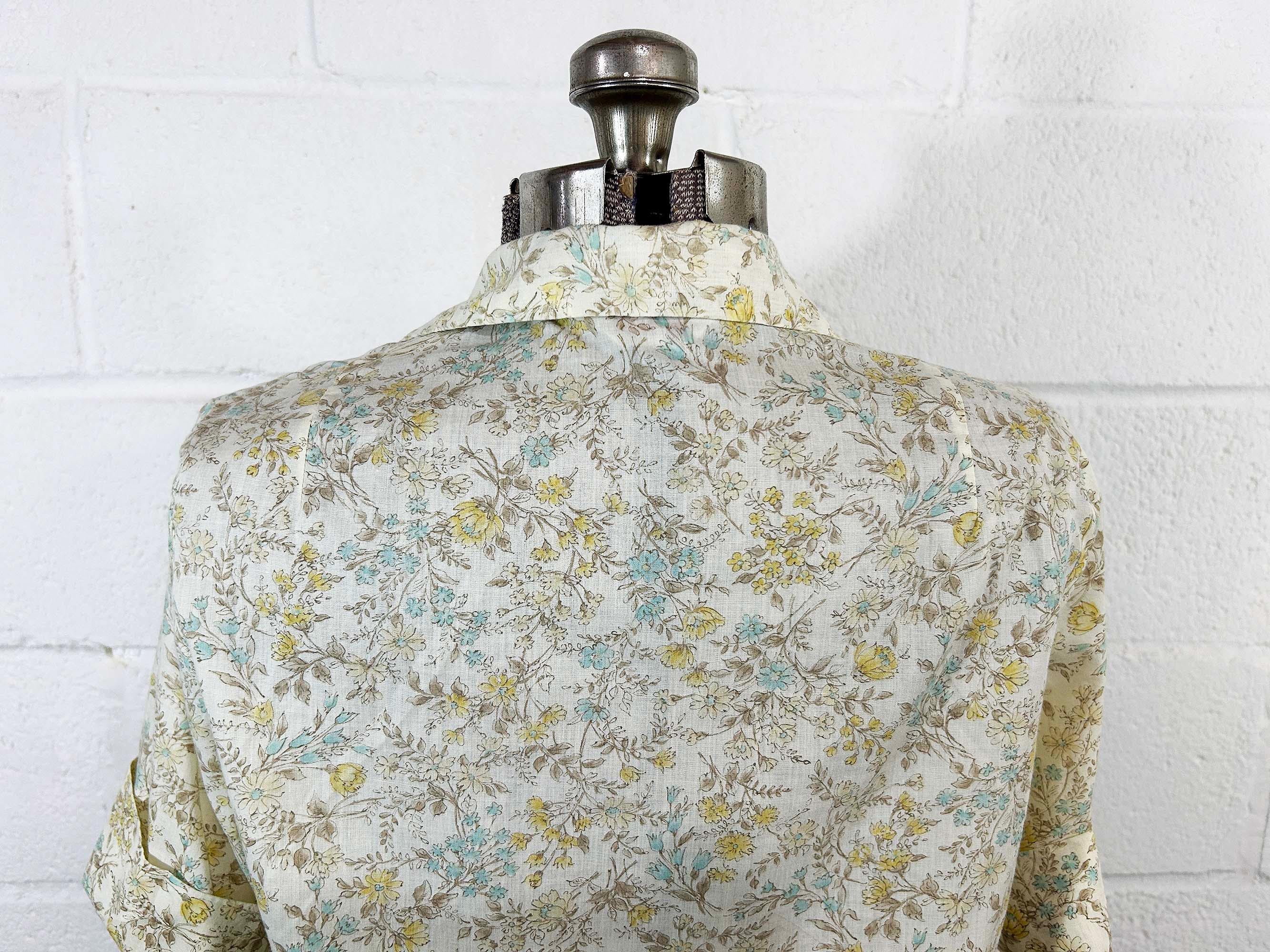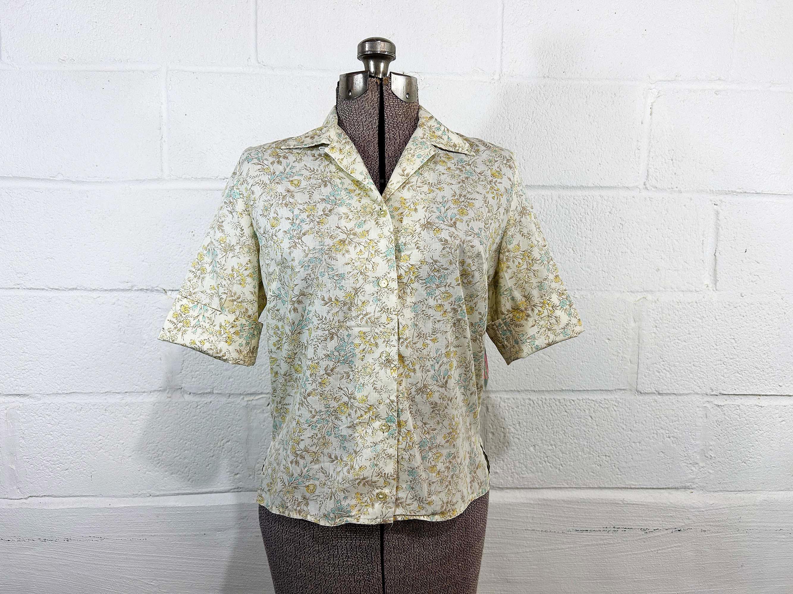 Super cute yellow floral button front shirt. The shirt has a delicate floral print. It has a collar, half sleeves, and a straight bottom hem. Shirt is in good vintage condition - it has some all over fading. Fabric is lightweight, has no stretch, and is slightly sheer. There are 2 1/2 inch slits at each side of the bottom hem