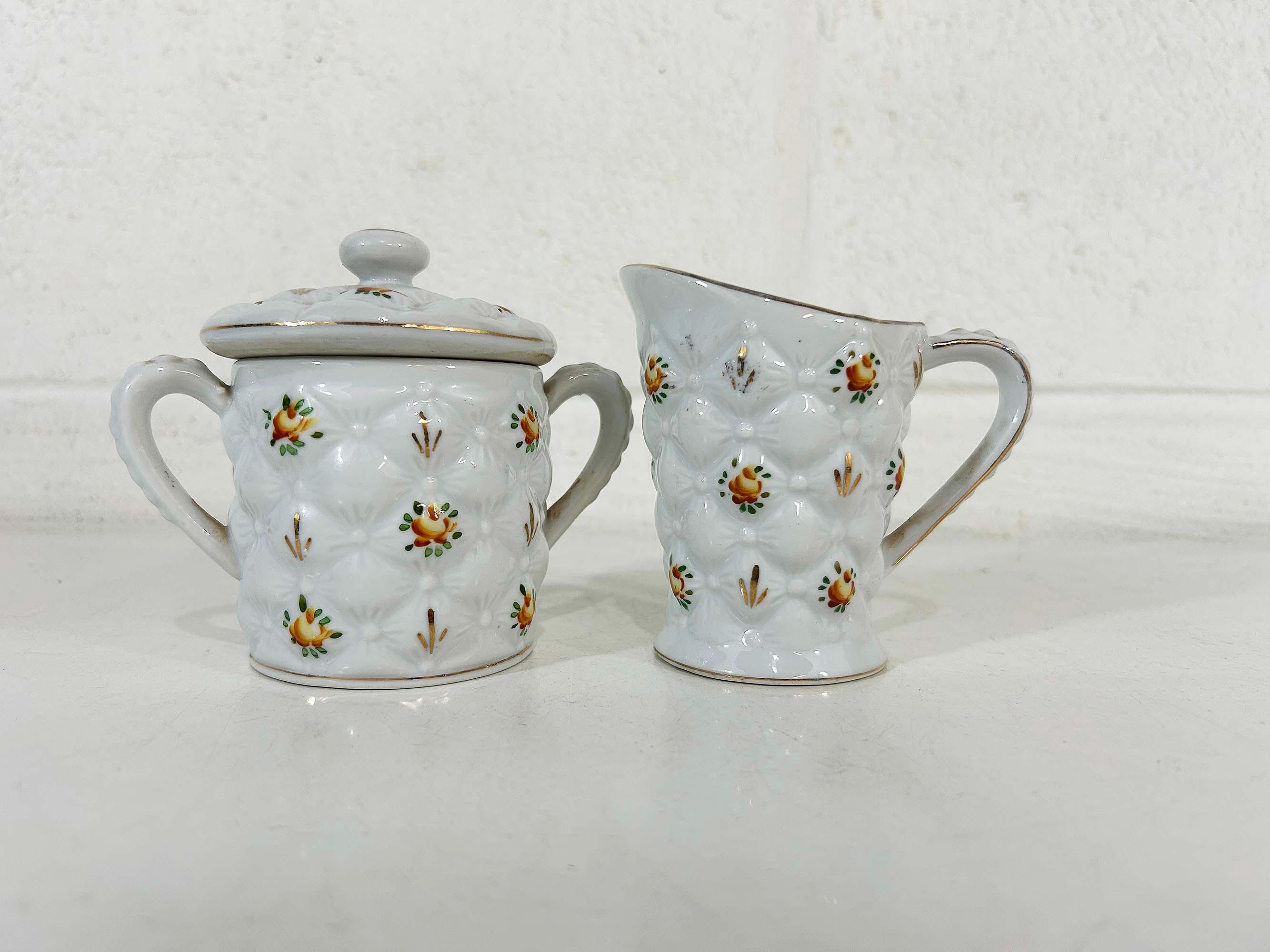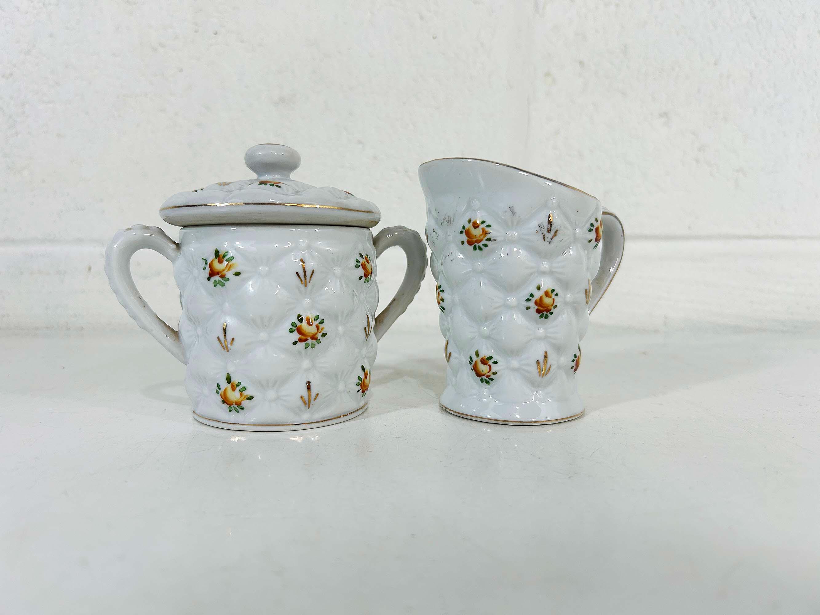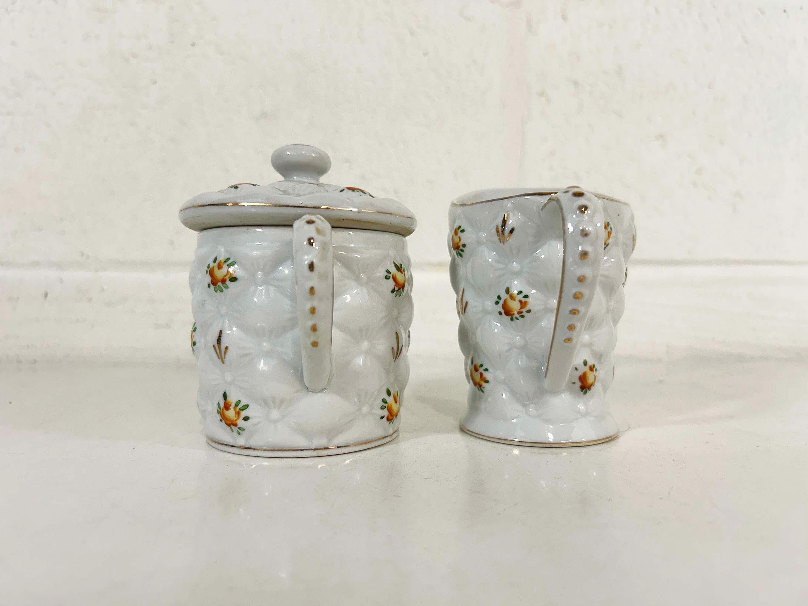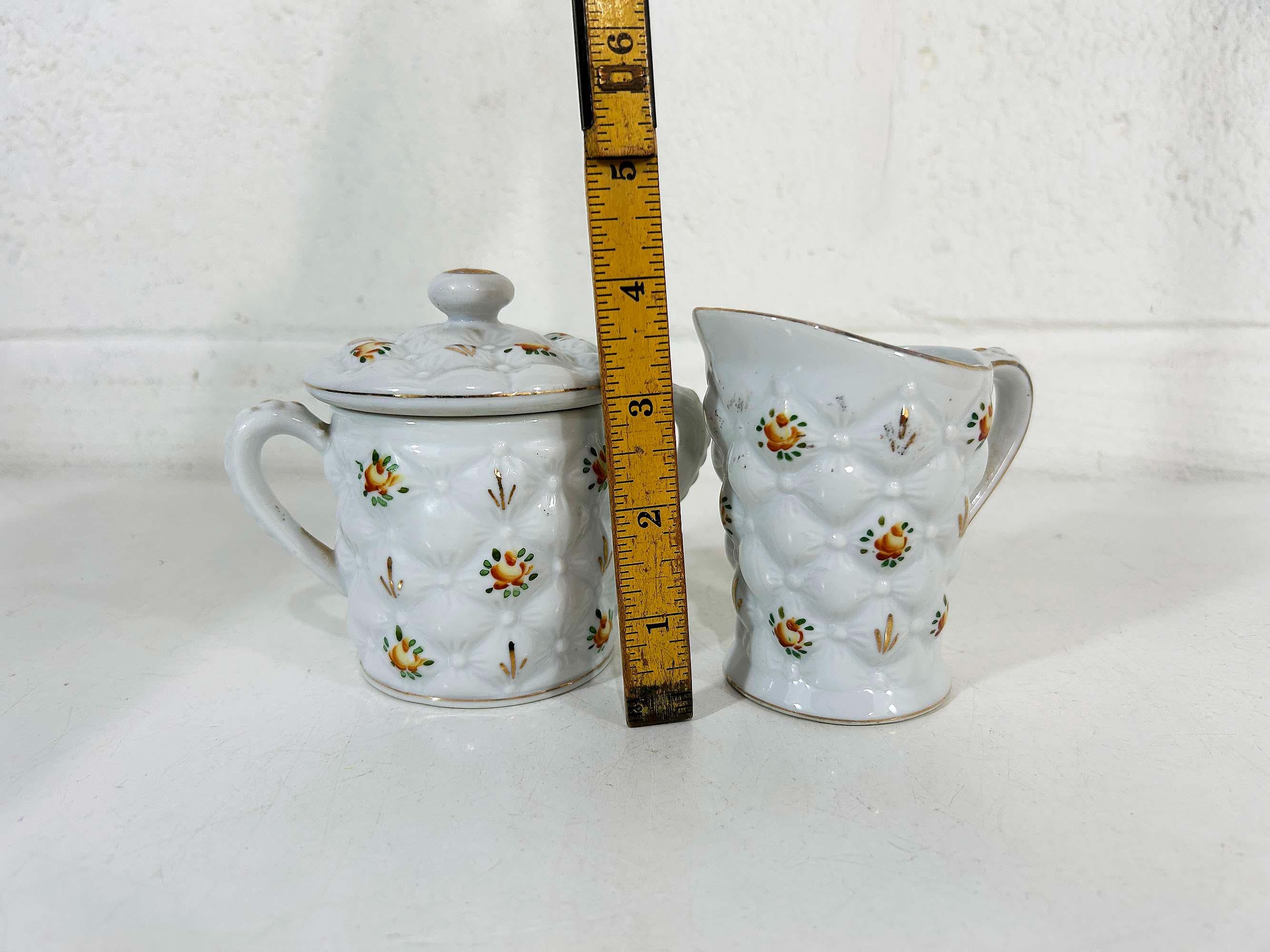Adorable quilted floral cream and sugar set! They are in good vintage condition. Please be sure to zoom in and examine the photos closely. The creamer is approximately 3 3/4 inches tall and the sugar bowl is approximately 4 inches tall including the handle. They are both approximately 2 1/2 inches in diameter at their openings.