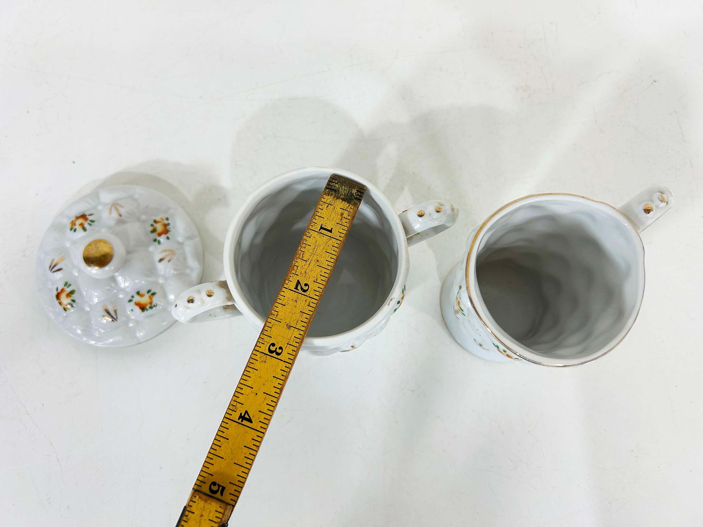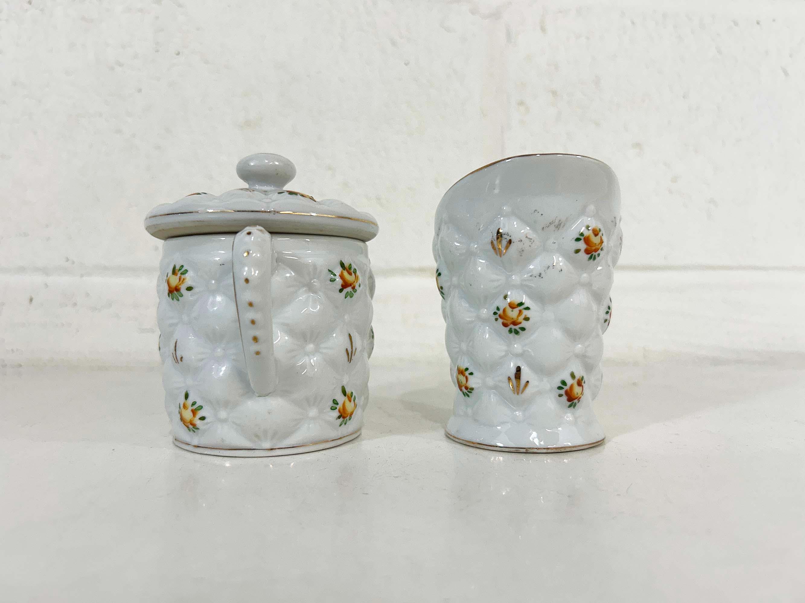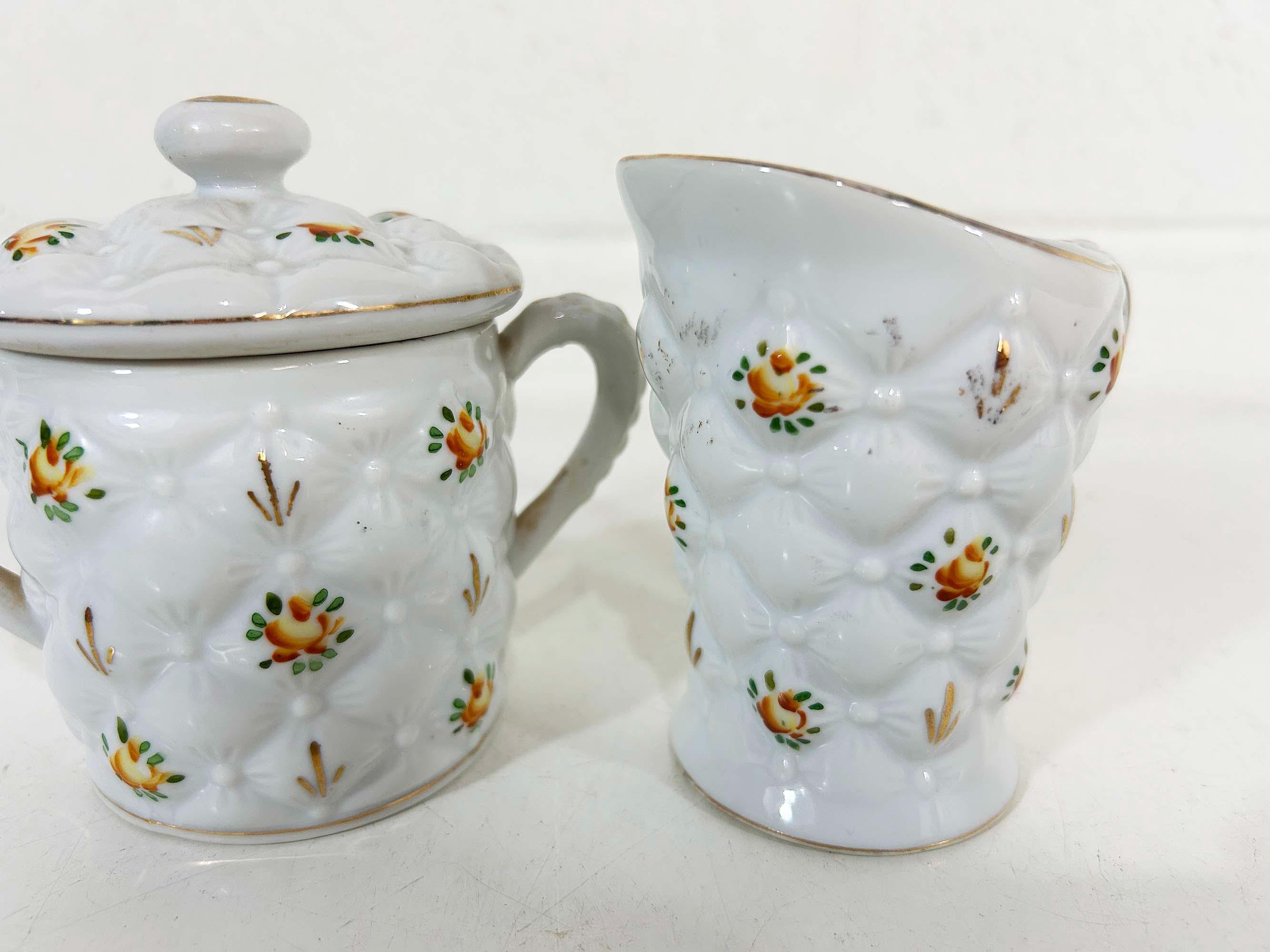 Adorable quilted floral cream and sugar set! They are in good vintage condition. Please be sure to zoom in and examine the photos closely. The creamer is approximately 3 3/4 inches tall and the sugar bowl is approximately 4 inches tall including the handle. They are both approximately 2 1/2 inches in diameter at their openings.