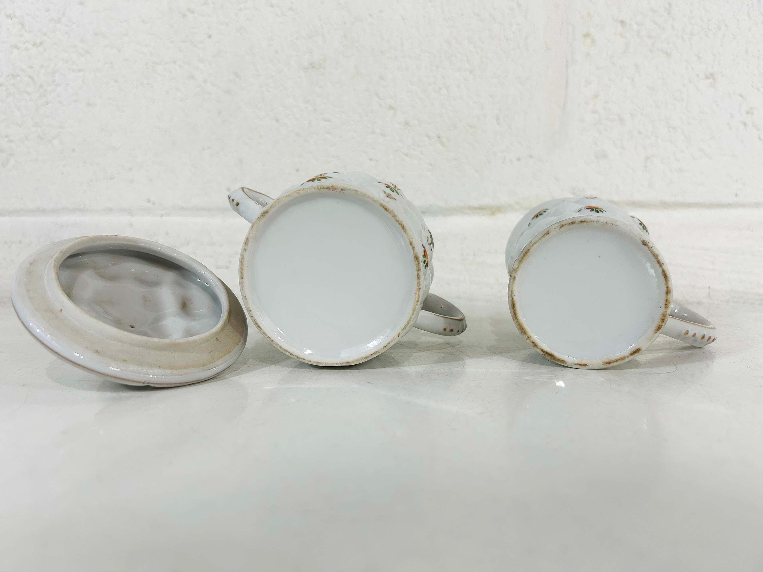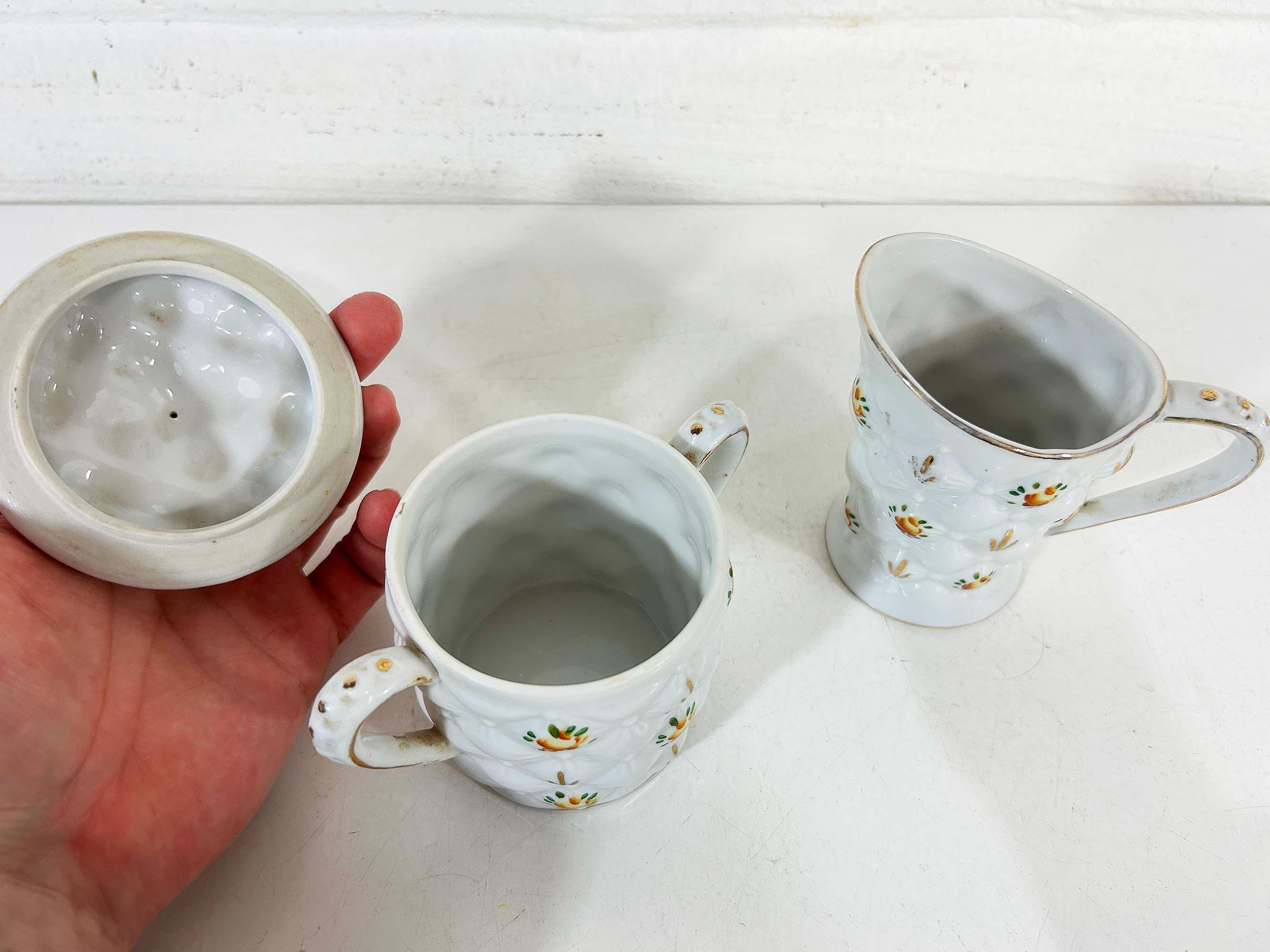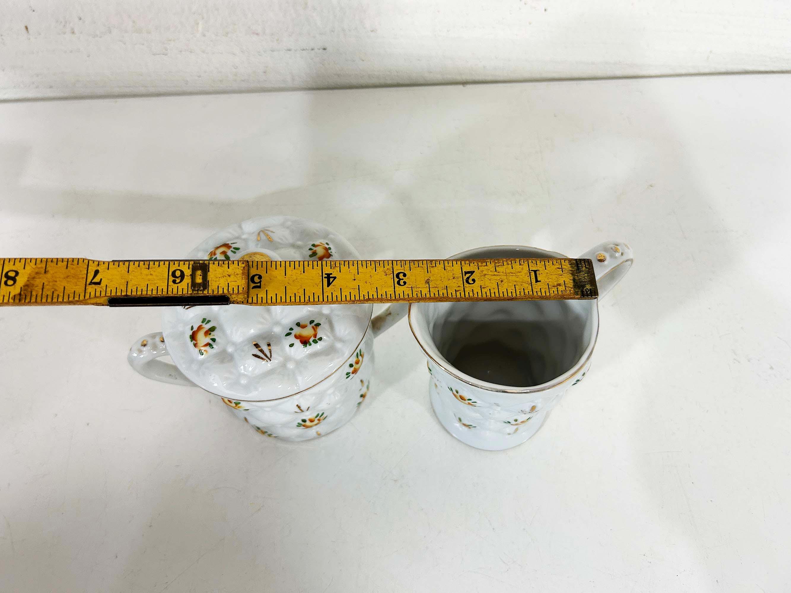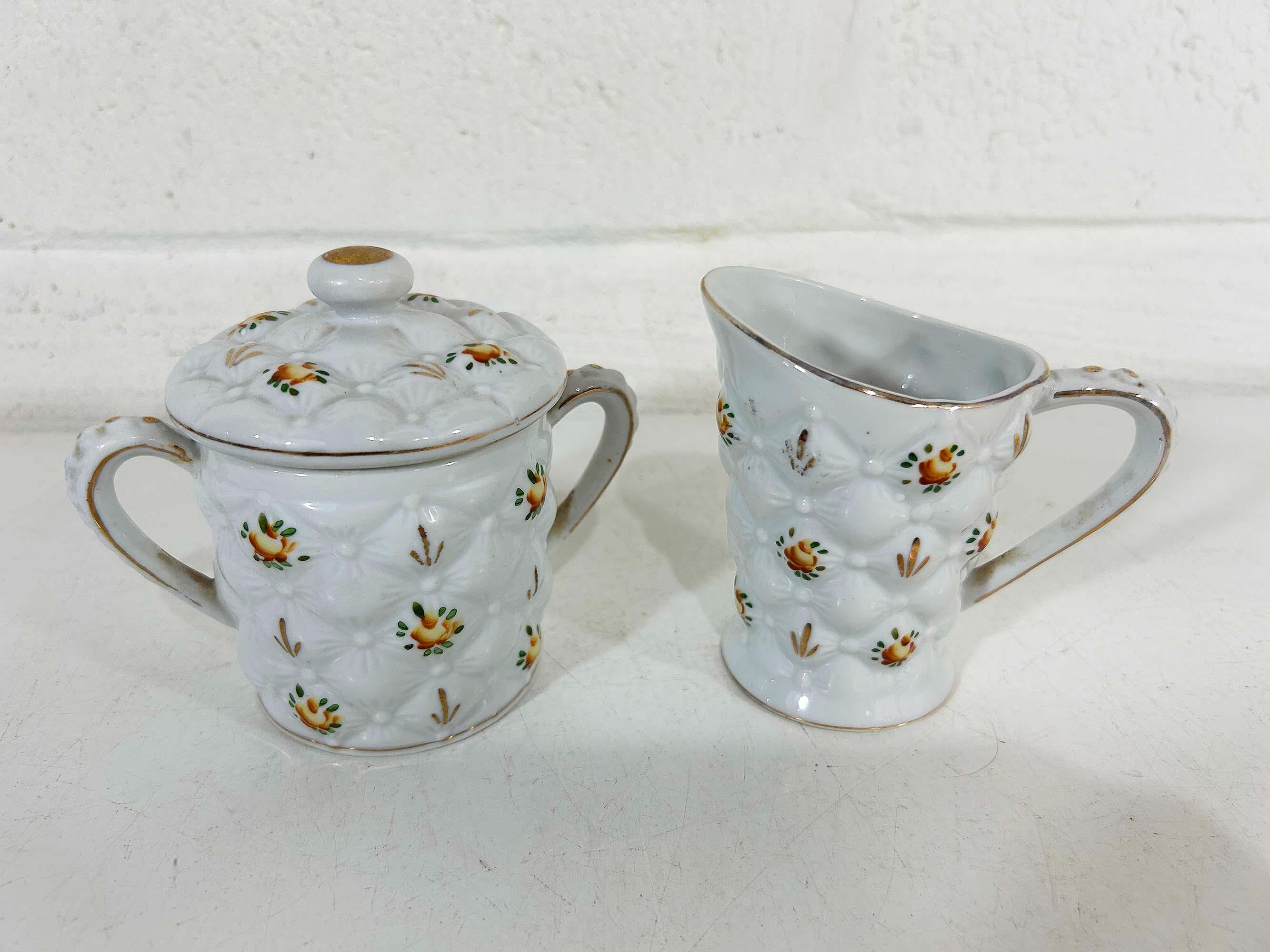 Adorable quilted floral cream and sugar set! They are in good vintage condition. Please be sure to zoom in and examine the photos closely. The creamer is approximately 3 3/4 inches tall and the sugar bowl is approximately 4 inches tall including the handle. They are both approximately 2 1/2 inches in diameter at their openings.
