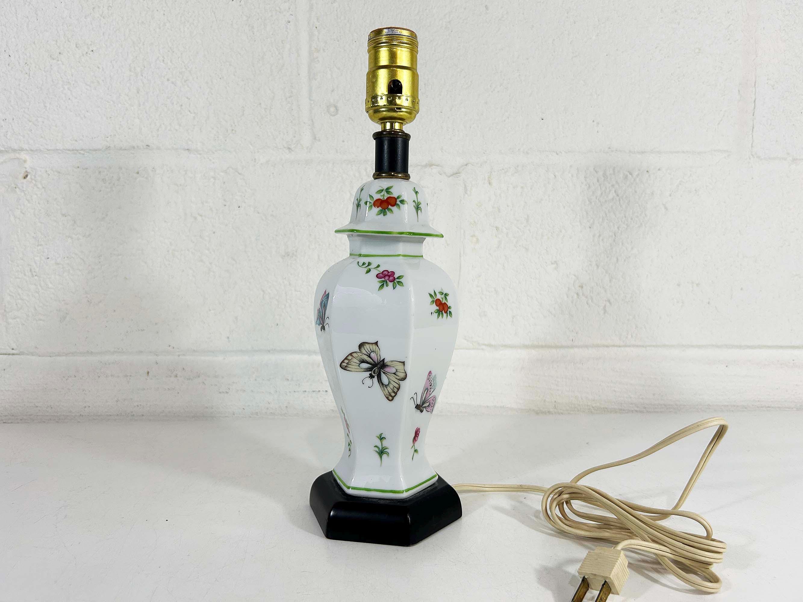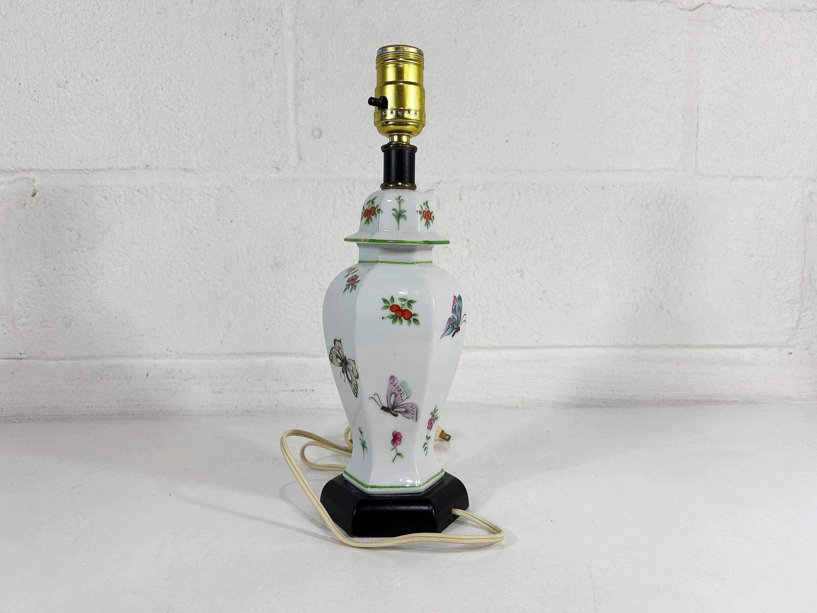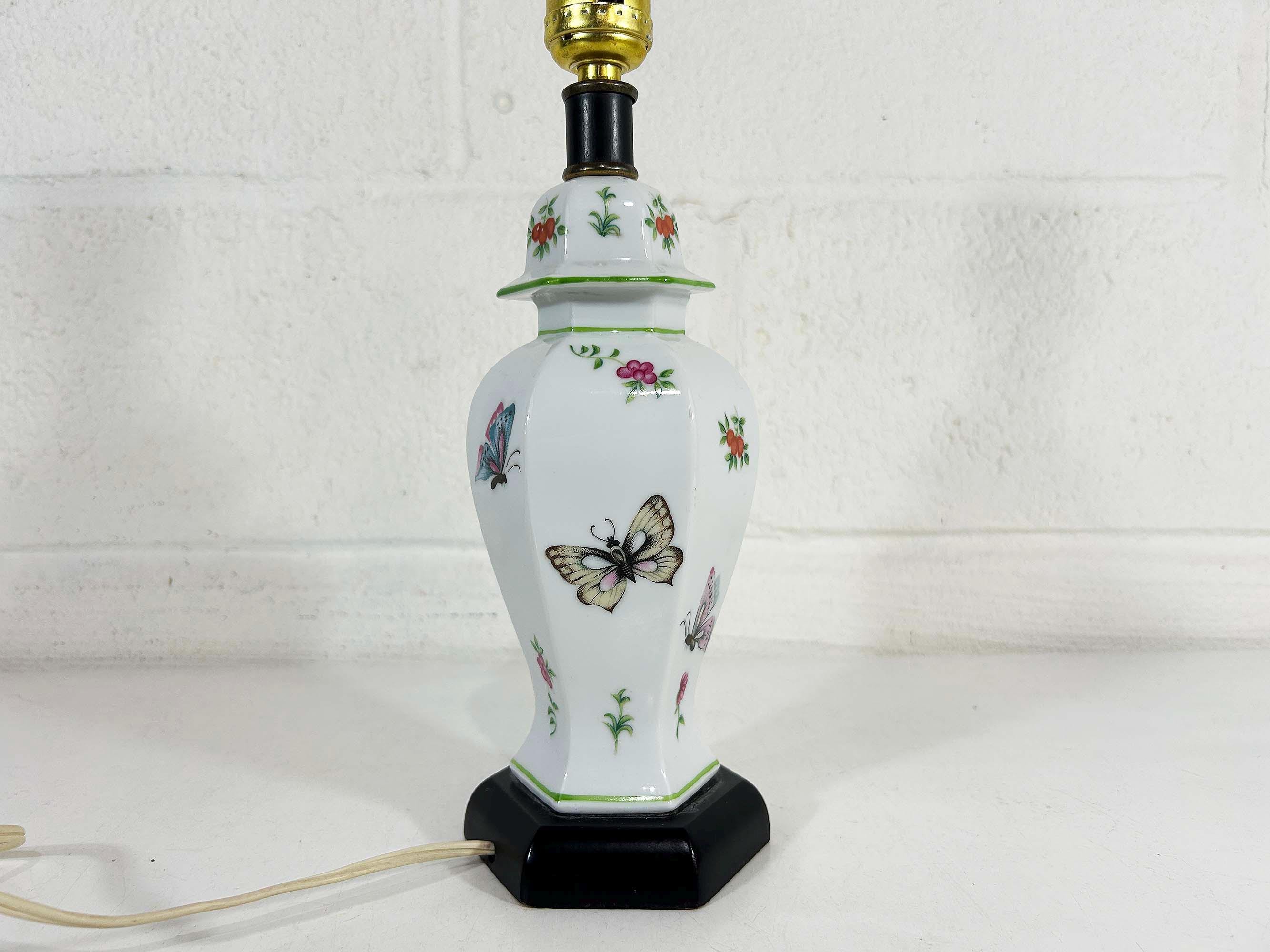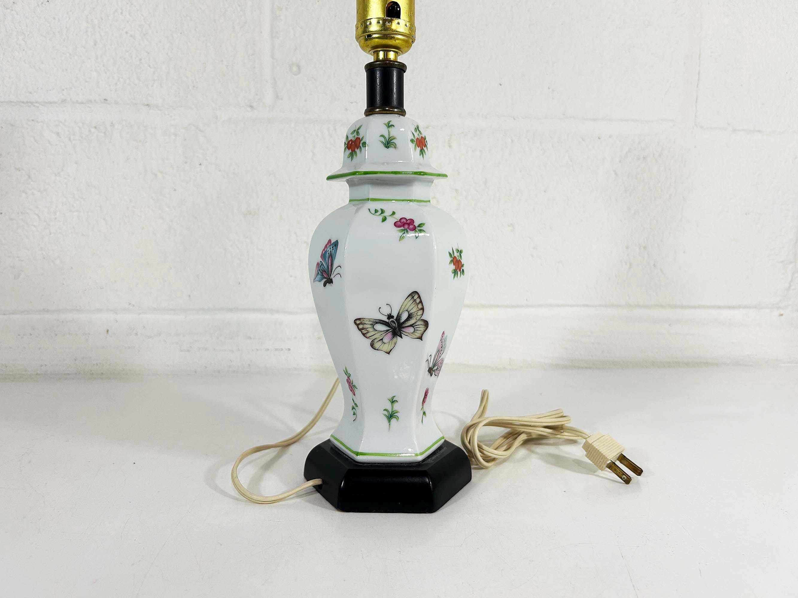 Lovely porcelain butterfly ginger jar table lamp! It is in great, working condition, ready to be used in your home. The lamp is approximately 12 1/2 inches tall and 3 1/2 inches in diameter at the base.