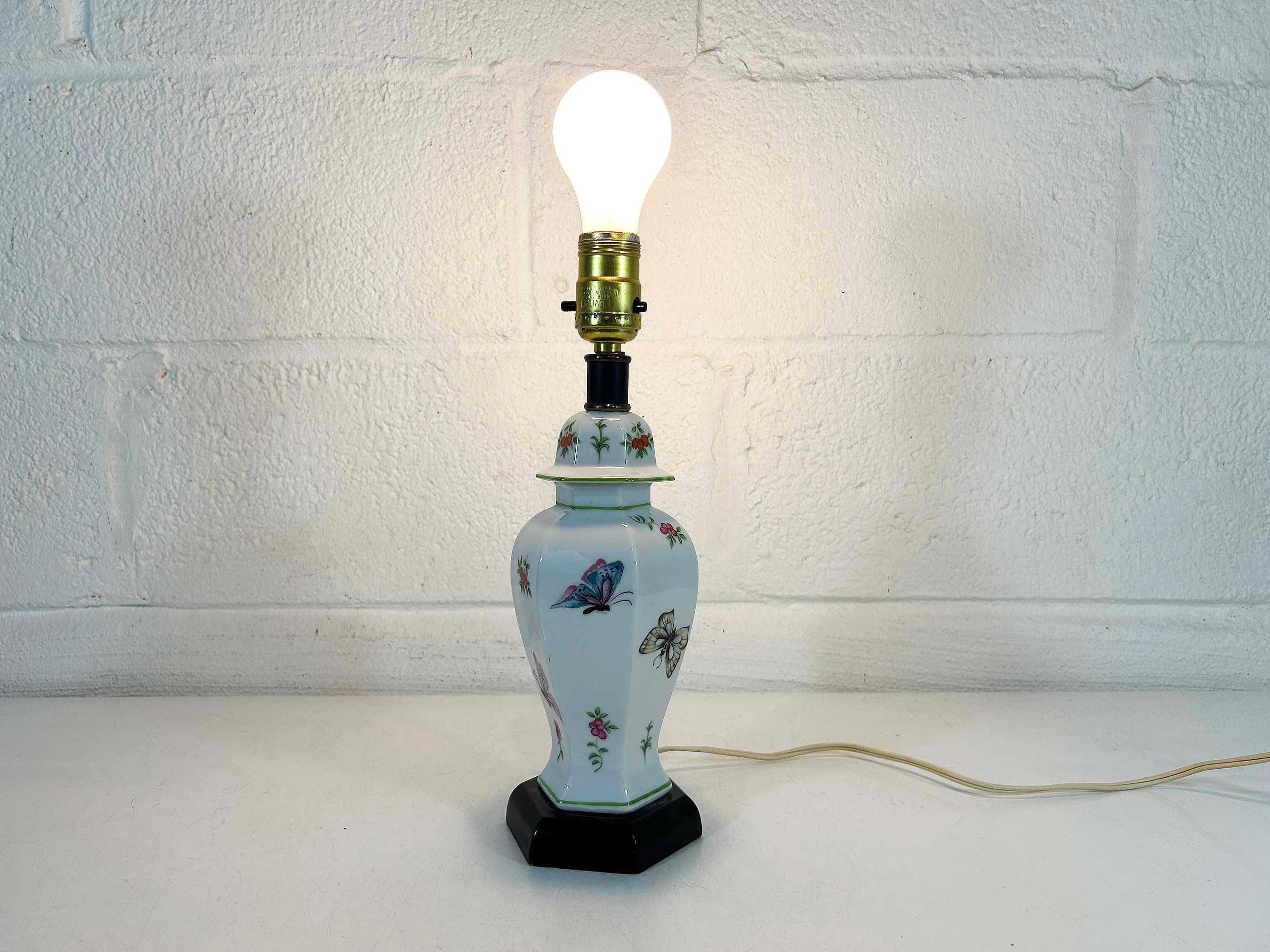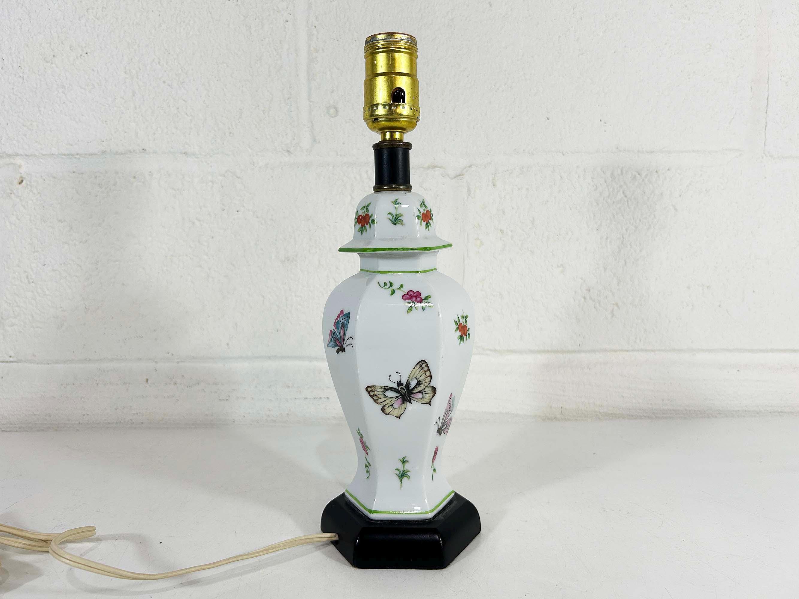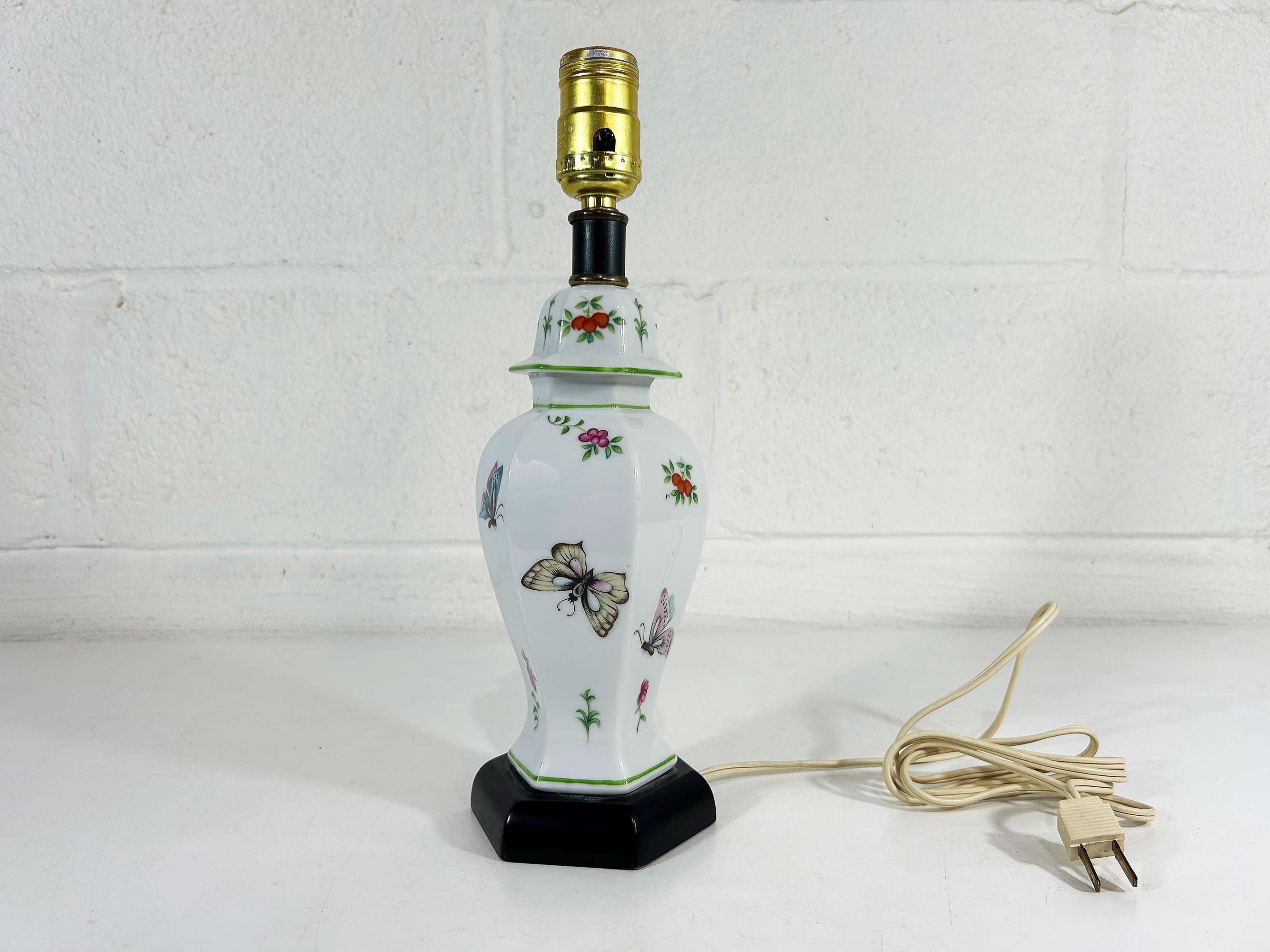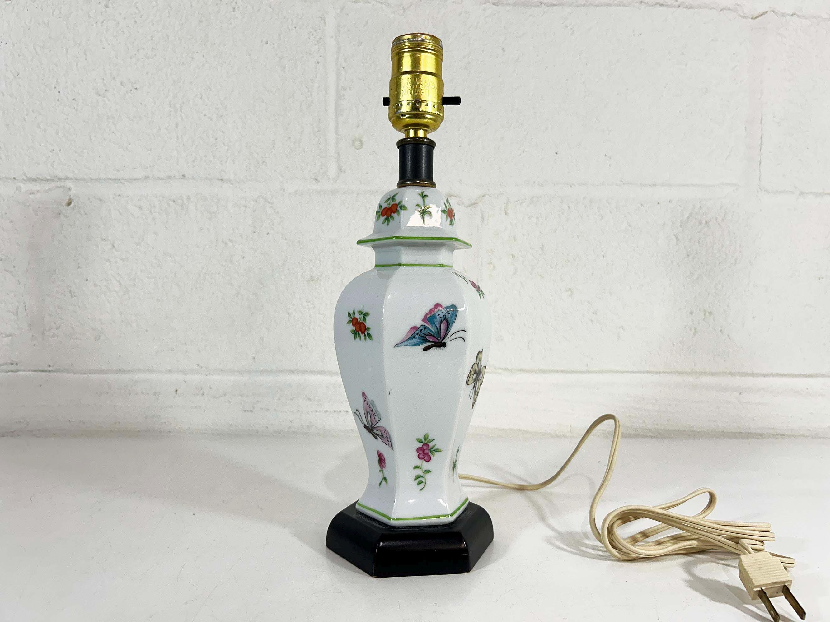 Lovely porcelain butterfly ginger jar table lamp! It is in great, working condition, ready to be used in your home. The lamp is approximately 12 1/2 inches tall and 3 1/2 inches in diameter at the base.