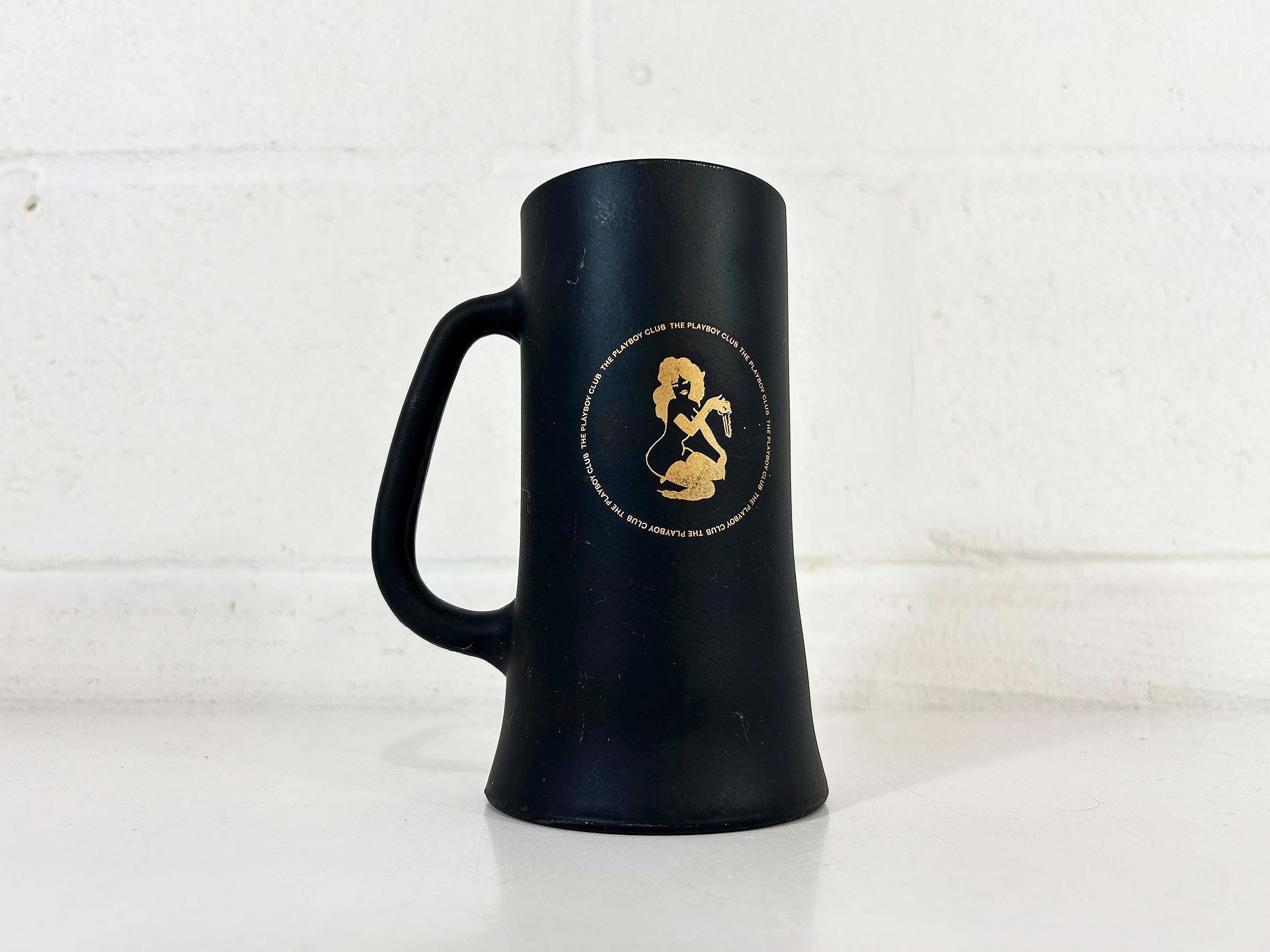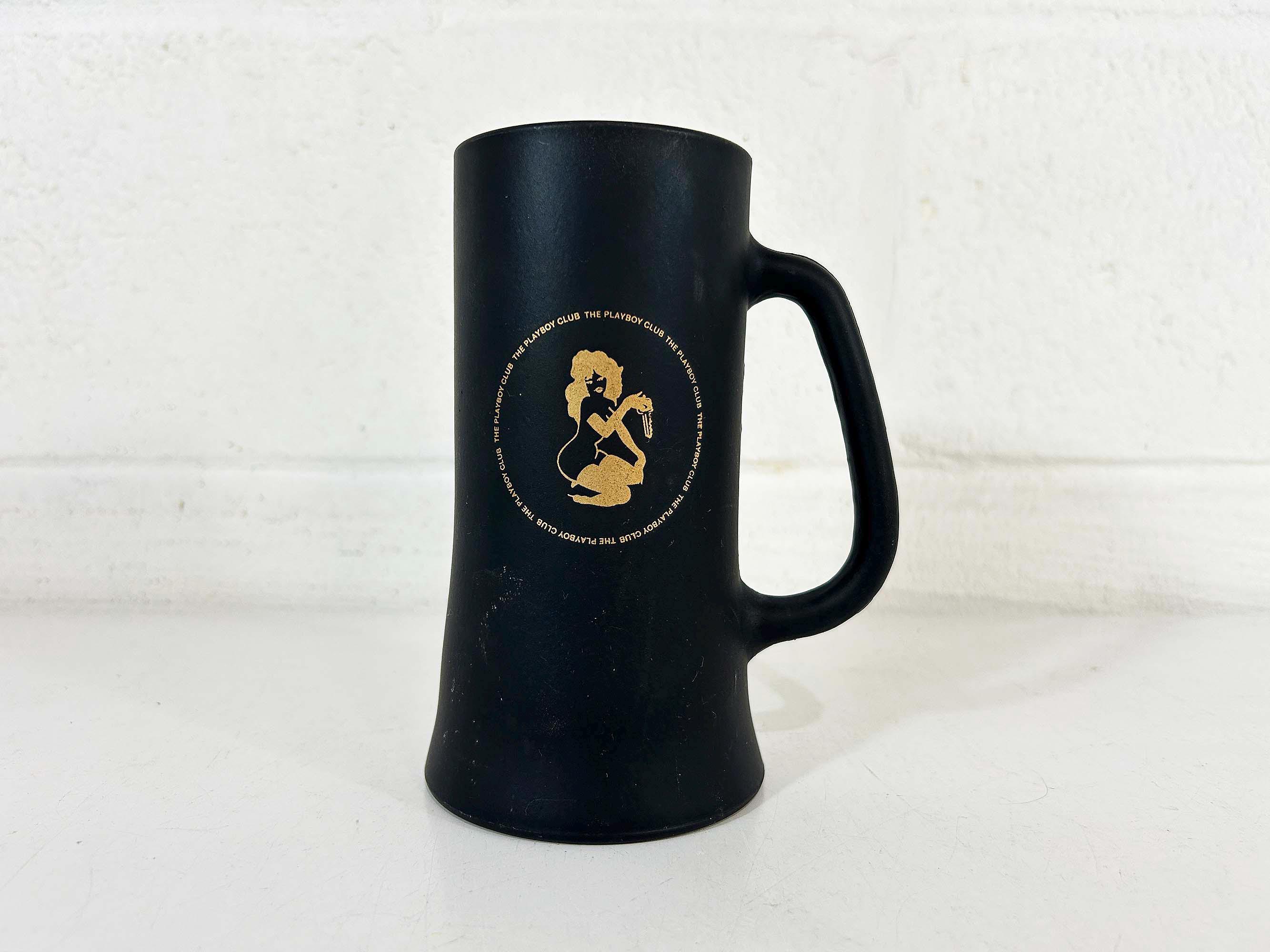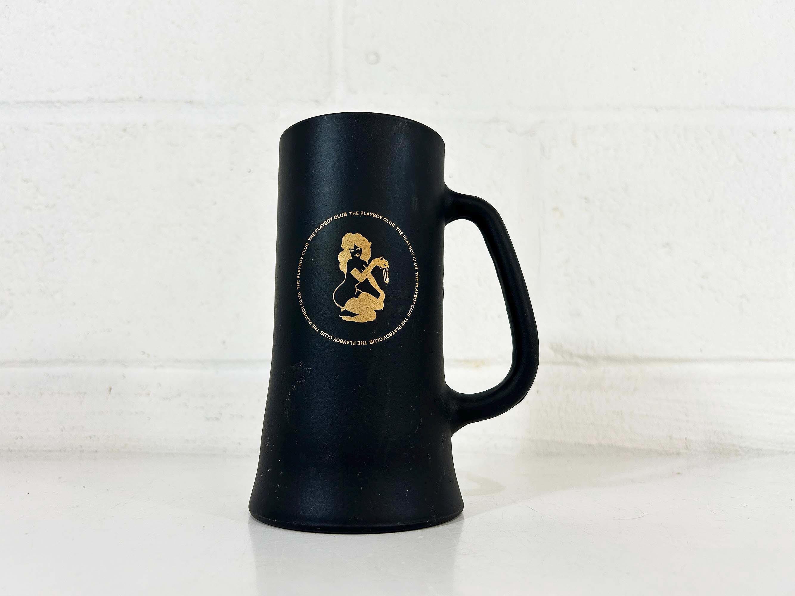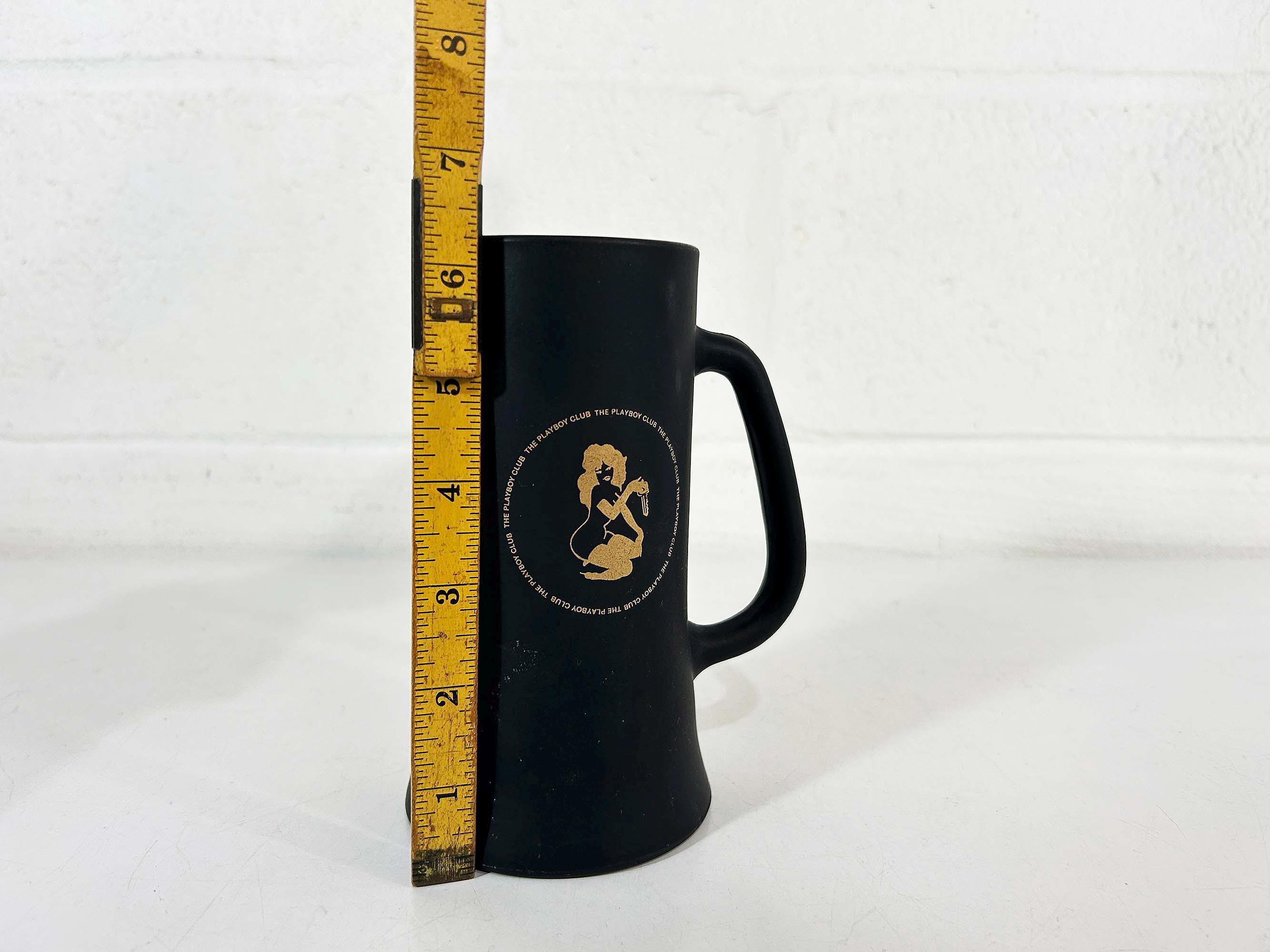 Very cool vintage Playboy tall glass mug. It is in good vintage condition with some scratches and discoloration - please be sure to inspect all photos closely. The mug is approximately inches 6 1/4 inches tall and 2 3/4 inches in diameter at the top. It holds approximately 14 ounces of liquid when filled to the brim.