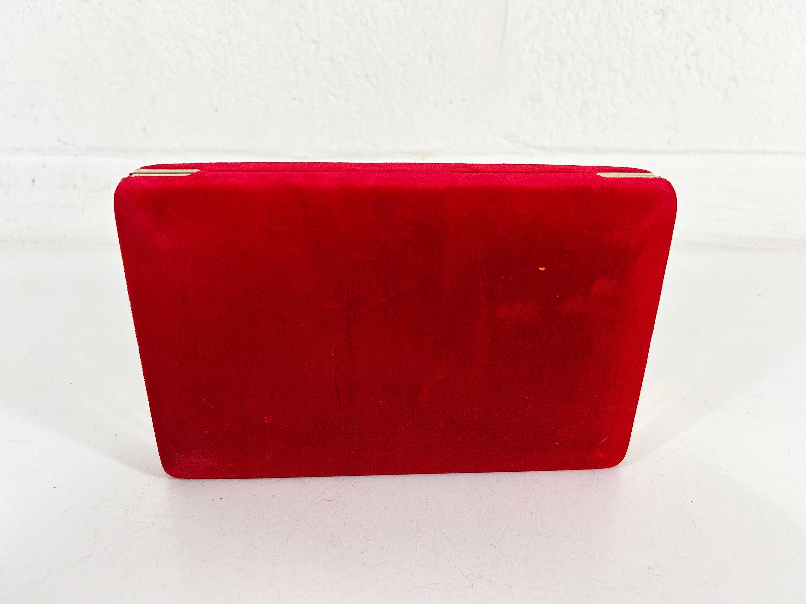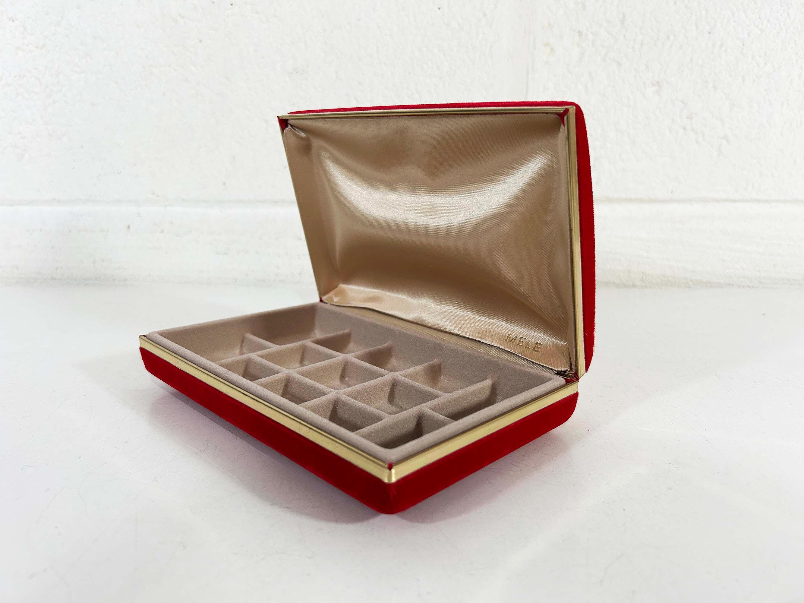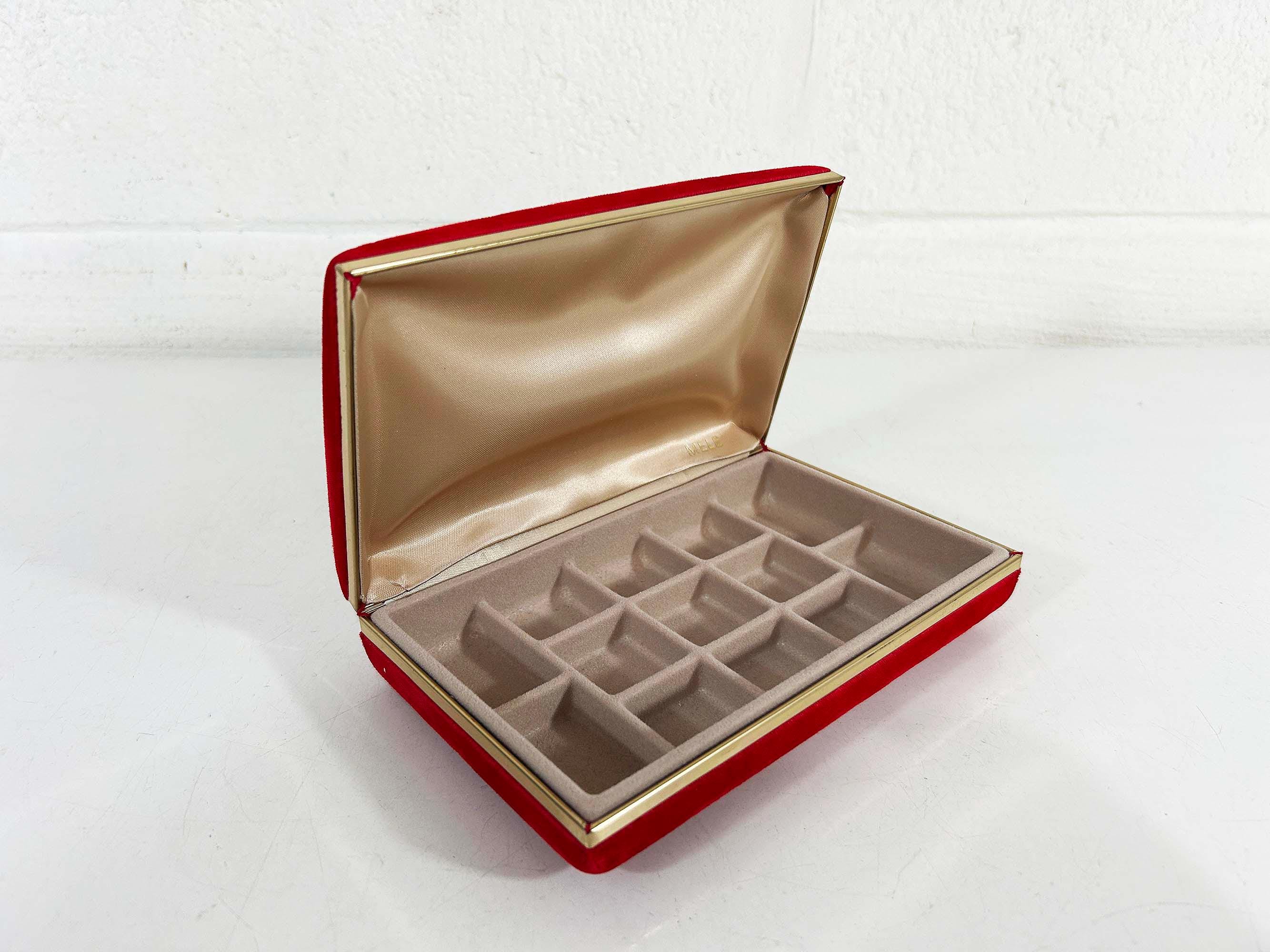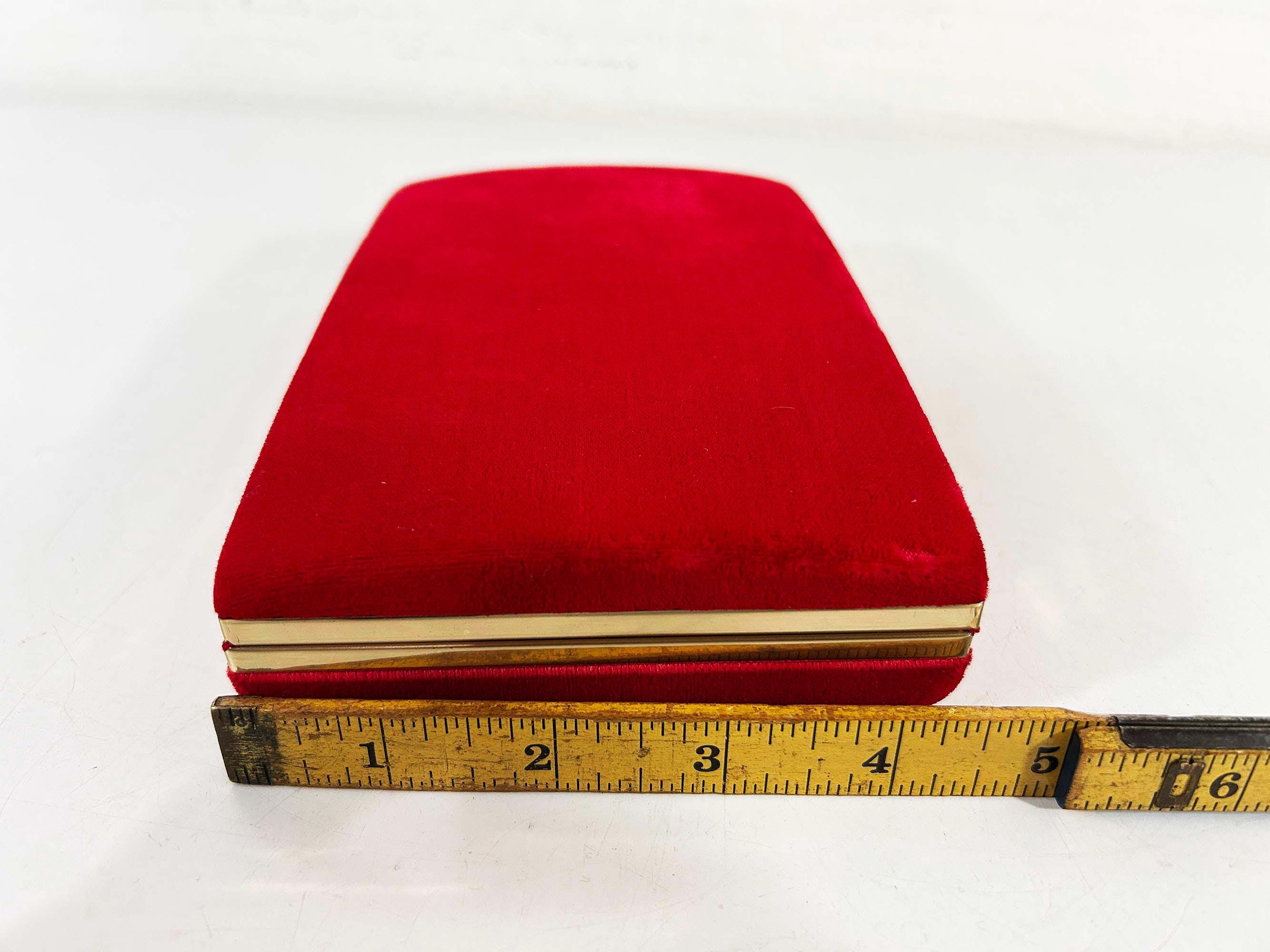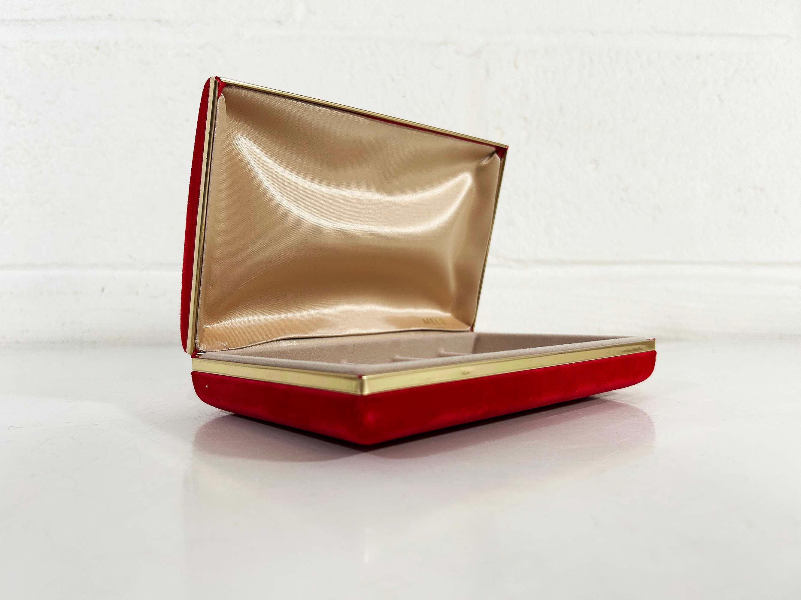 Great vintage red velvet hard case for jewelry! Would look great on your shelf or vanity or the next time you go on a trip! The box is in great vintage condition with no significant flaws. The box is approximately 7 inches wide, 4 1/2 inches deep, and 1 1/2 inches tall when closed.