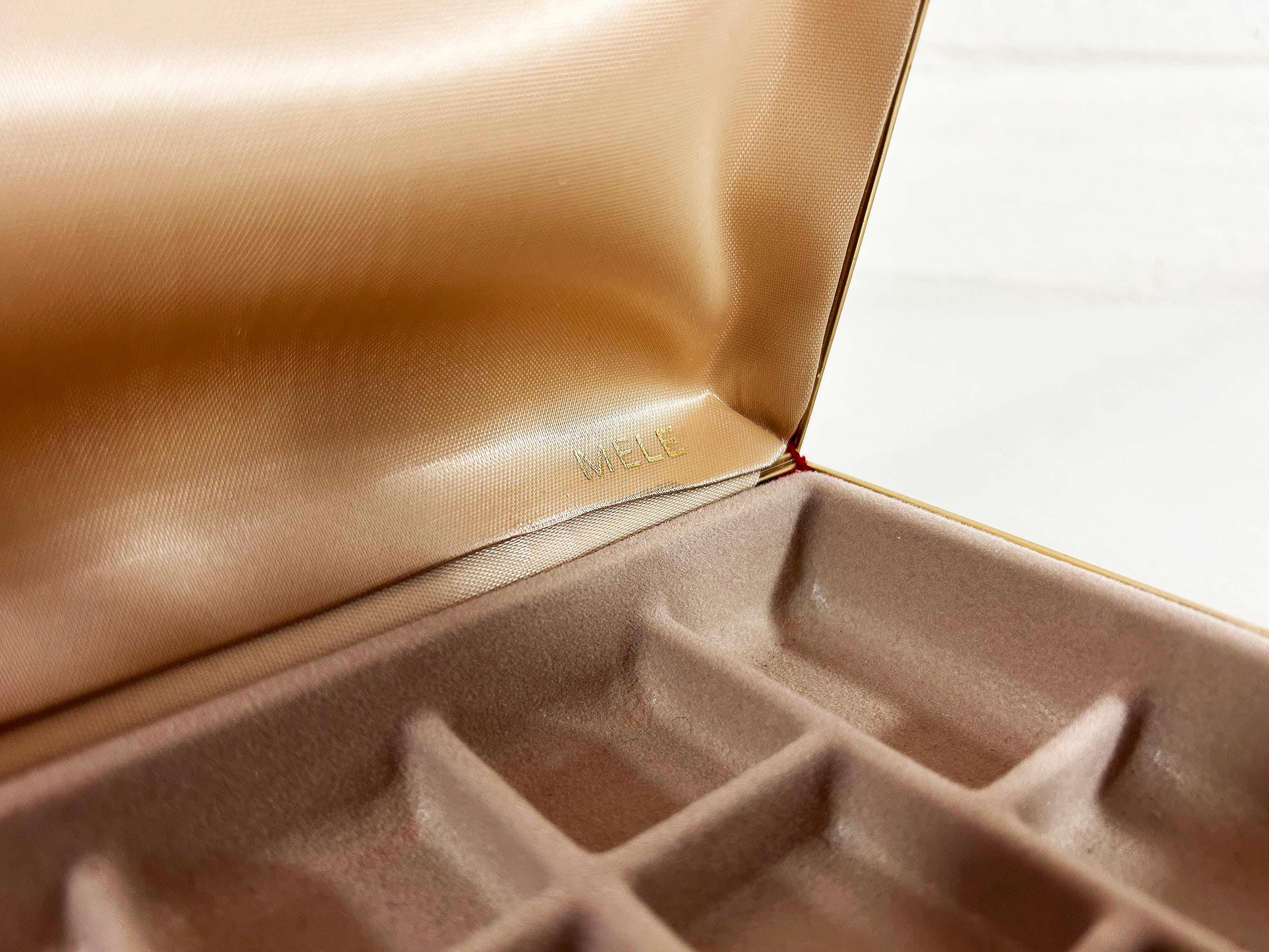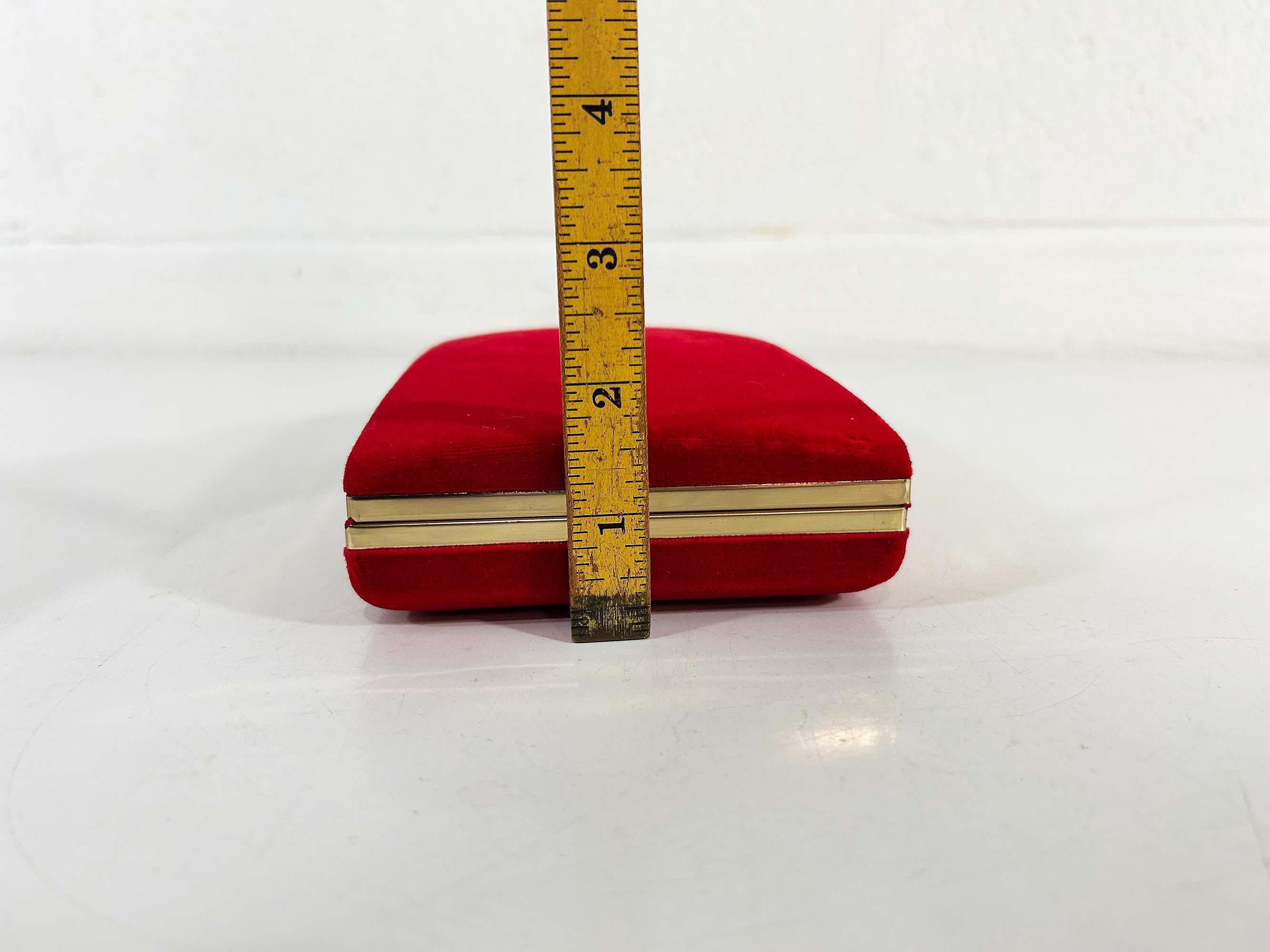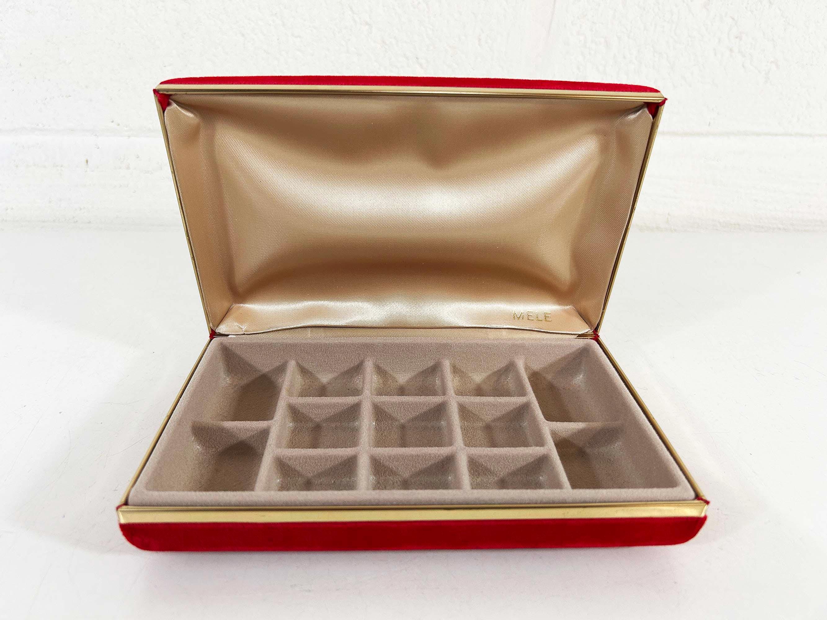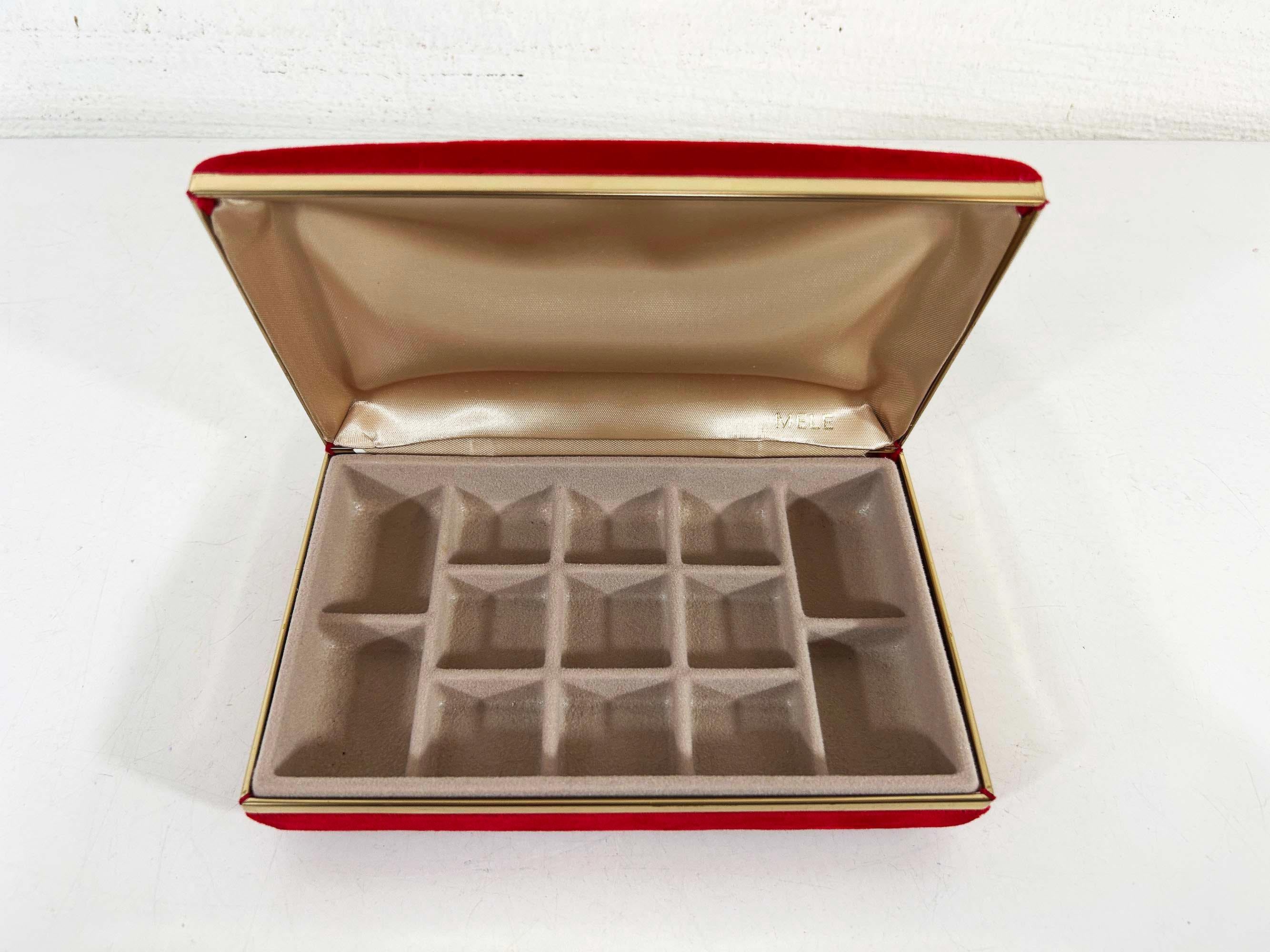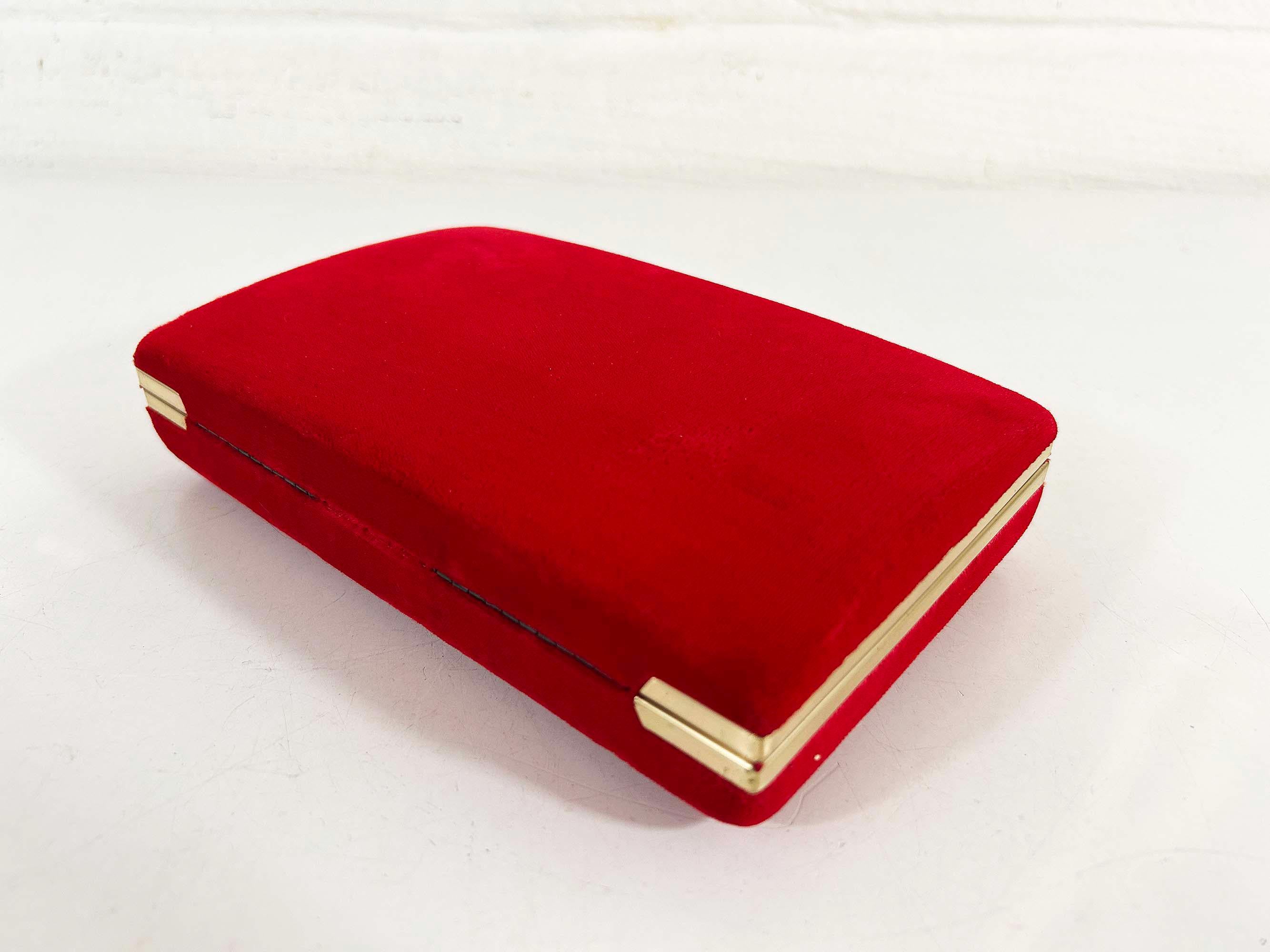 Great vintage red velvet hard case for jewelry! Would look great on your shelf or vanity or the next time you go on a trip! The box is in great vintage condition with no significant flaws. The box is approximately 7 inches wide, 4 1/2 inches deep, and 1 1/2 inches tall when closed.