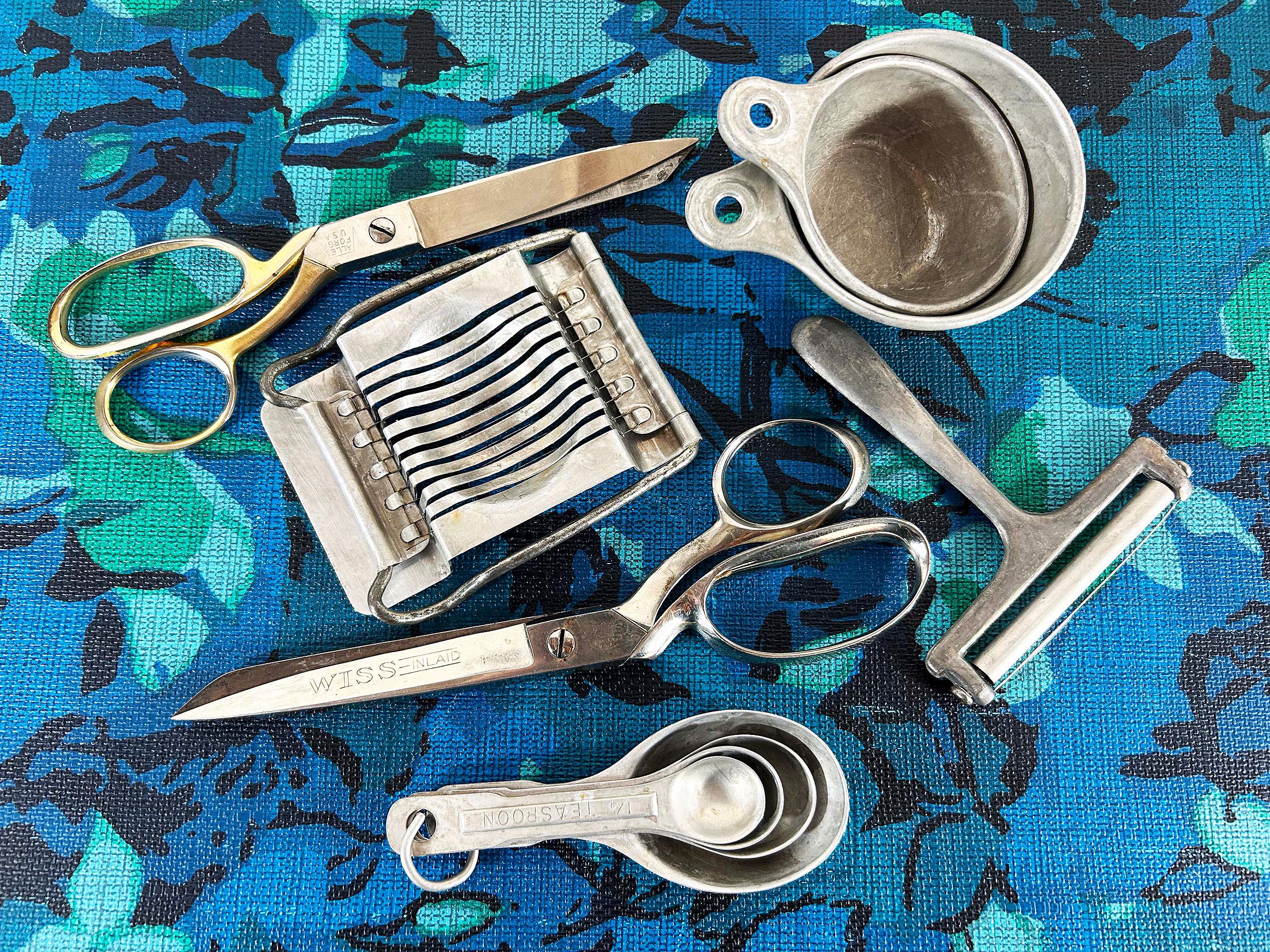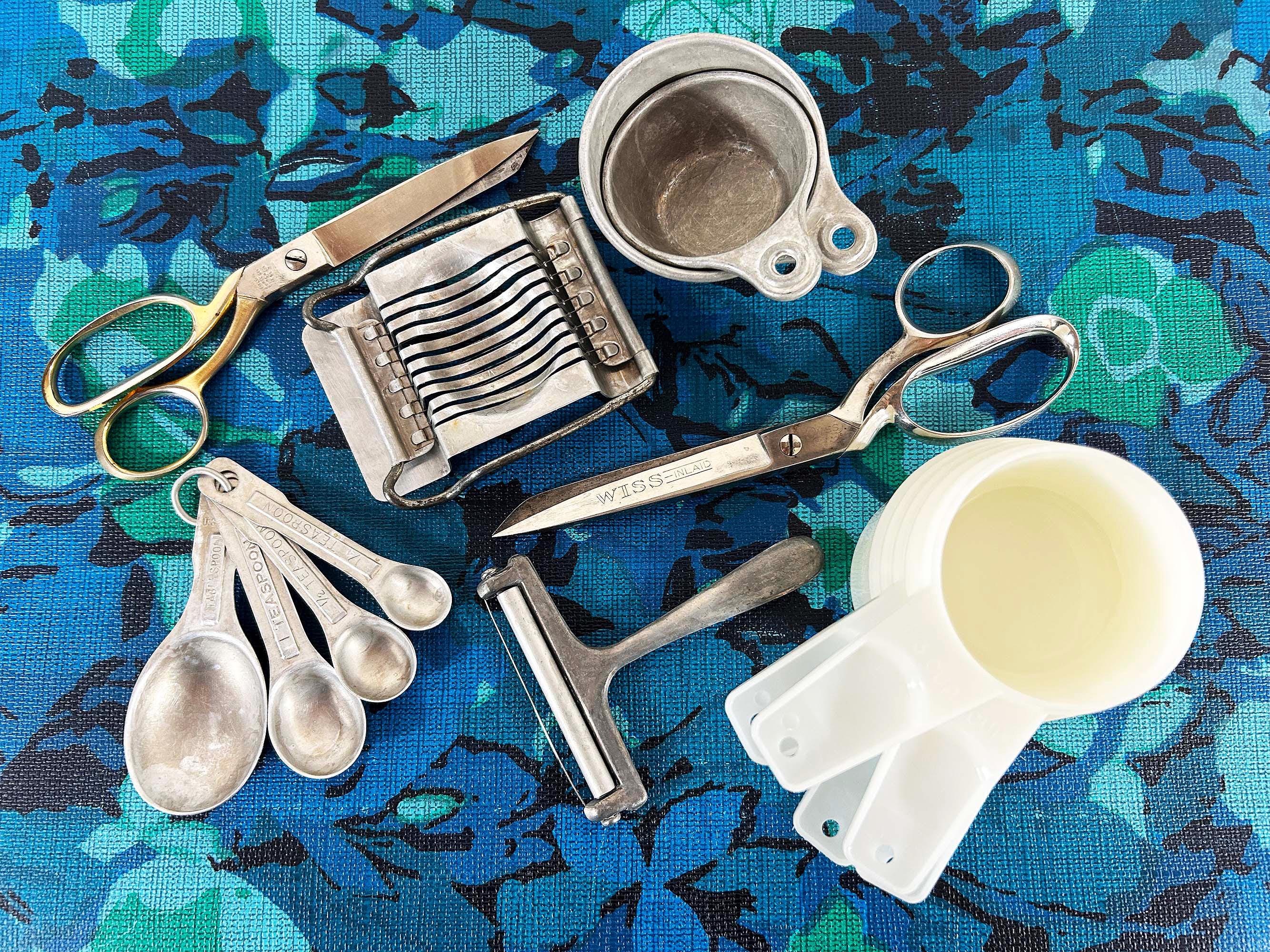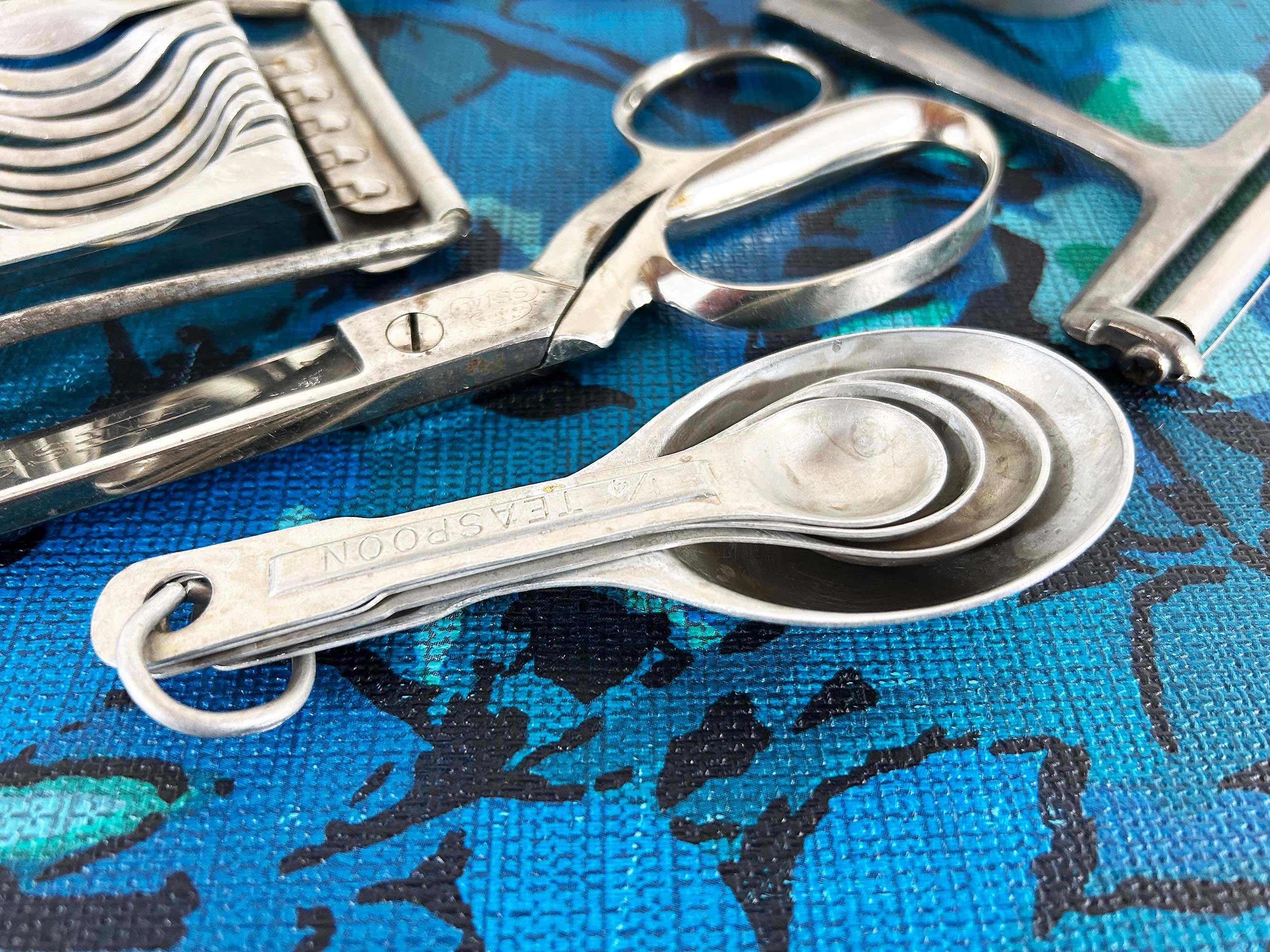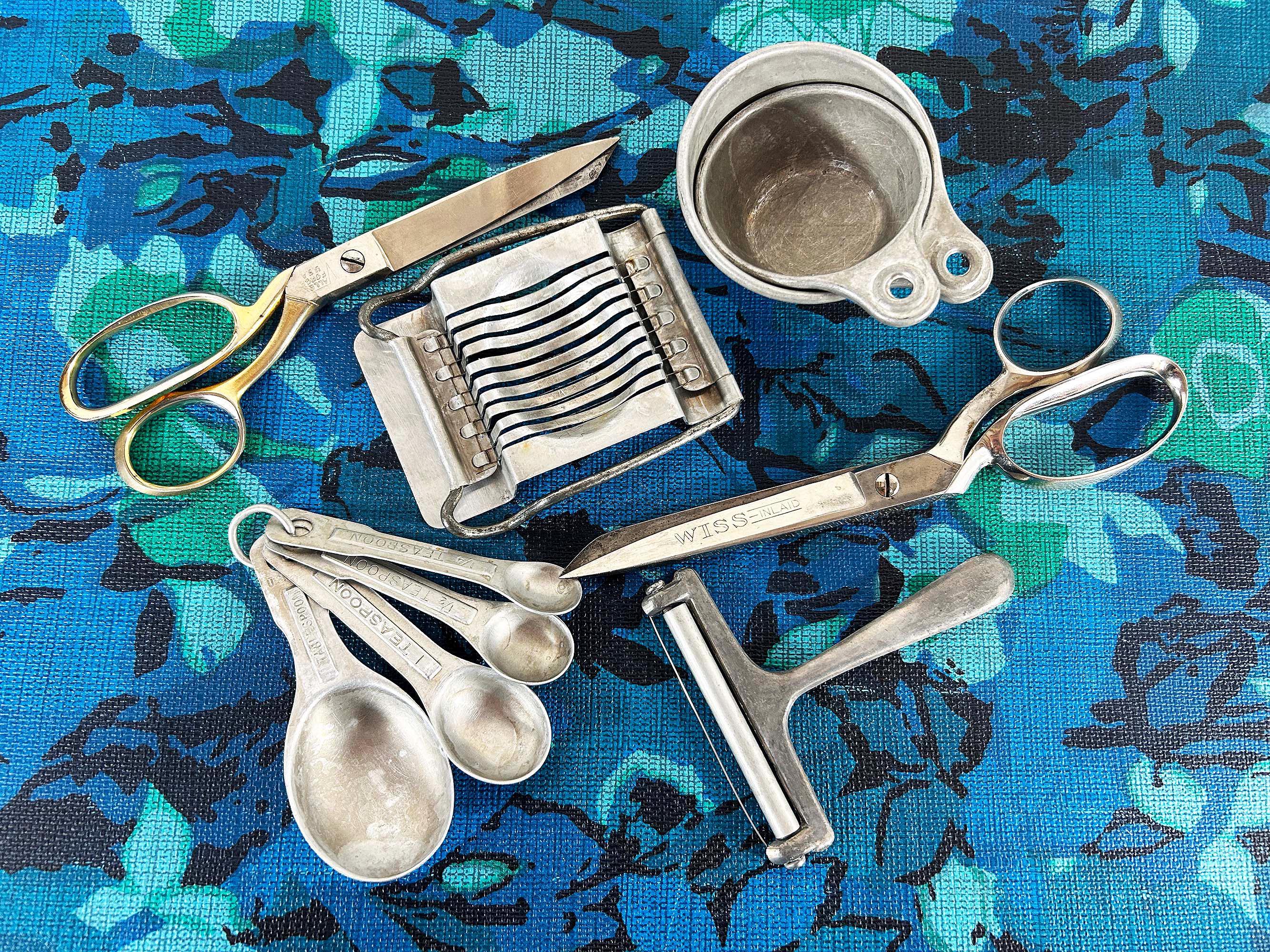 Super handy set of tools and gadgets for your vintage kitchen and home! All are perfectly useful in a modern home but were made to last many years ago. There is a pair of metal measuring cups, an egg slicer, a cheese slicer, 2 different pairs of scissors, a set of measuring spoons, and a set of plastic measuring cups. They are sold individually - choose which one you'd like from the drop down menu.