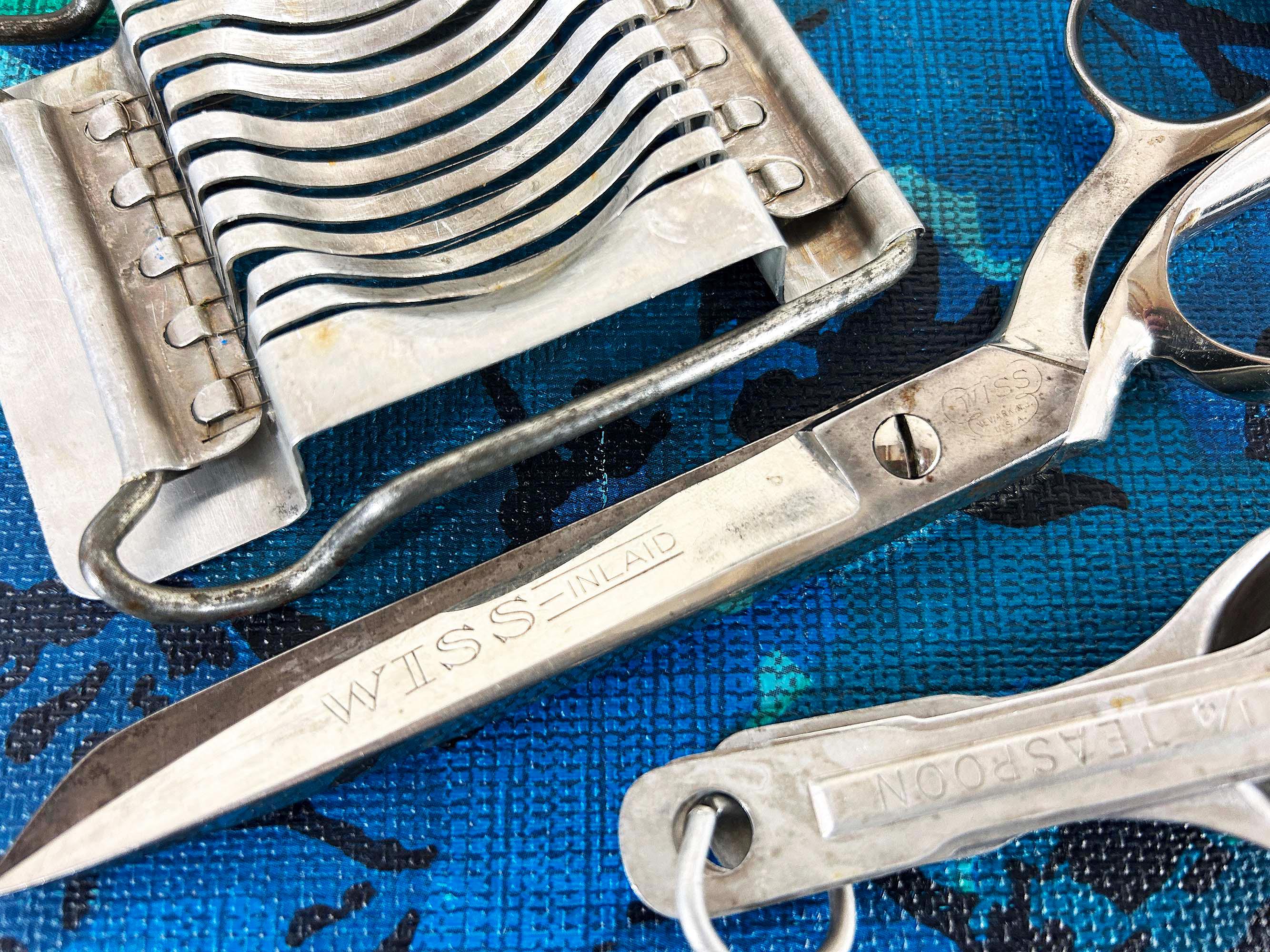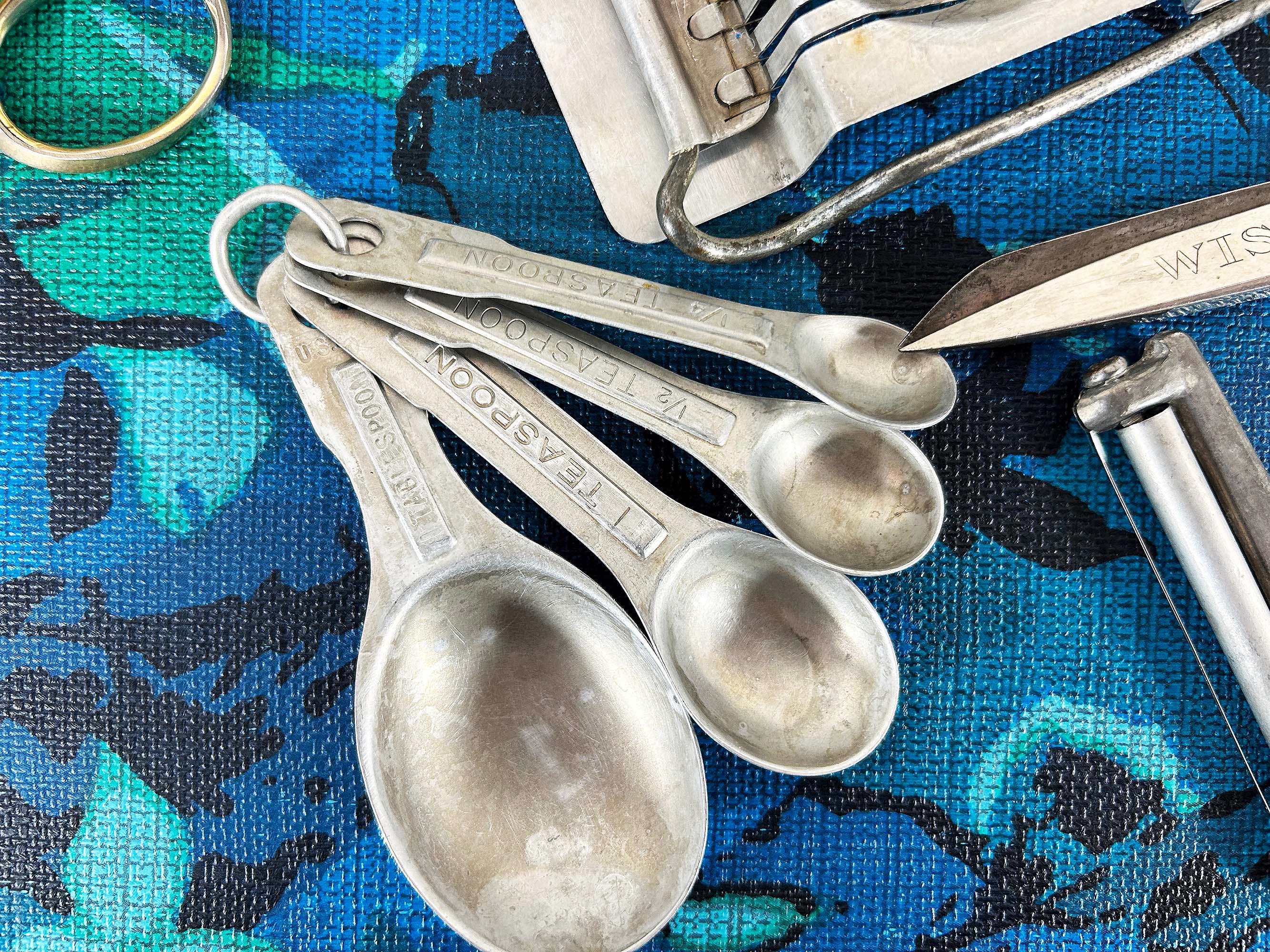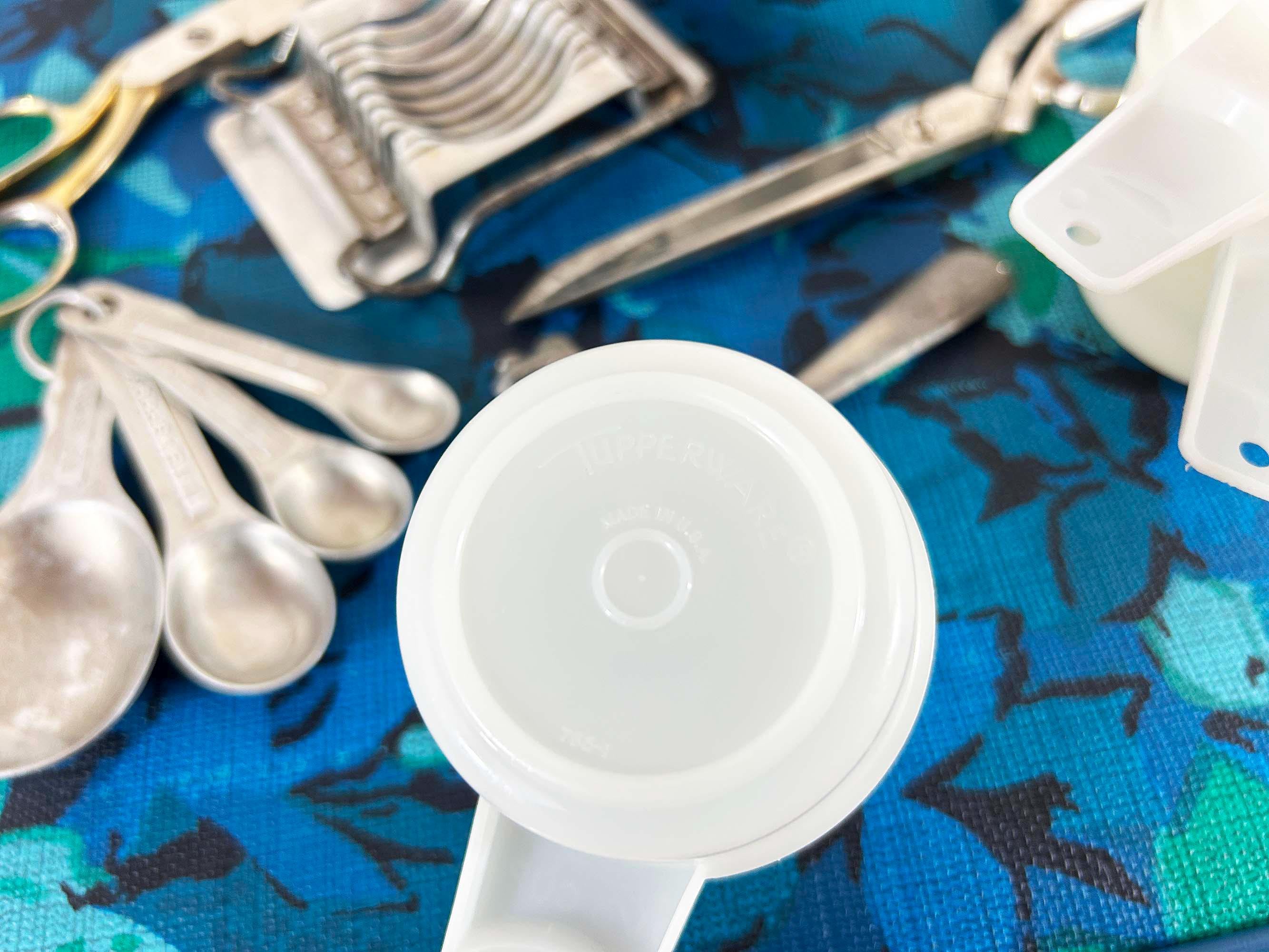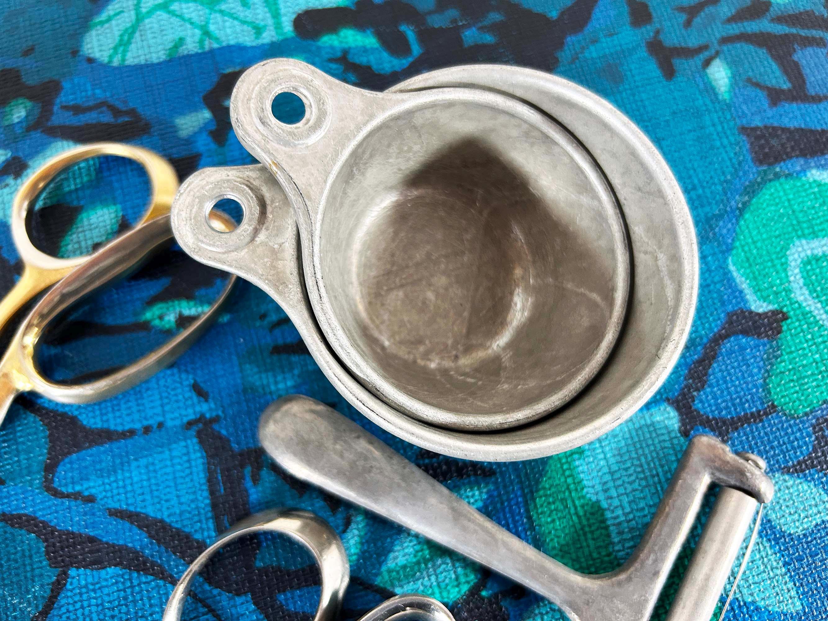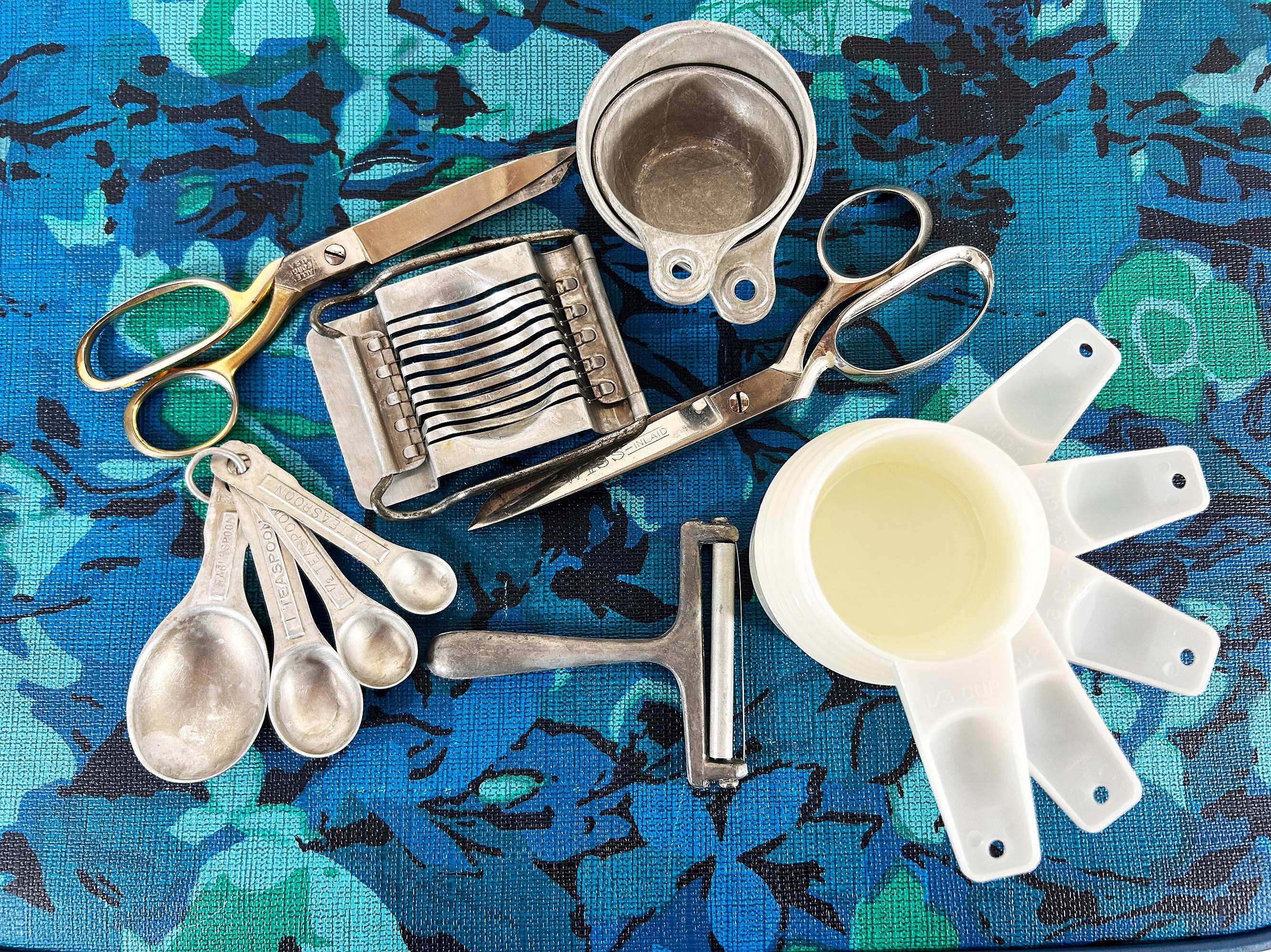 Super handy set of tools and gadgets for your vintage kitchen and home! All are perfectly useful in a modern home but were made to last many years ago. There is a pair of metal measuring cups, an egg slicer, a cheese slicer, 2 different pairs of scissors, a set of measuring spoons, and a set of plastic measuring cups. They are sold individually - choose which one you'd like from the drop down menu.