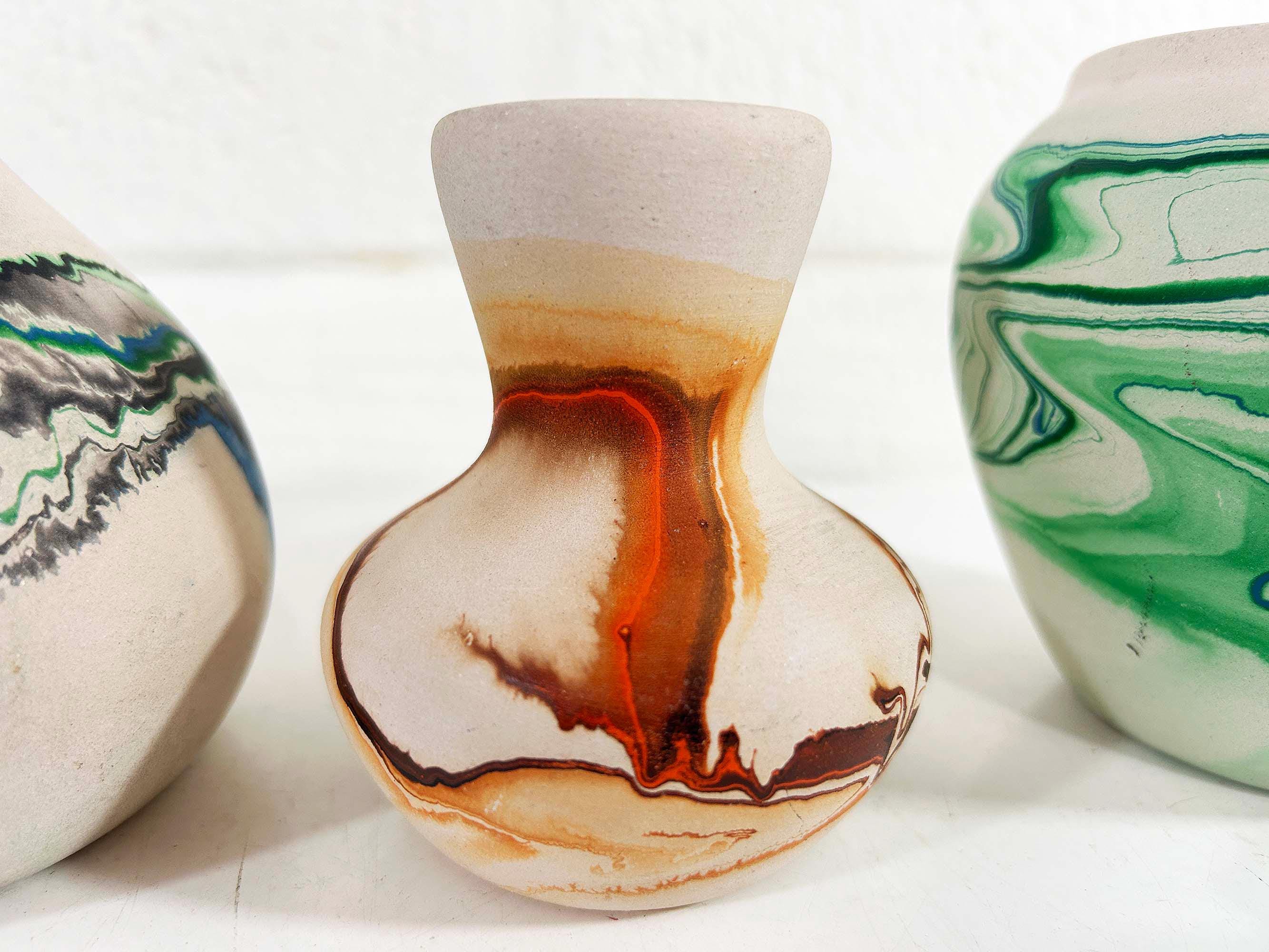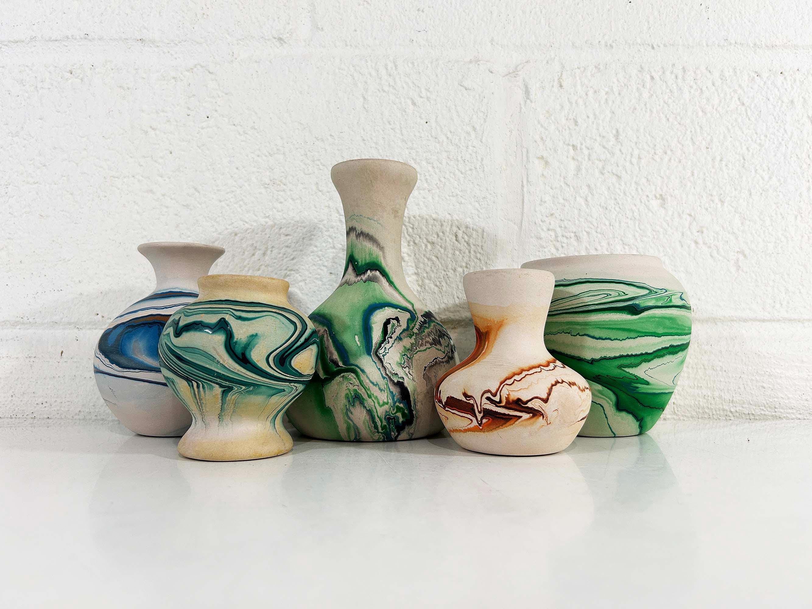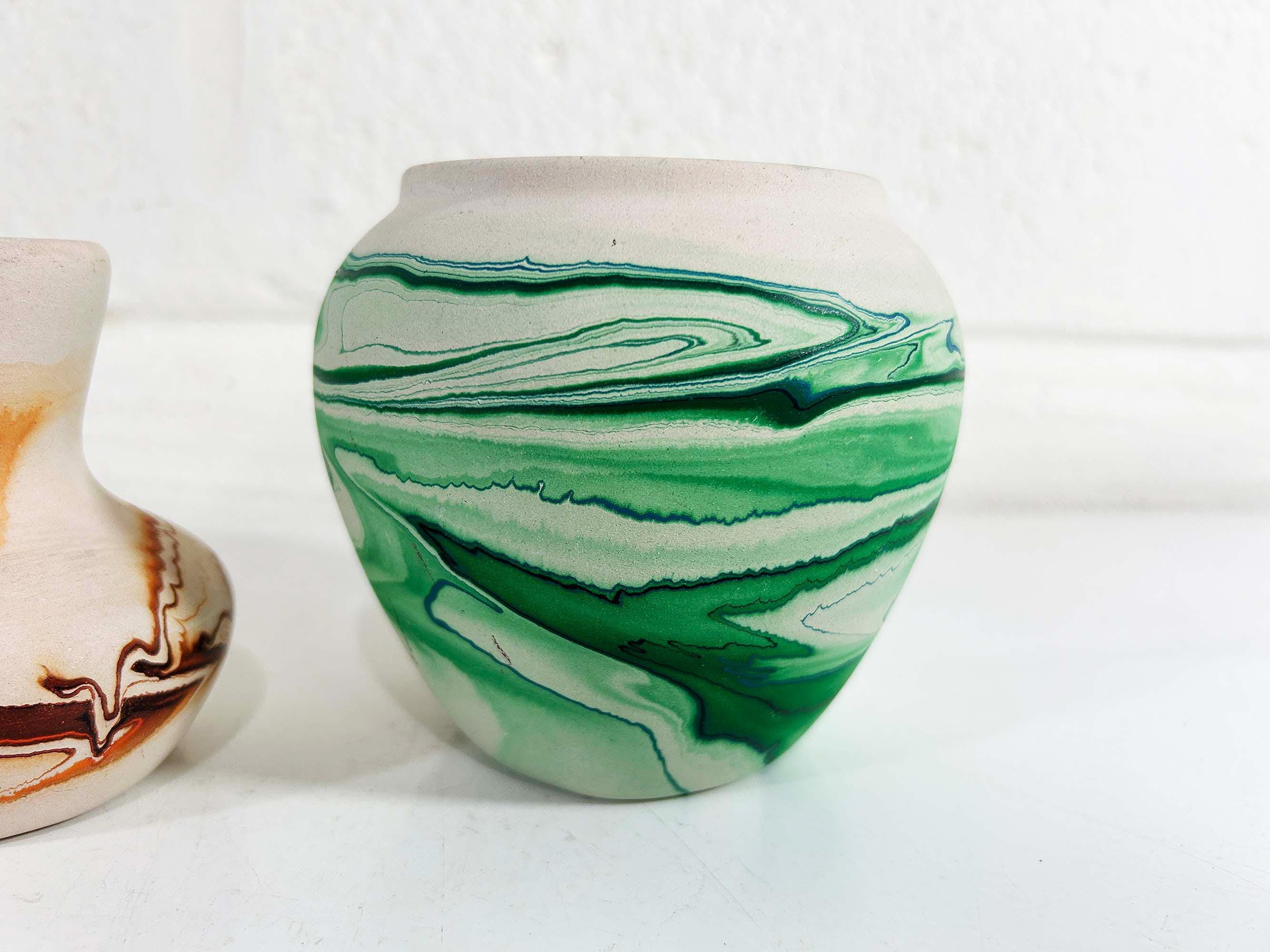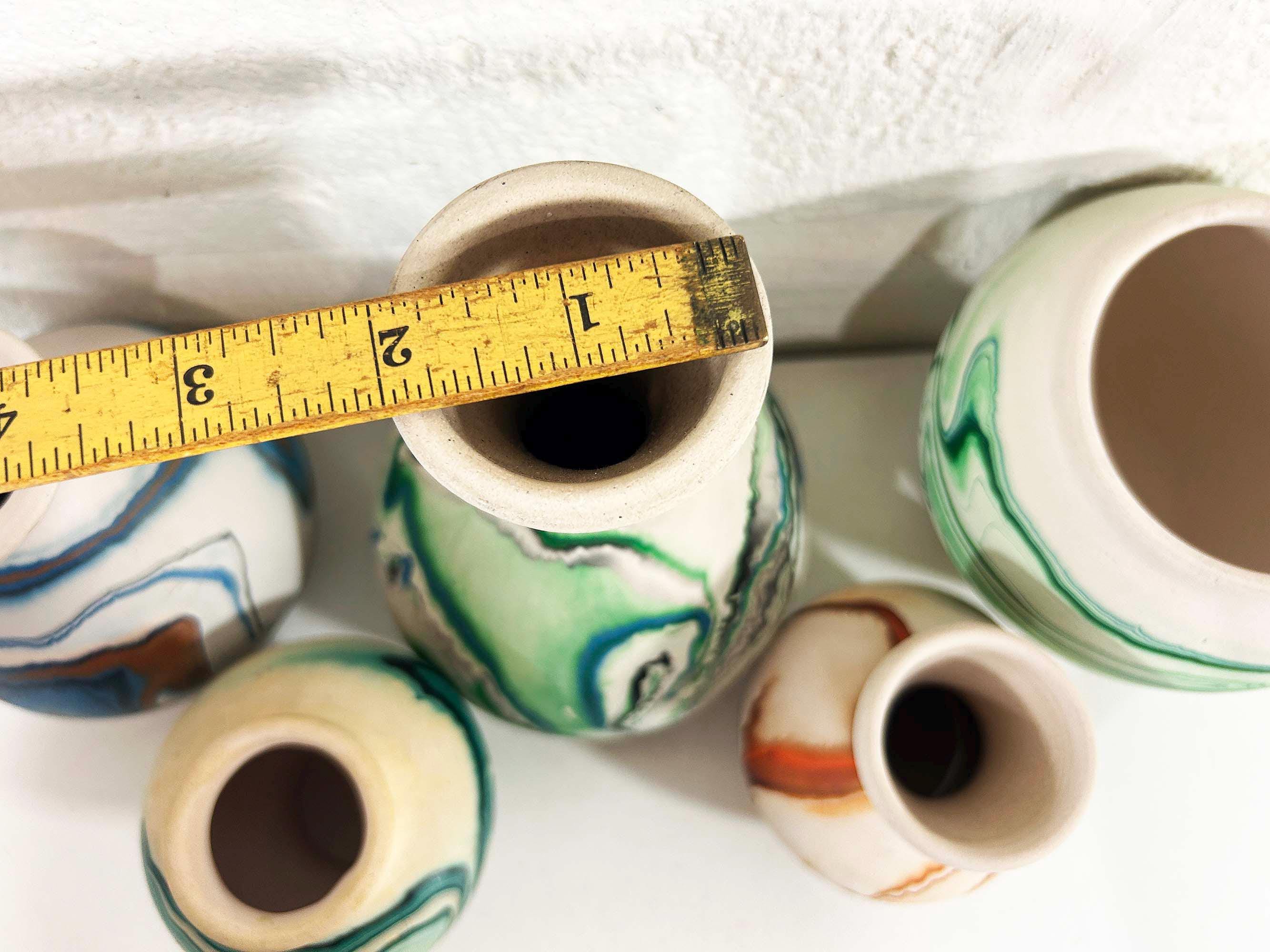 Lovely Nemadji pottery vase collection. This was an estate sale find from Maryland, just outside of Washington, D.C. All of the vases are in good vintage condition with no significant flaws. The smallest green vase is a bit discolored on the white part. The tall green vase and the orange vase are both glazed on the inside but the other 3 are not. The vases range in height from 3 to 6 1/2 inches tall and 1 1/2 to 3 inches in diameter at the opening. The vases are sold individually - choose which one you'd like from the drop down menu.