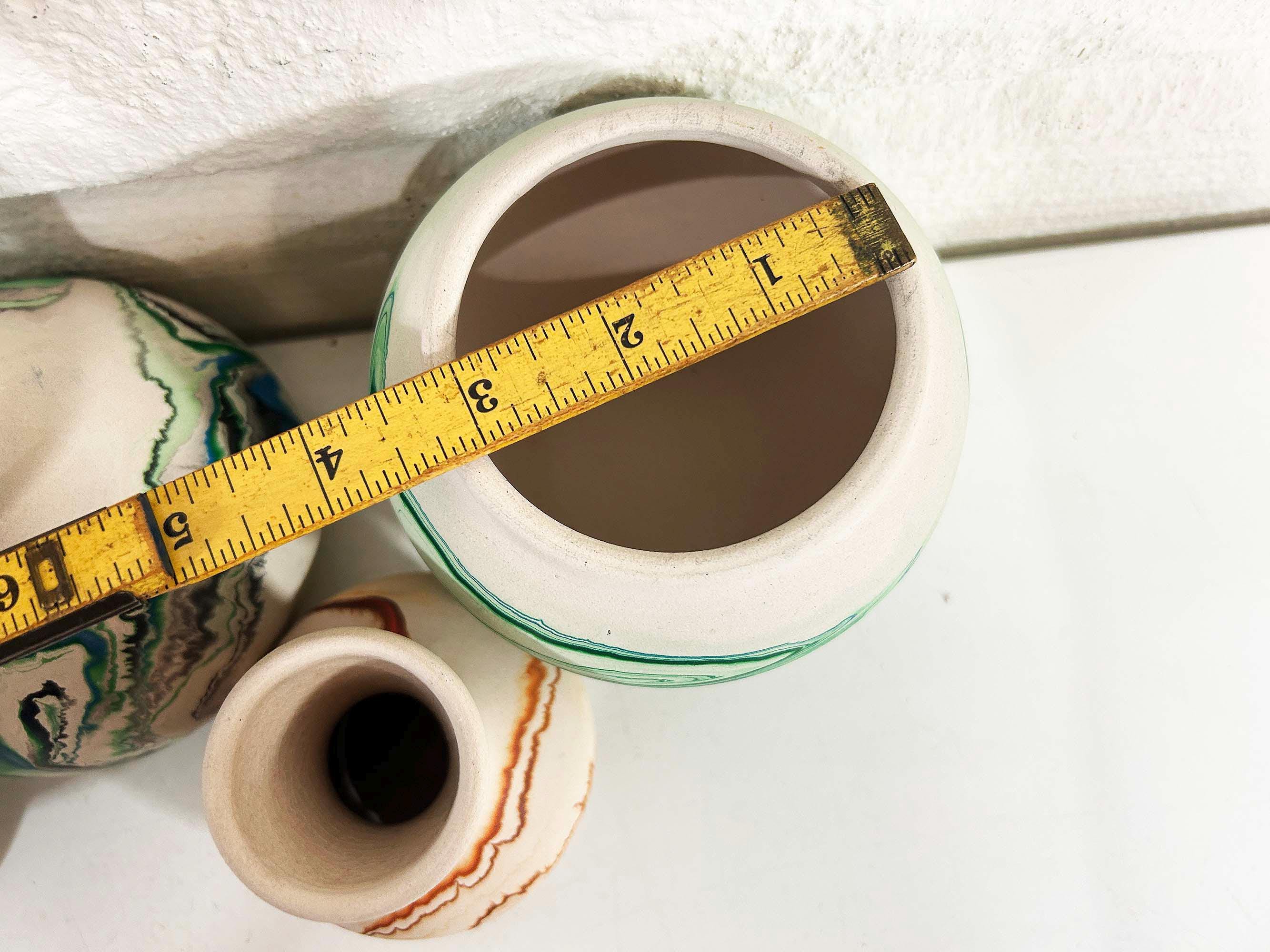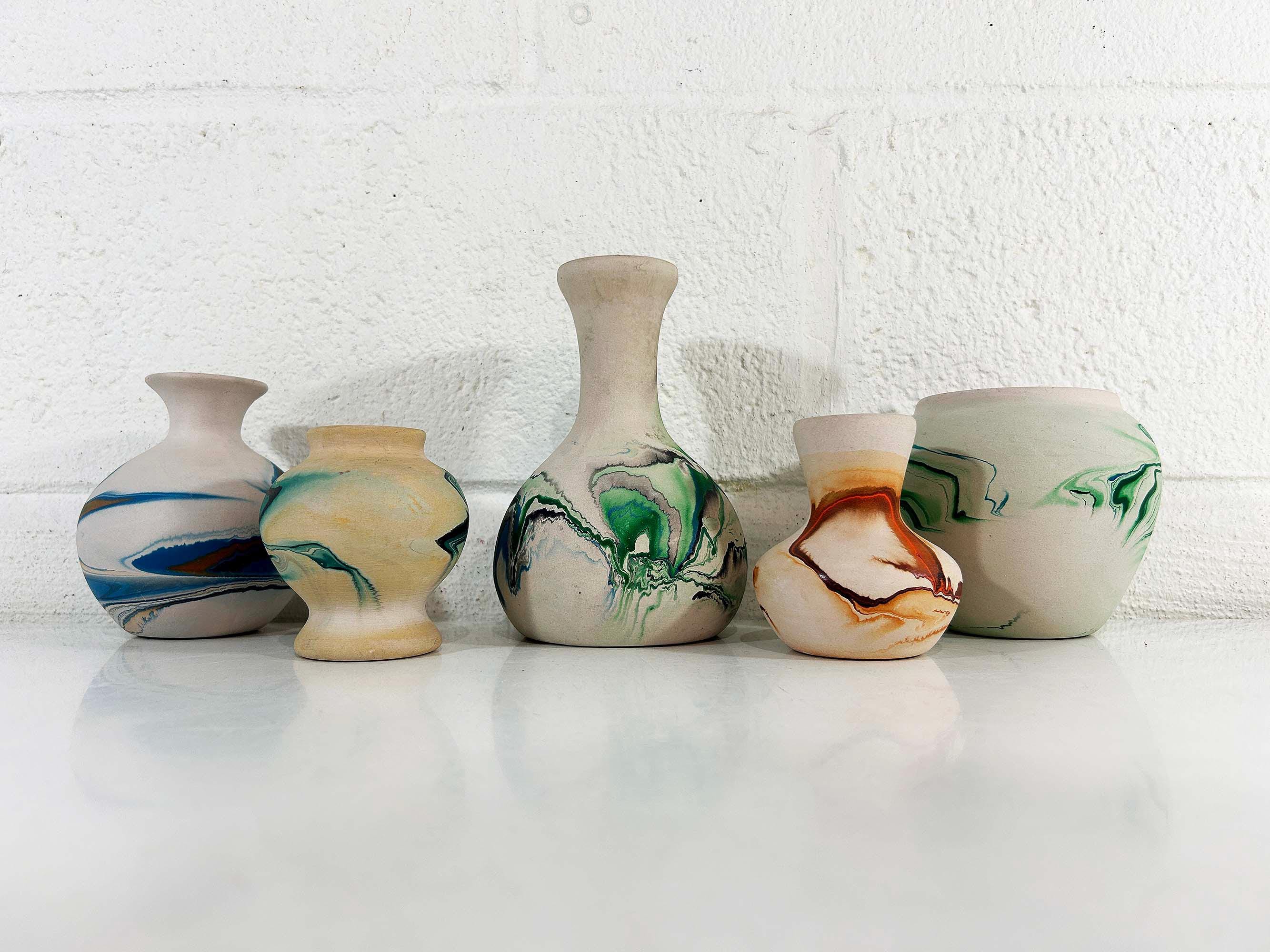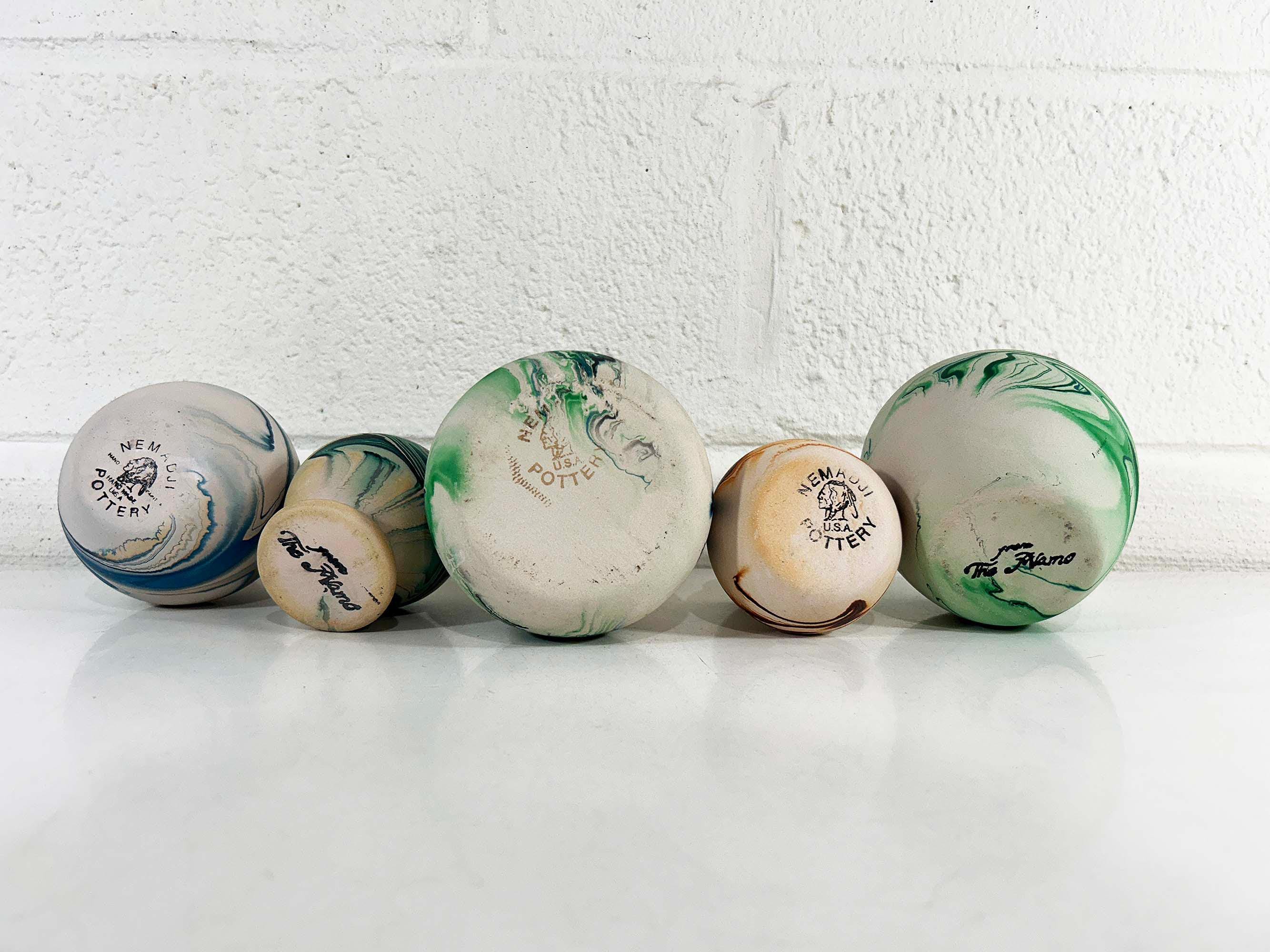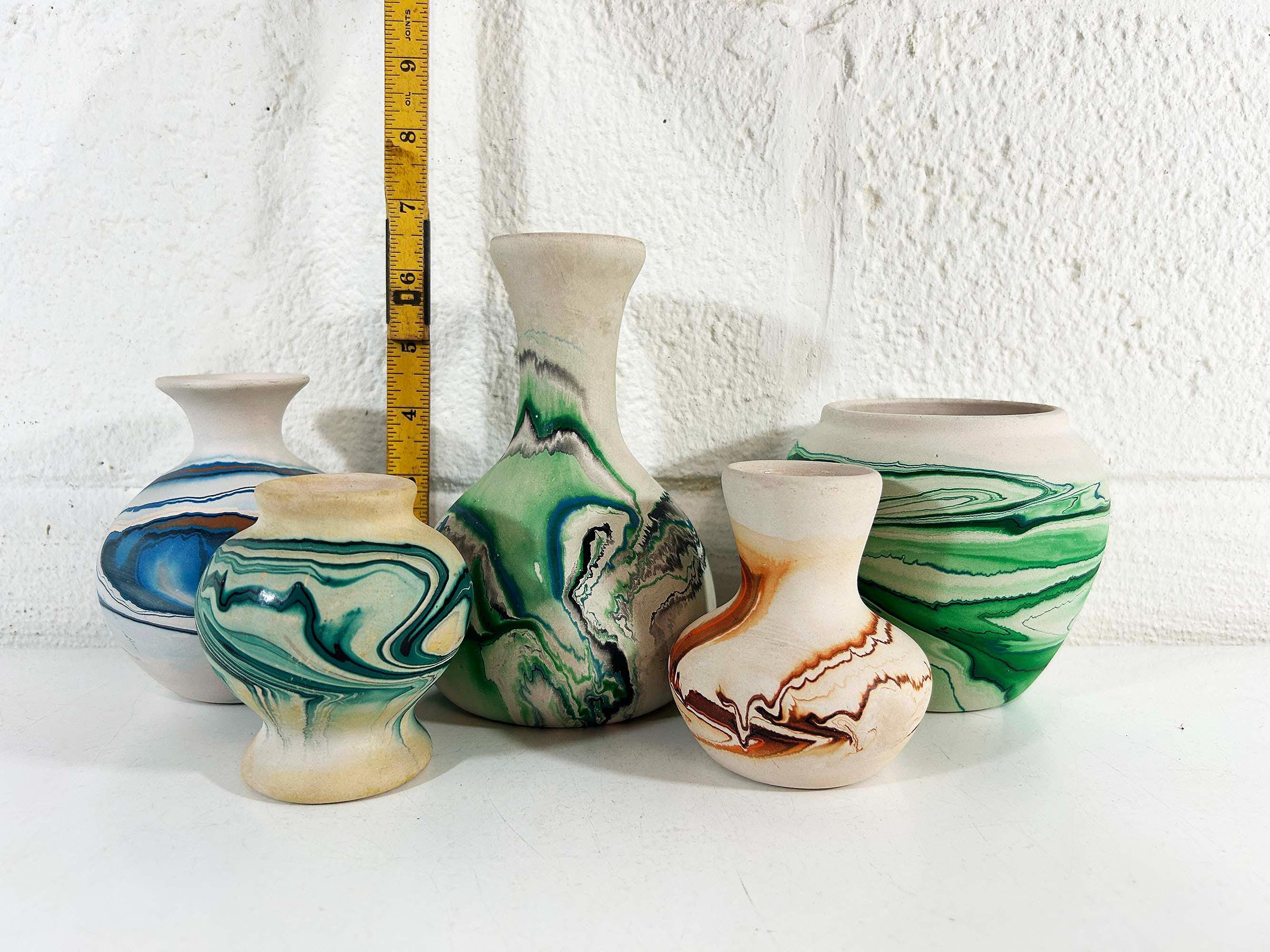 Lovely Nemadji pottery vase collection. This was an estate sale find from Maryland, just outside of Washington, D.C. All of the vases are in good vintage condition with no significant flaws. The smallest green vase is a bit discolored on the white part. The tall green vase and the orange vase are both glazed on the inside but the other 3 are not. The vases range in height from 3 to 6 1/2 inches tall and 1 1/2 to 3 inches in diameter at the opening. The vases are sold individually - choose which one you'd like from the drop down menu.