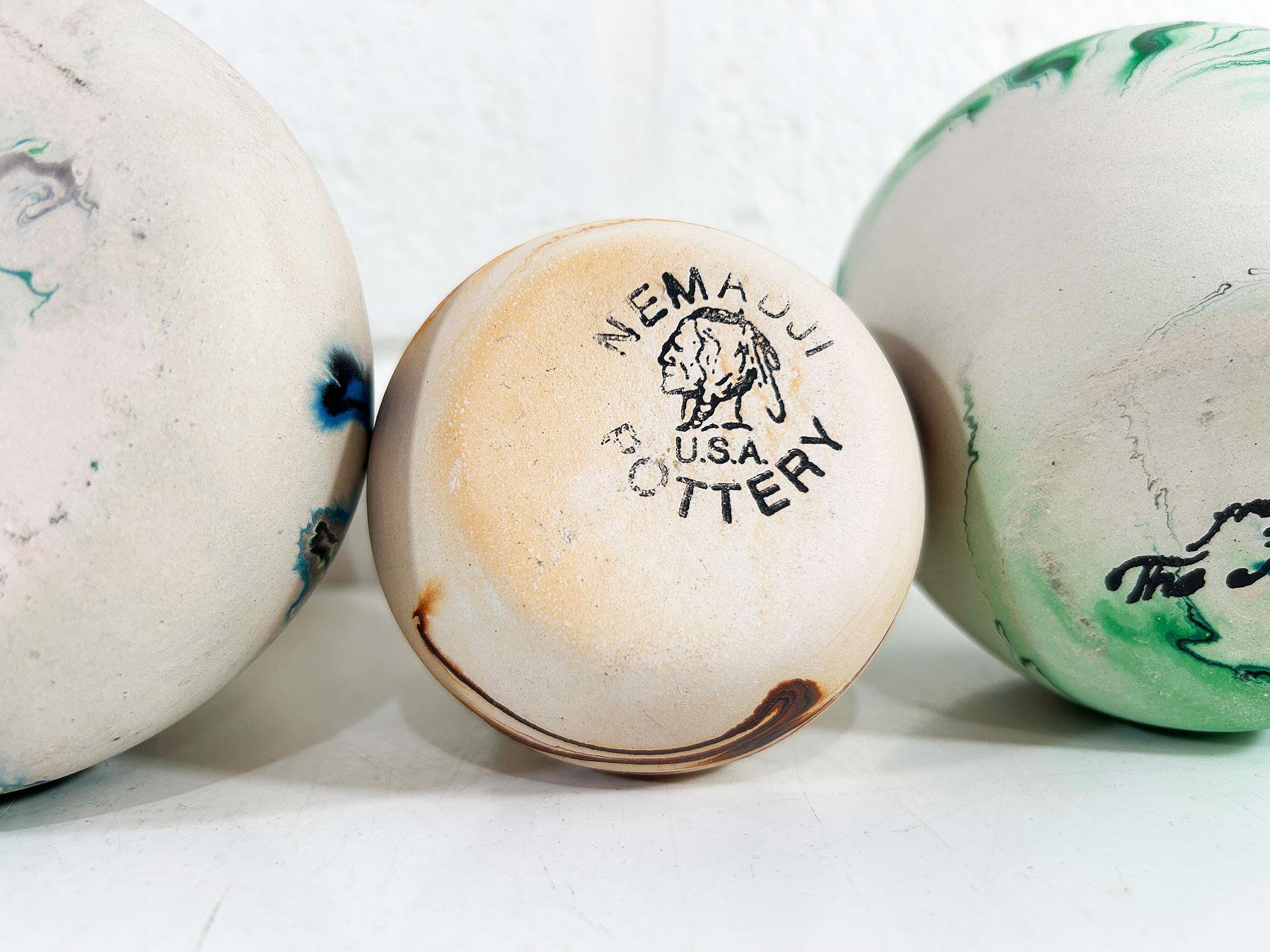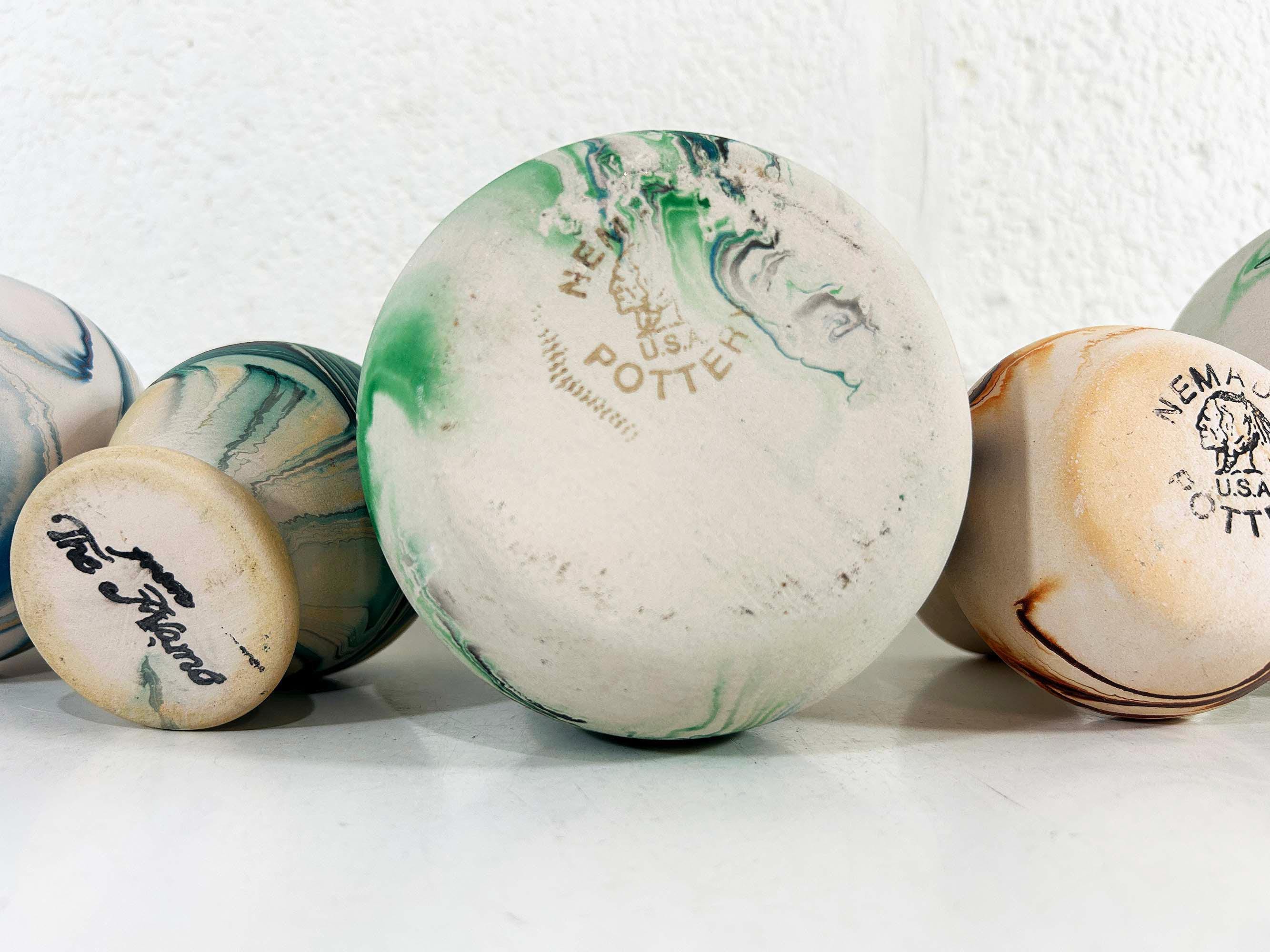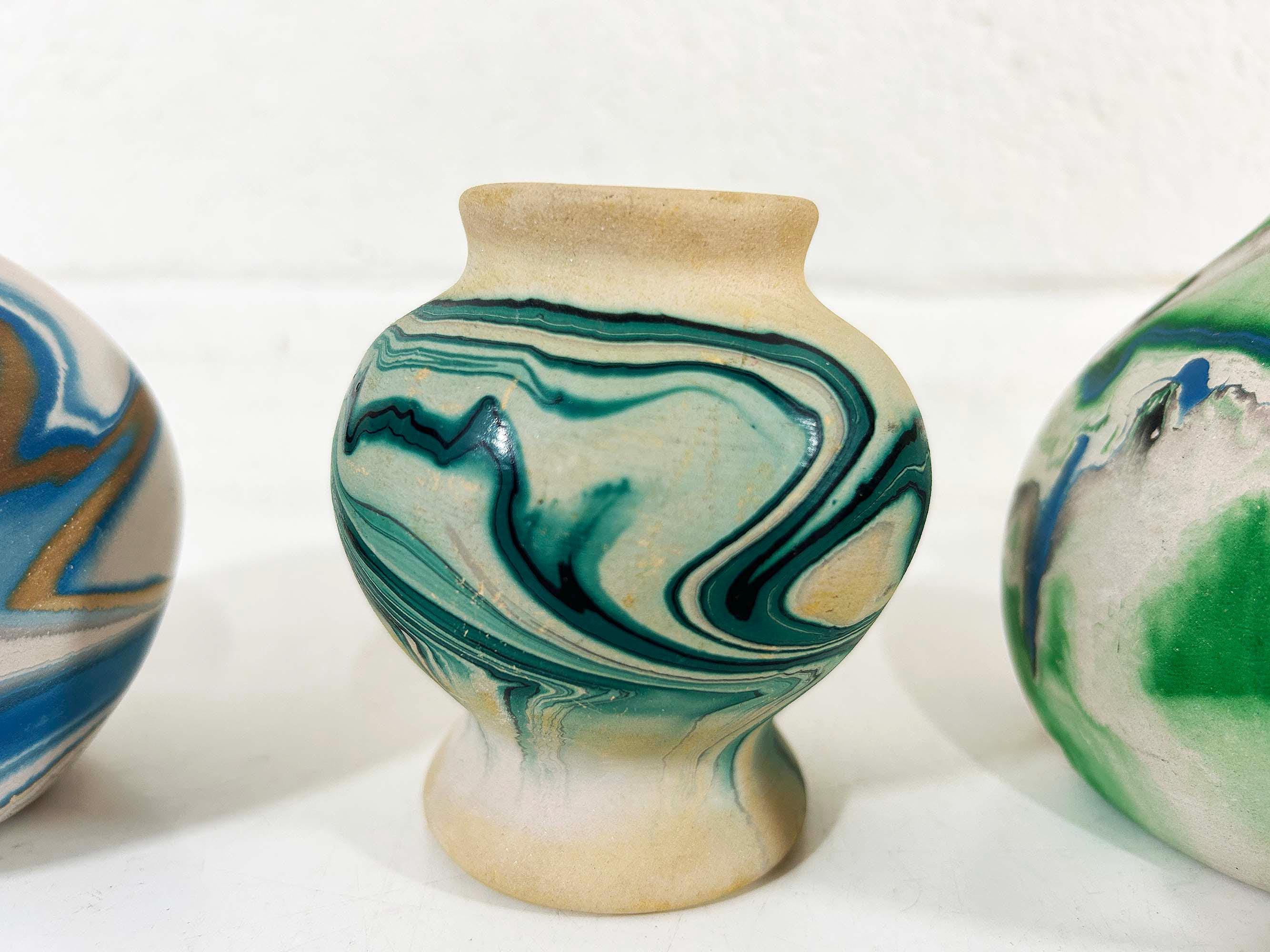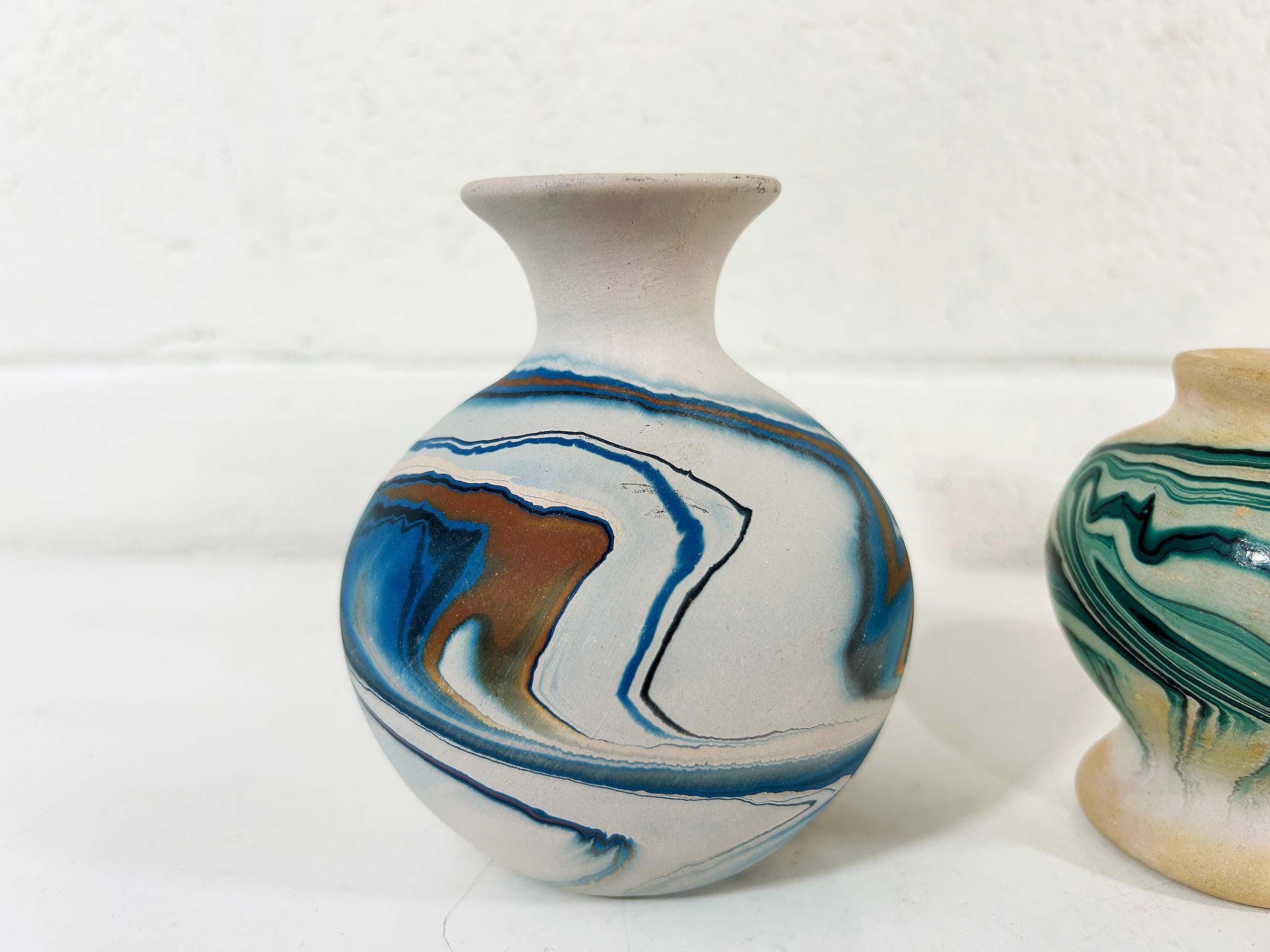 Lovely Nemadji pottery vase collection. This was an estate sale find from Maryland, just outside of Washington, D.C. All of the vases are in good vintage condition with no significant flaws. The smallest green vase is a bit discolored on the white part. The tall green vase and the orange vase are both glazed on the inside but the other 3 are not. The vases range in height from 3 to 6 1/2 inches tall and 1 1/2 to 3 inches in diameter at the opening. The vases are sold individually - choose which one you'd like from the drop down menu.