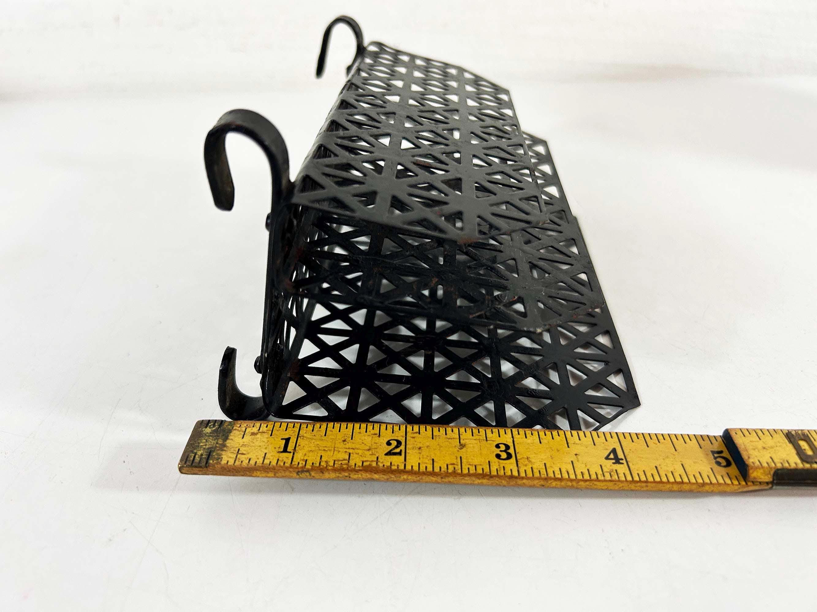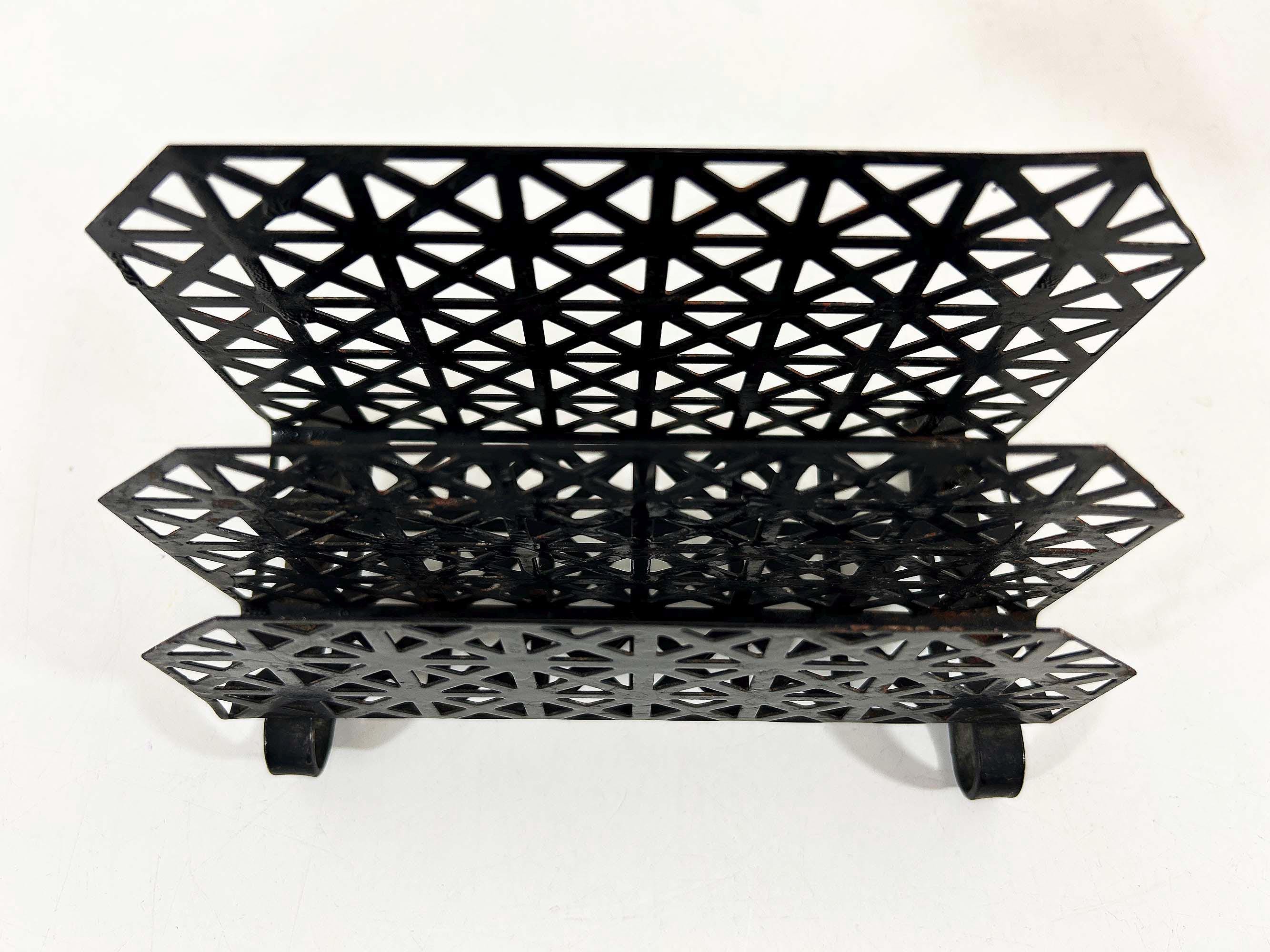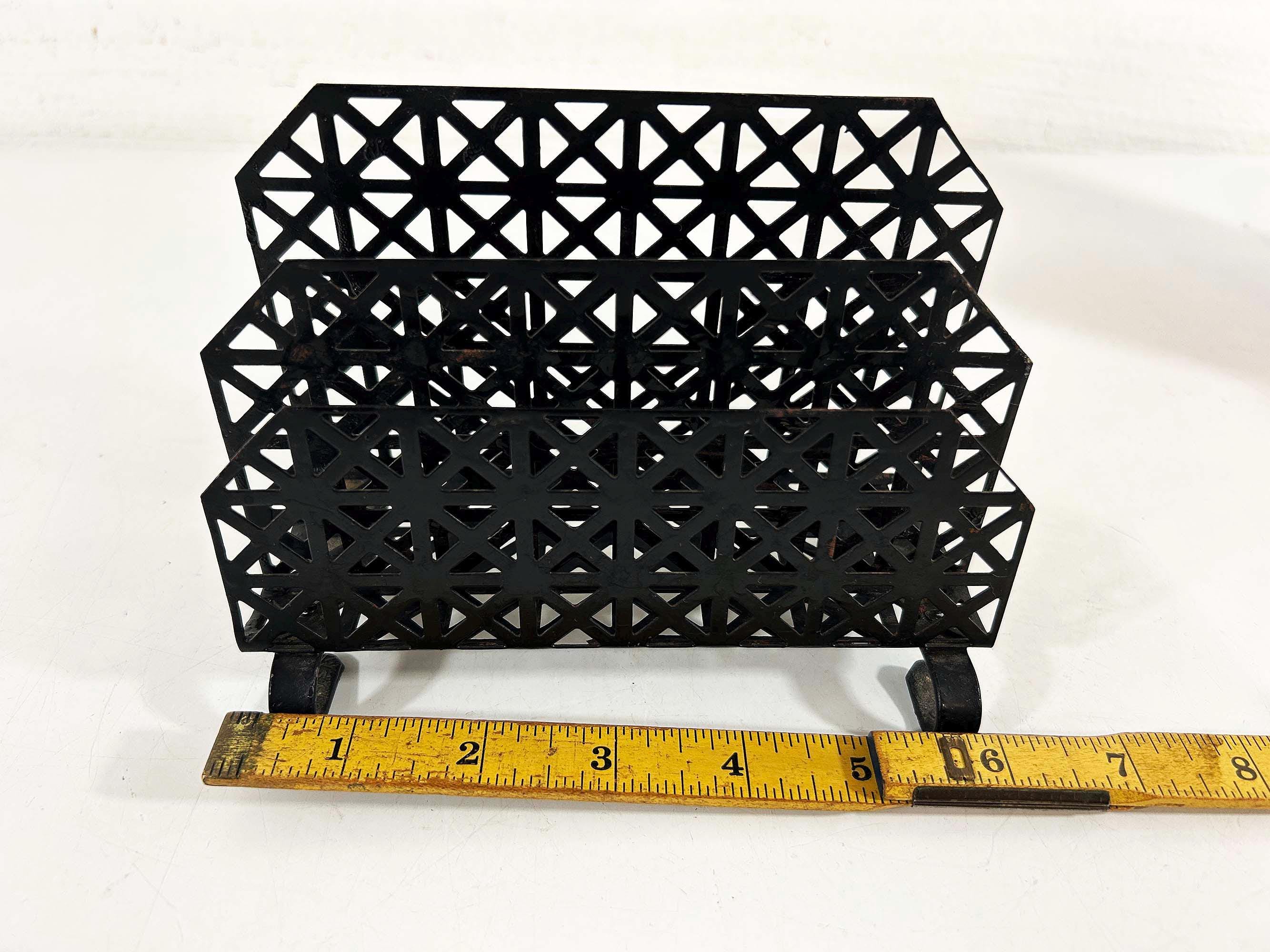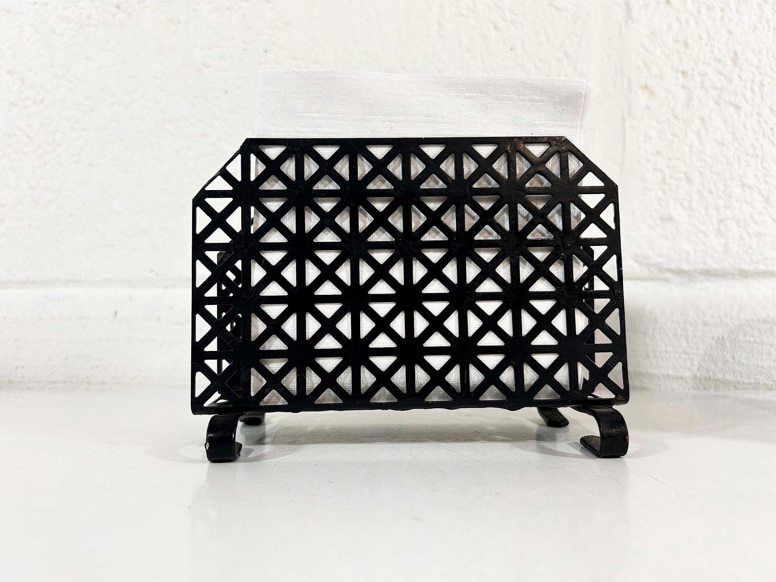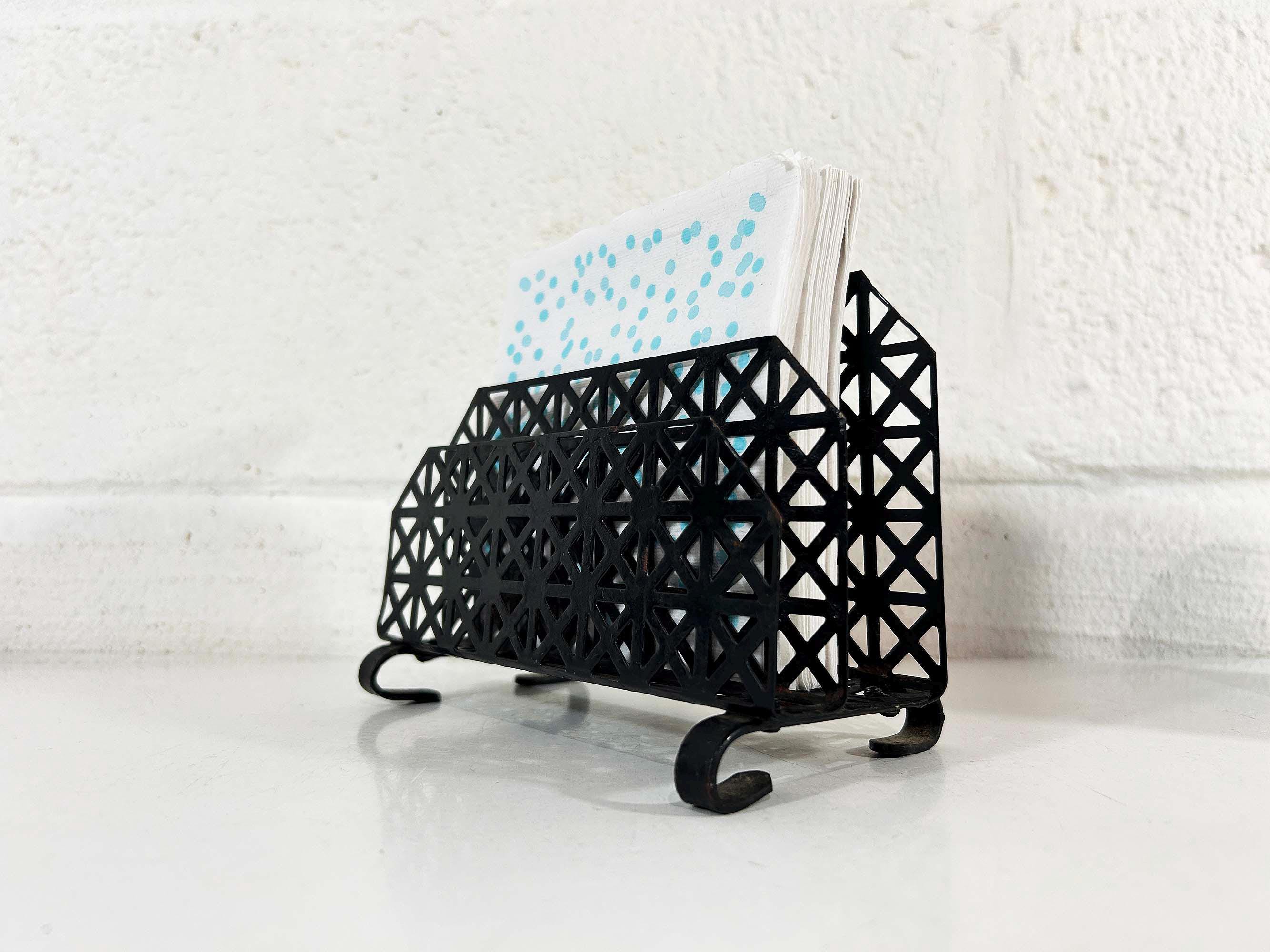 MCM black metal mesh napkin or mail holder! In good vintage condition a bit of bending on the metal - please be sure to inspect all photos closely. The napkin holder is approximately 4 1/4 inches tall, 6 inches wide and 3 1/4 inches deep.