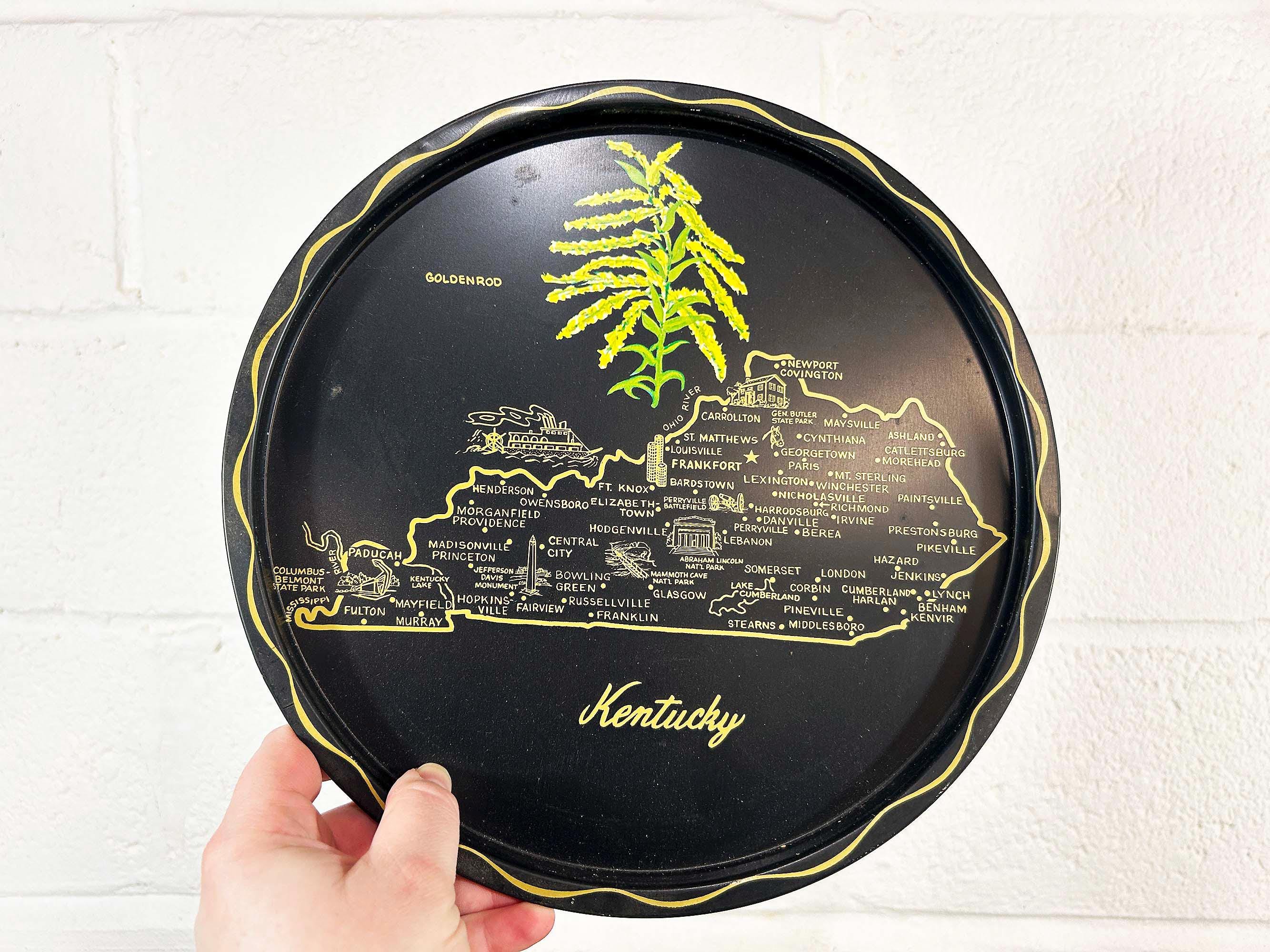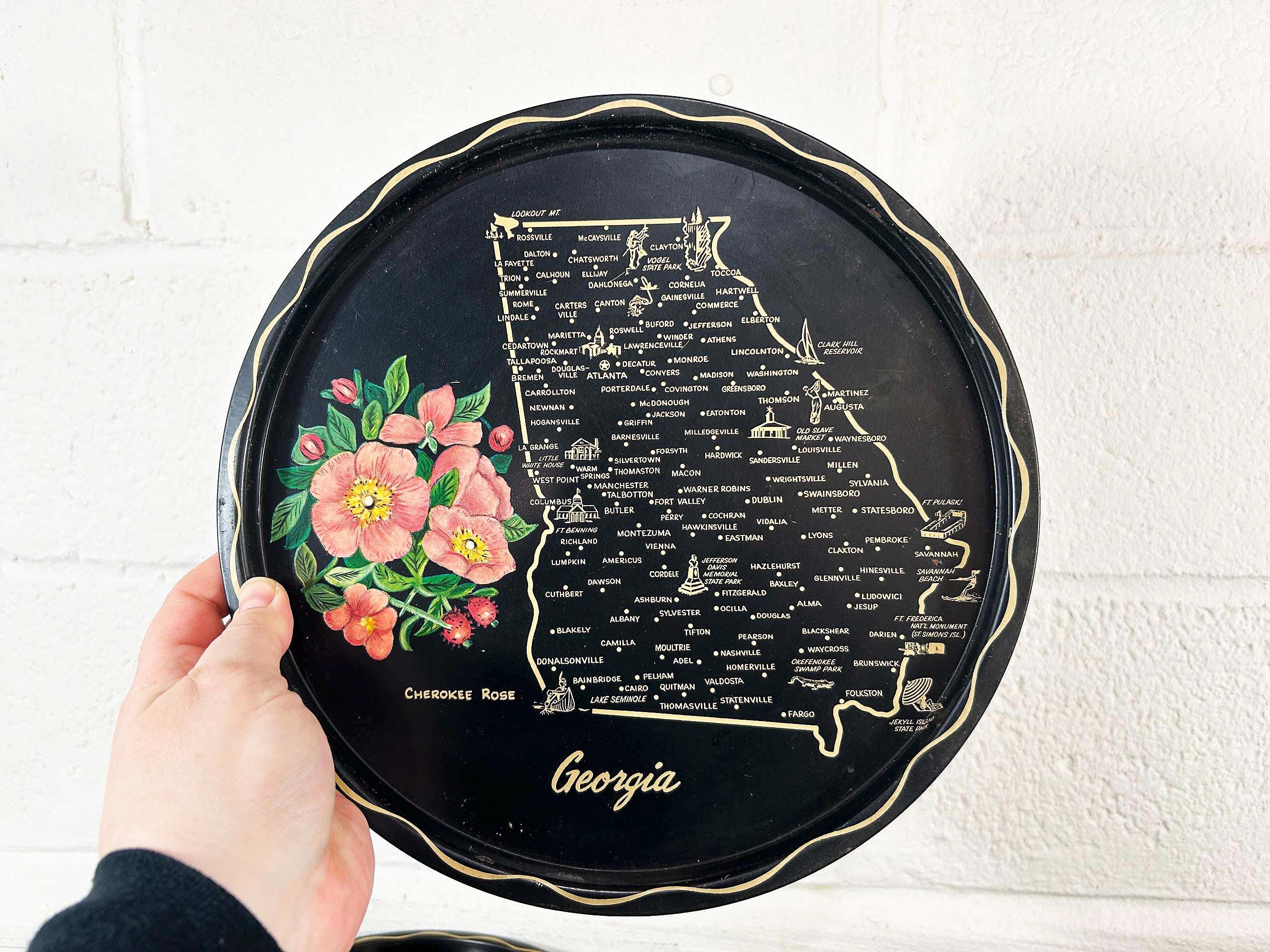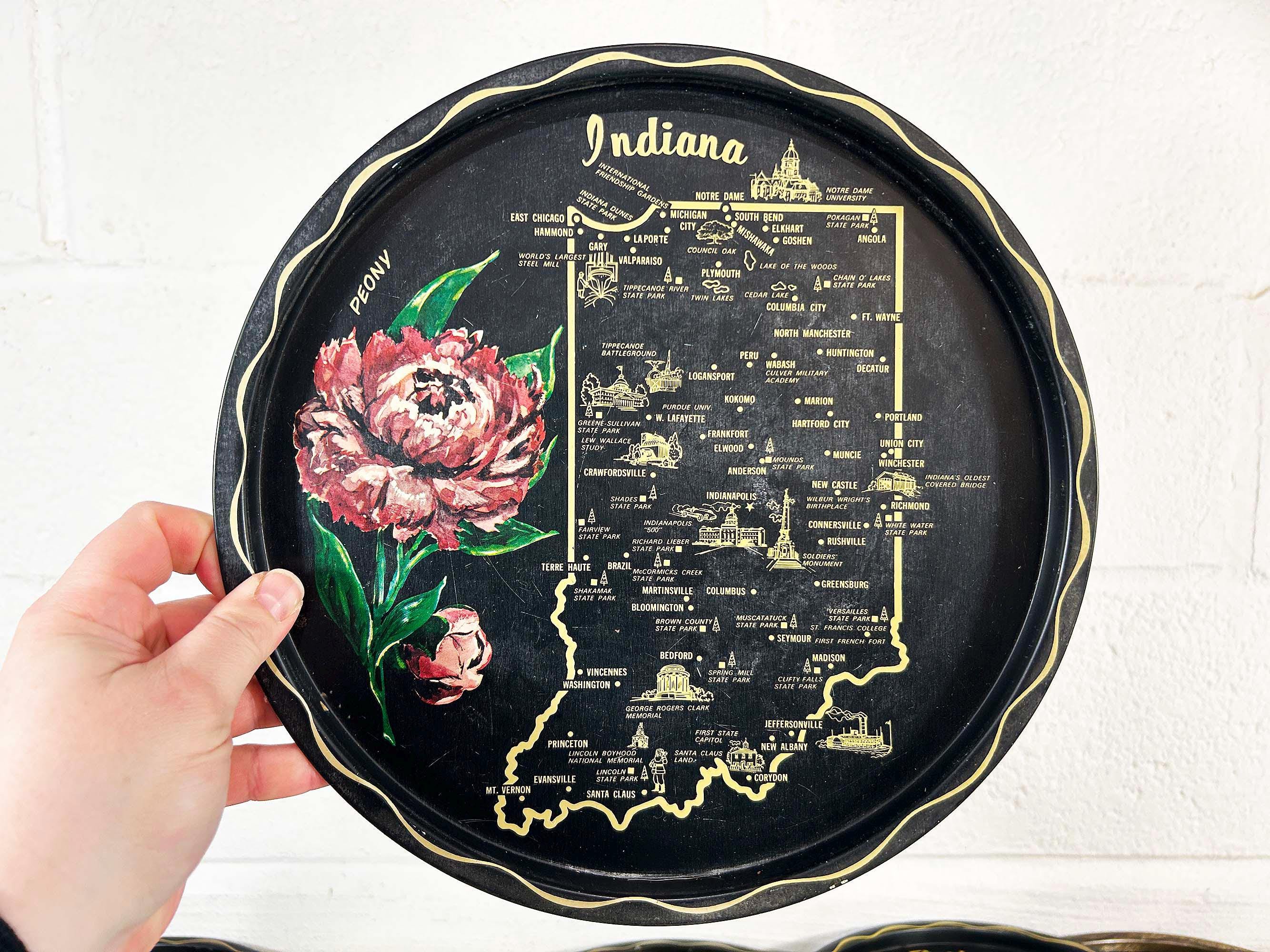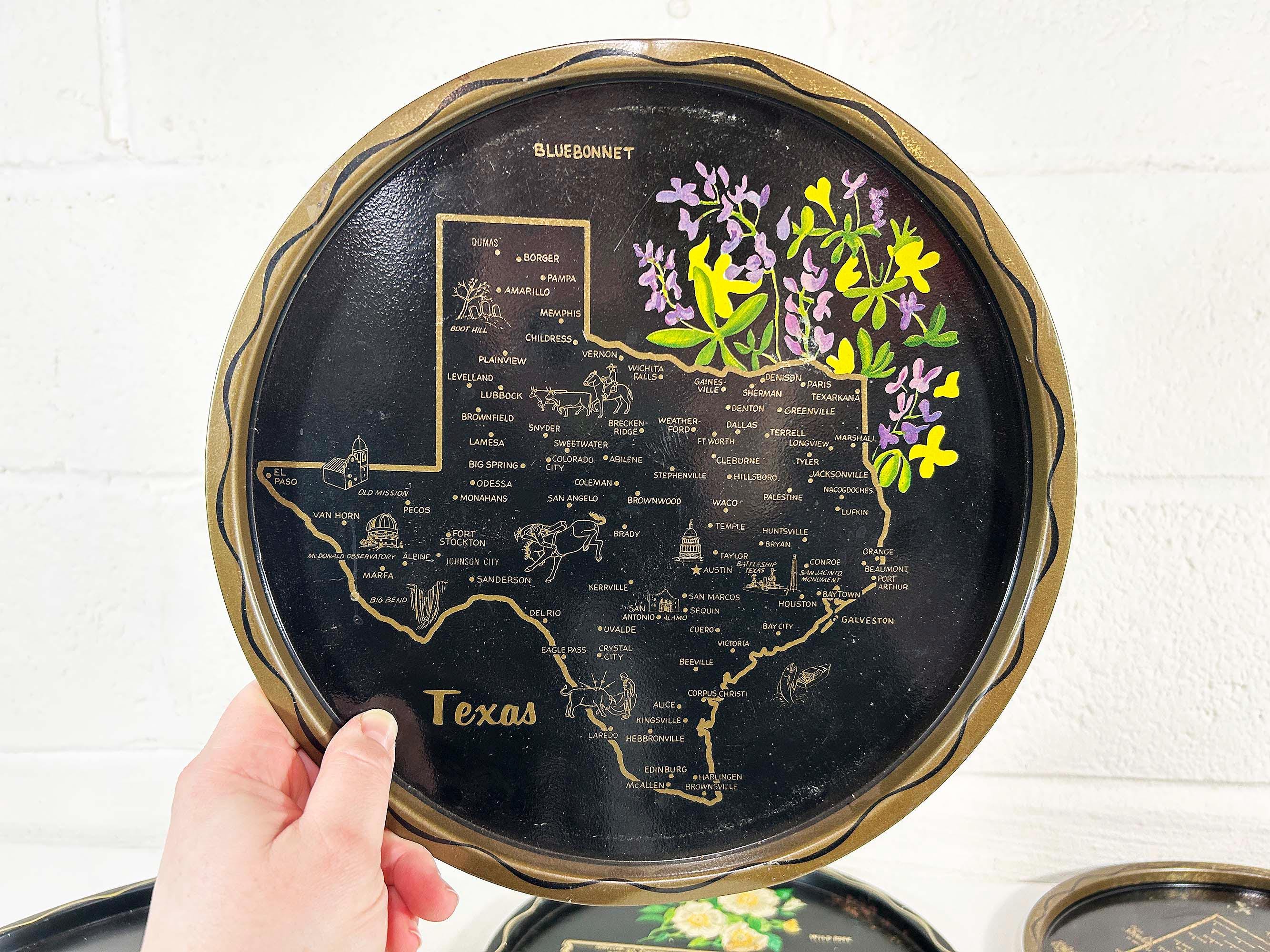 Very cool vintage state souvenir drink trays. Each is sold individually - choose the tray you'd like from the drop down menu. All the trays are showing signs of age and wear - please be sure to inspect all photos closely. Each tray is approximately 11 inches in diameter and 1/2 inches tall.
