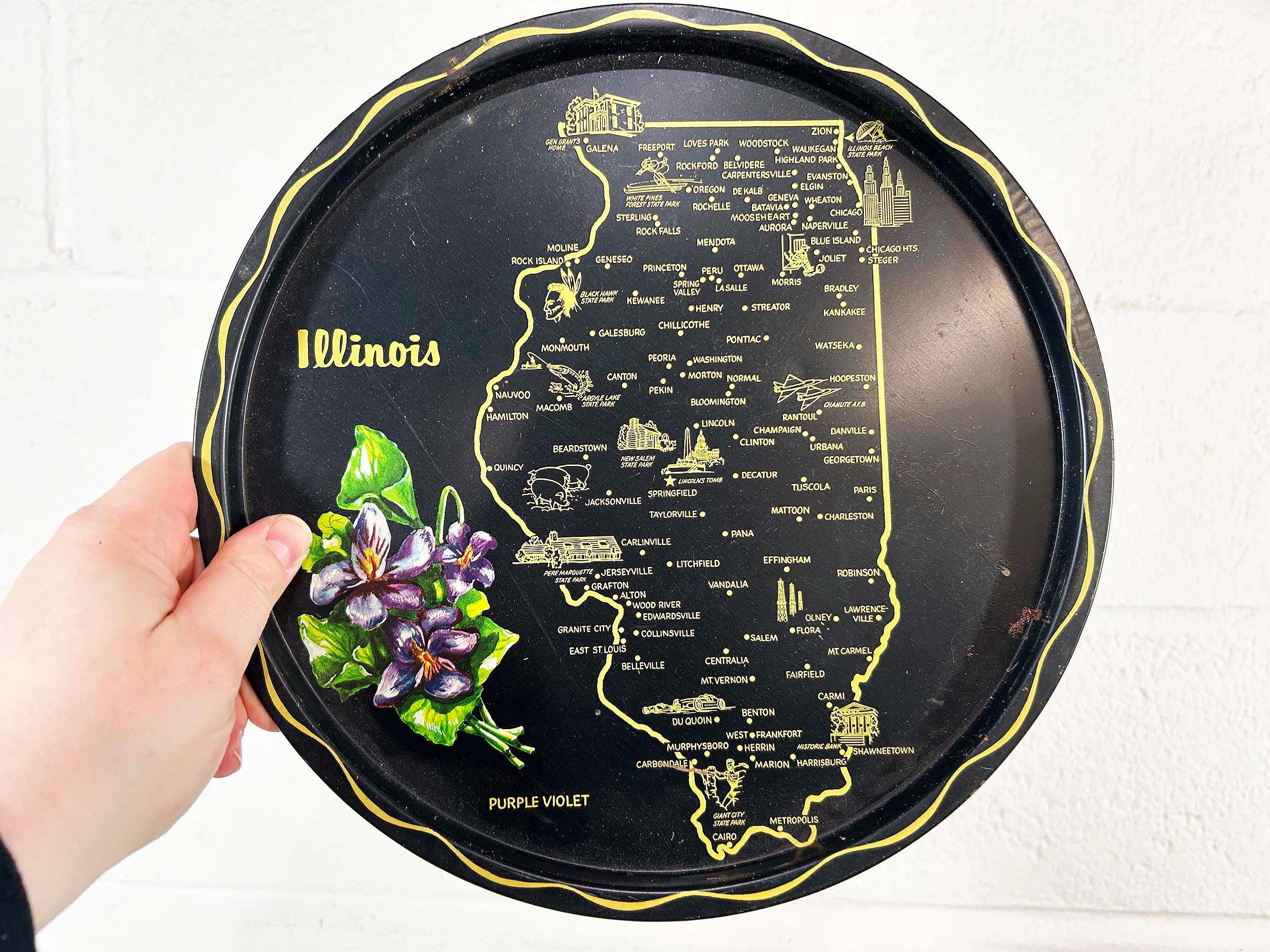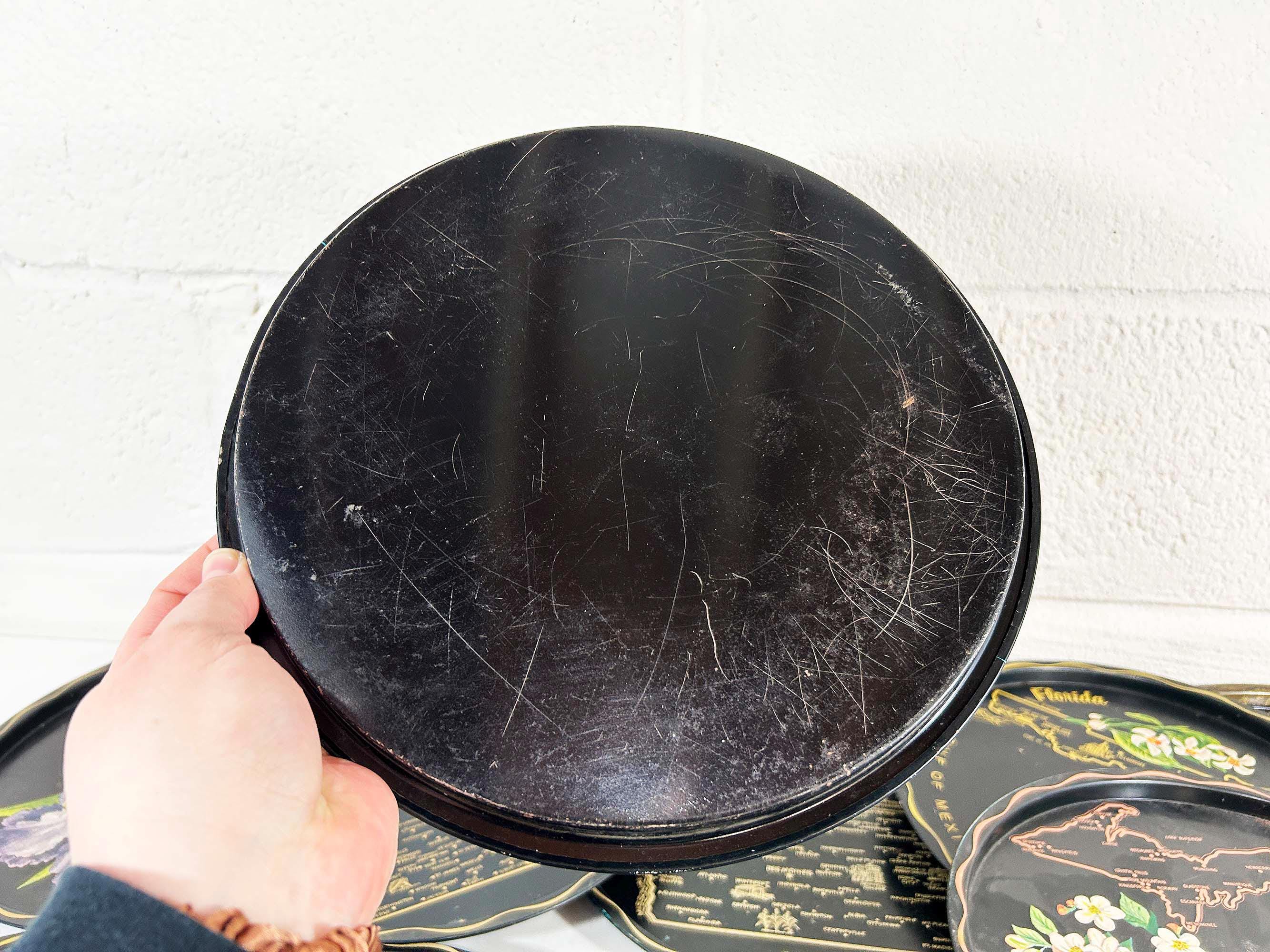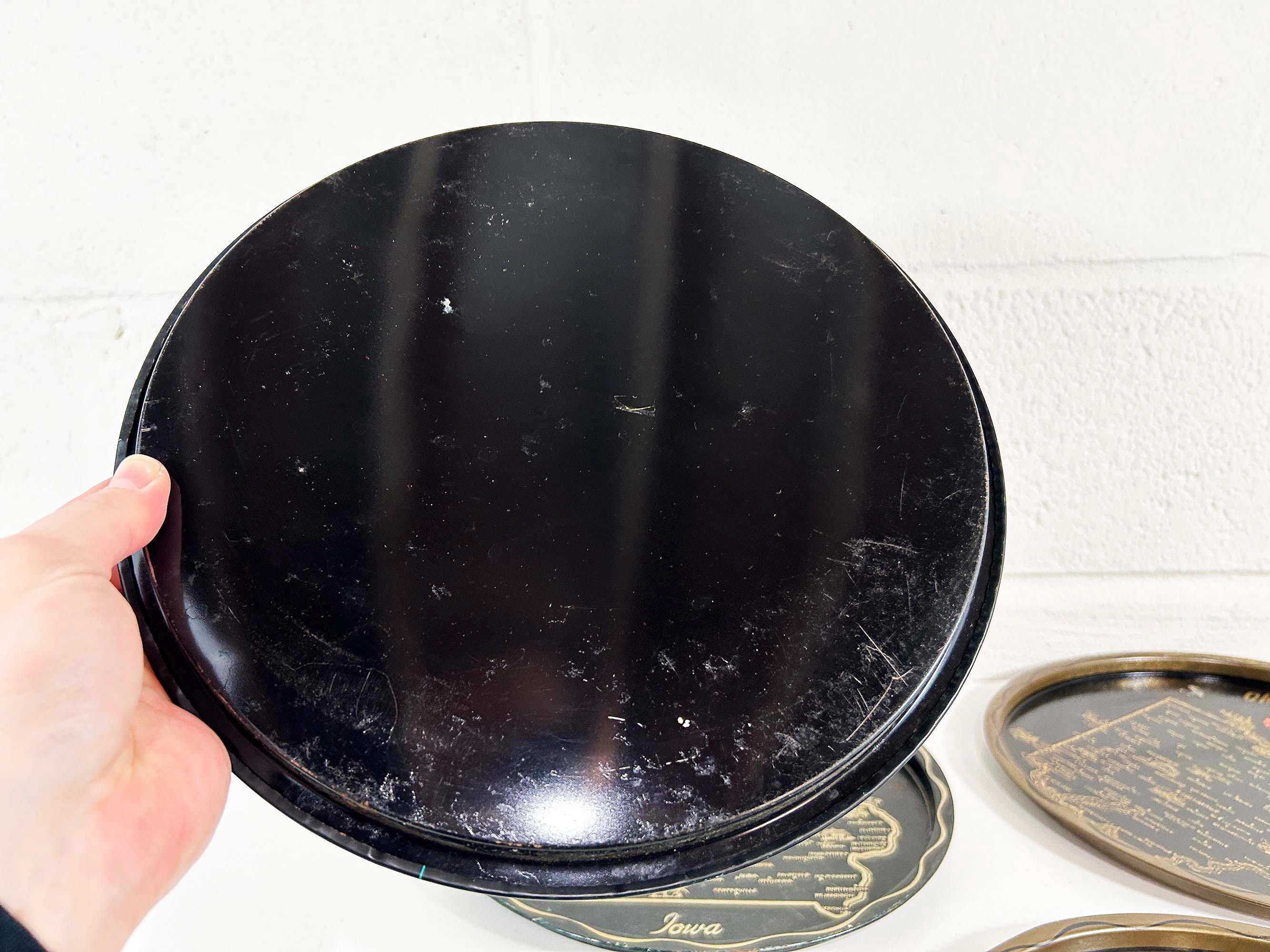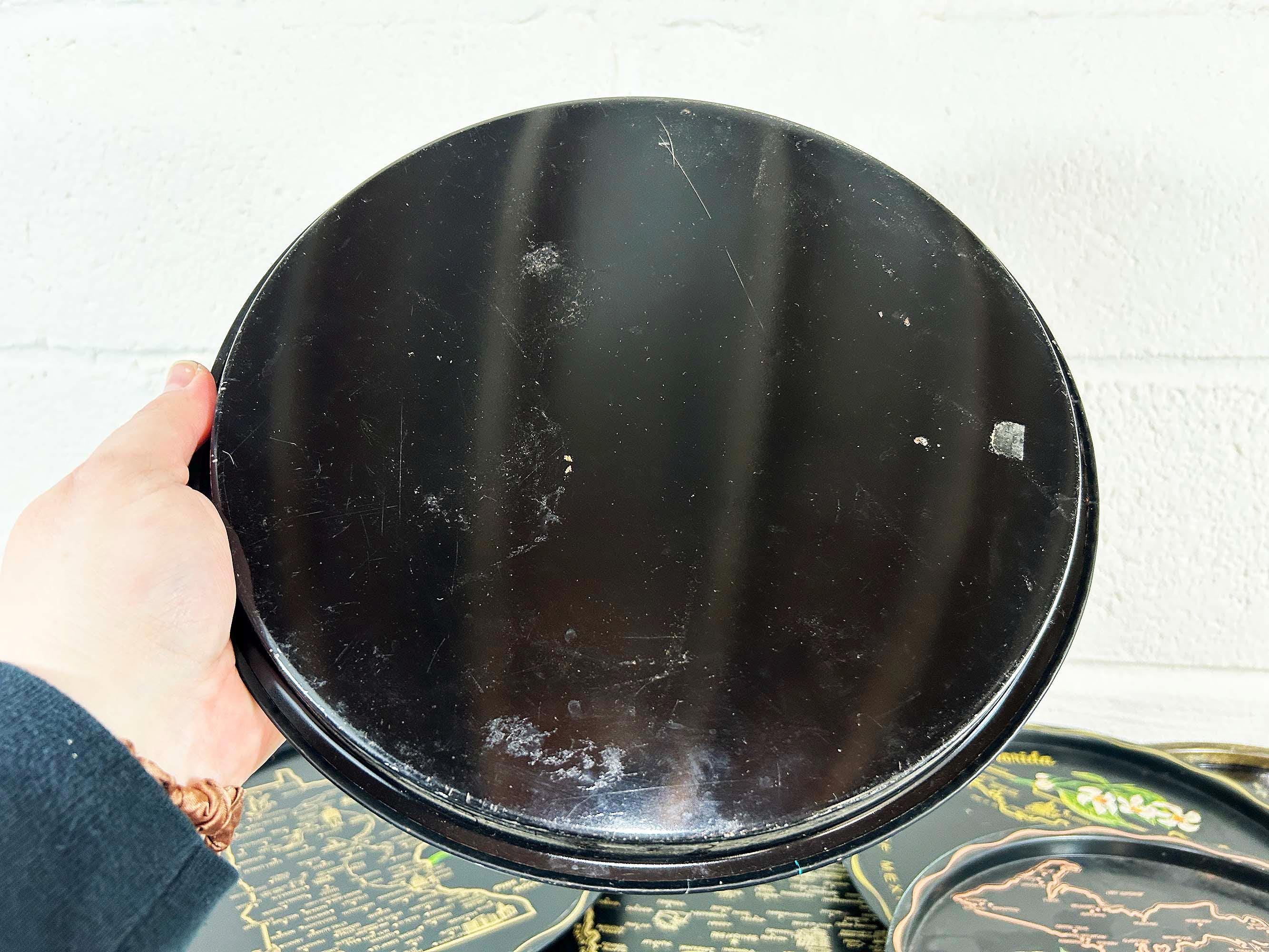 Very cool vintage state souvenir drink trays. Each is sold individually - choose the tray you'd like from the drop down menu. All the trays are showing signs of age and wear - please be sure to inspect all photos closely. Each tray is approximately 11 inches in diameter and 1/2 inches tall.