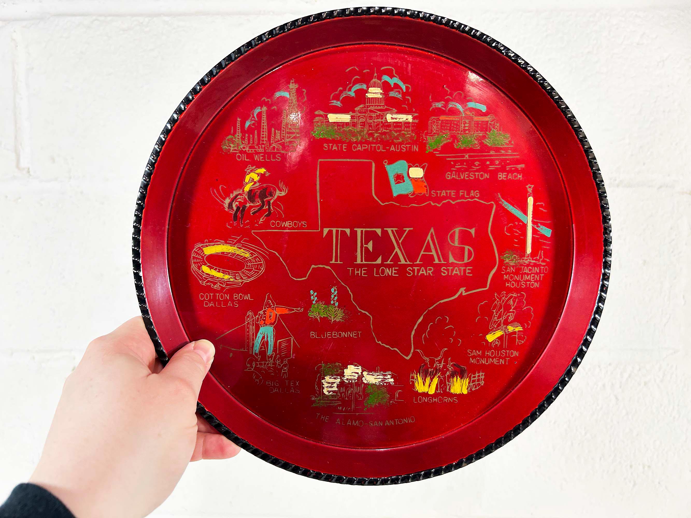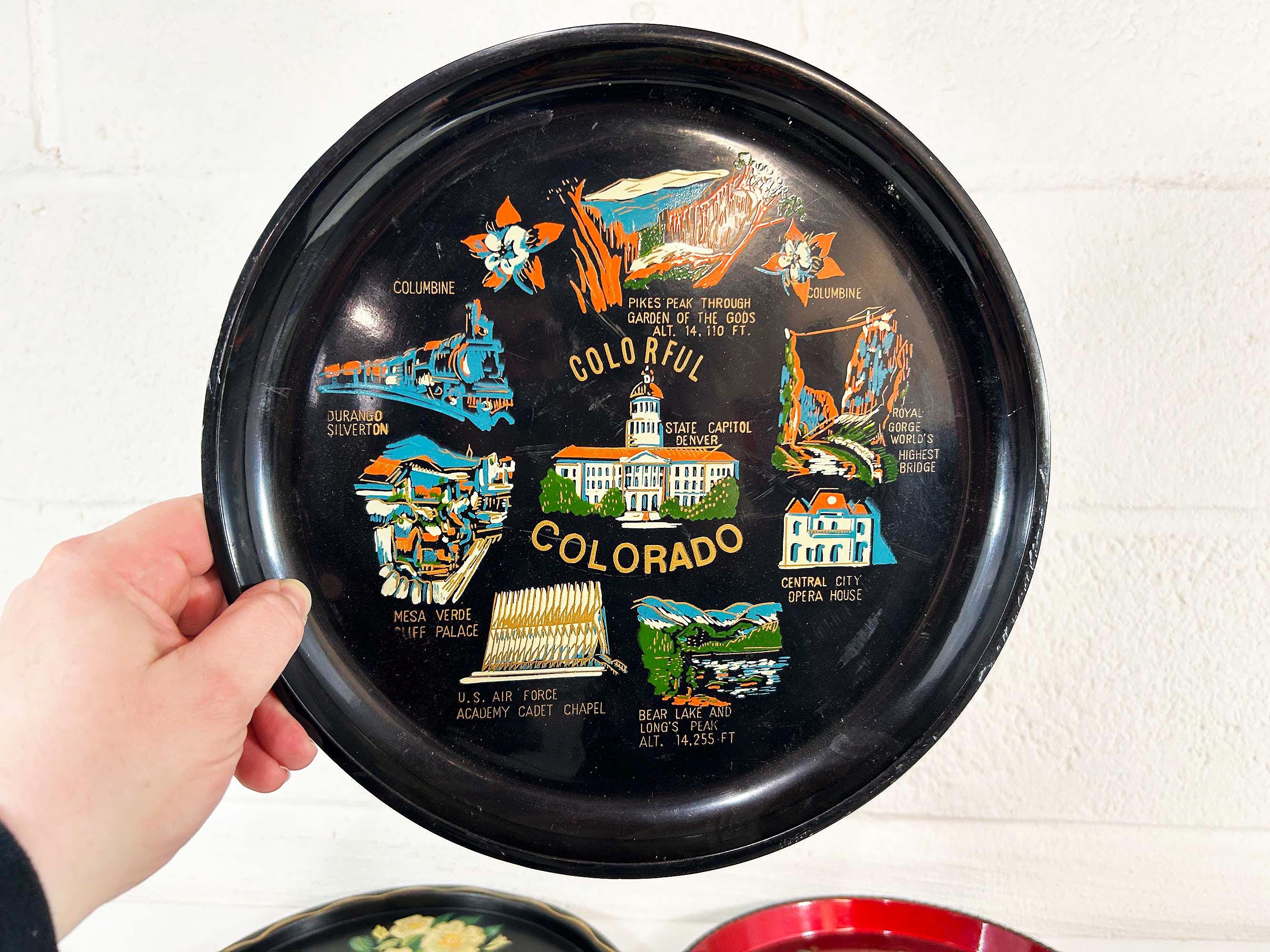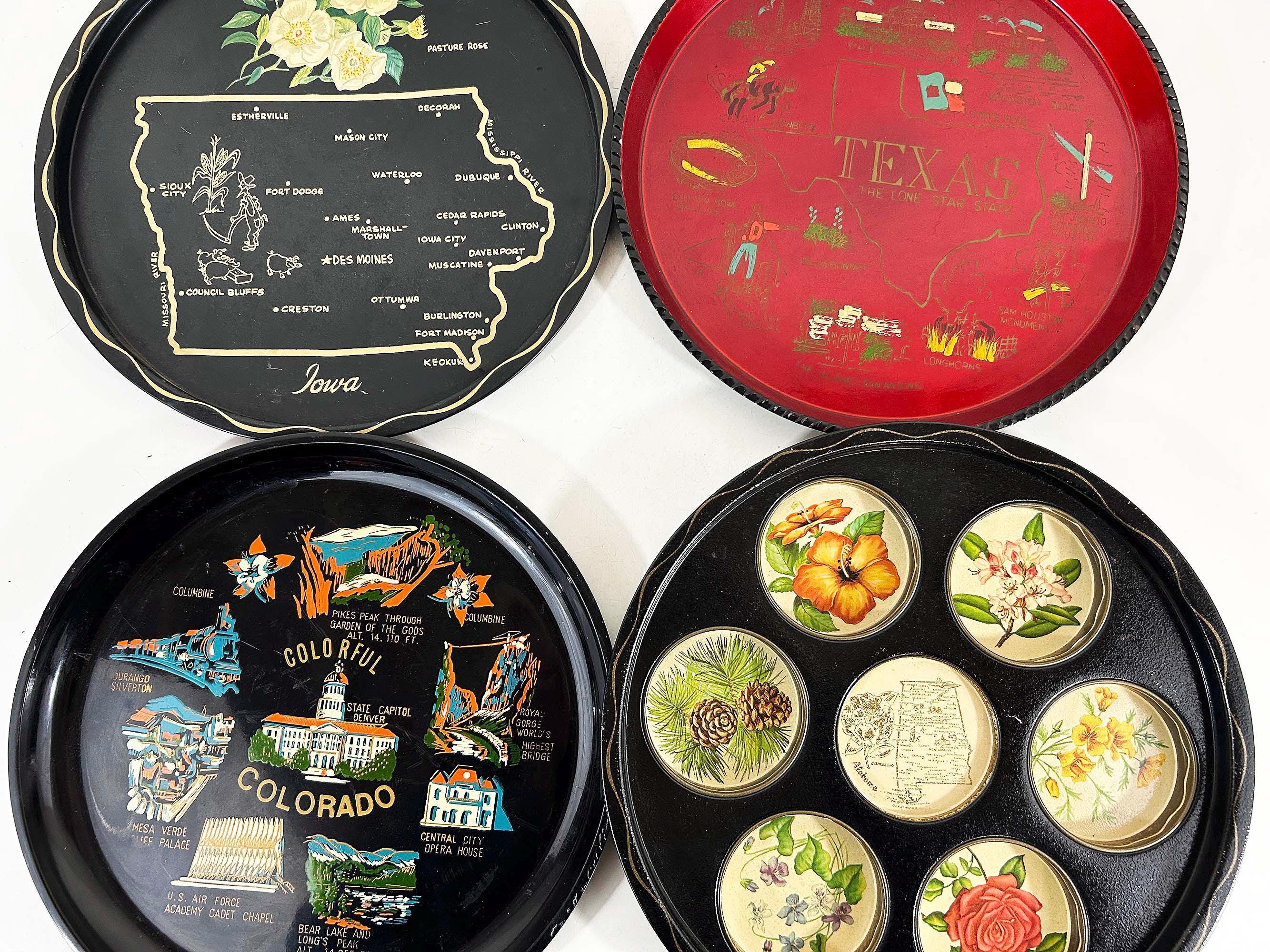 Very cool vintage souvenir drink trays from Texas, Iowa, Colorado, and Alabama. Each is sold individually - choose the tray you'd like from the drop down menu. All 4 trays are showing signs of age and wear - please be sure to inspect all photos closely. The Texas and Colorado trays are plastic and the Iowa and Alabama trays are metal. Each tray is approximately 11 inches in diameter.