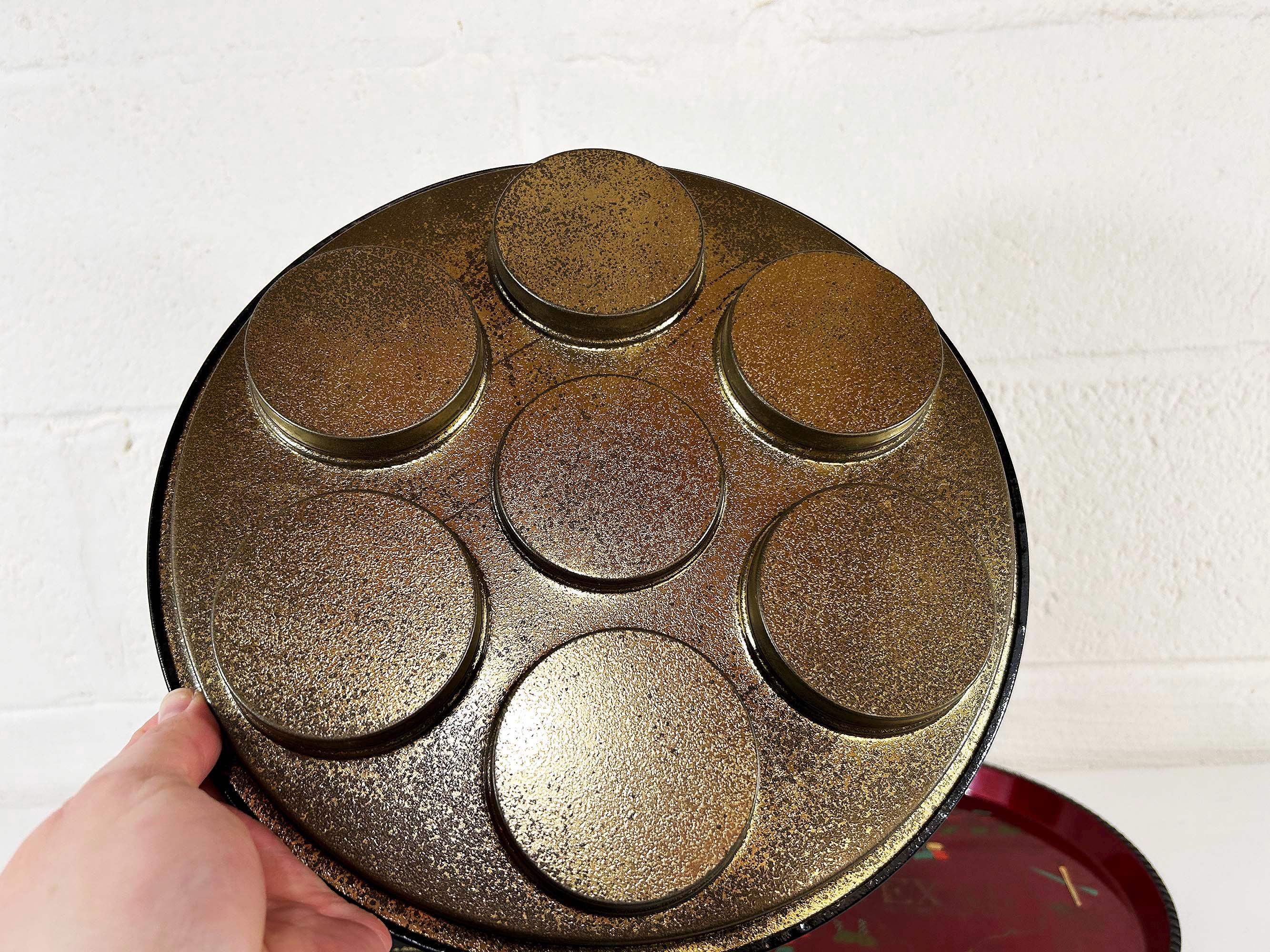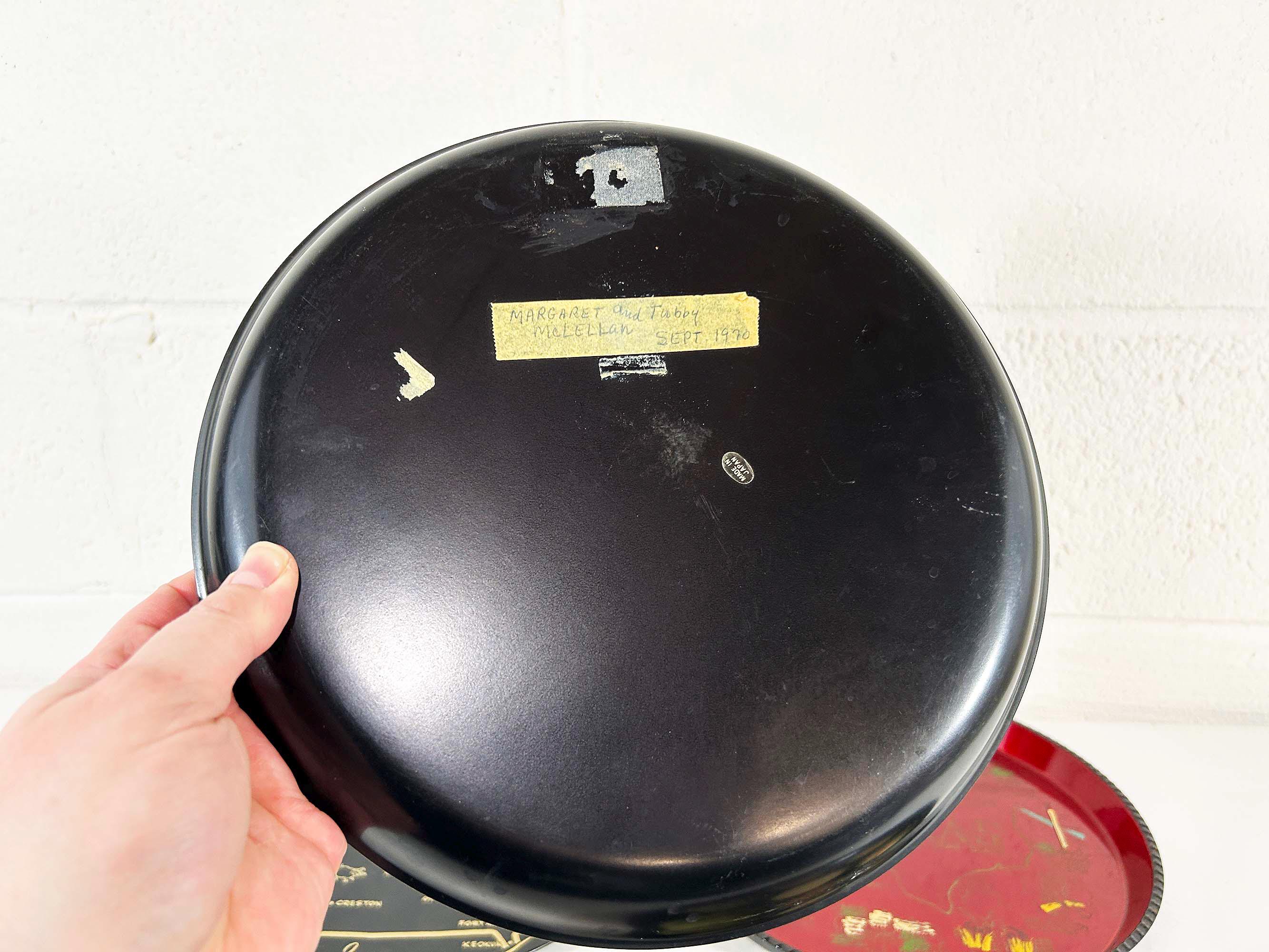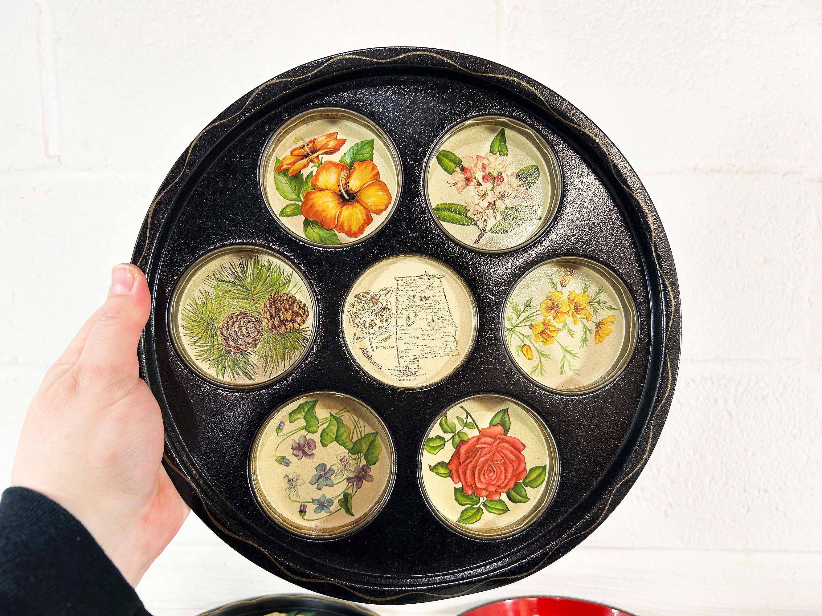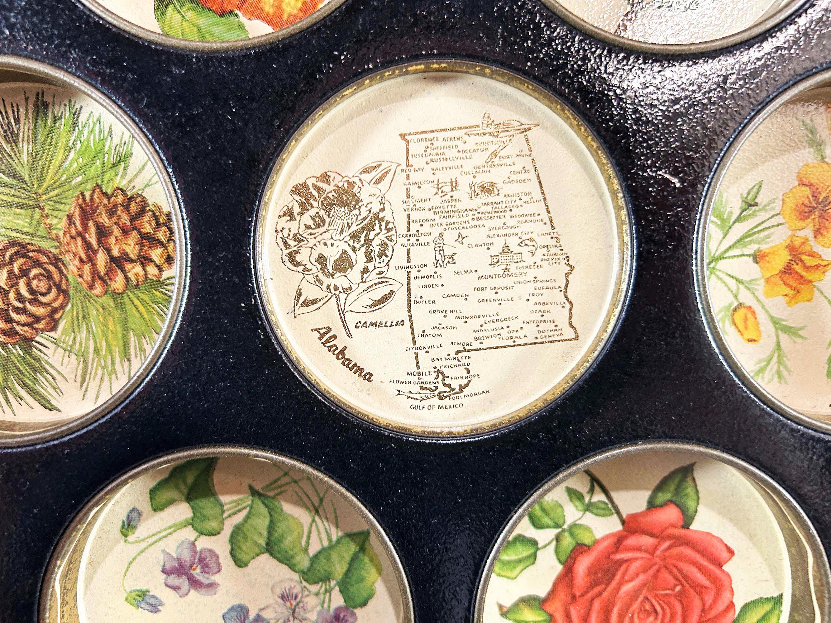 Very cool vintage souvenir drink trays from Texas, Iowa, Colorado, and Alabama. Each is sold individually - choose the tray you'd like from the drop down menu. All 4 trays are showing signs of age and wear - please be sure to inspect all photos closely. The Texas and Colorado trays are plastic and the Iowa and Alabama trays are metal. Each tray is approximately 11 inches in diameter.