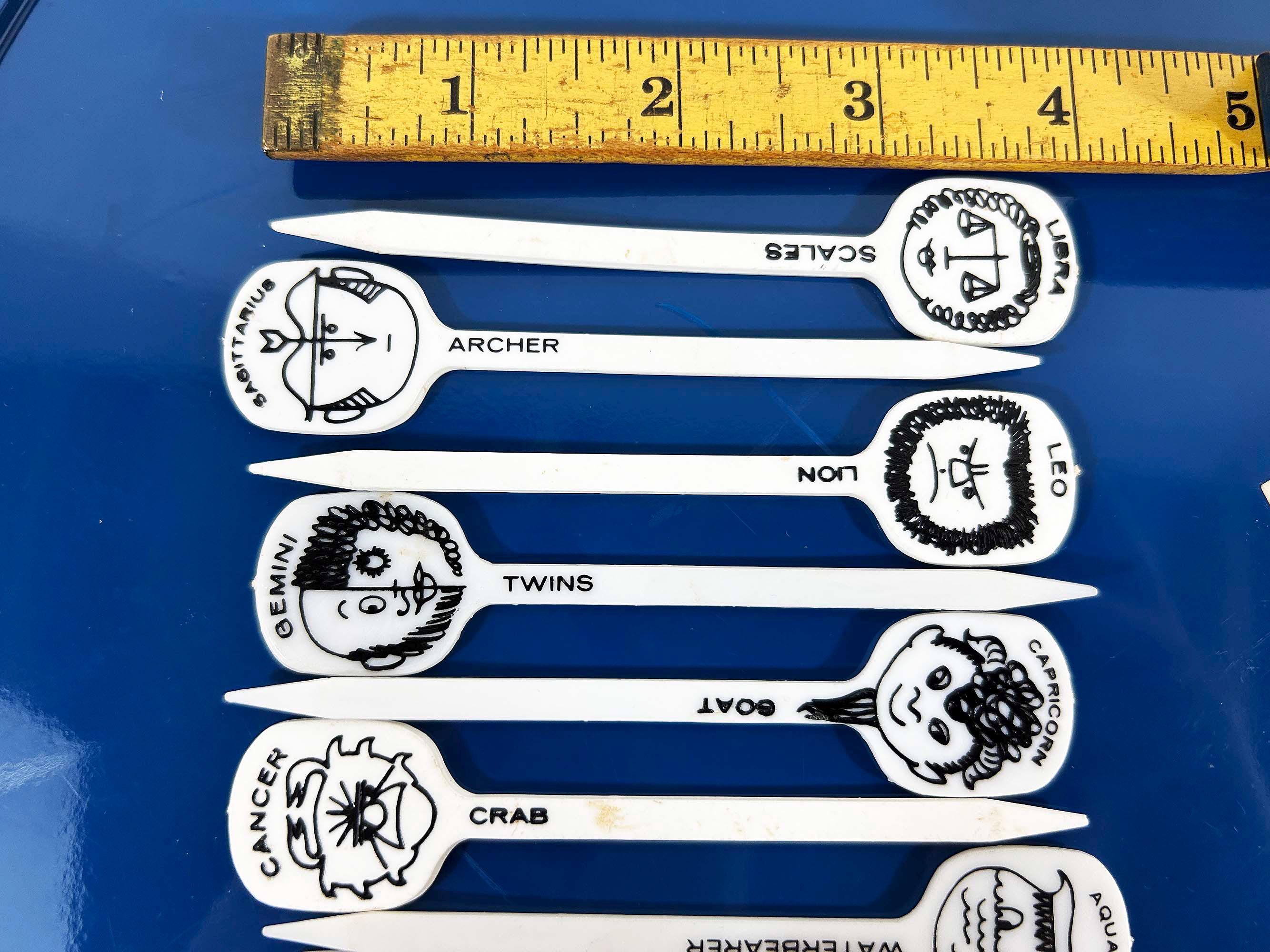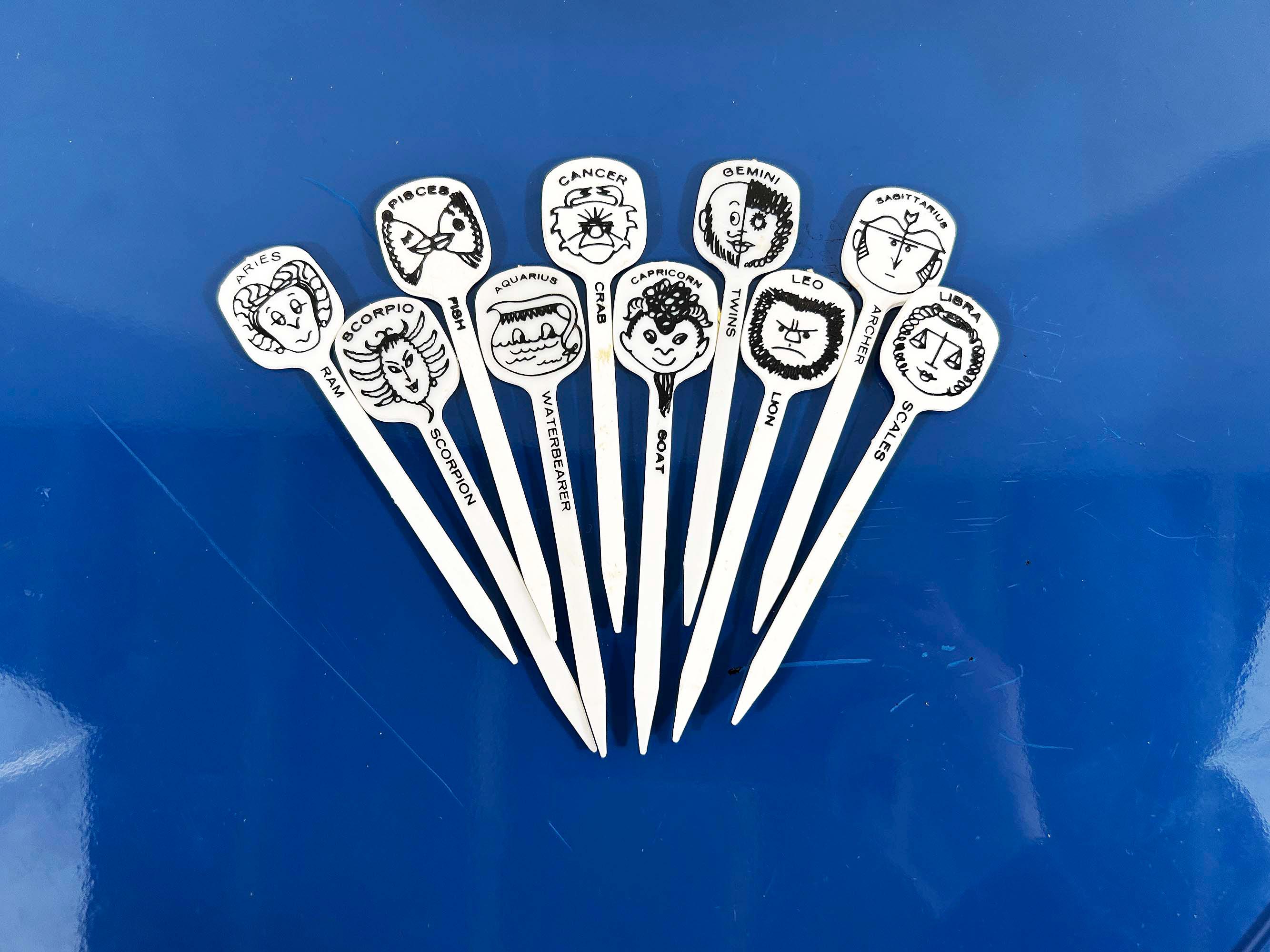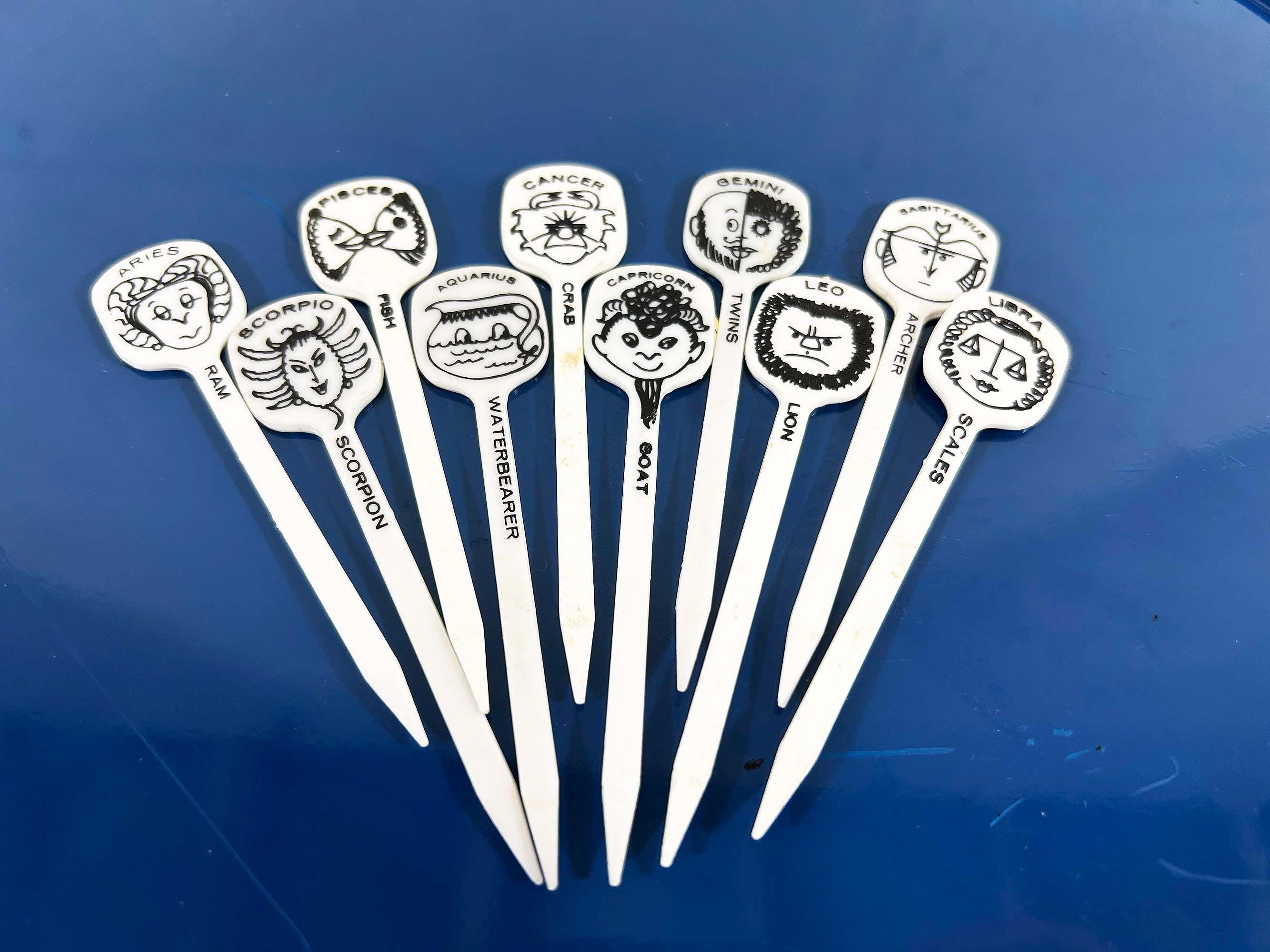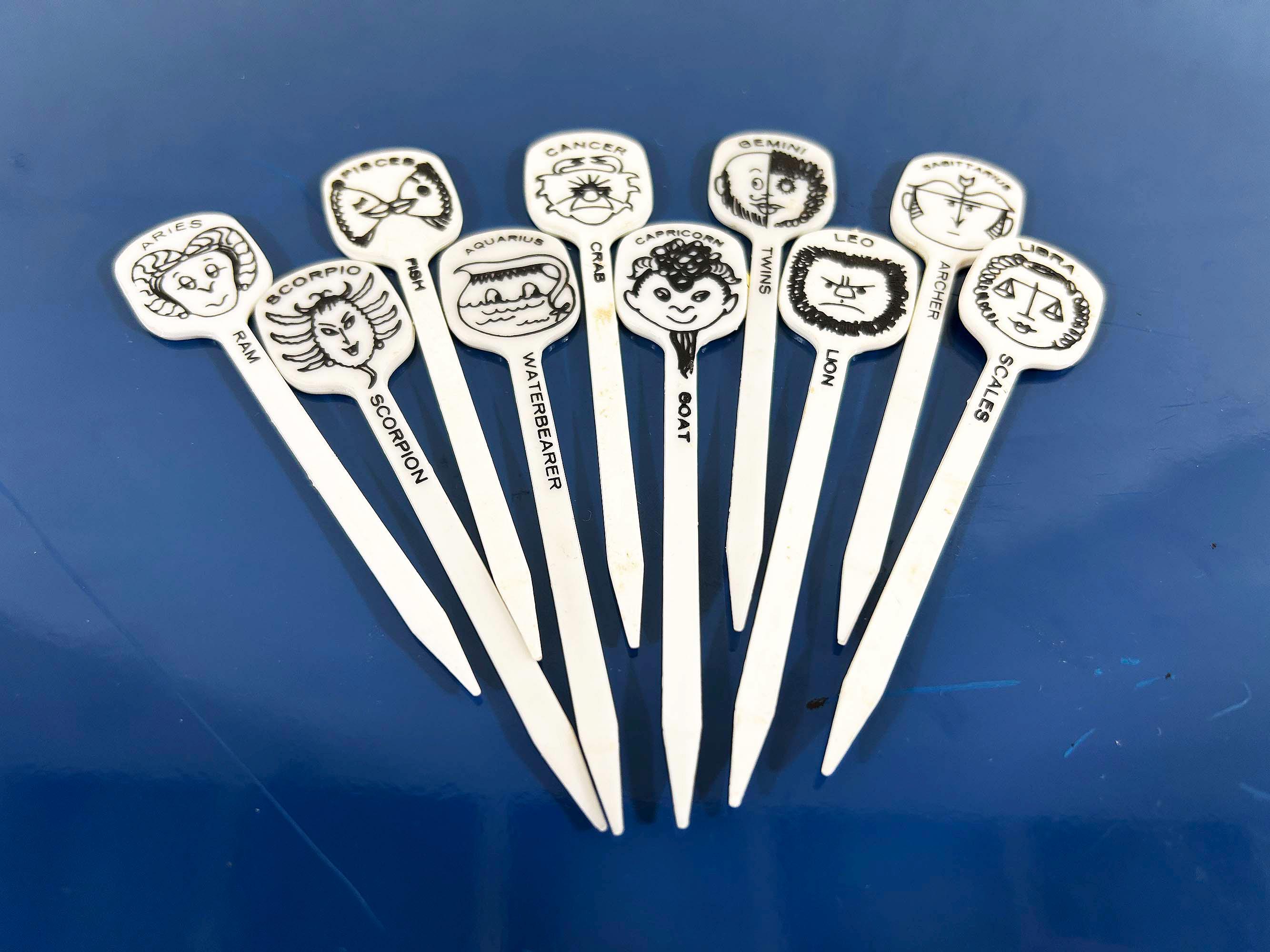 Adorable vintage zodiac plastic picks for cake, cheese or appetizers or whatever you'd like! Includes 10 of the 12 signs— no Virgo or Taurus. Each pick measures approximately 4 inches long. They are all in good shape but a couple have a bit of paint loss and light stains - please be sure to inspect all photos closely.