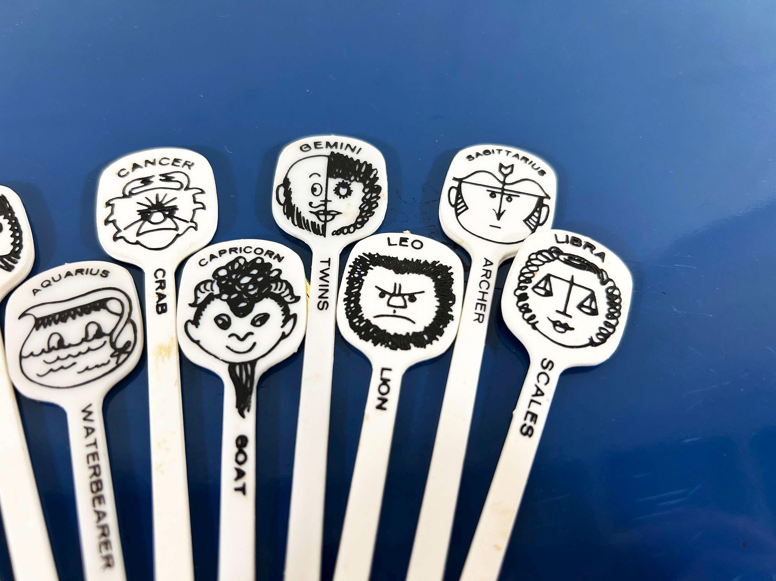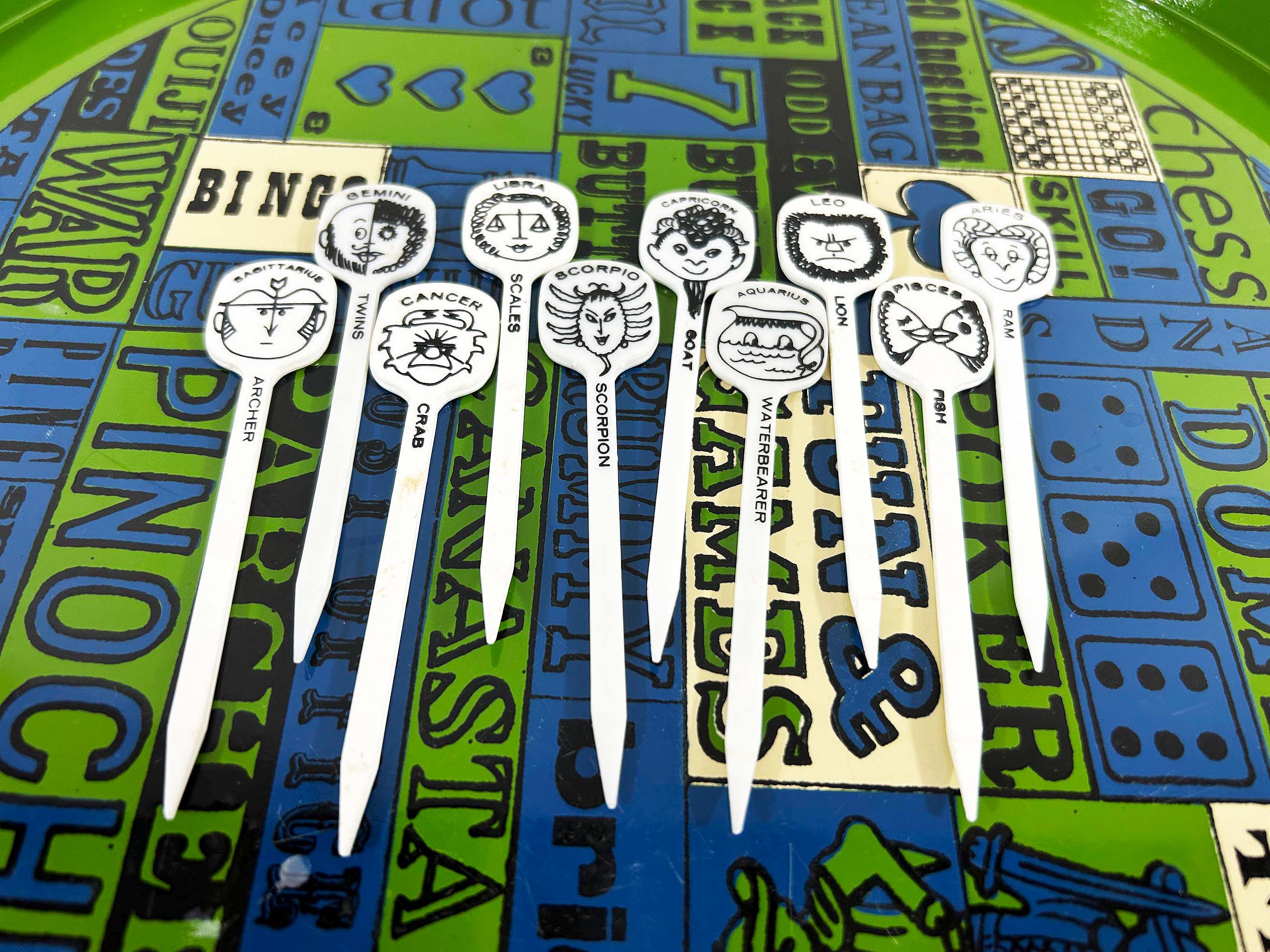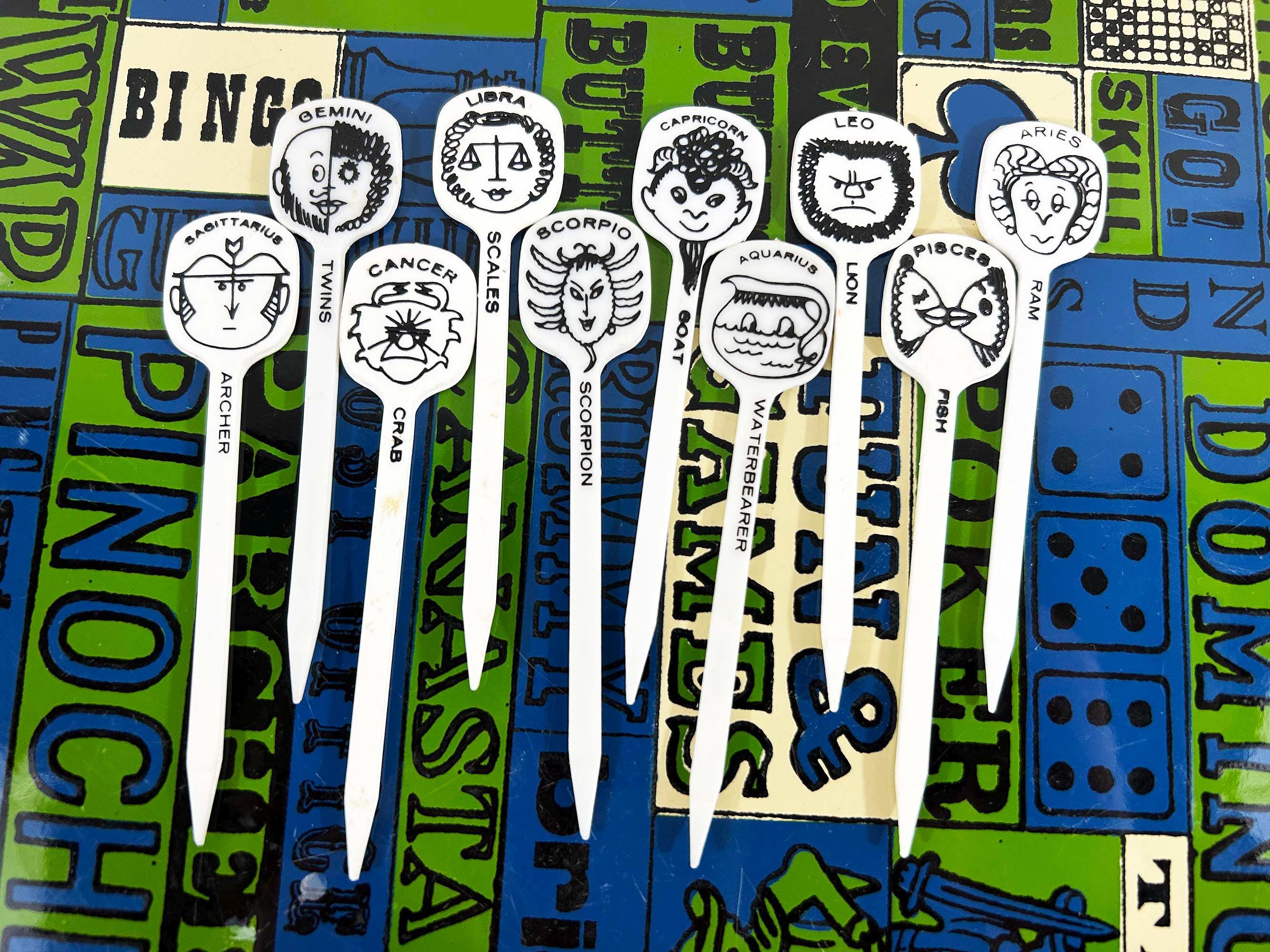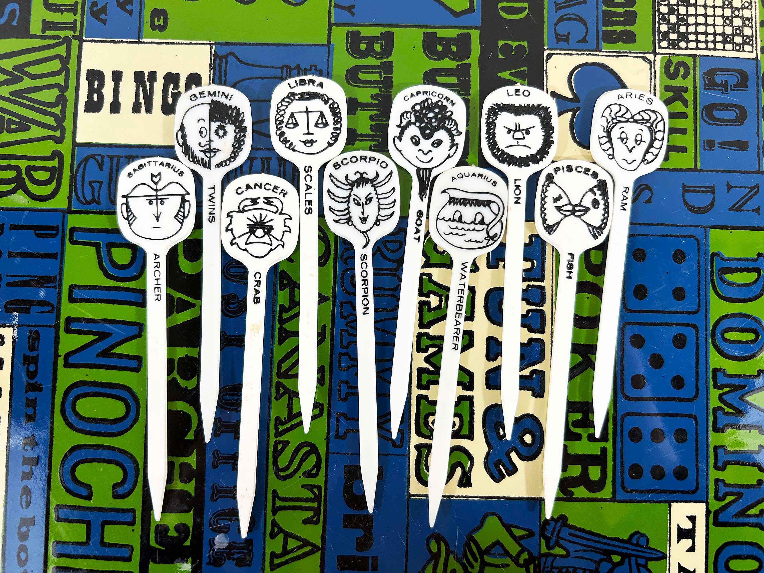 Adorable vintage zodiac plastic picks for cake, cheese or appetizers or whatever you'd like! Includes 10 of the 12 signs— no Virgo or Taurus. Each pick measures approximately 4 inches long. They are all in good shape but a couple have a bit of paint loss and light stains - please be sure to inspect all photos closely.