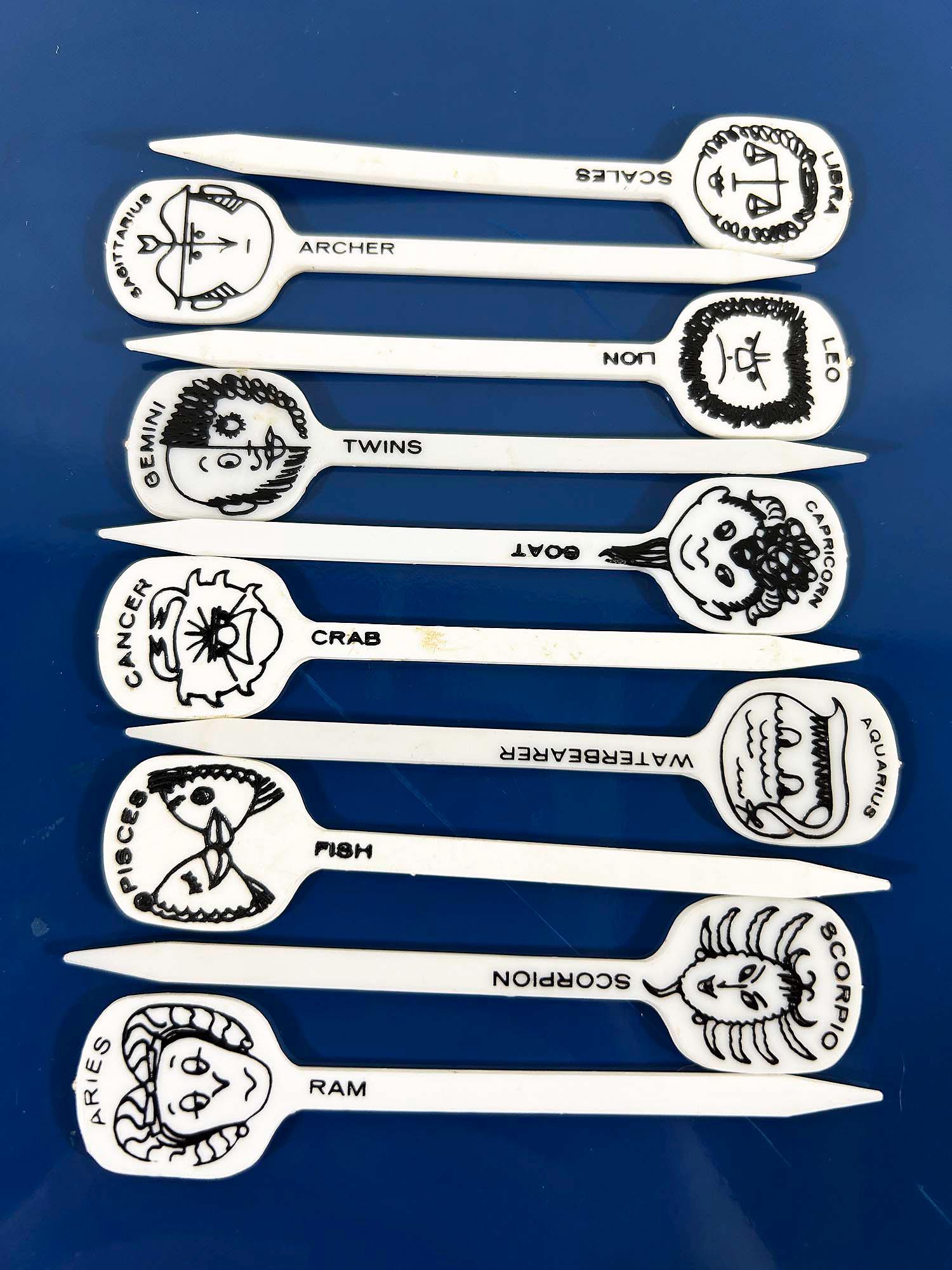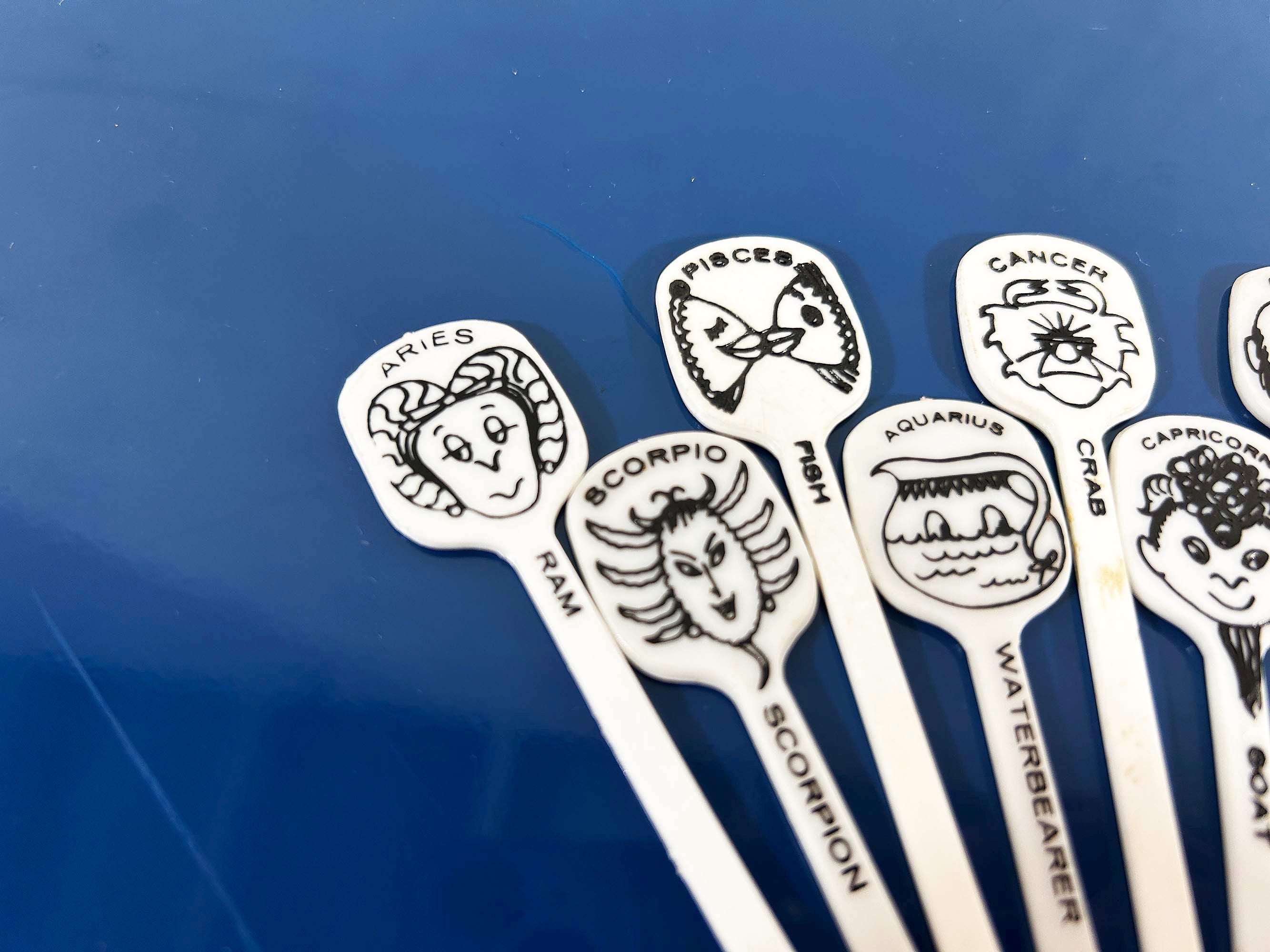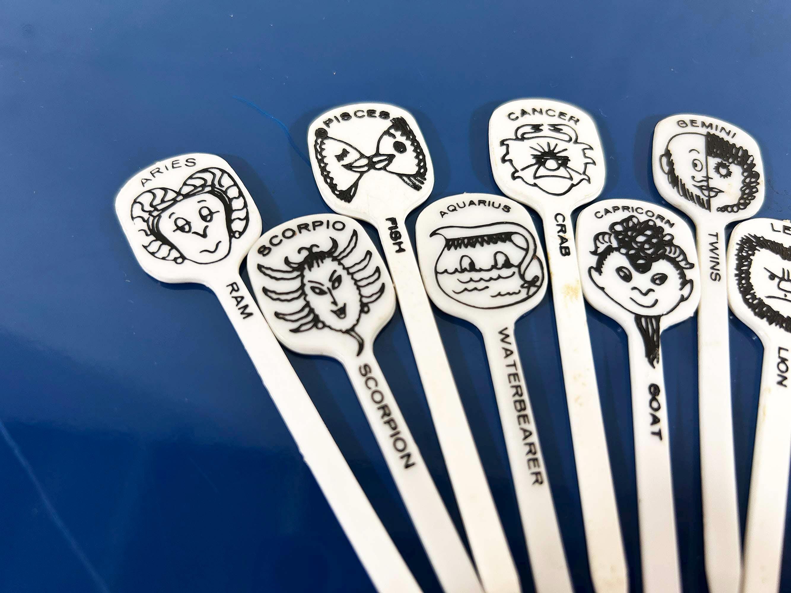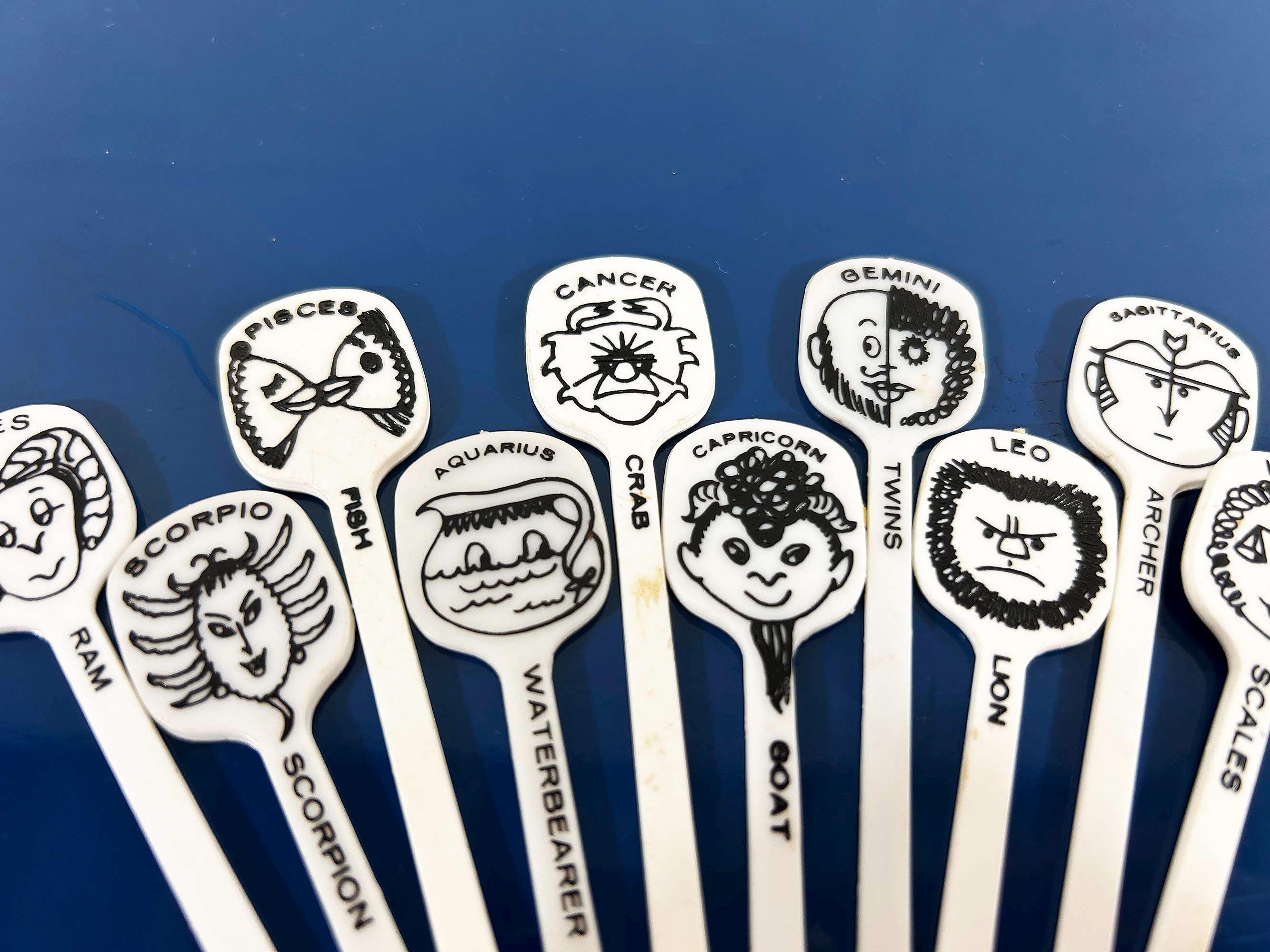 Adorable vintage zodiac plastic picks for cake, cheese or appetizers or whatever you'd like! Includes 10 of the 12 signs— no Virgo or Taurus. Each pick measures approximately 4 inches long. They are all in good shape but a couple have a bit of paint loss and light stains - please be sure to inspect all photos closely.