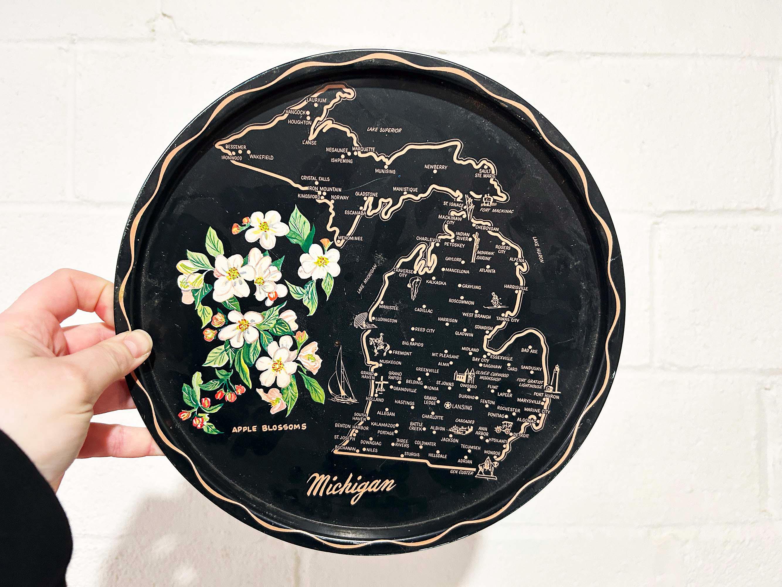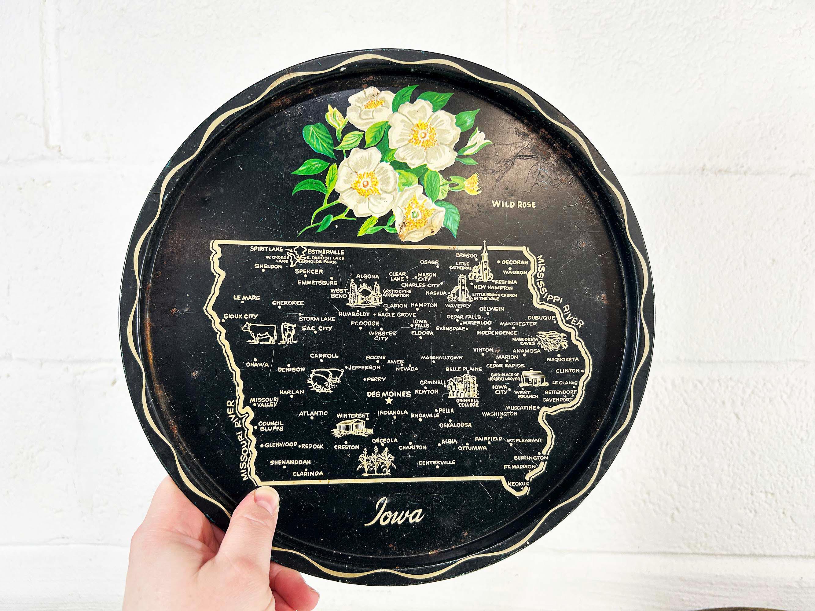 Very cool vintage souvenir drink trays from Ohio, Iowa, and Michigan. Each is sold individually - choose the tray you'd like from the drop down menu. All 3 trays are showing signs of age and wear but the Iowa tray has the most - please be sure to inspect all photos closely. Each tray is approximately 11 inches in diameter and 1/2 inches tall.