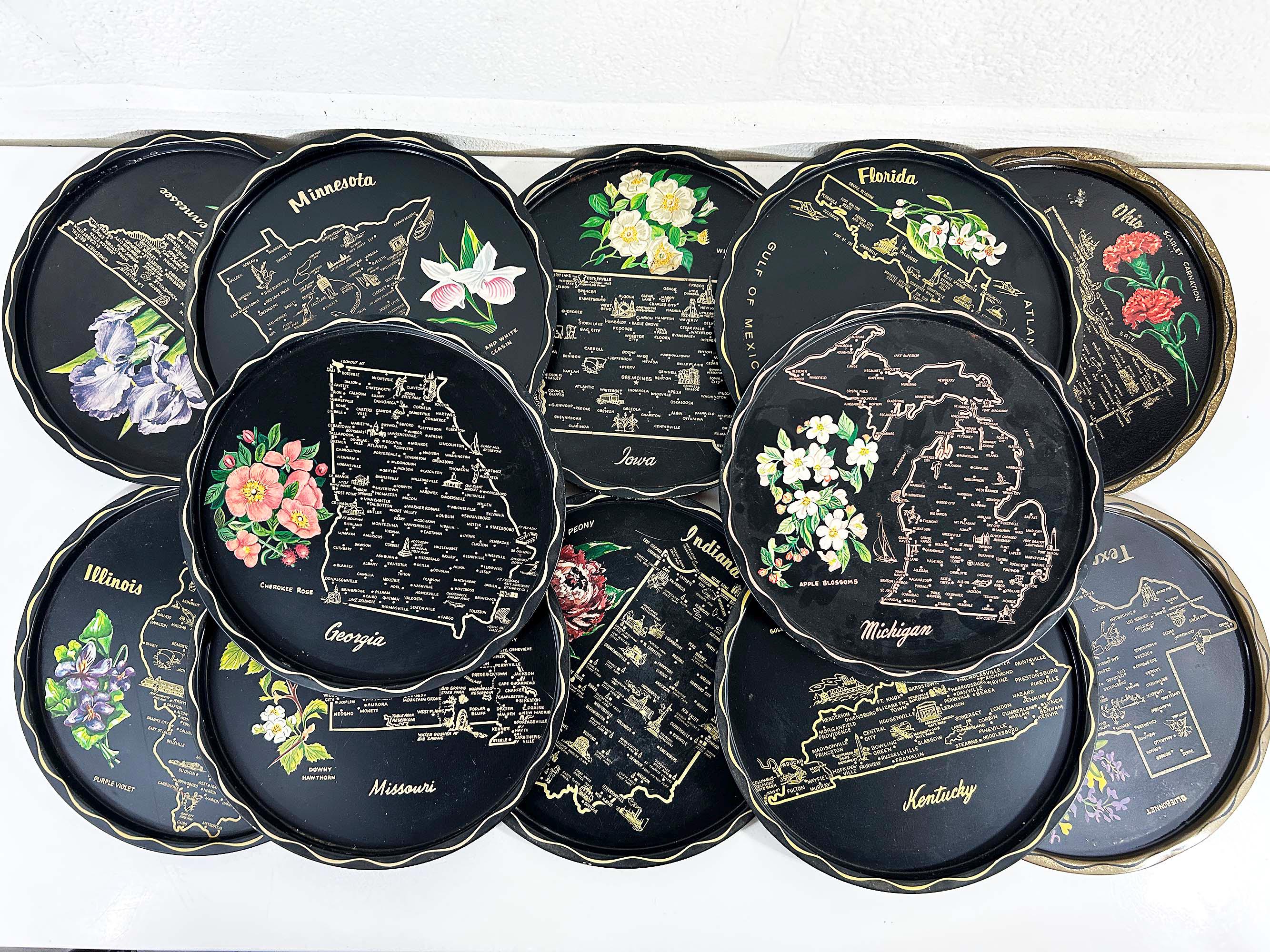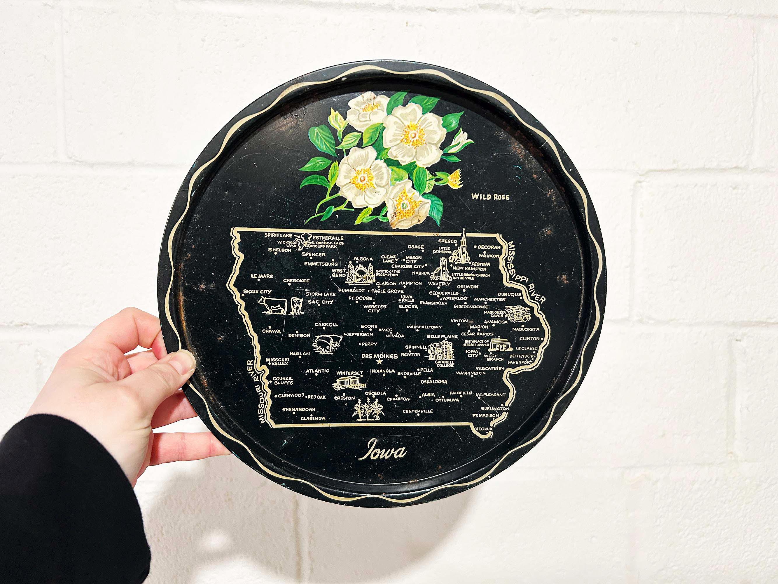 Vintage Metal State Drink Tray Plate Souvenir Map Mid-Century Barware State Flower Floral 1970s Ohio Iowa Michigan - Sold Individually