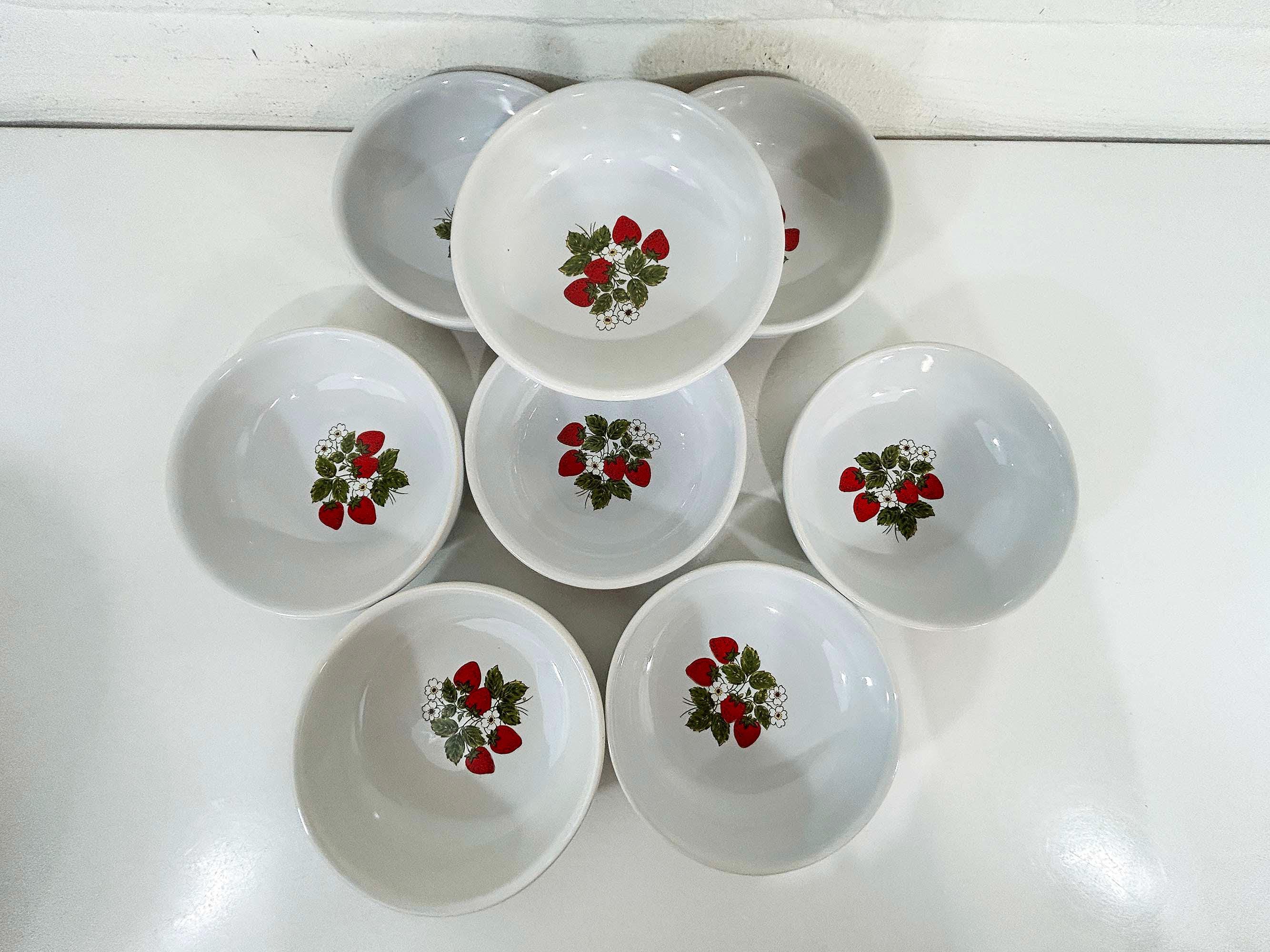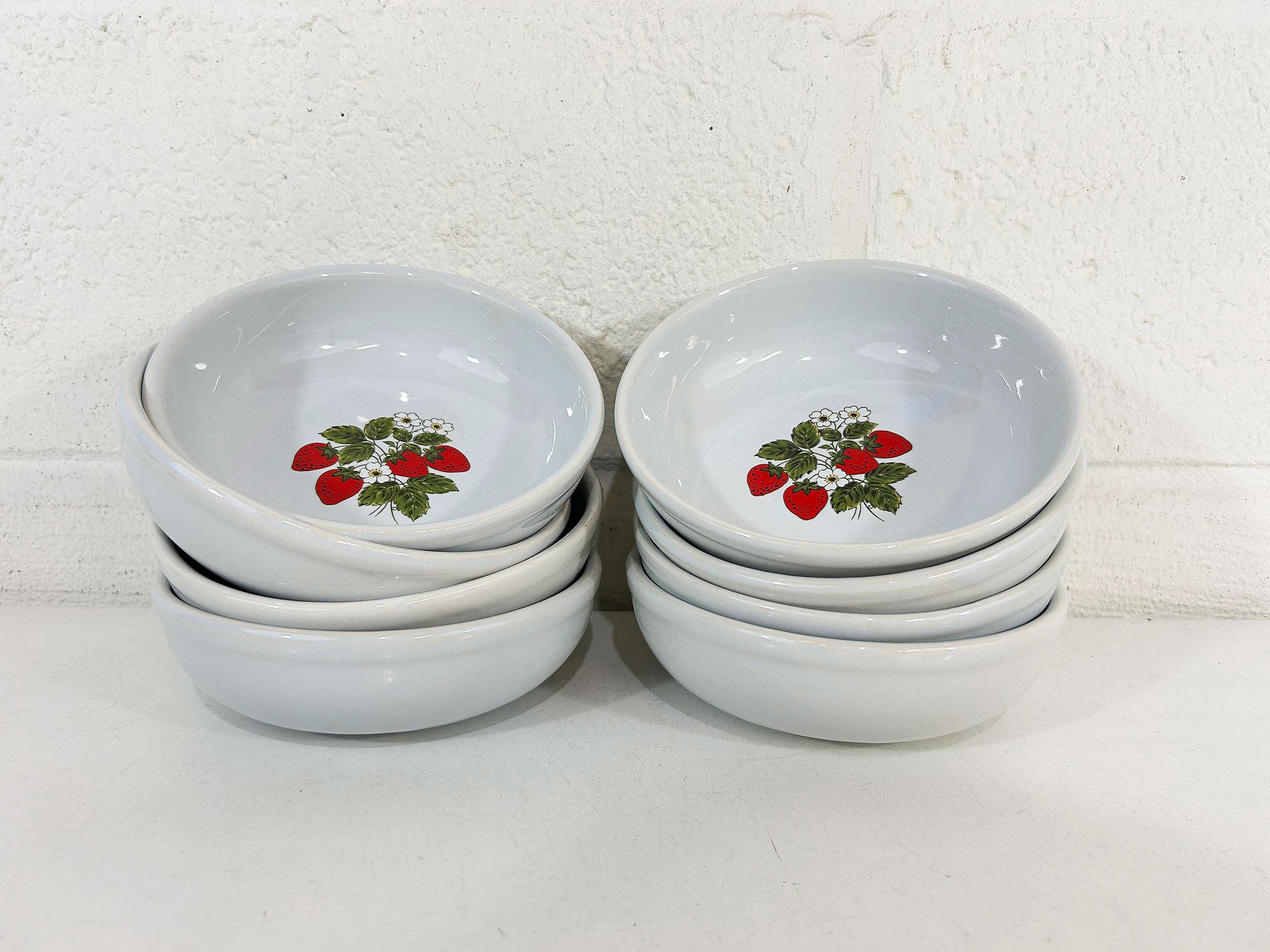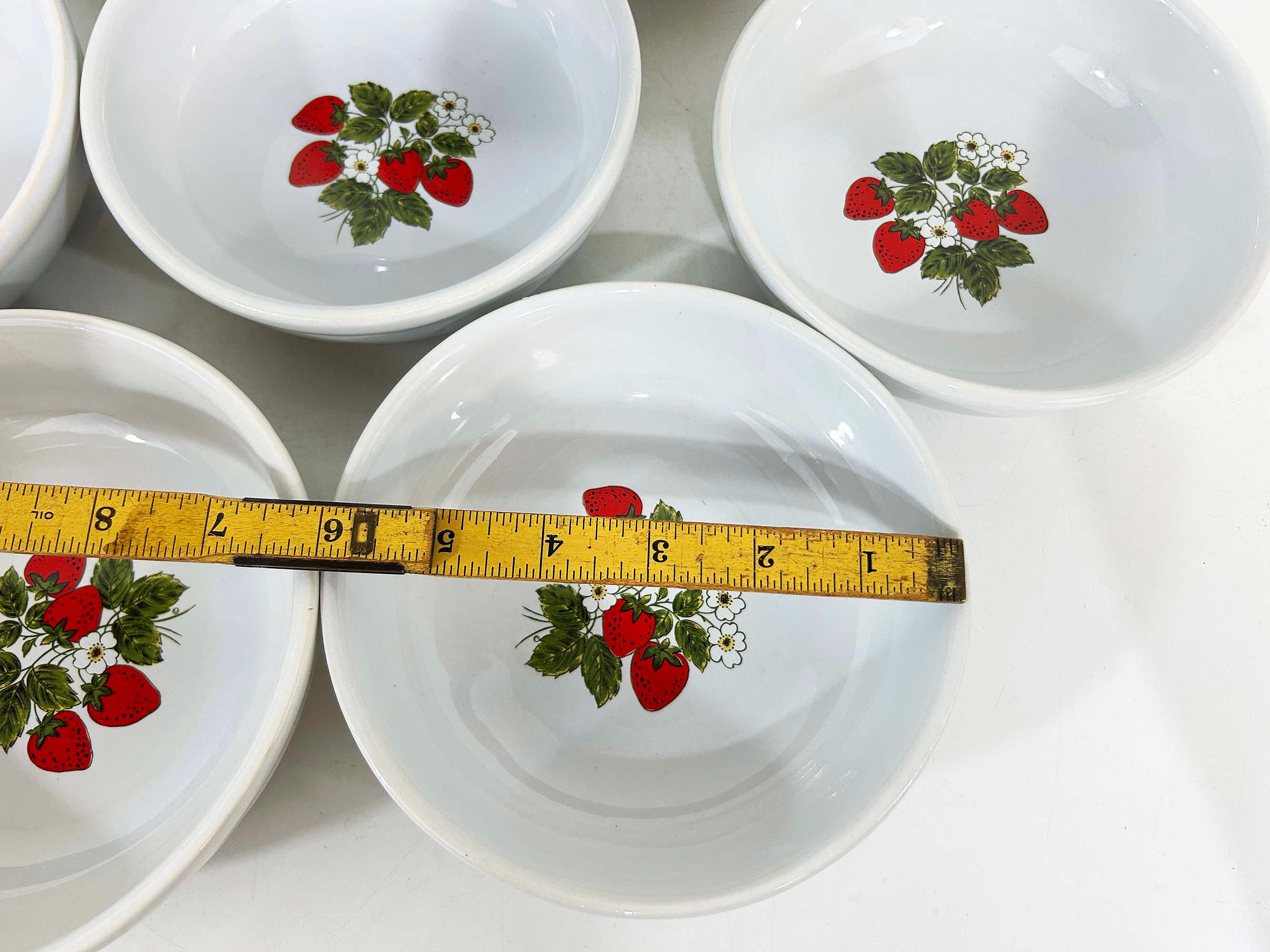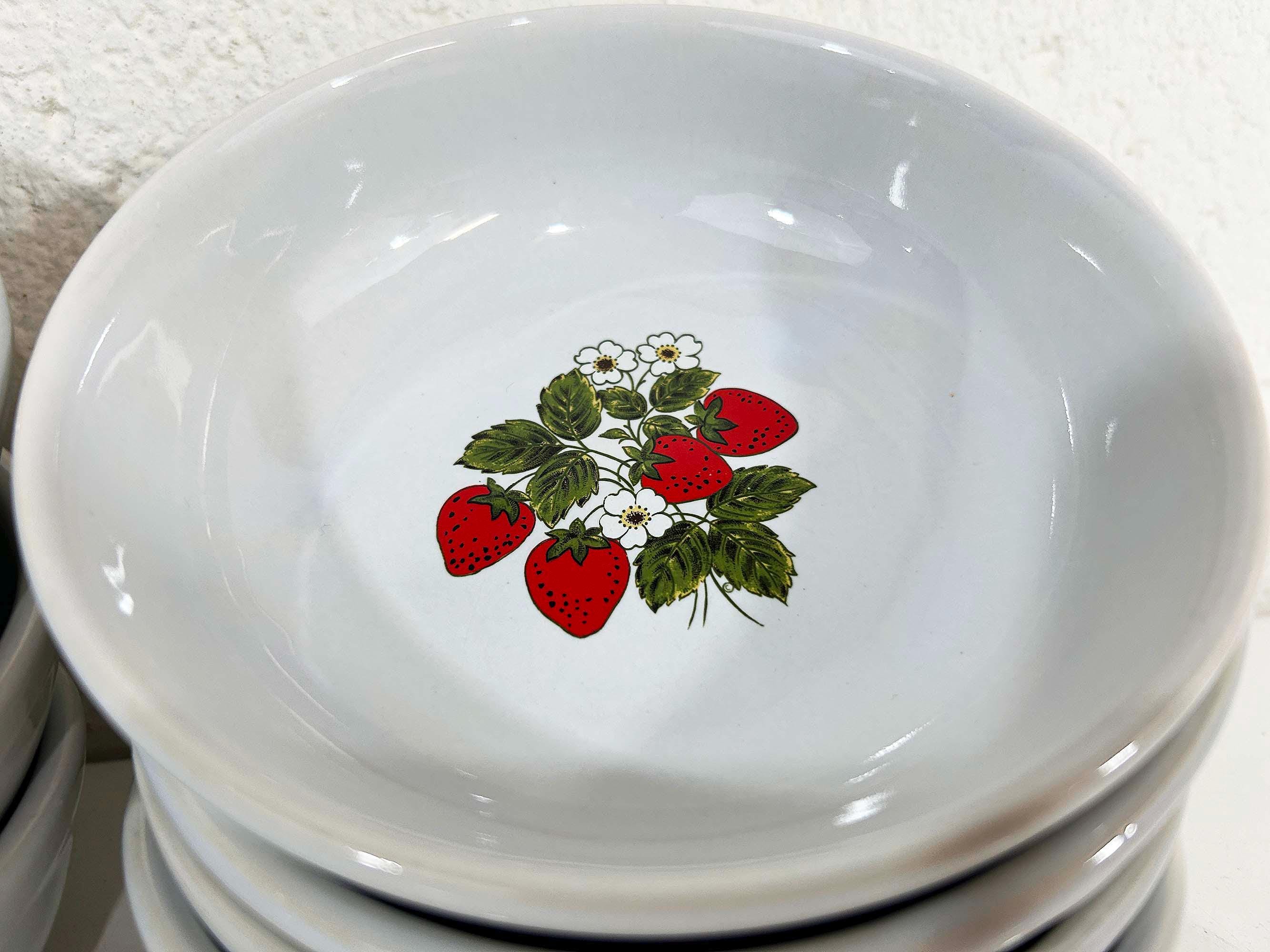 Lovely set of 8 large shallow bowls with a cute strawberry design! These plates are in good condition with no significant wear - please be sure to inspect all photos. They are is approximately 6 inches in diameter and 2 inches tall.
