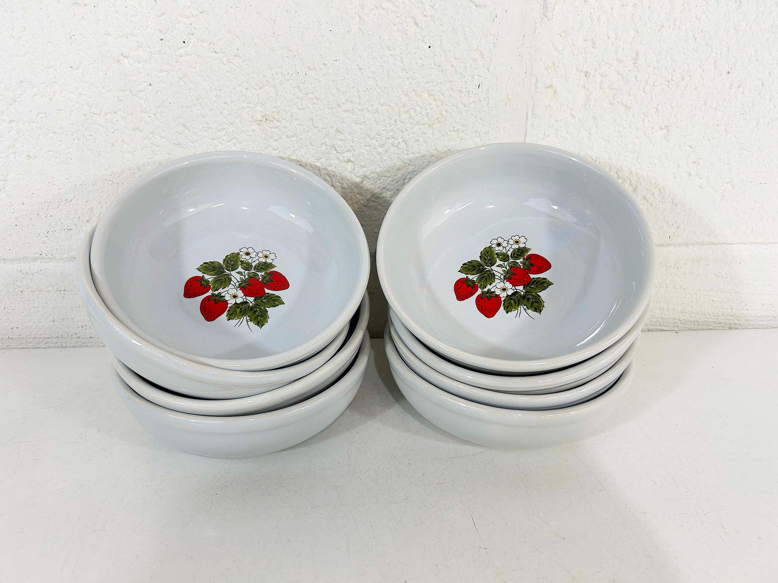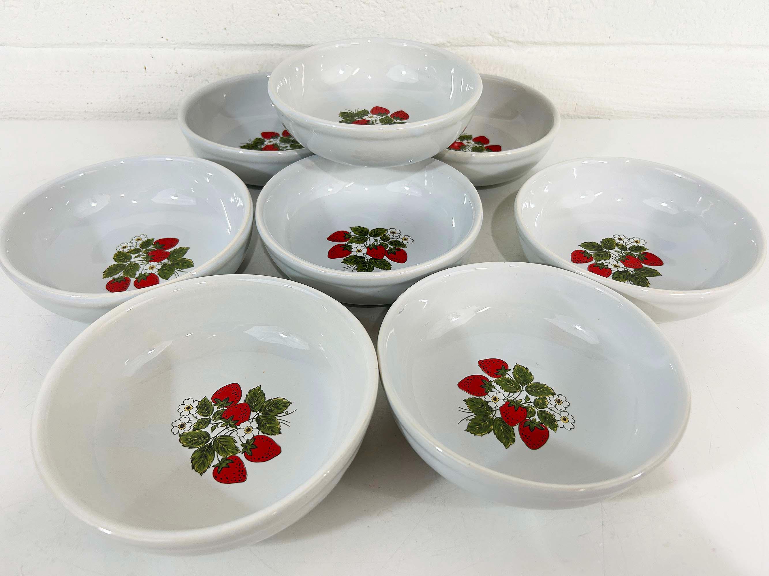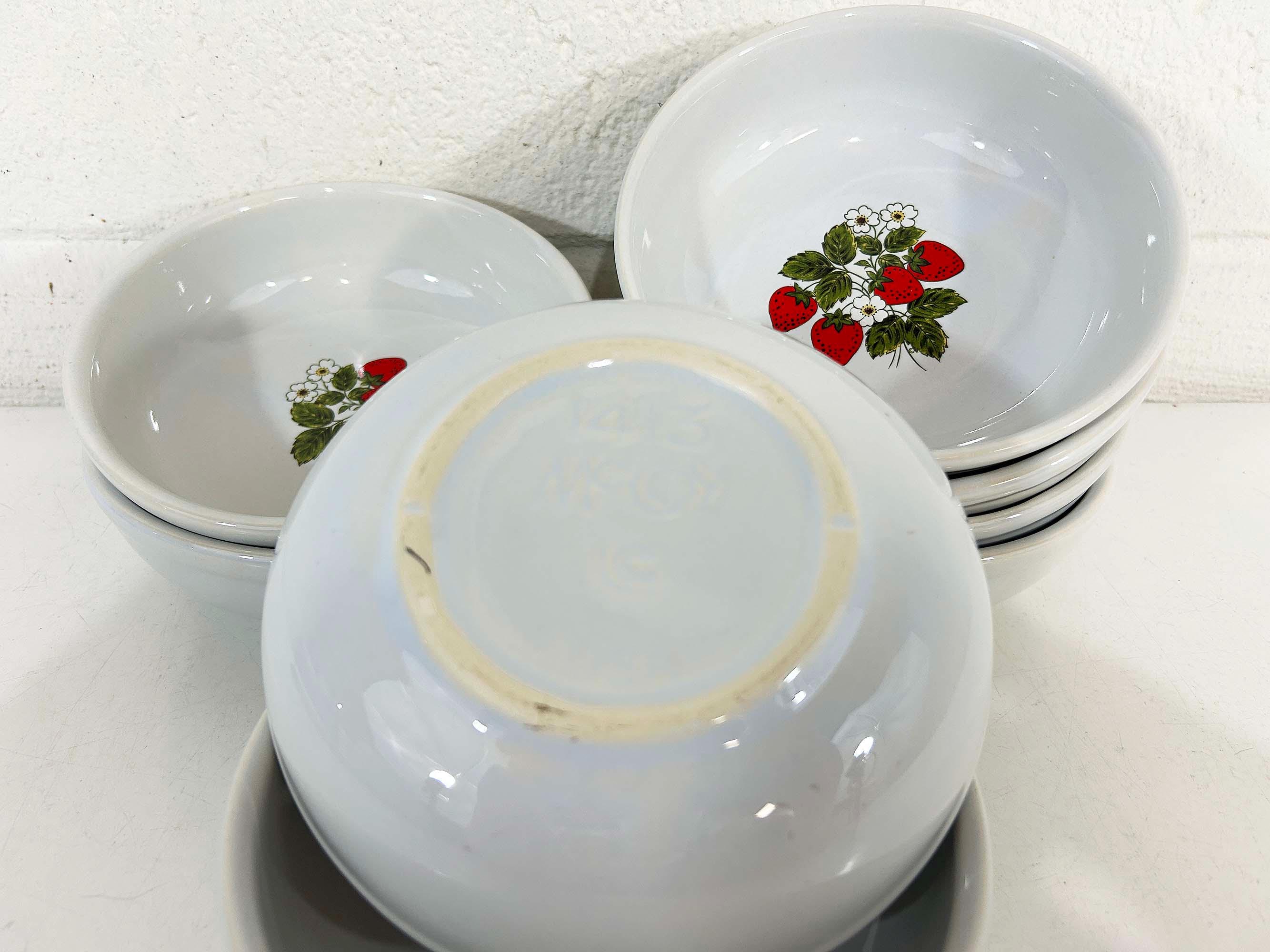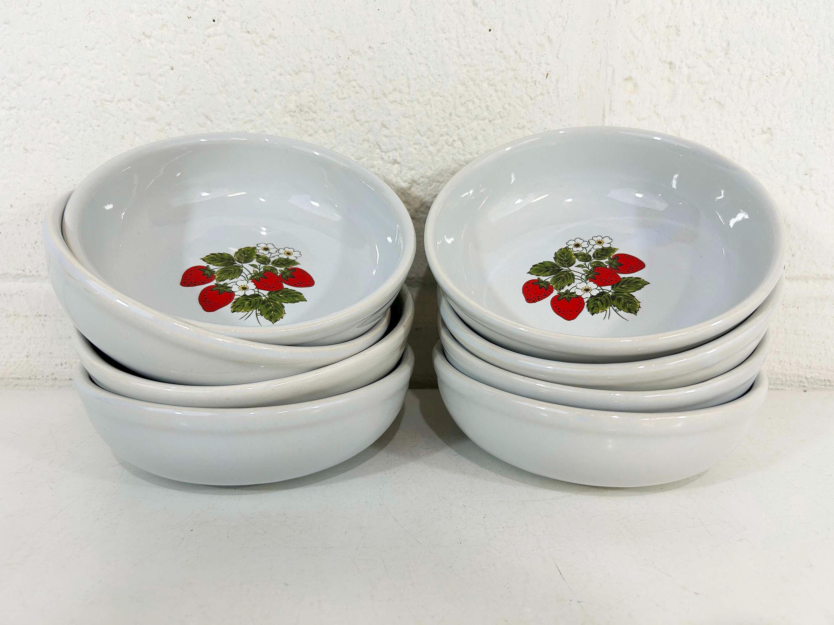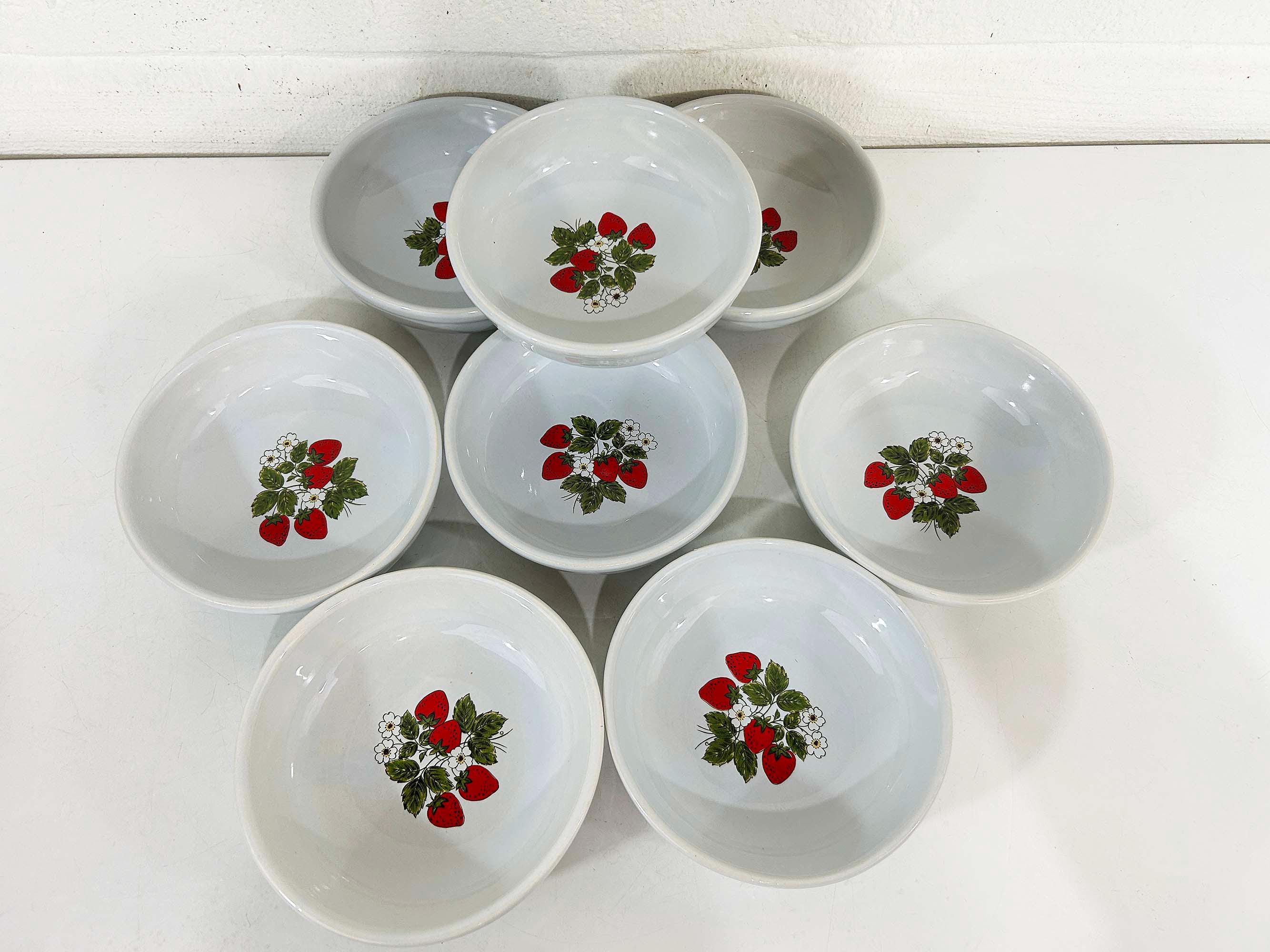 Lovely set of 8 large shallow bowls with a cute strawberry design! These plates are in good condition with no significant wear - please be sure to inspect all photos. They are is approximately 6 inches in diameter and 2 inches tall.