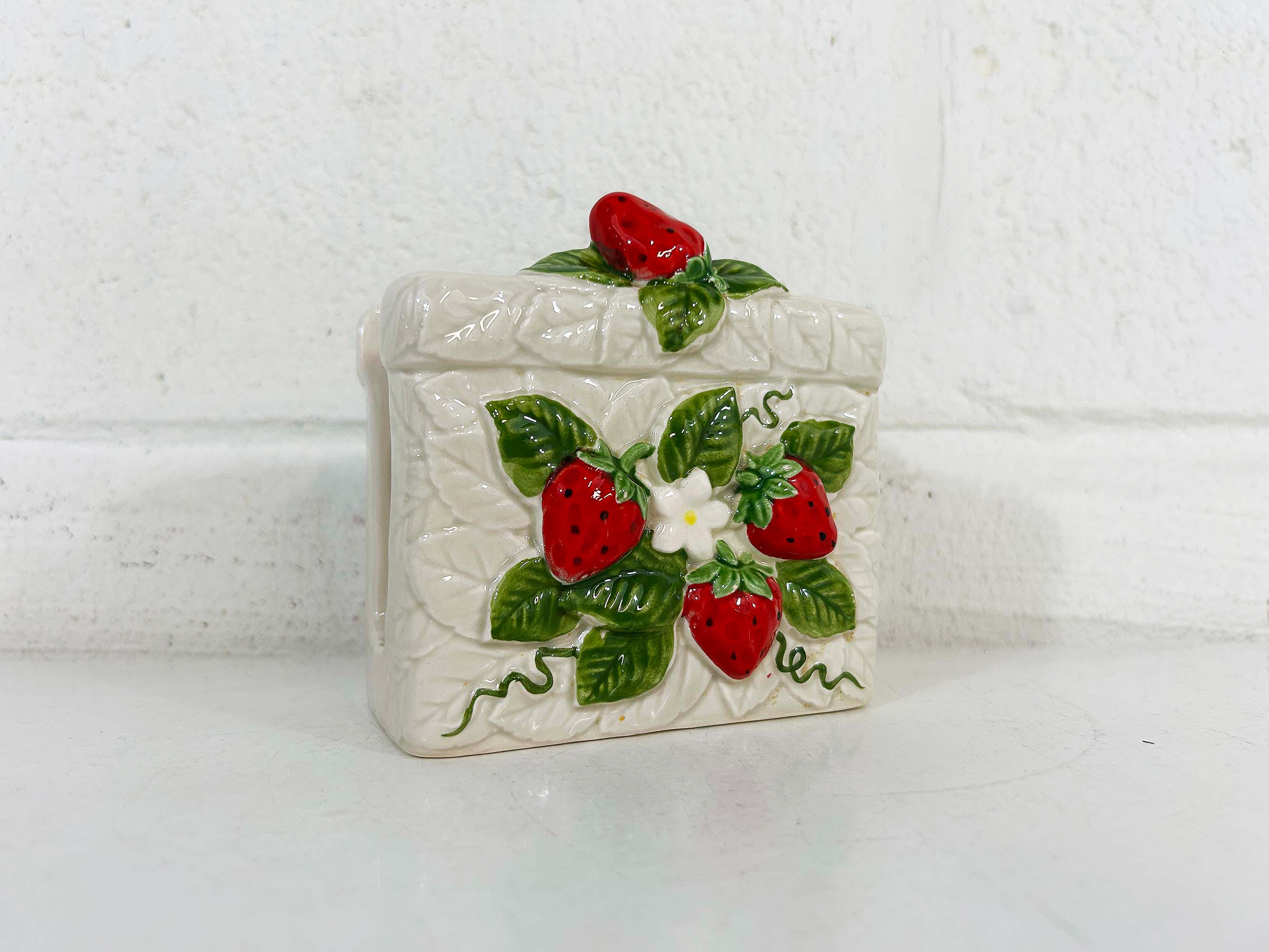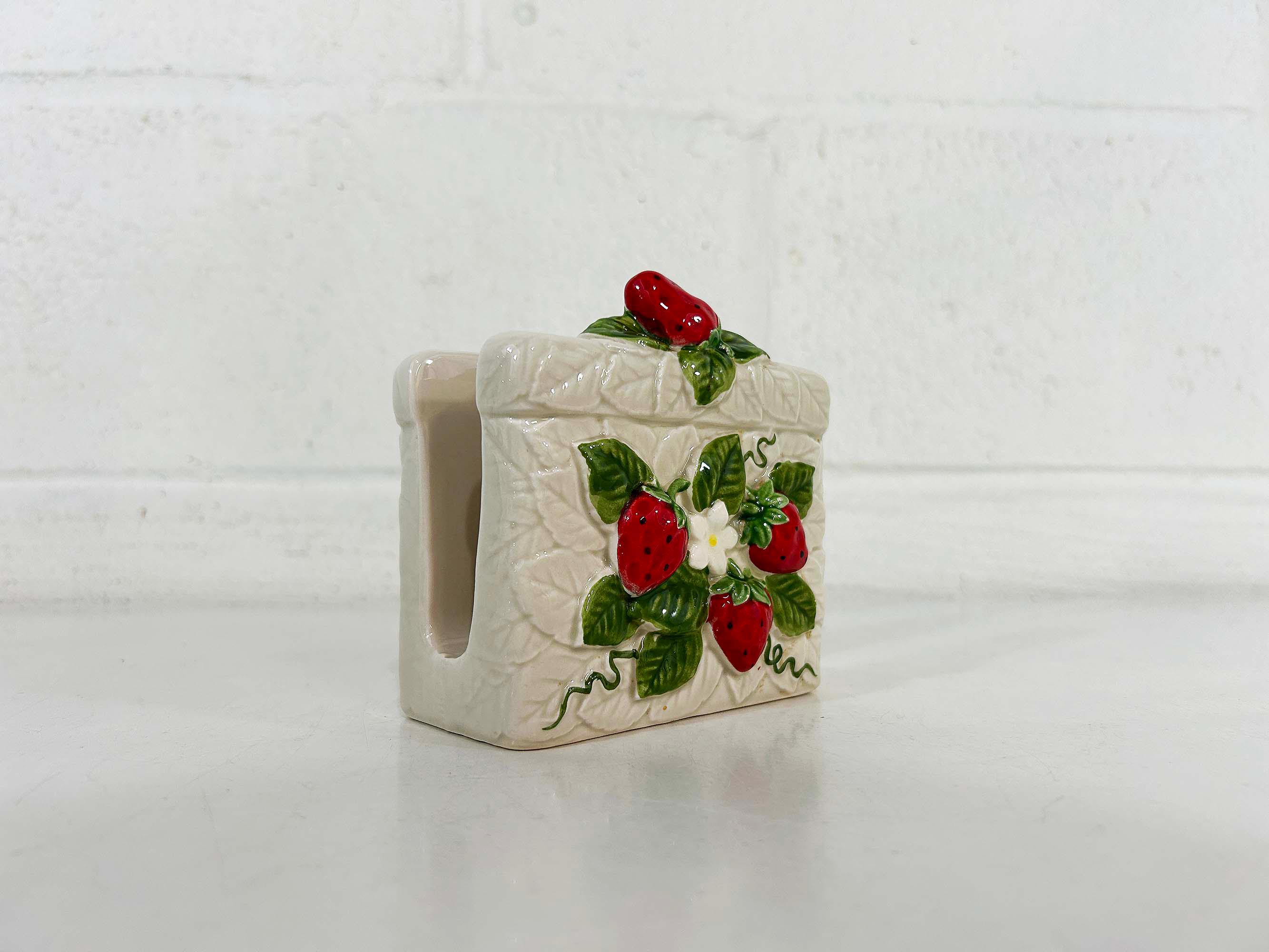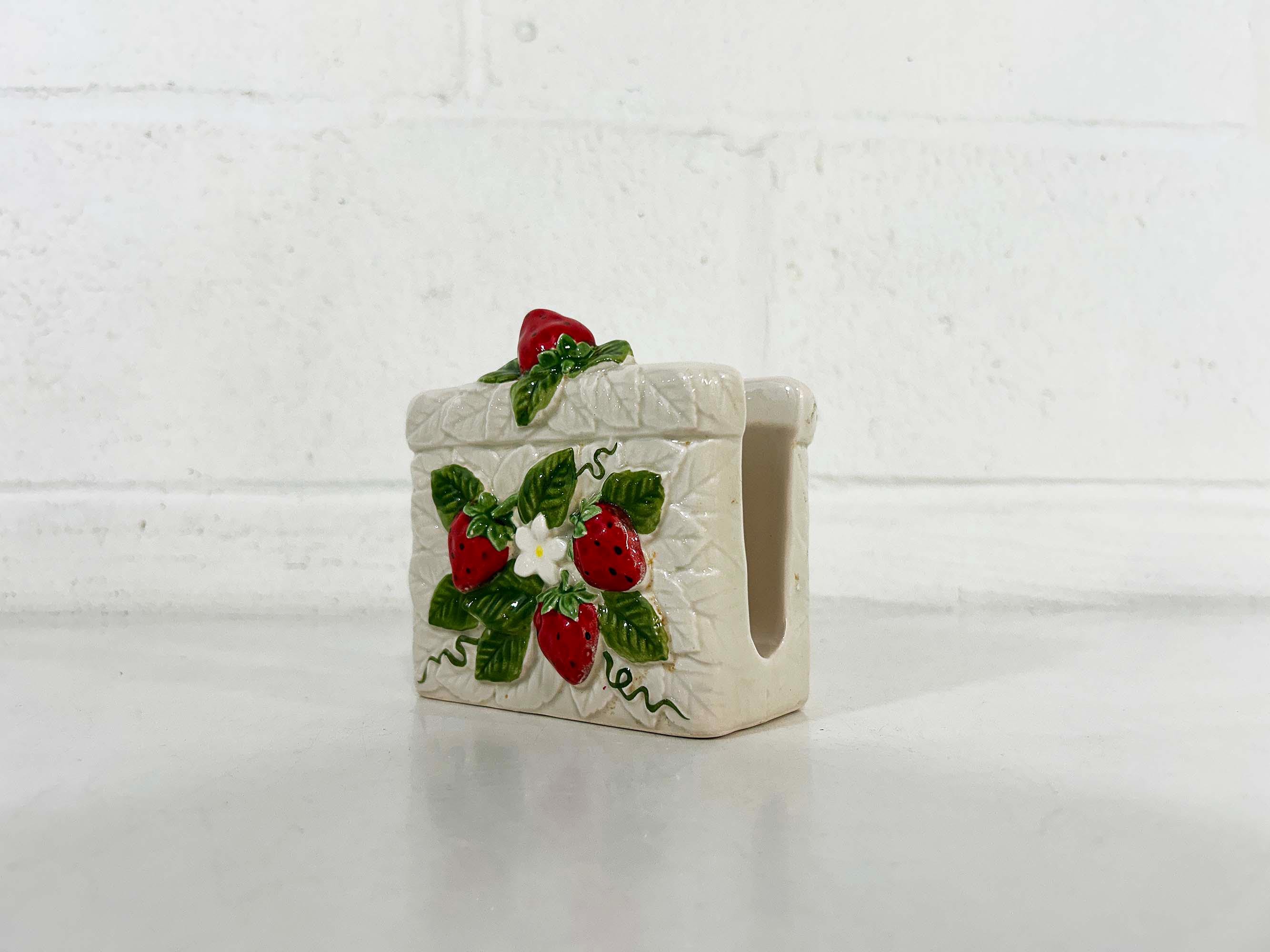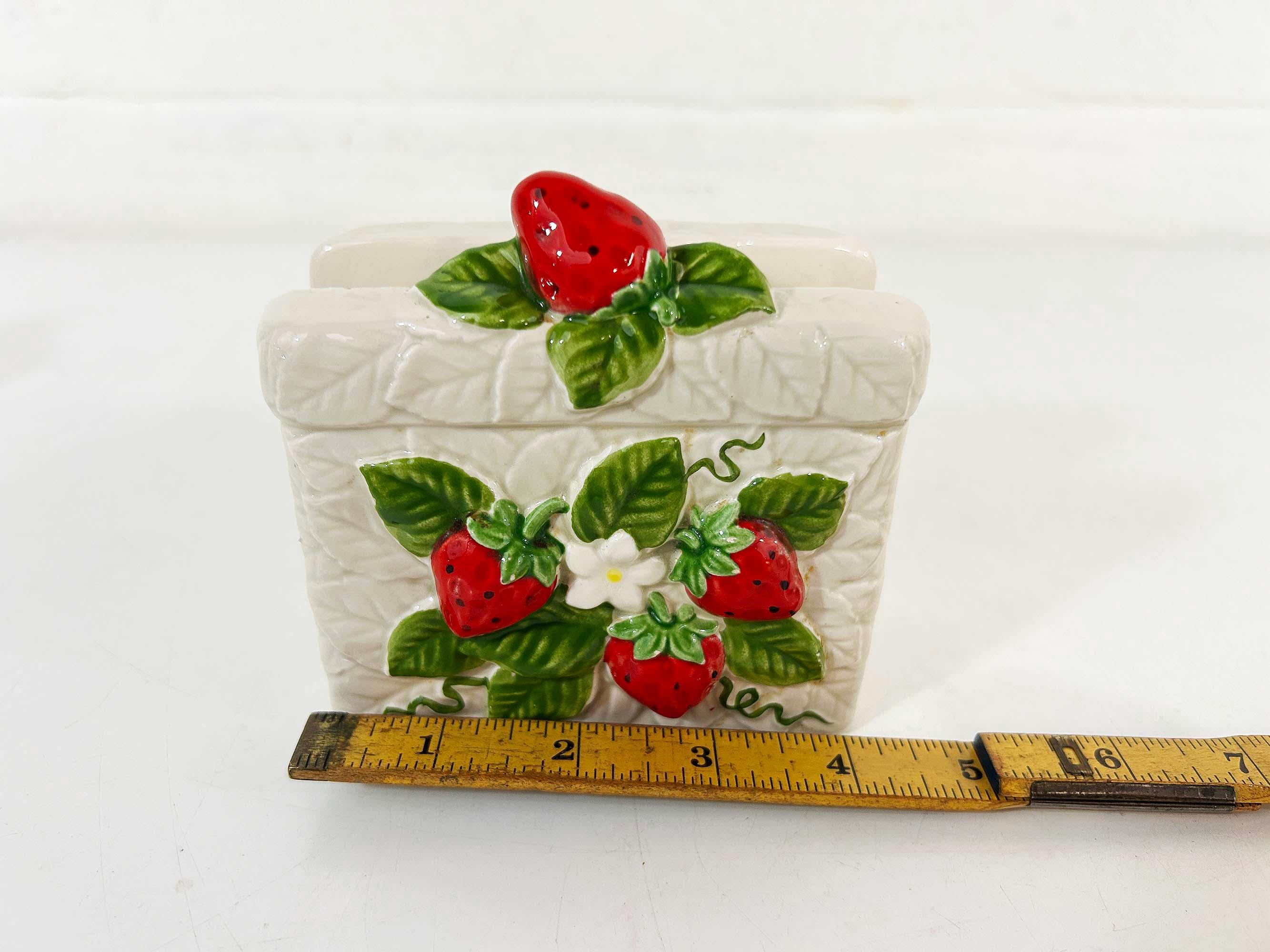 Cute and kitschy strawberry napkin holder! It is in great condition with only a bit of paint loss and discoloration from age and wear. Perfect for your vintage kitchen! The holder is approximately 3 1/2 inches tall, 2 1/4 inches deep, and 4 inches wide.