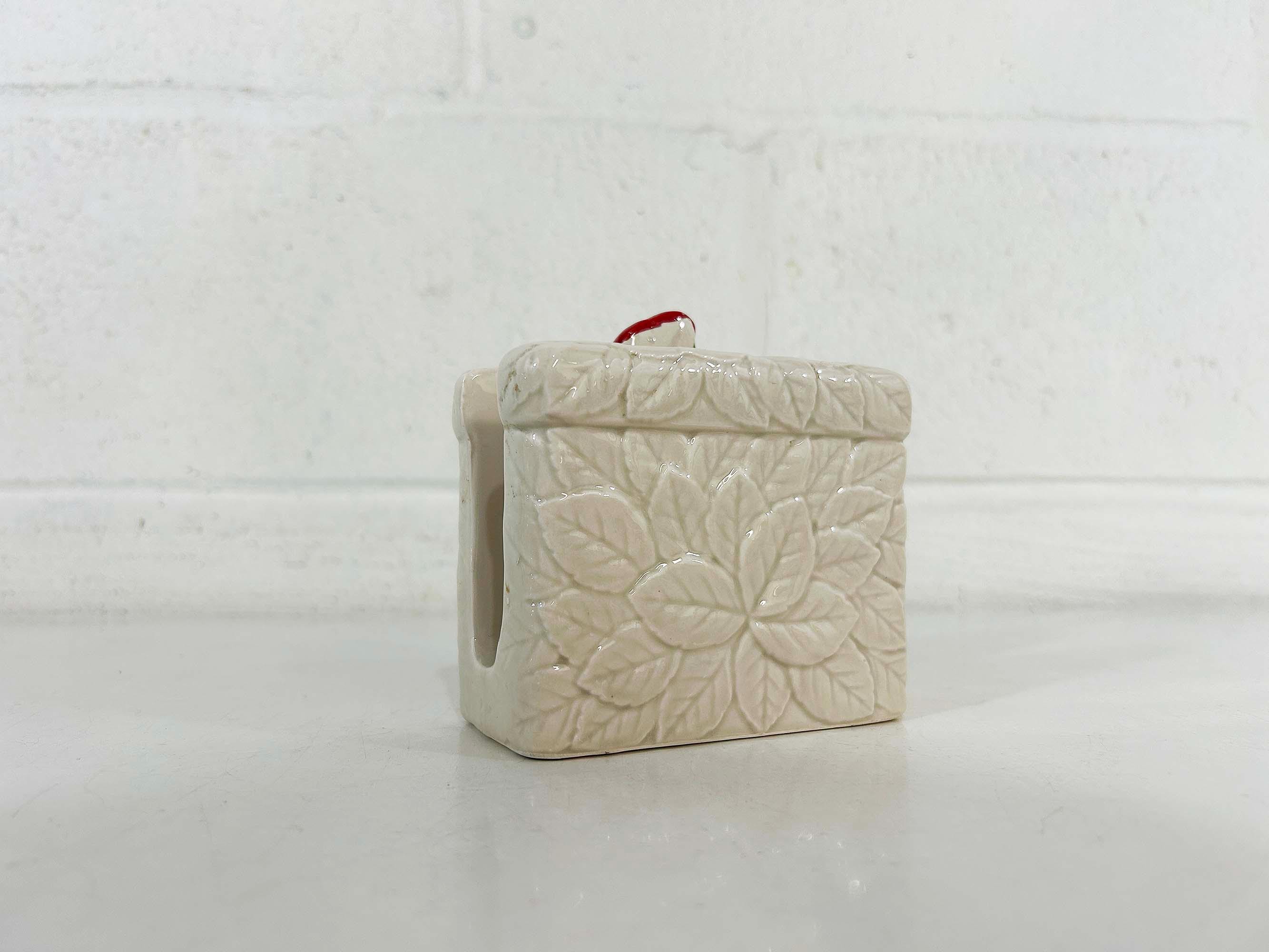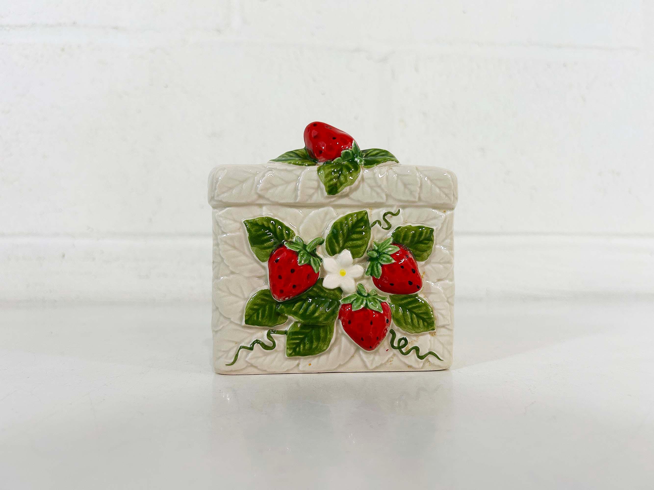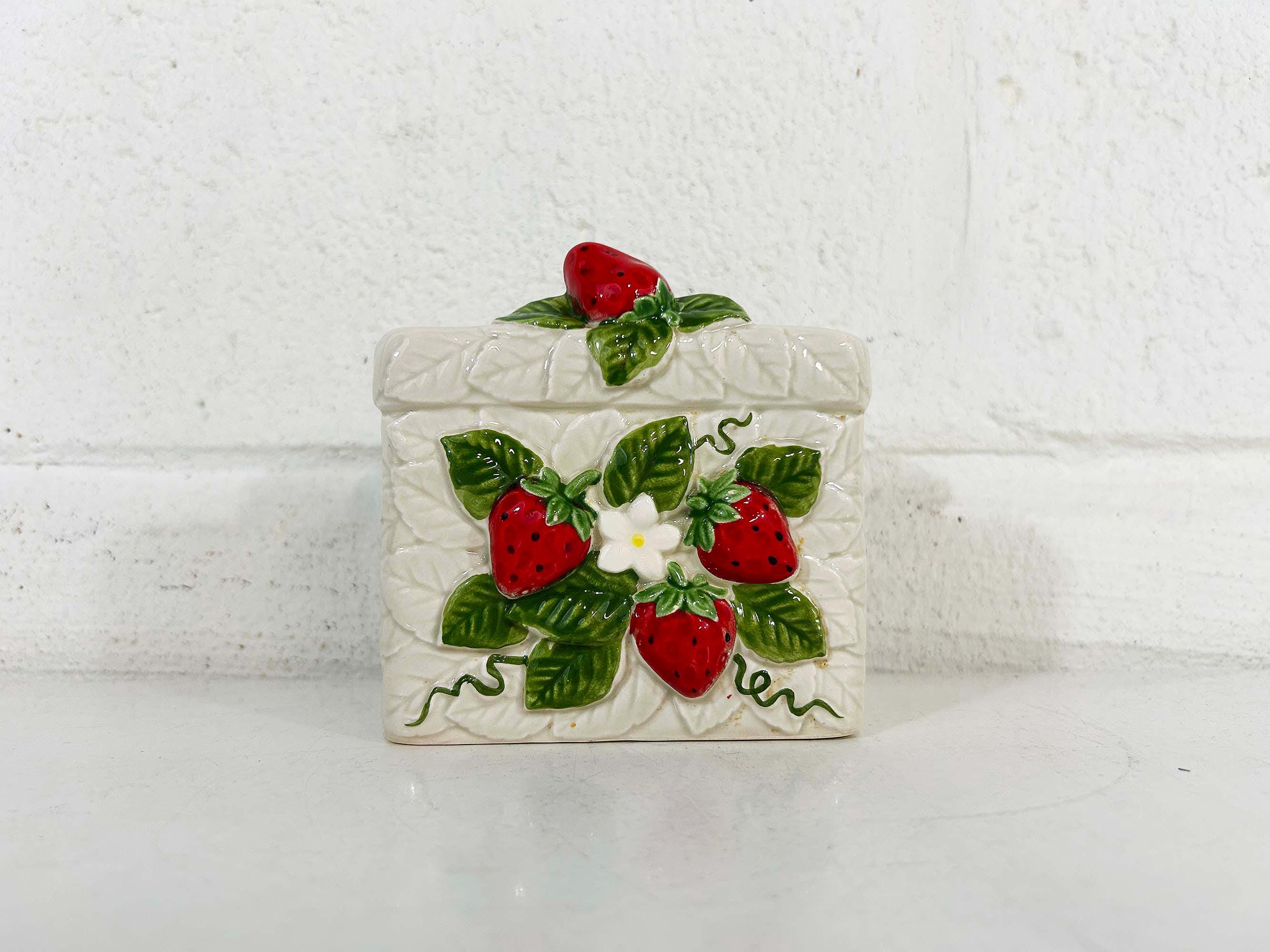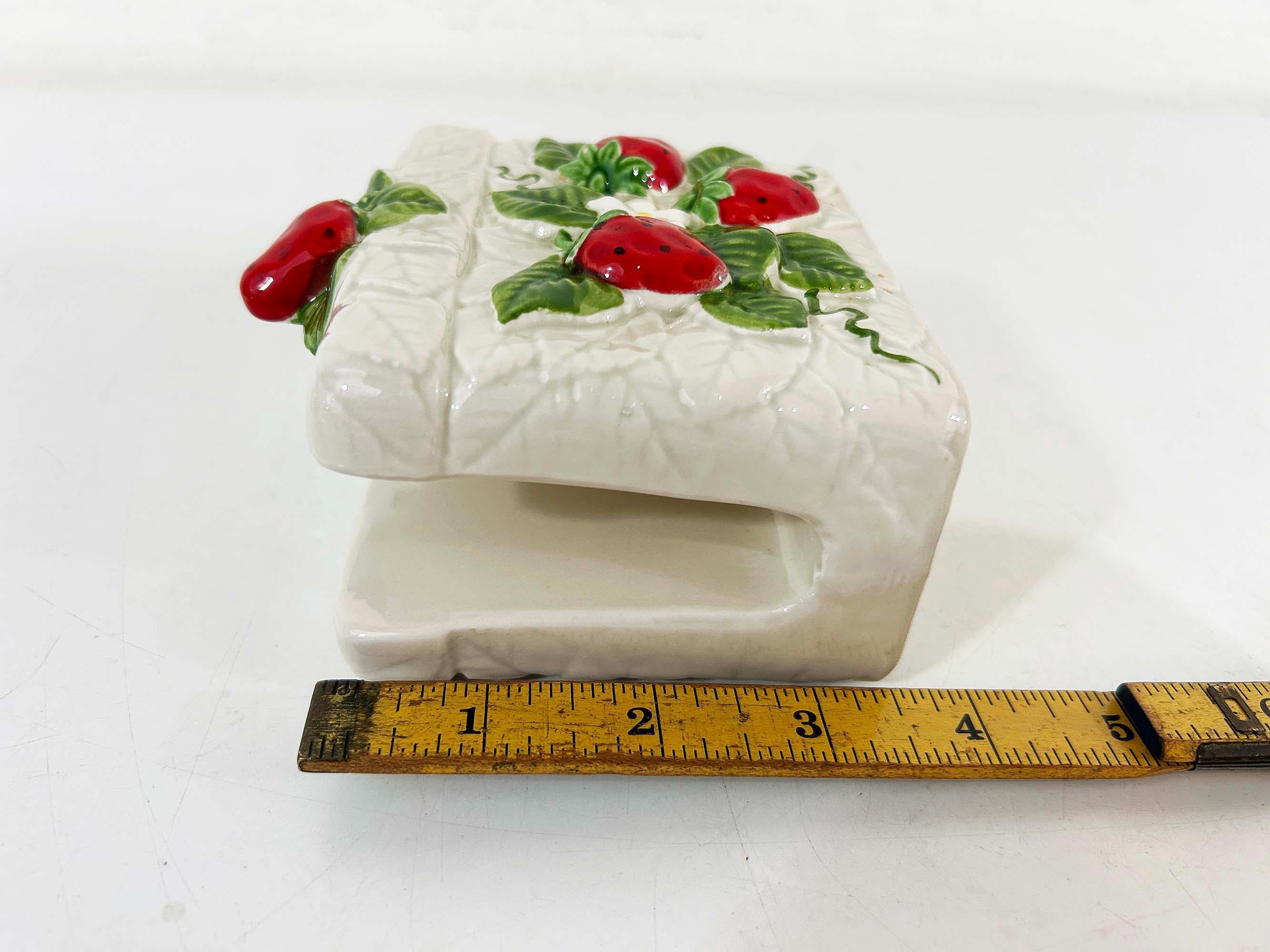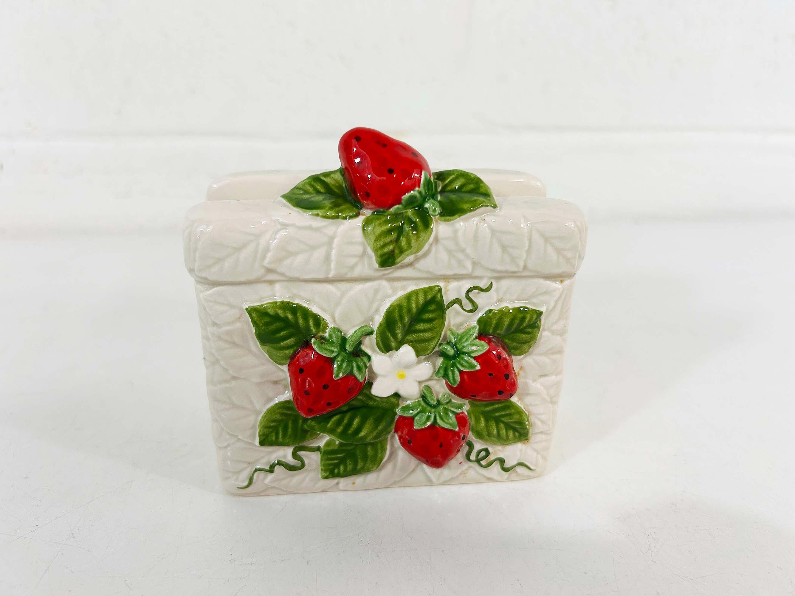 Cute and kitschy strawberry napkin holder! It is in great condition with only a bit of paint loss and discoloration from age and wear. Perfect for your vintage kitchen! The holder is approximately 3 1/2 inches tall, 2 1/4 inches deep, and 4 inches wide.