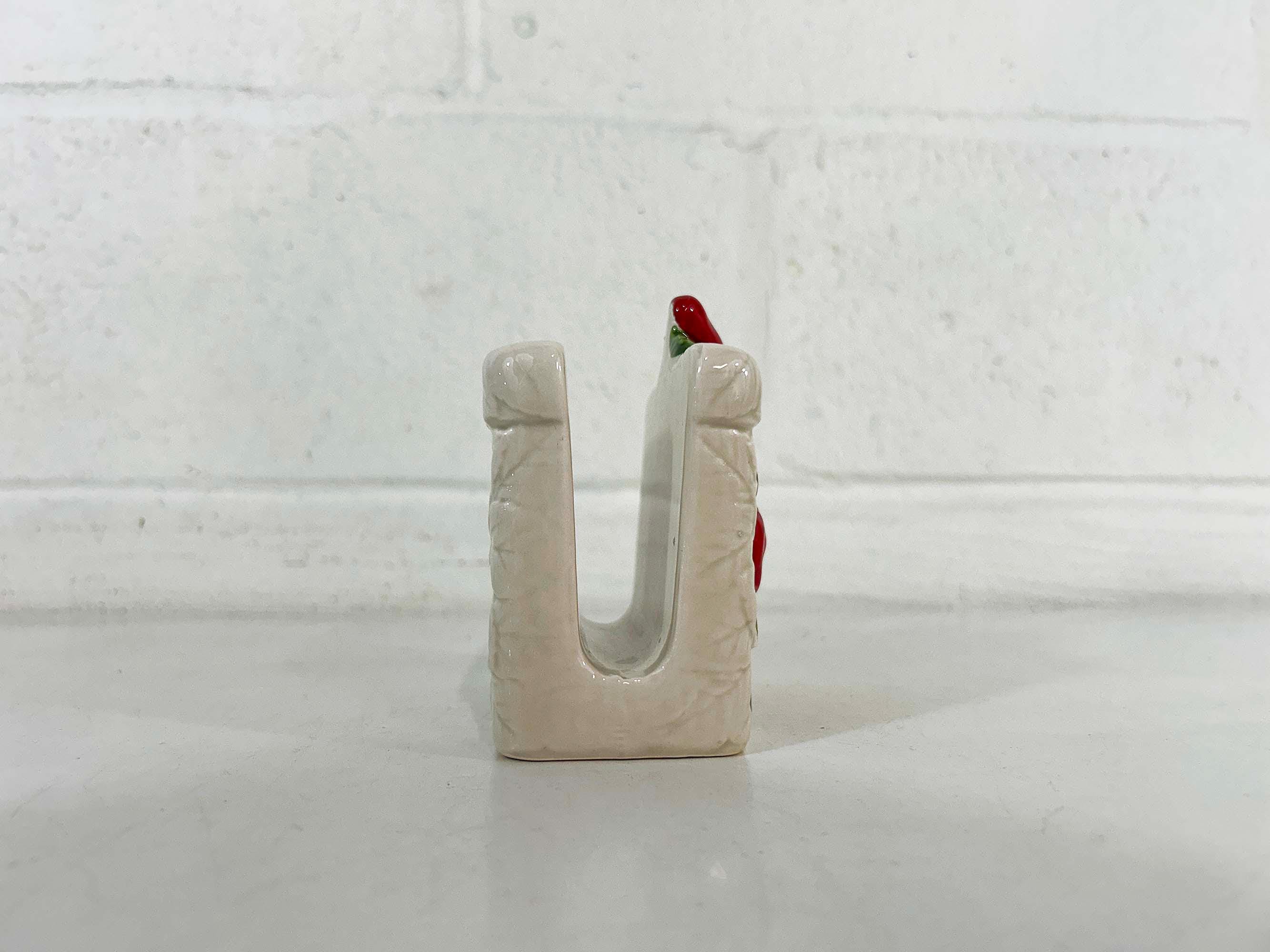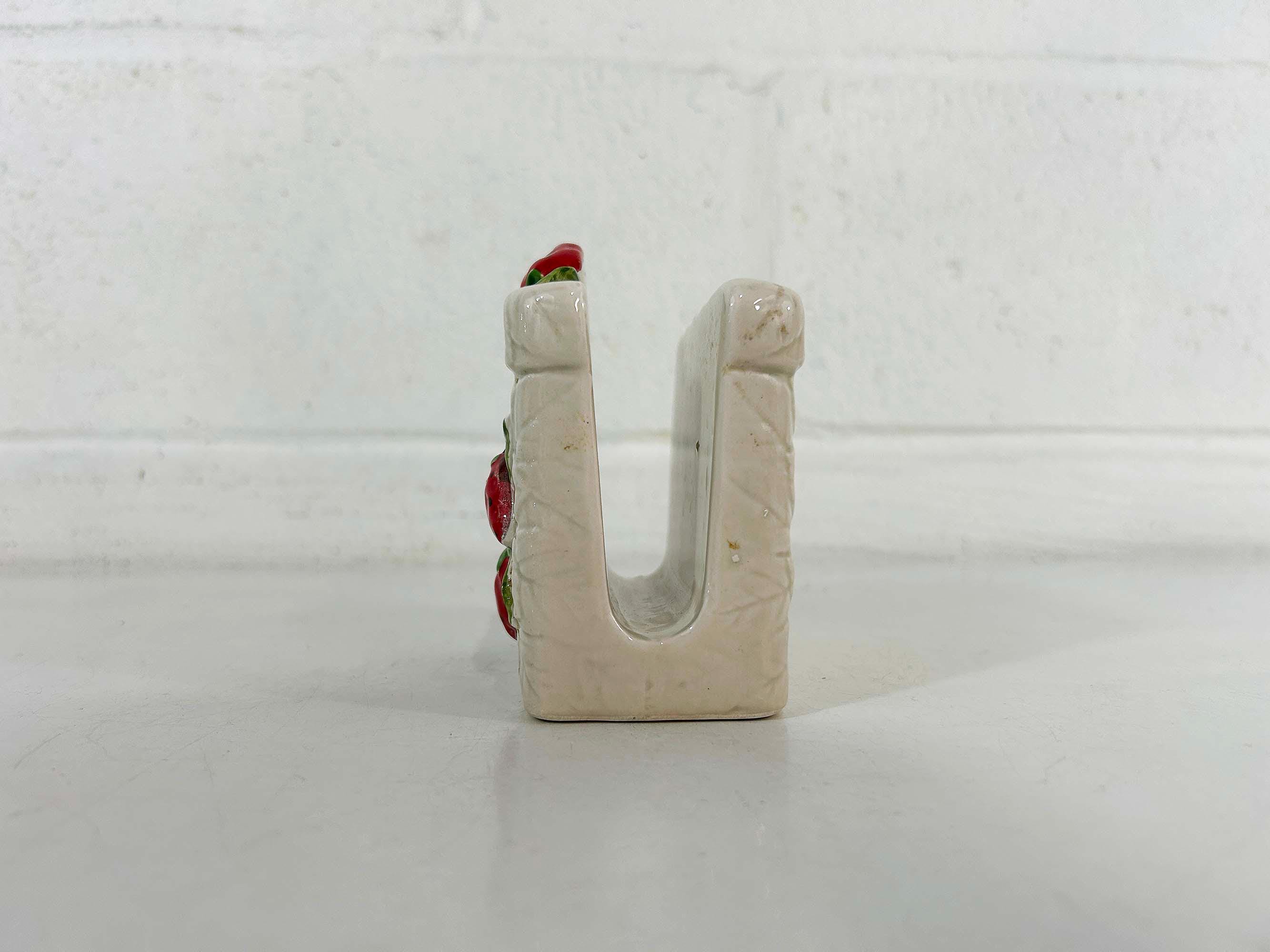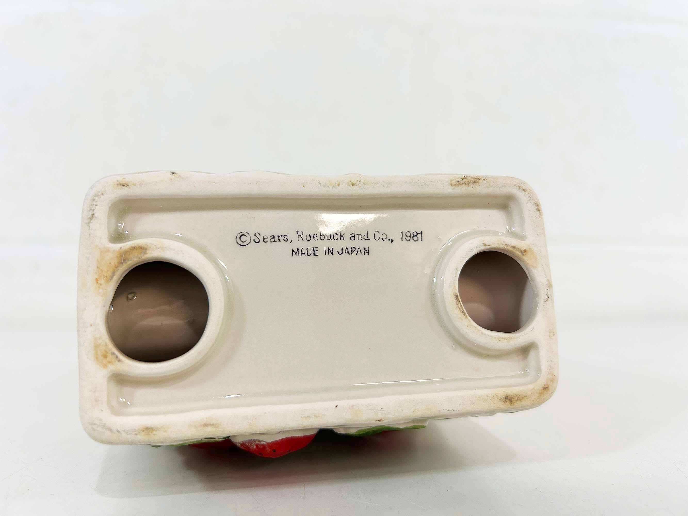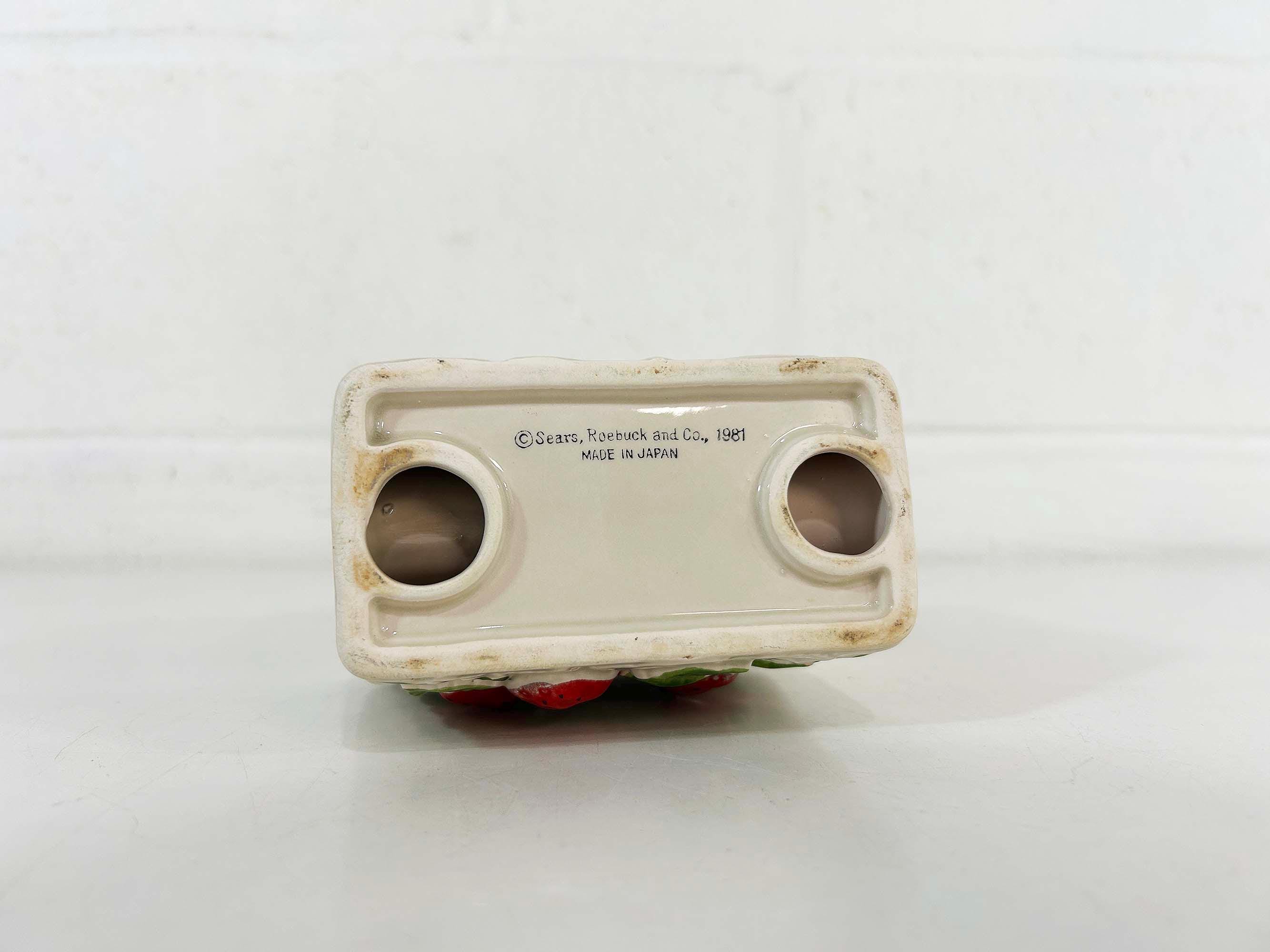 Cute and kitschy strawberry napkin holder! It is in great condition with only a bit of paint loss and discoloration from age and wear. Perfect for your vintage kitchen! The holder is approximately 3 1/2 inches tall, 2 1/4 inches deep, and 4 inches wide.