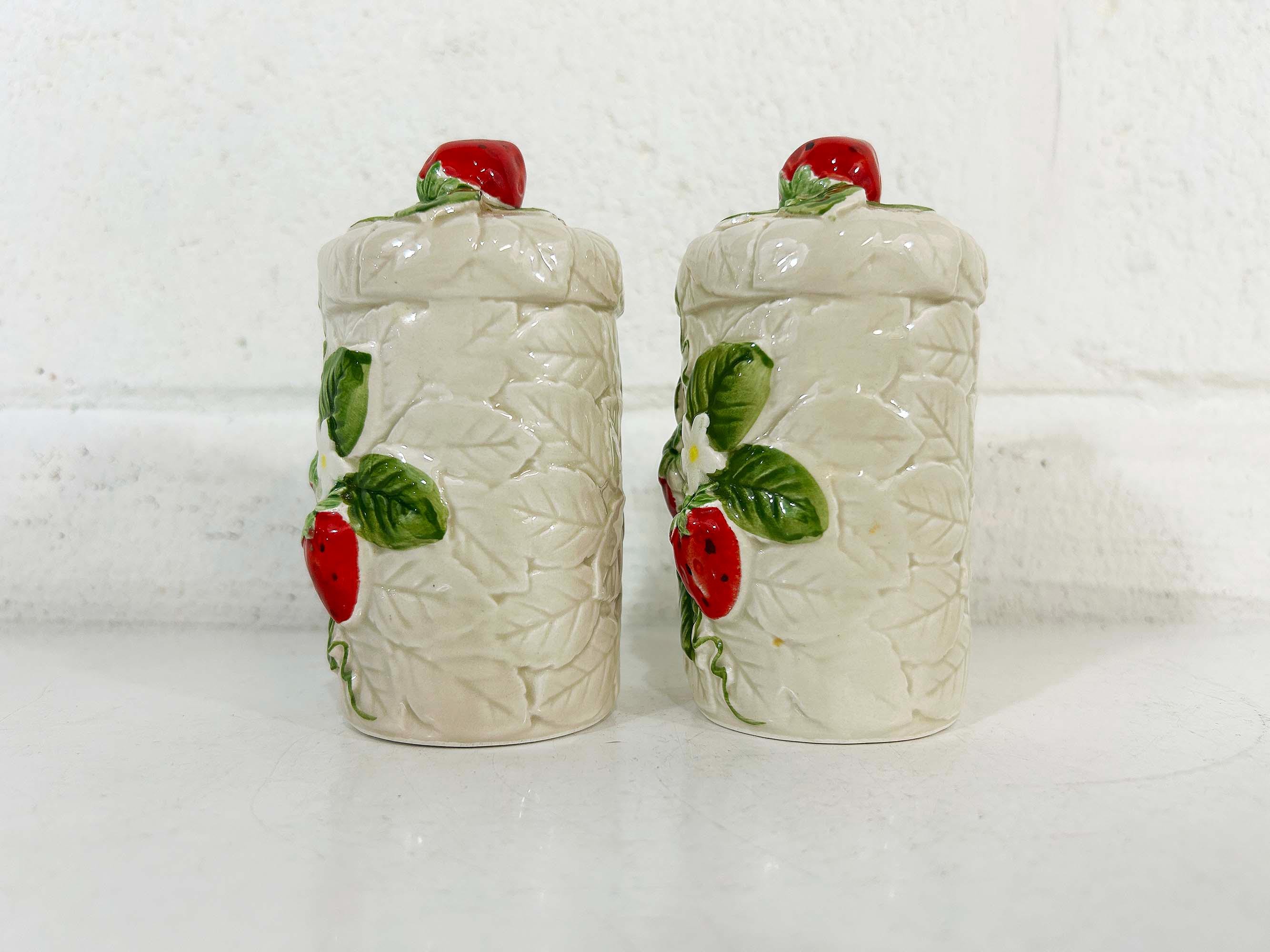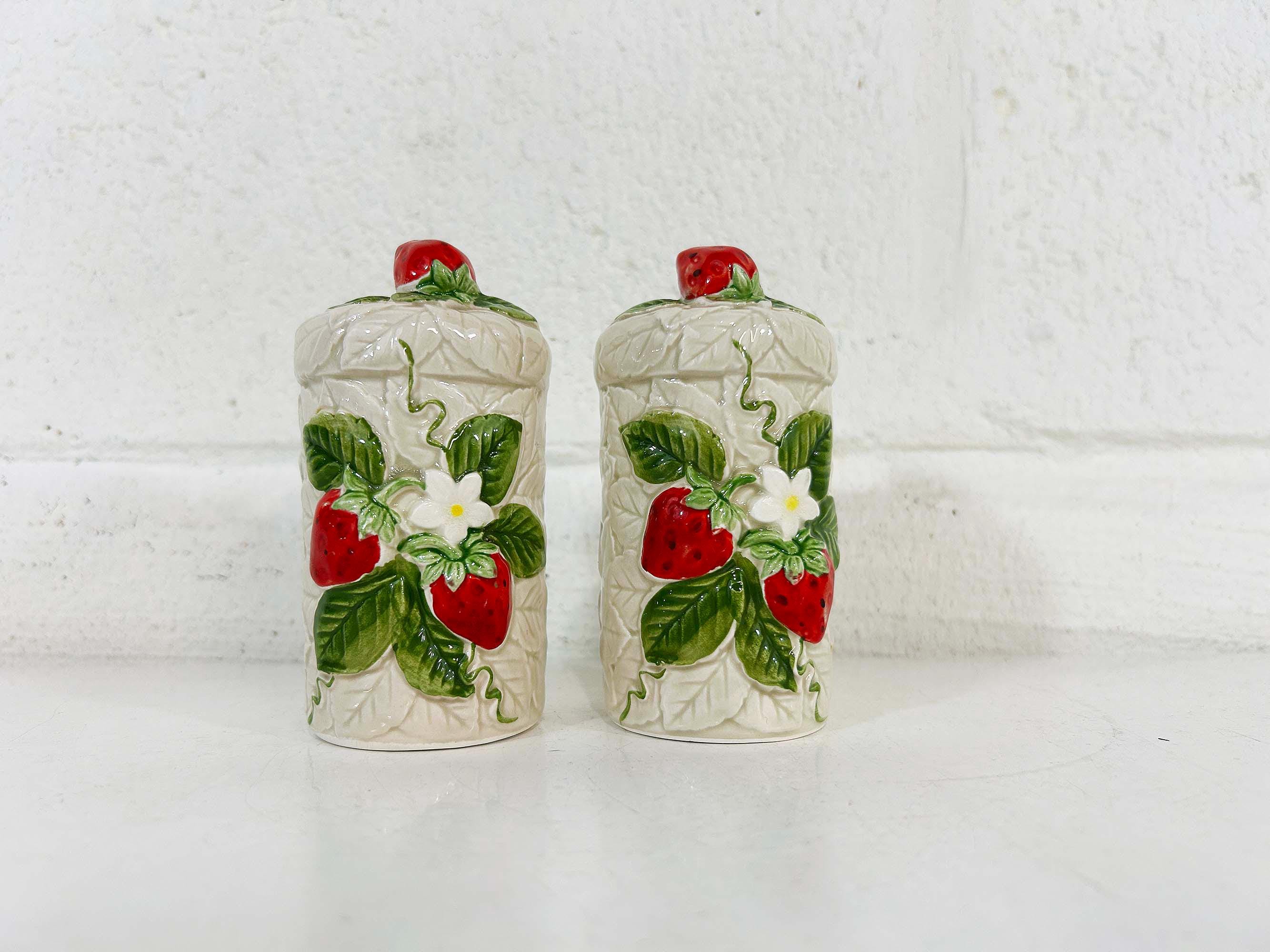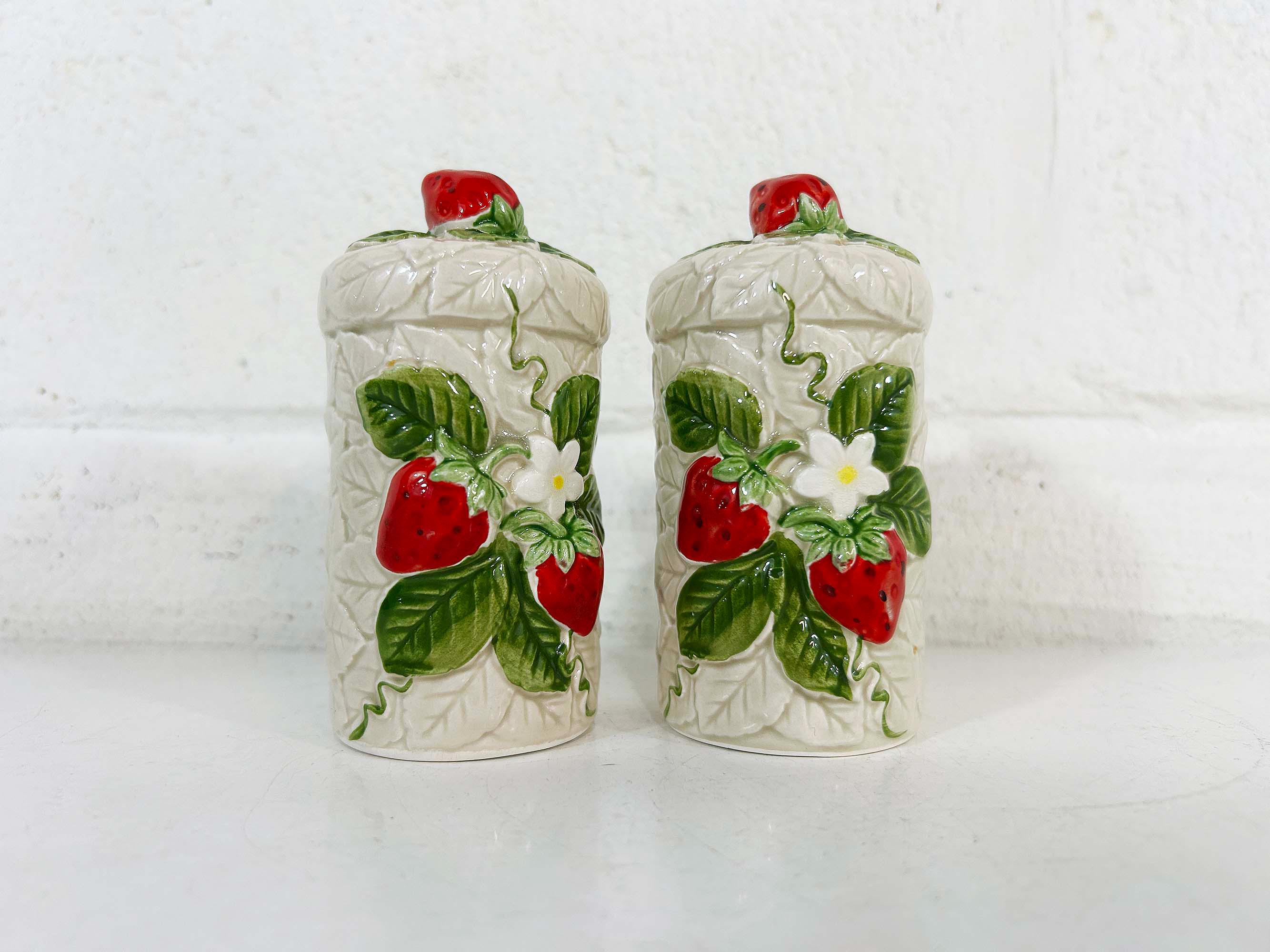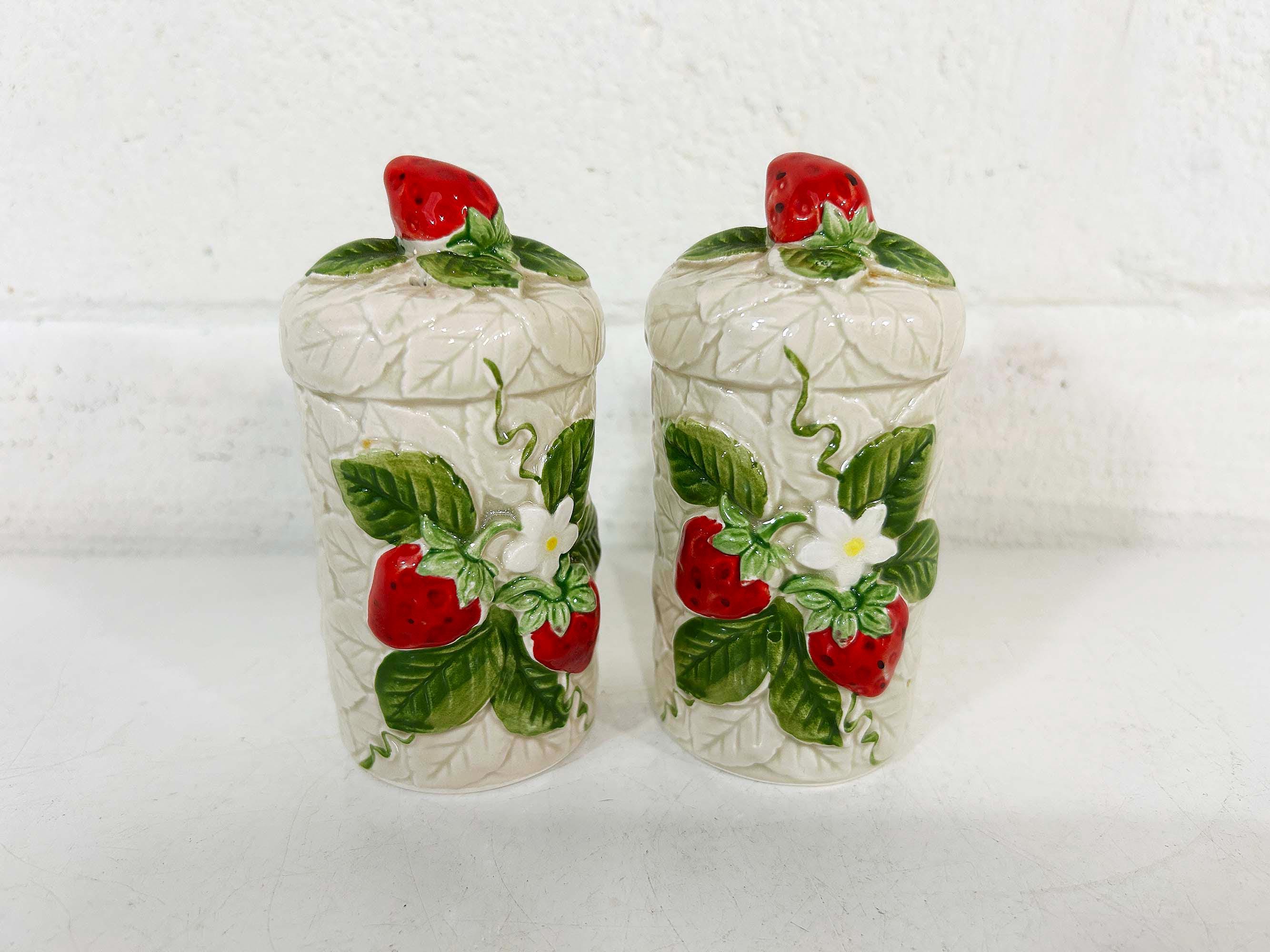 Cute and kitschy strawberry salt and pepper shakers! They are in great condition with only a bit of paint loss and still include their plastic stoppers. Perfect for your vintage kitchen! The shakers are approximately 4 1/2 inches tall and 2 inches in diameter.