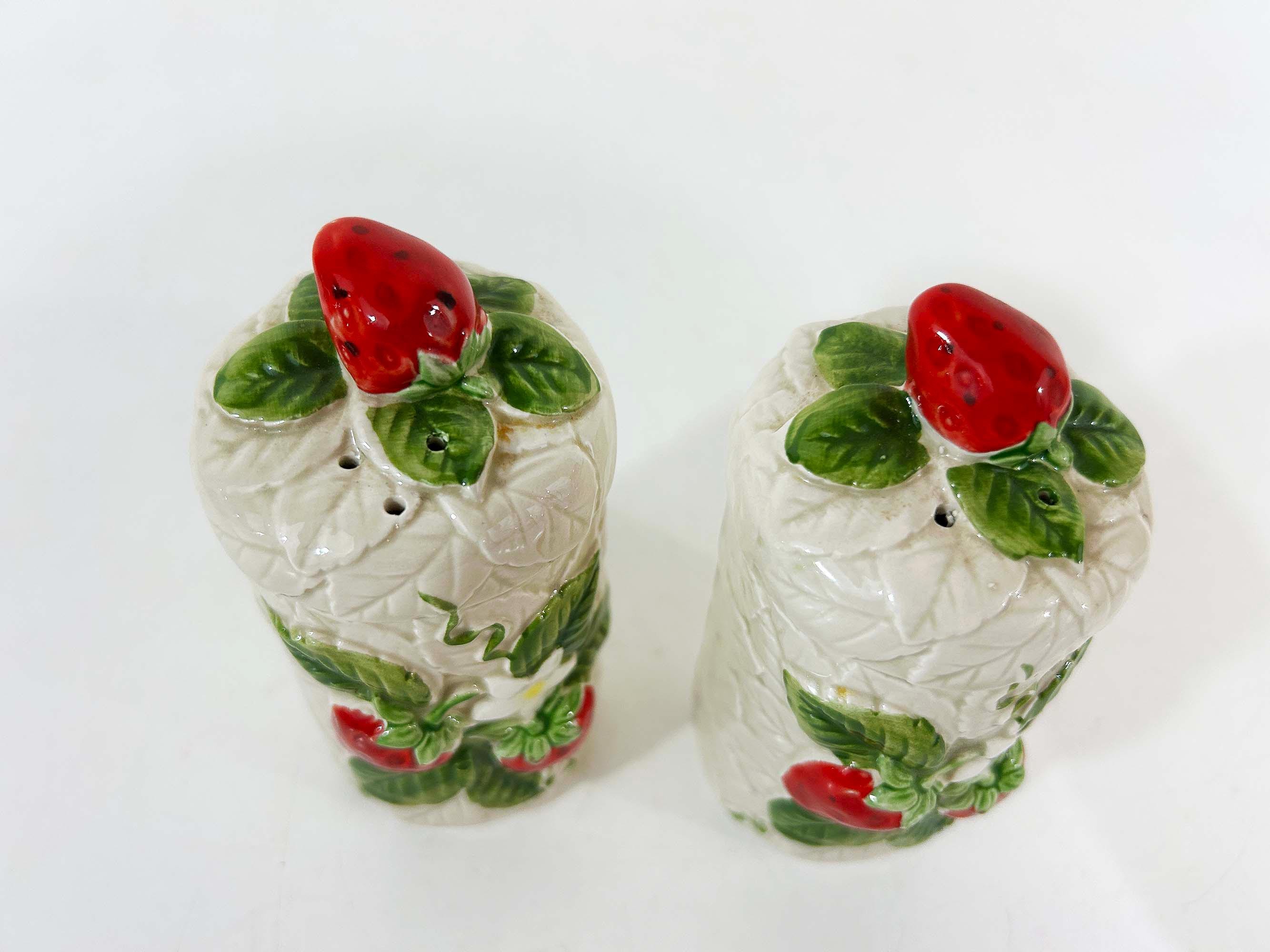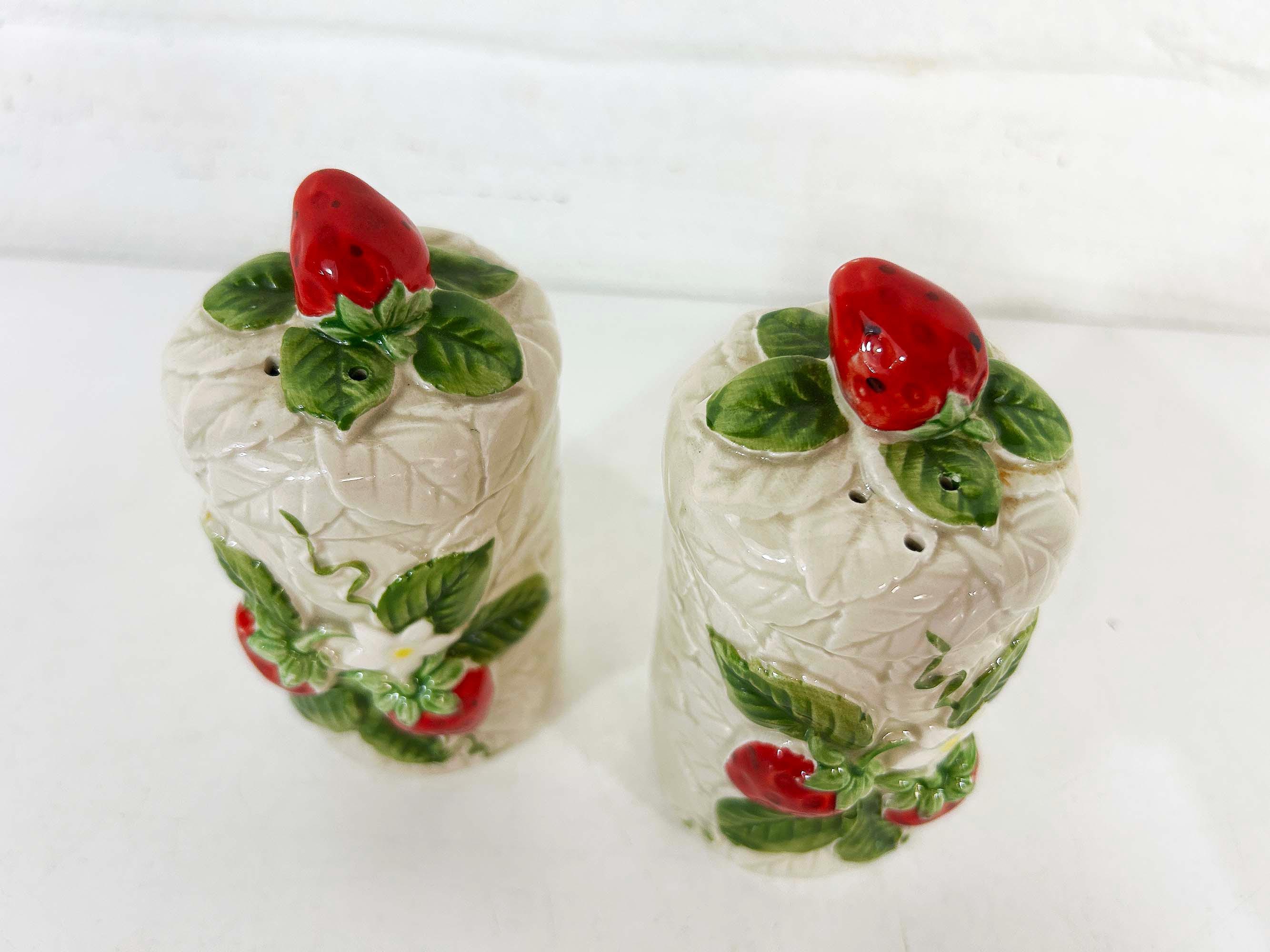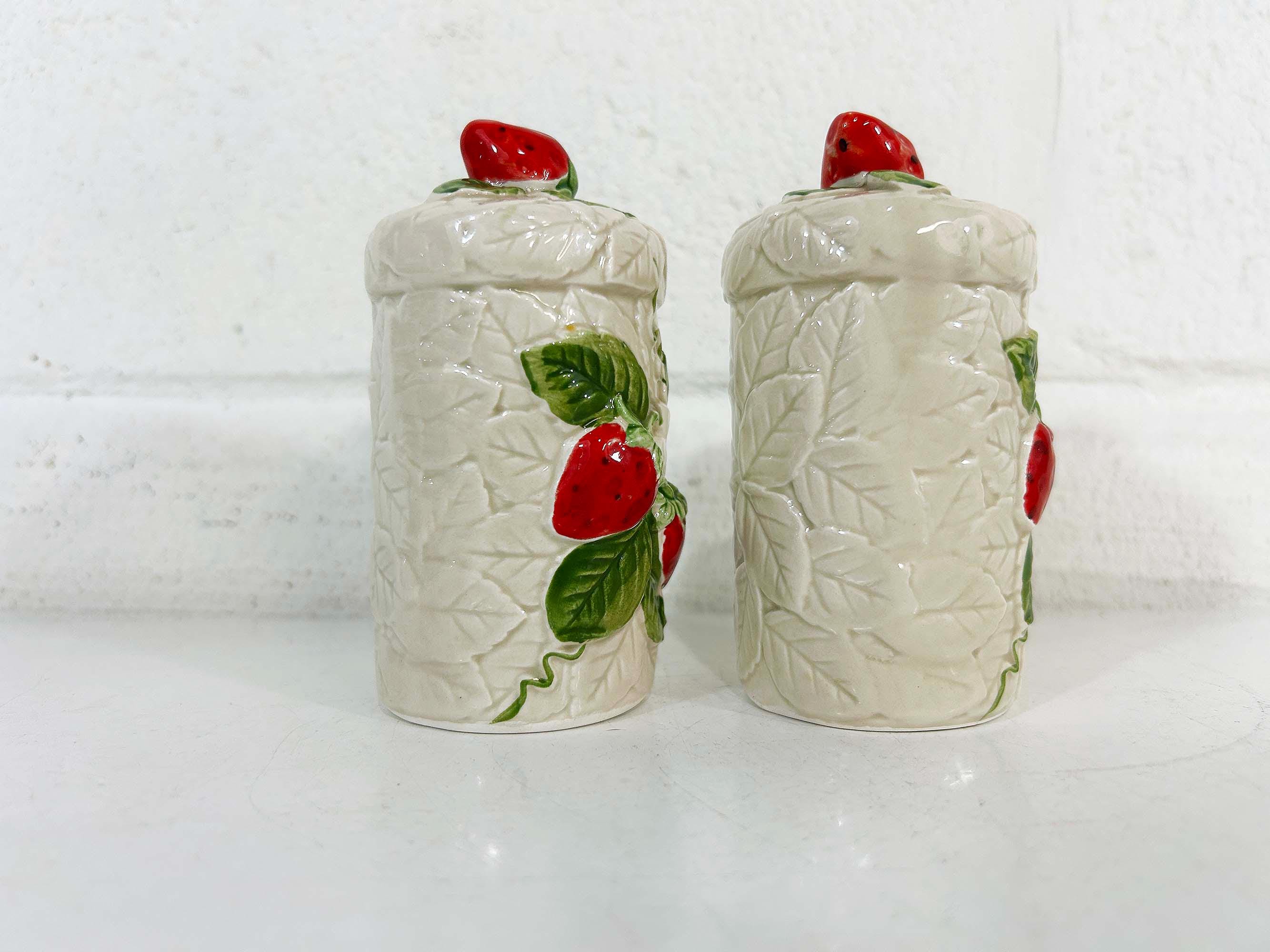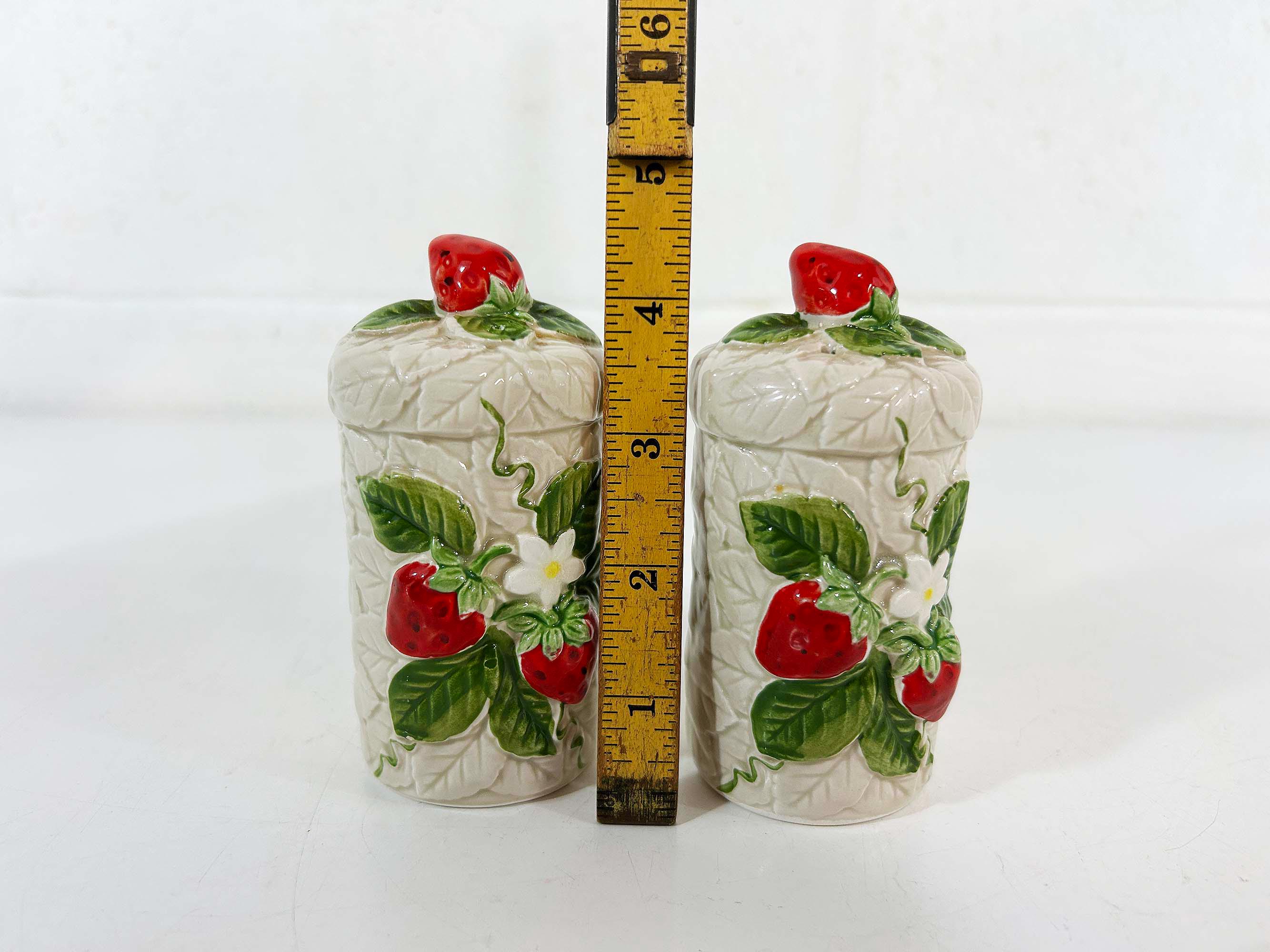 Cute and kitschy strawberry salt and pepper shakers! They are in great condition with only a bit of paint loss and still include their plastic stoppers. Perfect for your vintage kitchen! The shakers are approximately 4 1/2 inches tall and 2 inches in diameter.