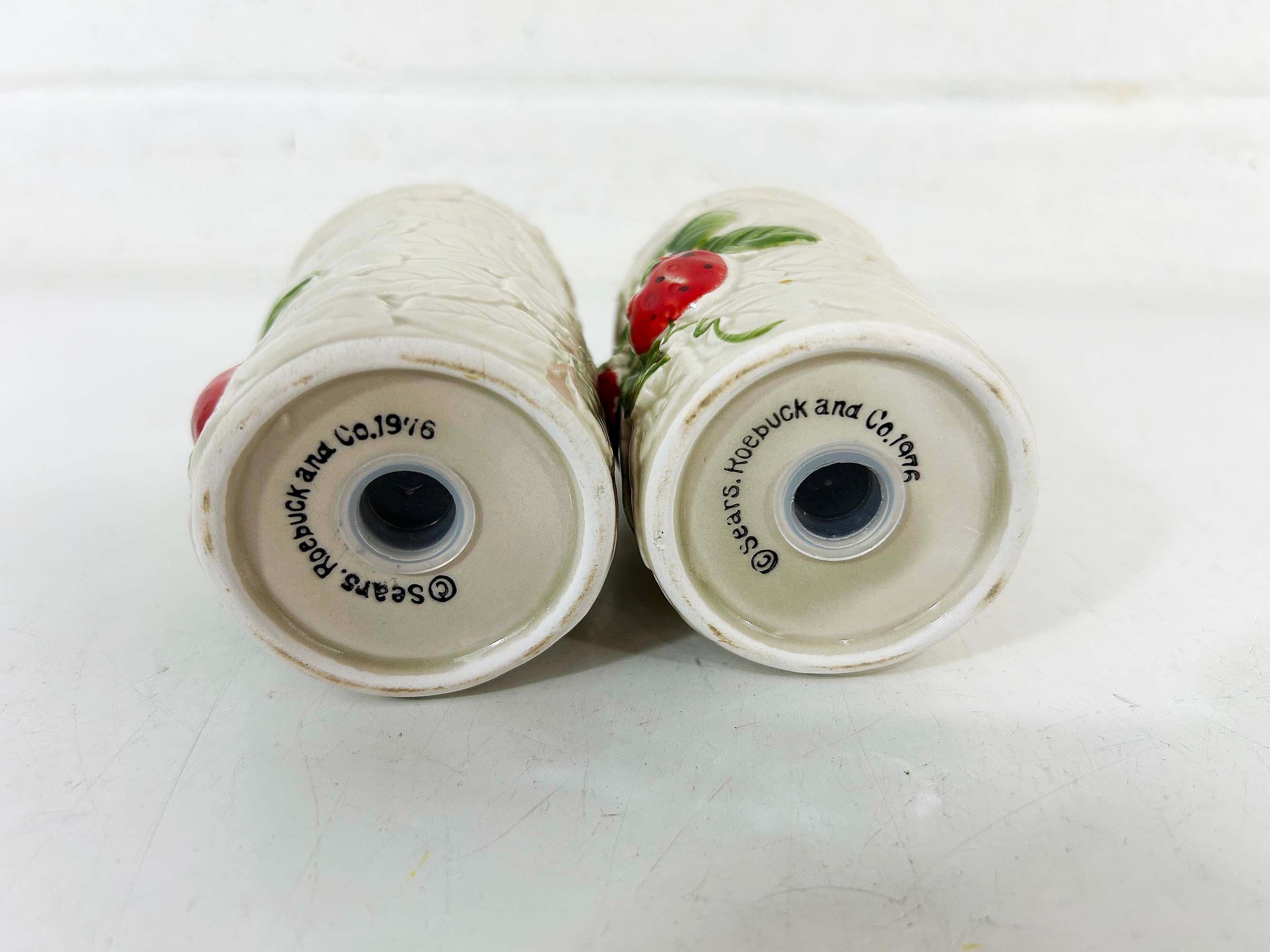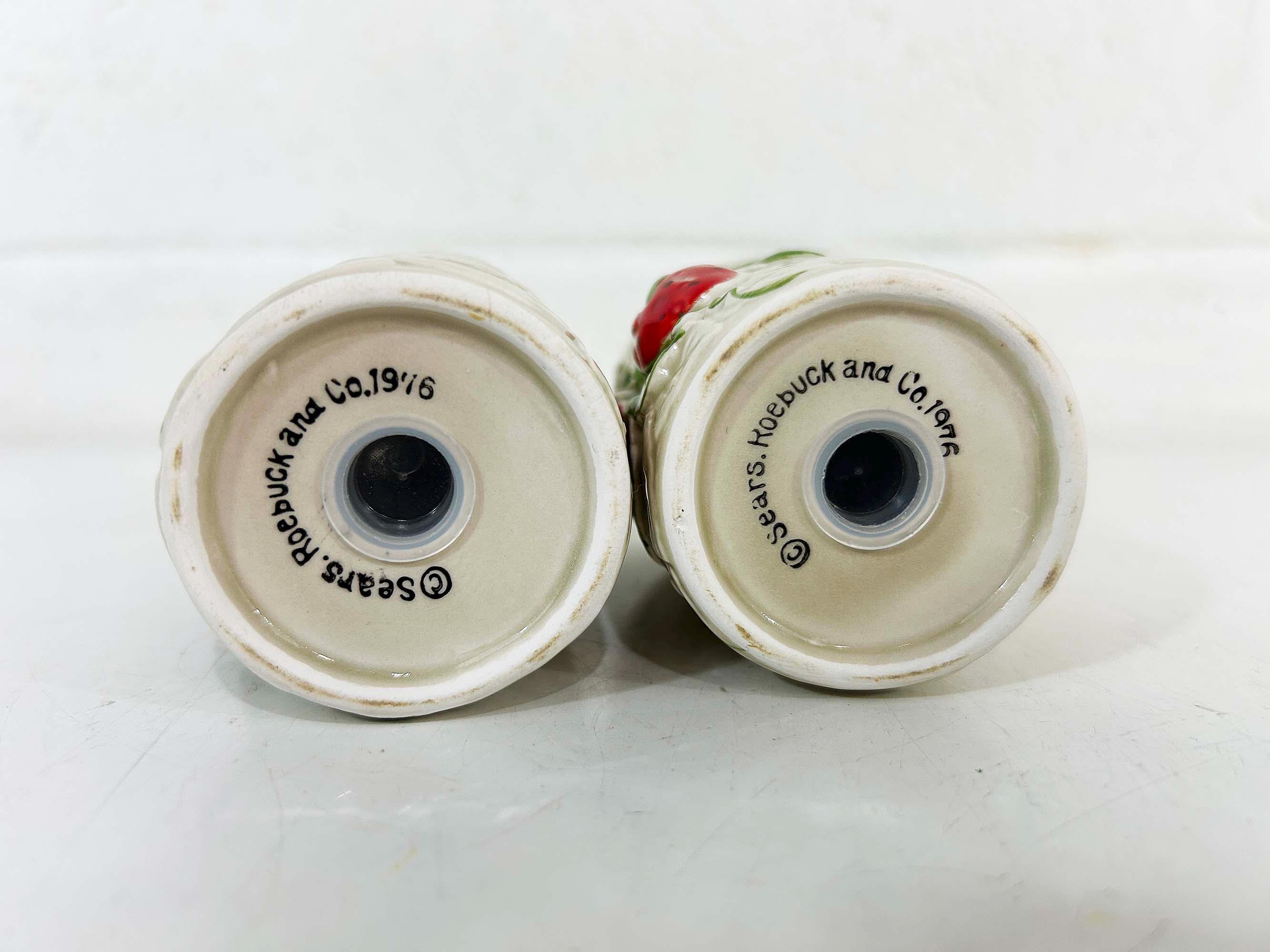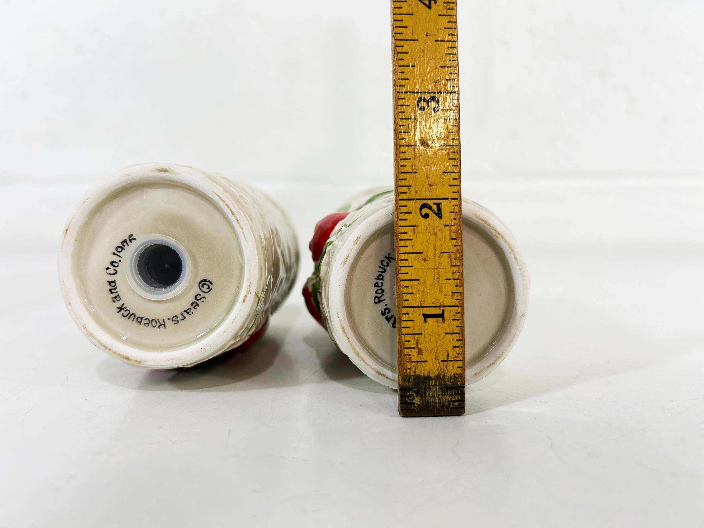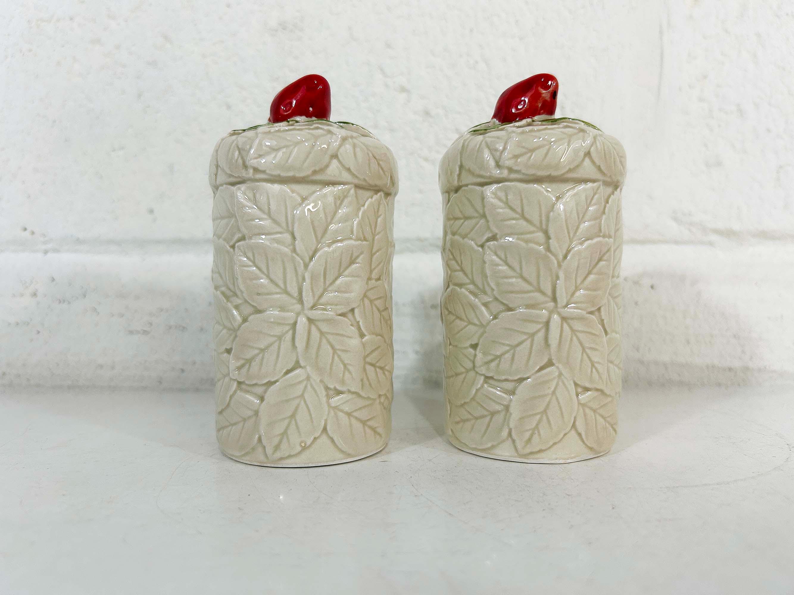 Cute and kitschy strawberry salt and pepper shakers! They are in great condition with only a bit of paint loss and still include their plastic stoppers. Perfect for your vintage kitchen! The shakers are approximately 4 1/2 inches tall and 2 inches in diameter.