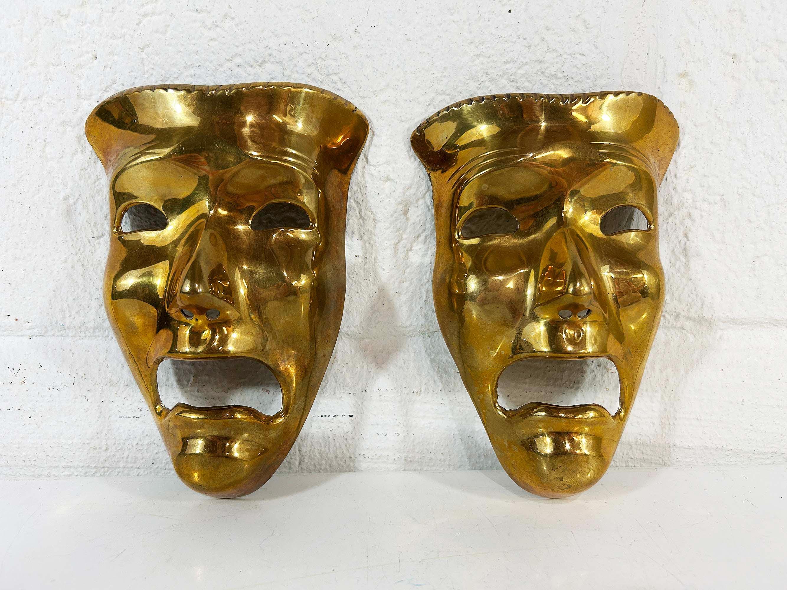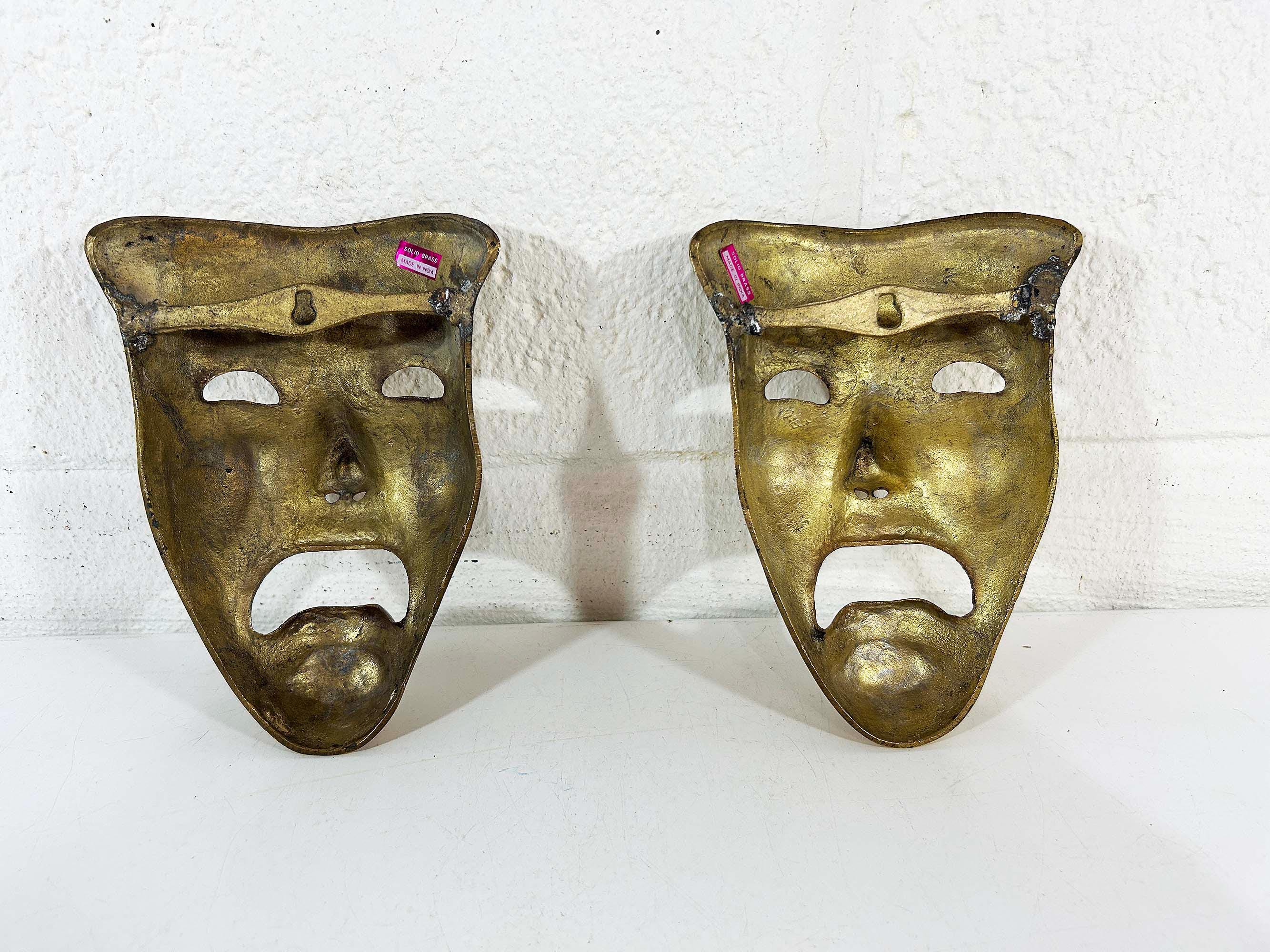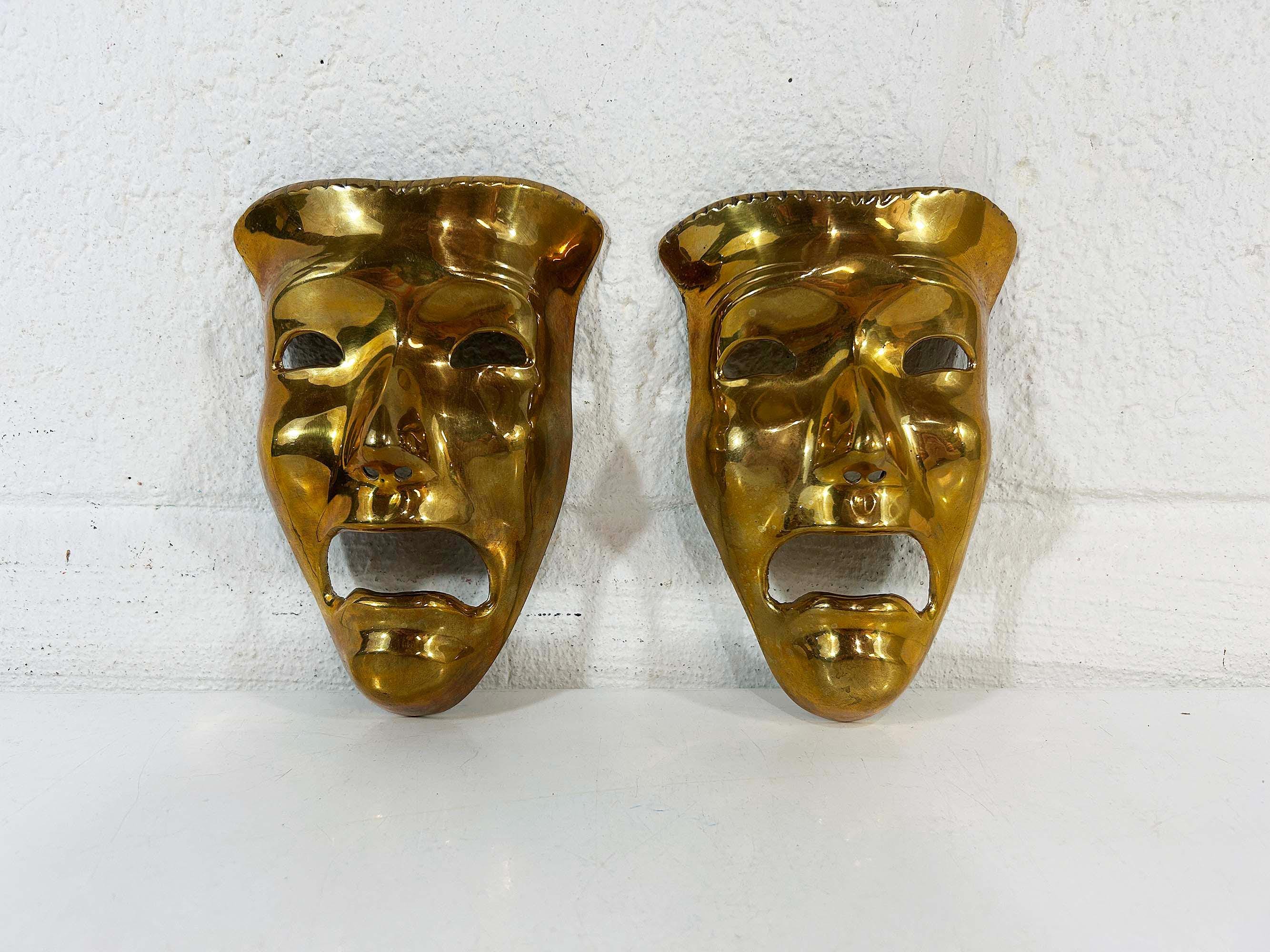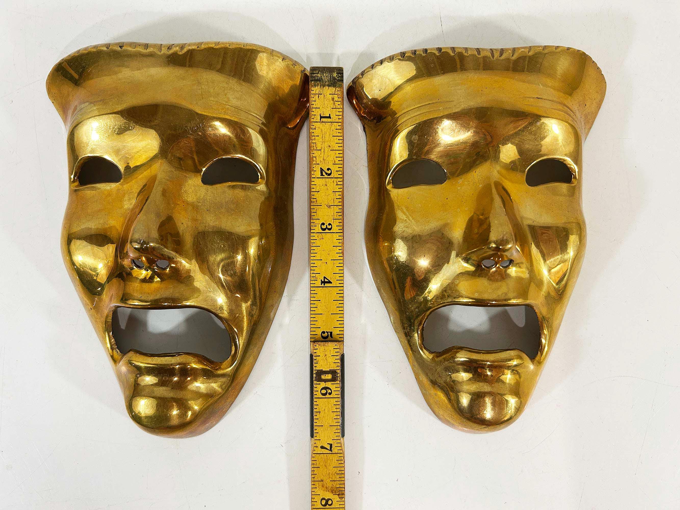 Super cool brass 3D tragedy mask wall hangings. Each wall hanging is approximately 6 1/2 inches long and 4 inches wide. They are in good vintage condition with some oxidation and patina. There are 2 masks available - they are each sold separately.