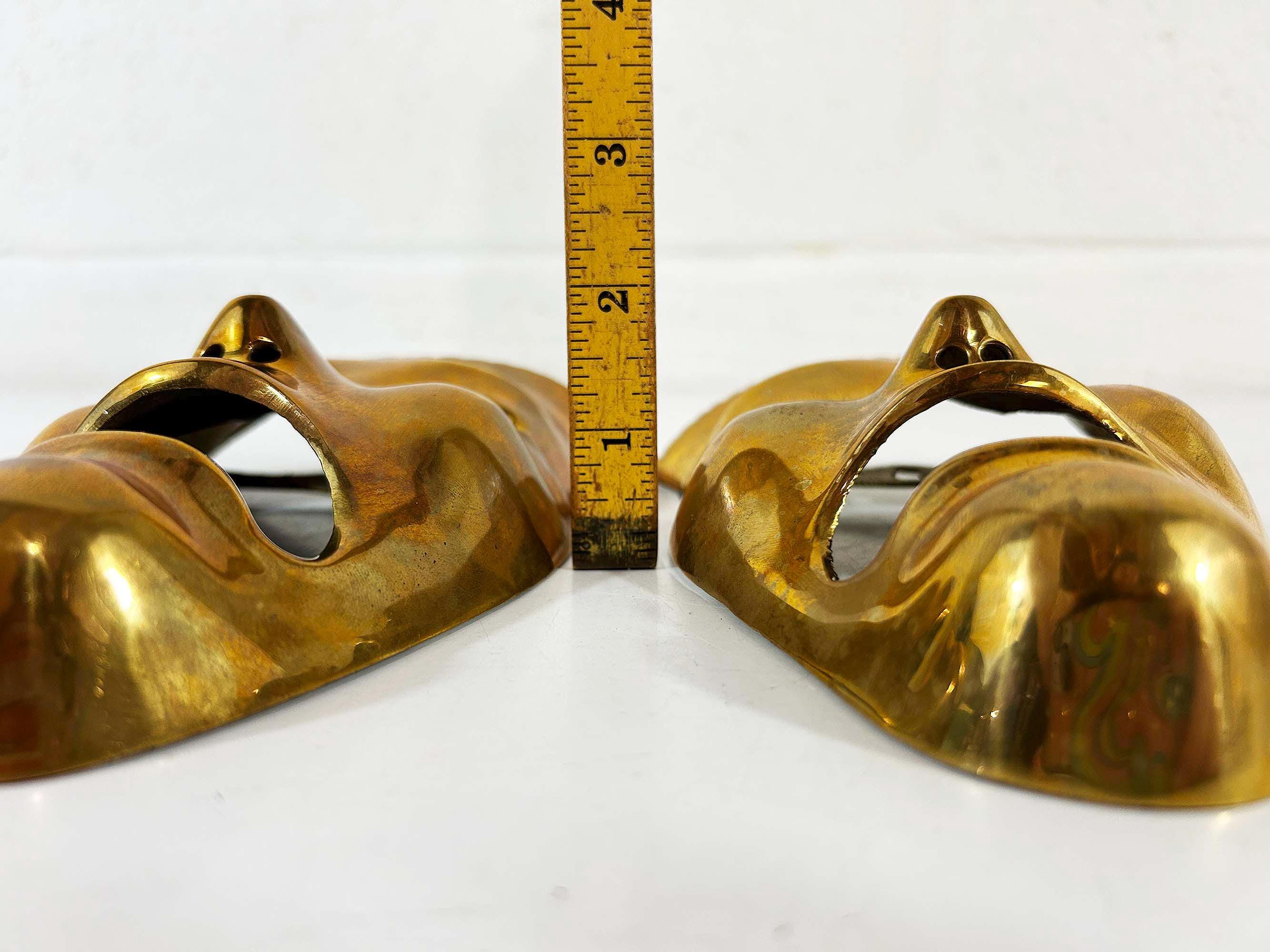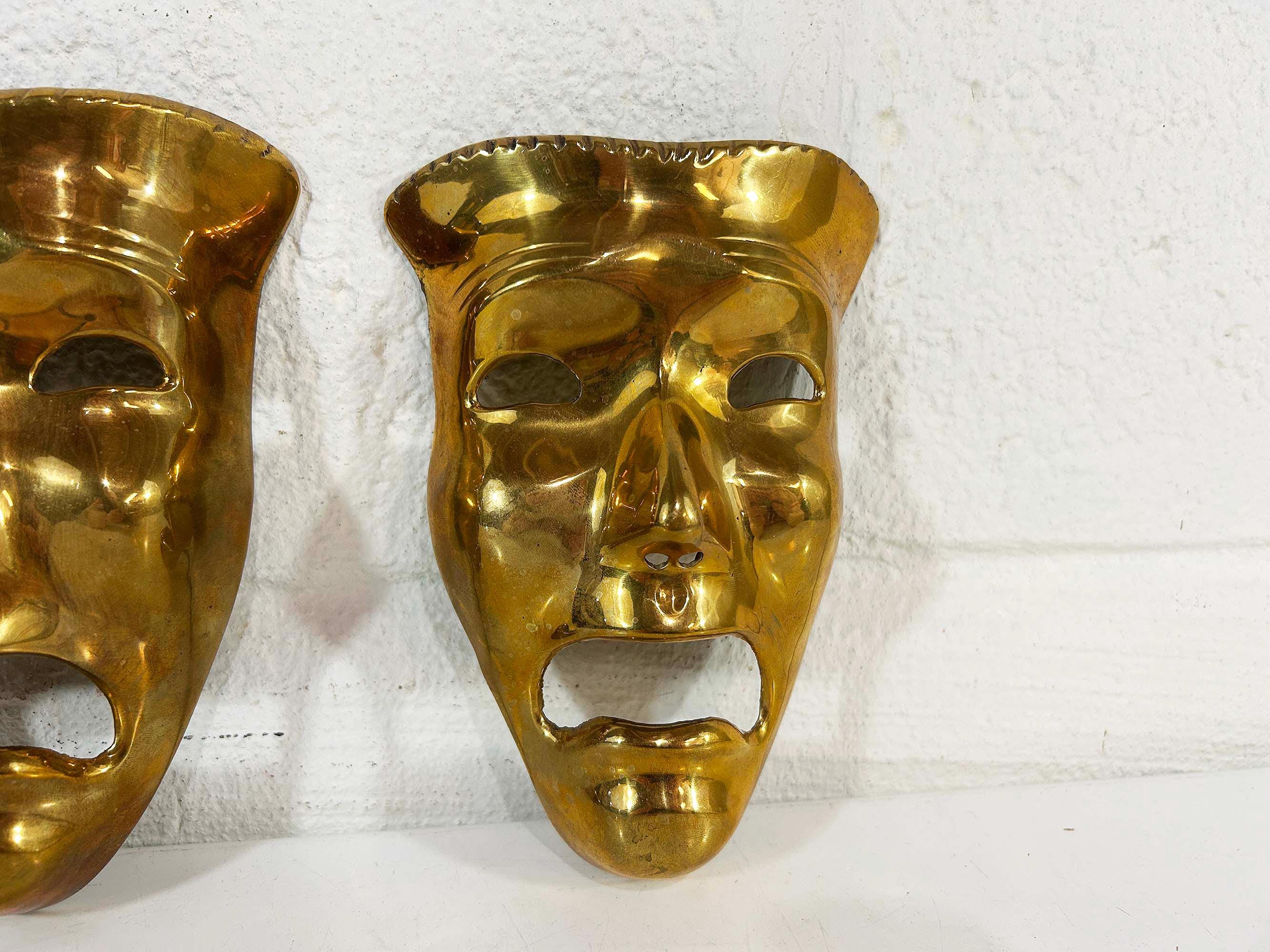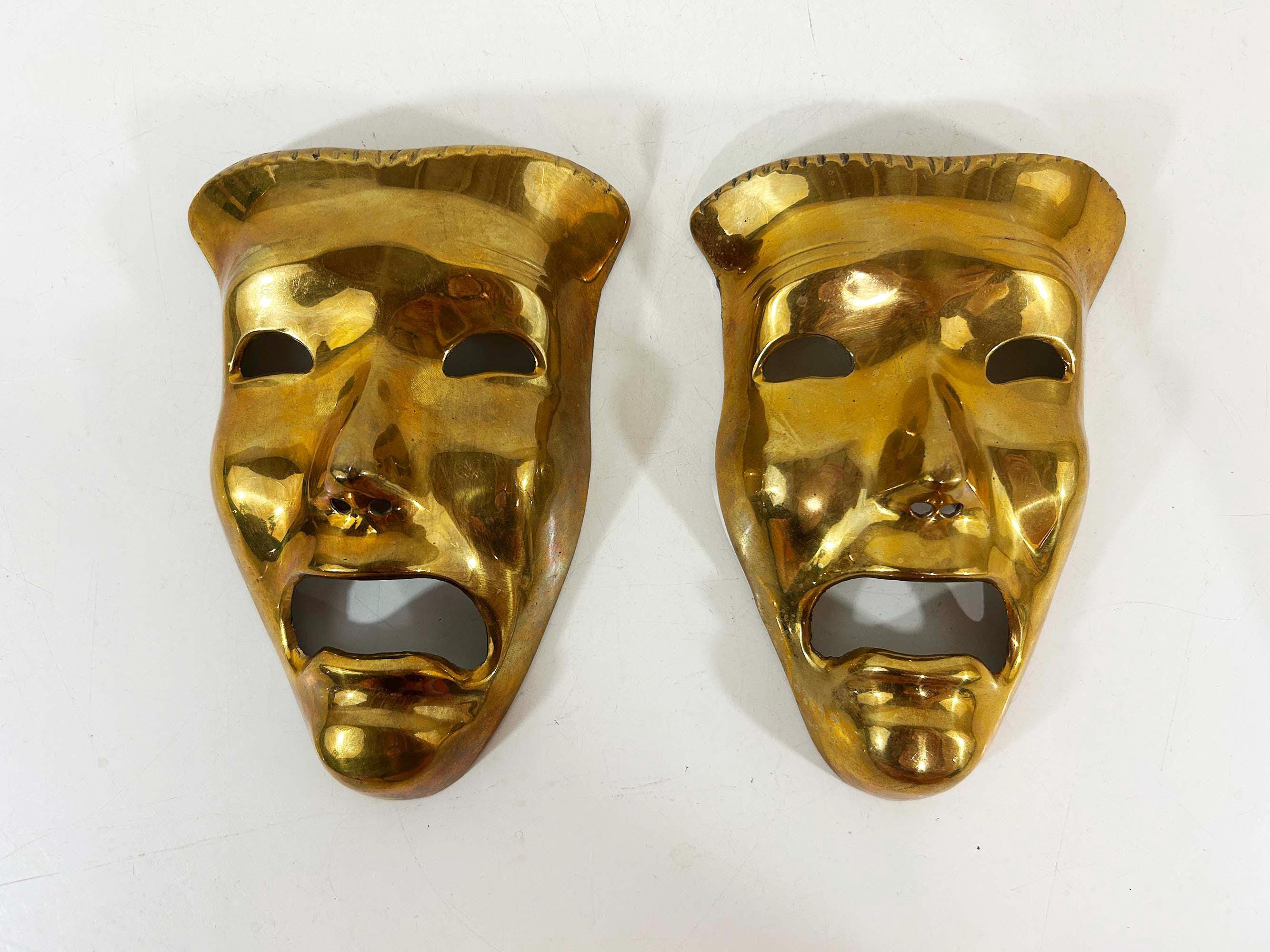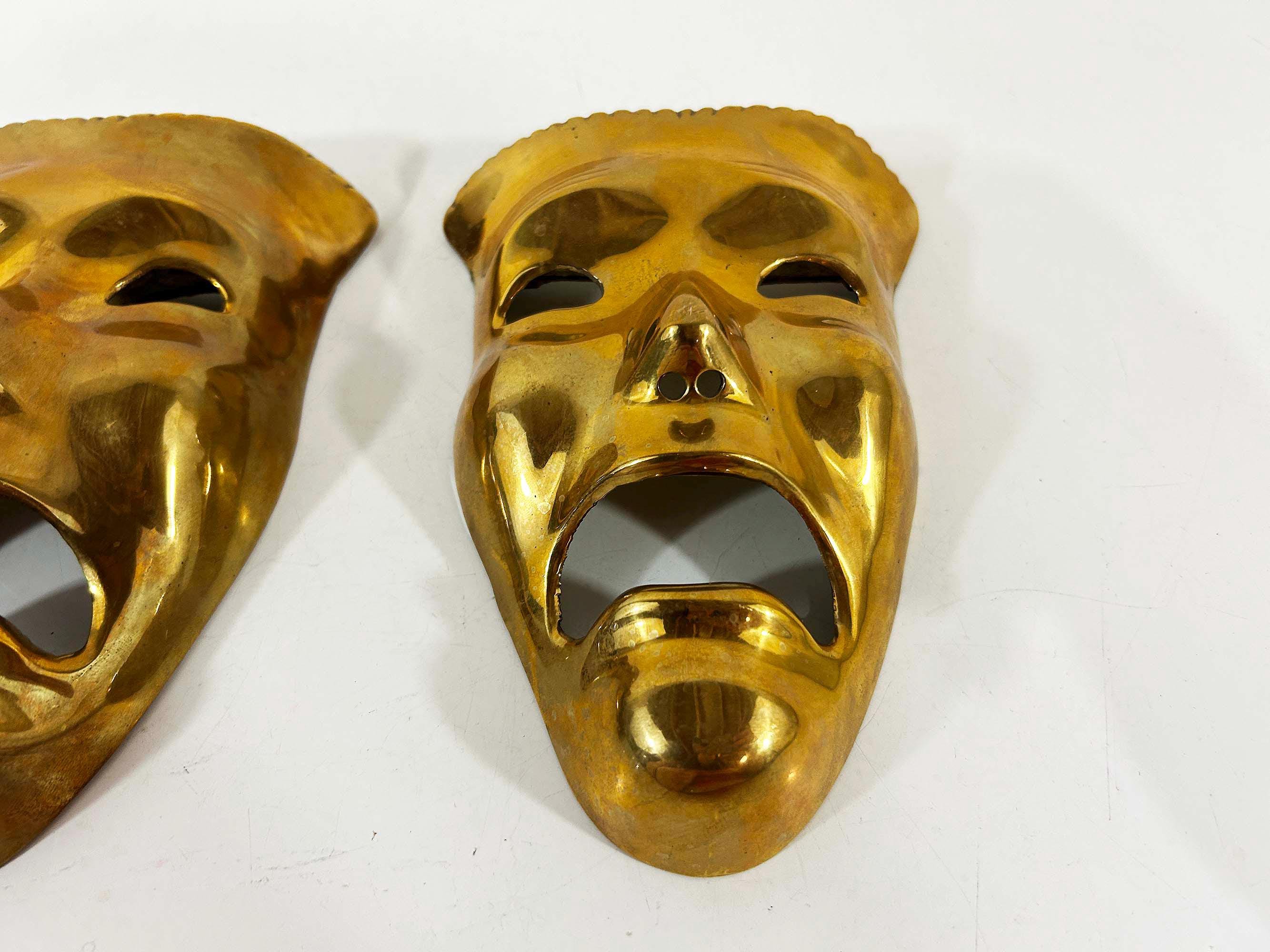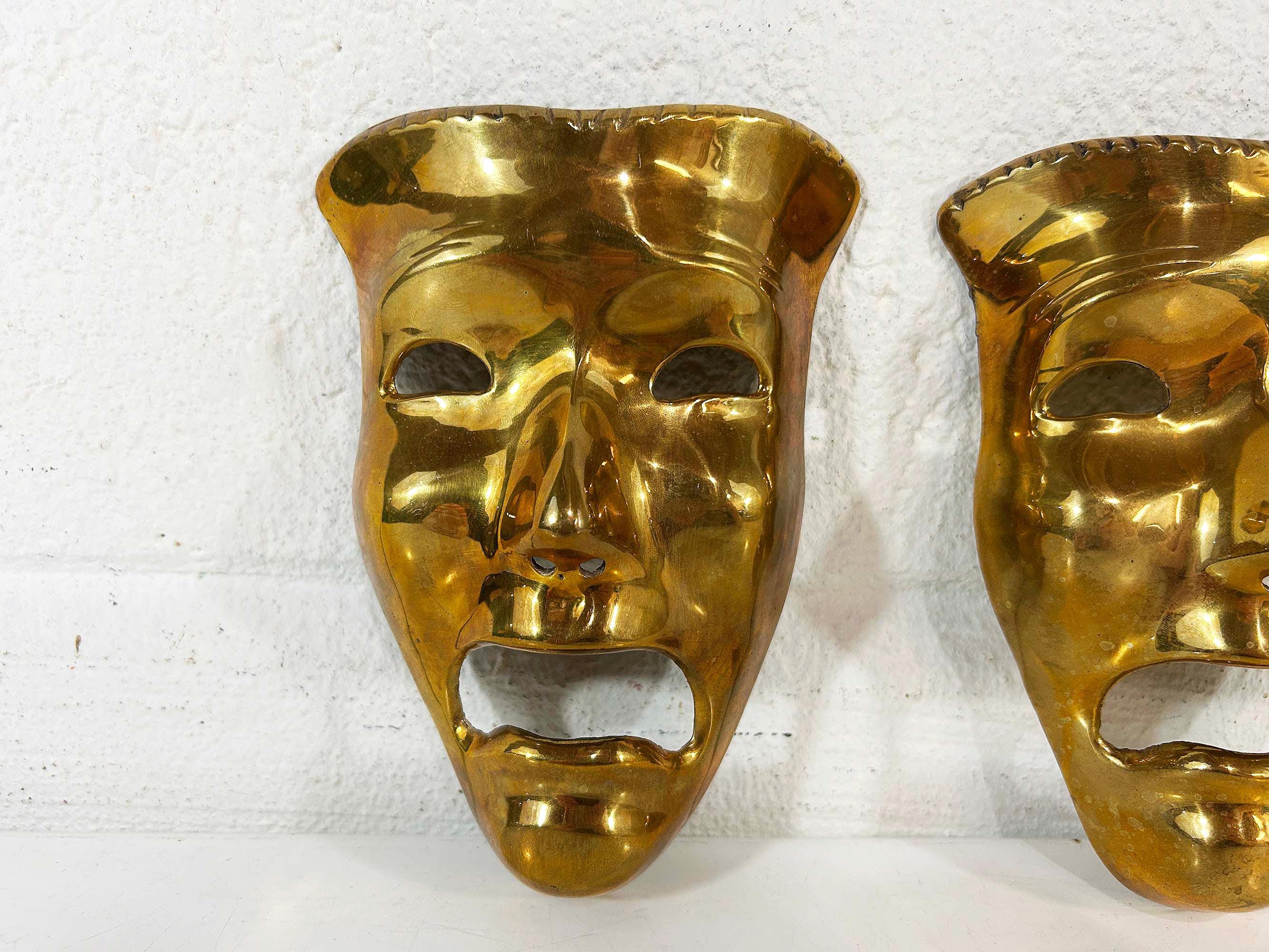 Super cool brass 3D tragedy mask wall hangings. Each wall hanging is approximately 6 1/2 inches long and 4 inches wide. They are in good vintage condition with some oxidation and patina. There are 2 masks available - they are each sold separately.