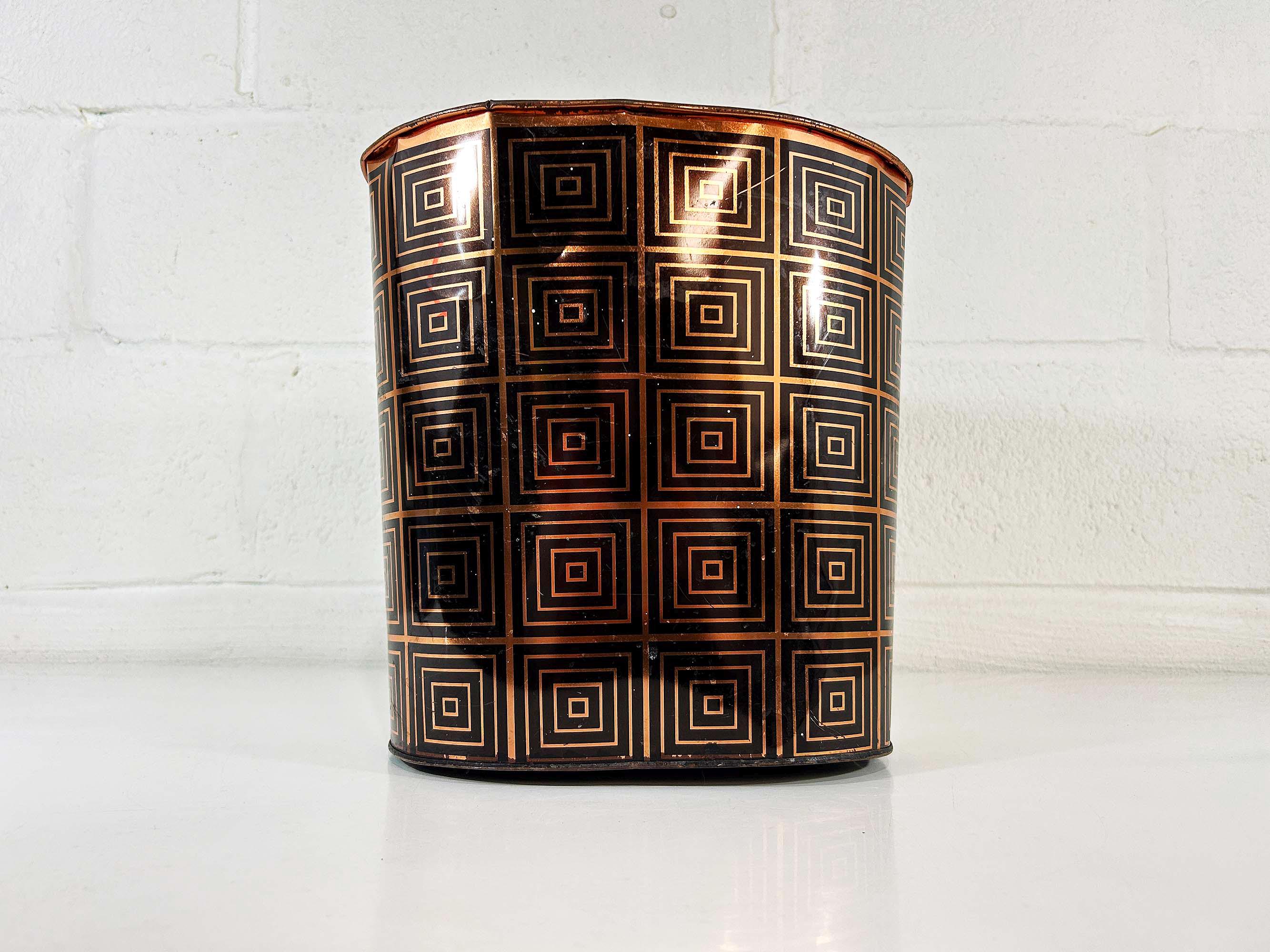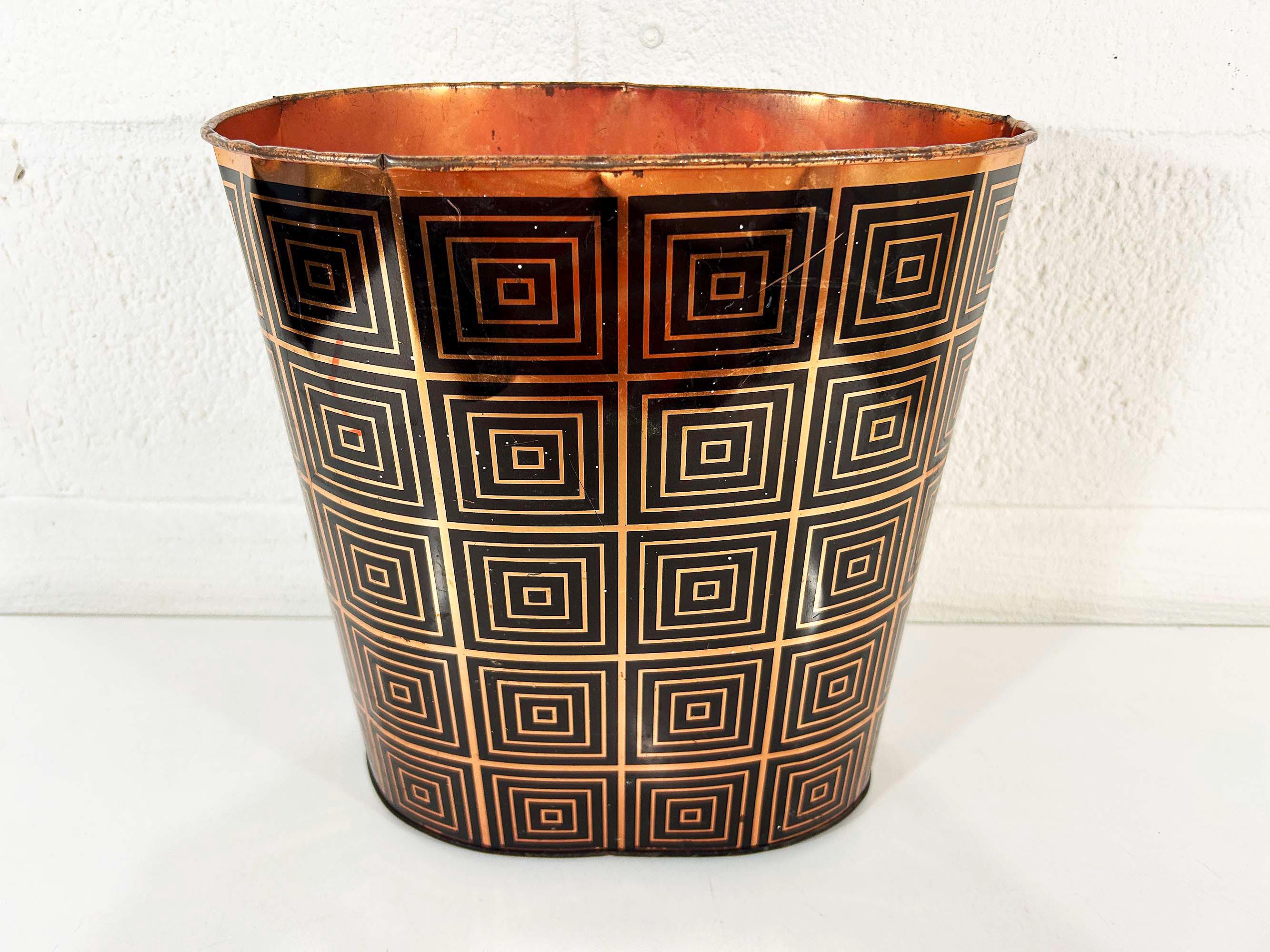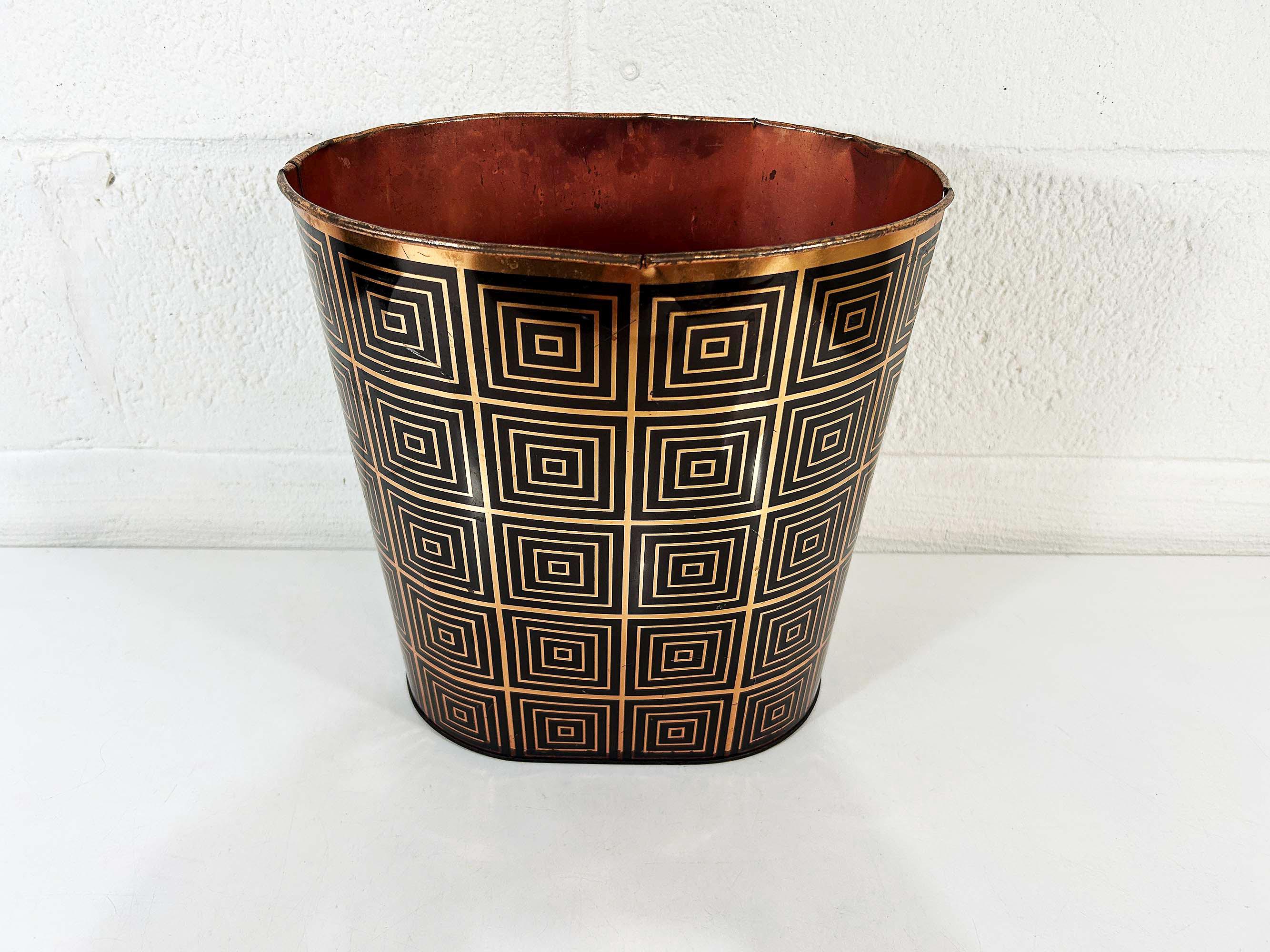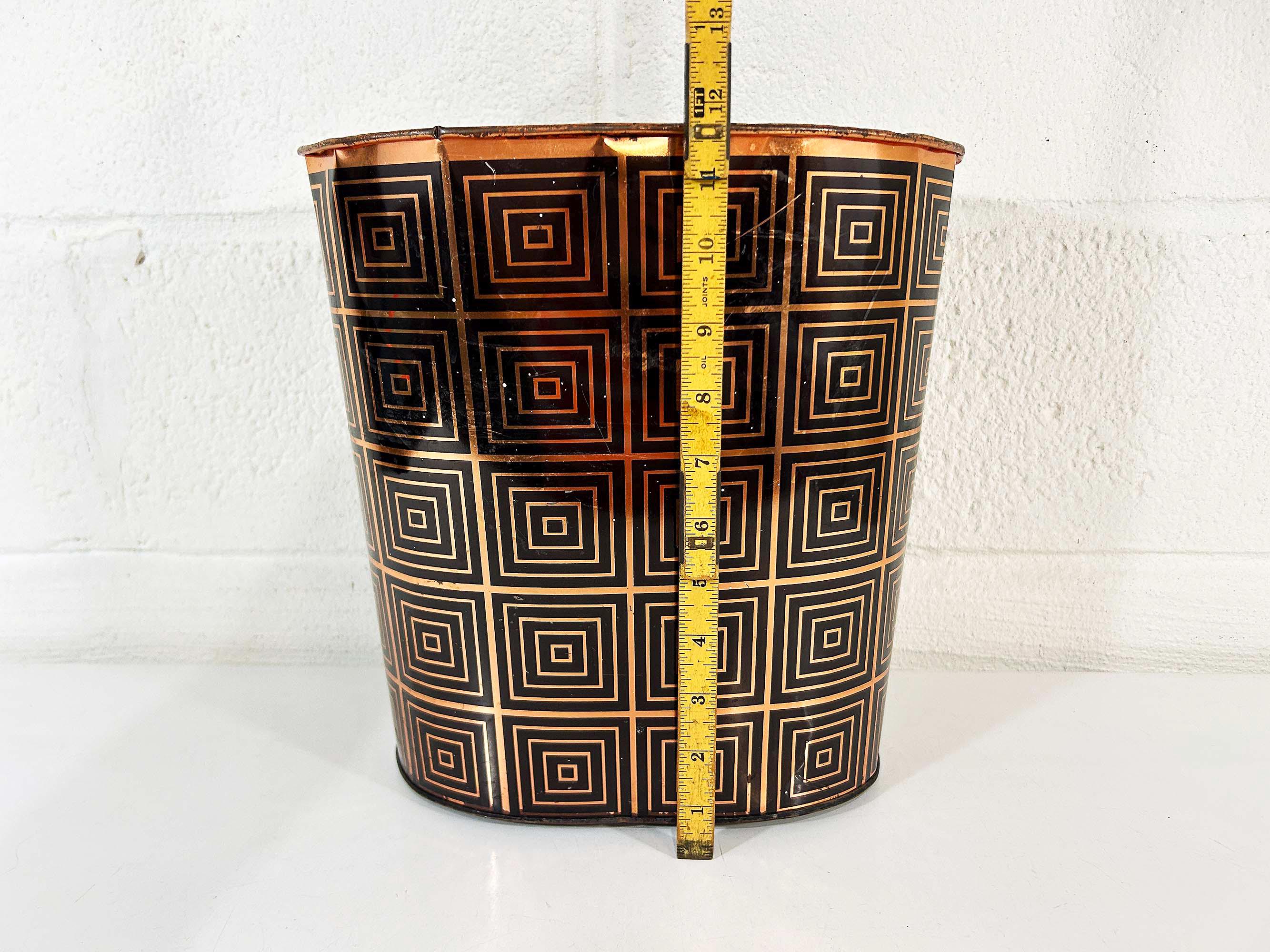 Super cute black and copper geometric metal trash can. Great for a bathroom, office, or kid's room! In fair vintage condition with some scuffs, scratches, and rust mostly on the bottom of the inside. There are a few spots where the rim of the trash can has split - please be sure to inspect all photos closely. The trash can is approximately 11 1/2 inches tall, 11 inches wide, and 8 inches deep.