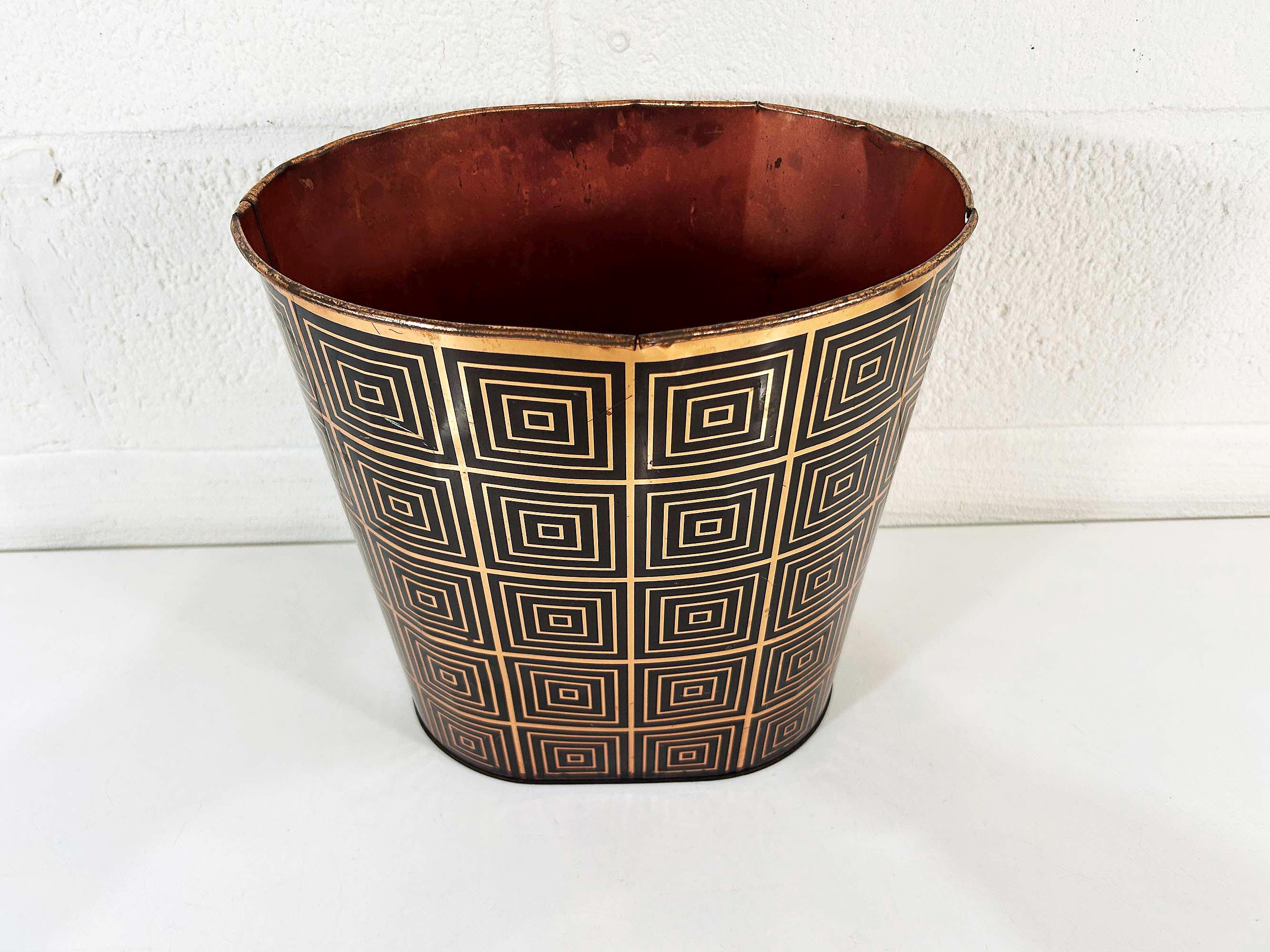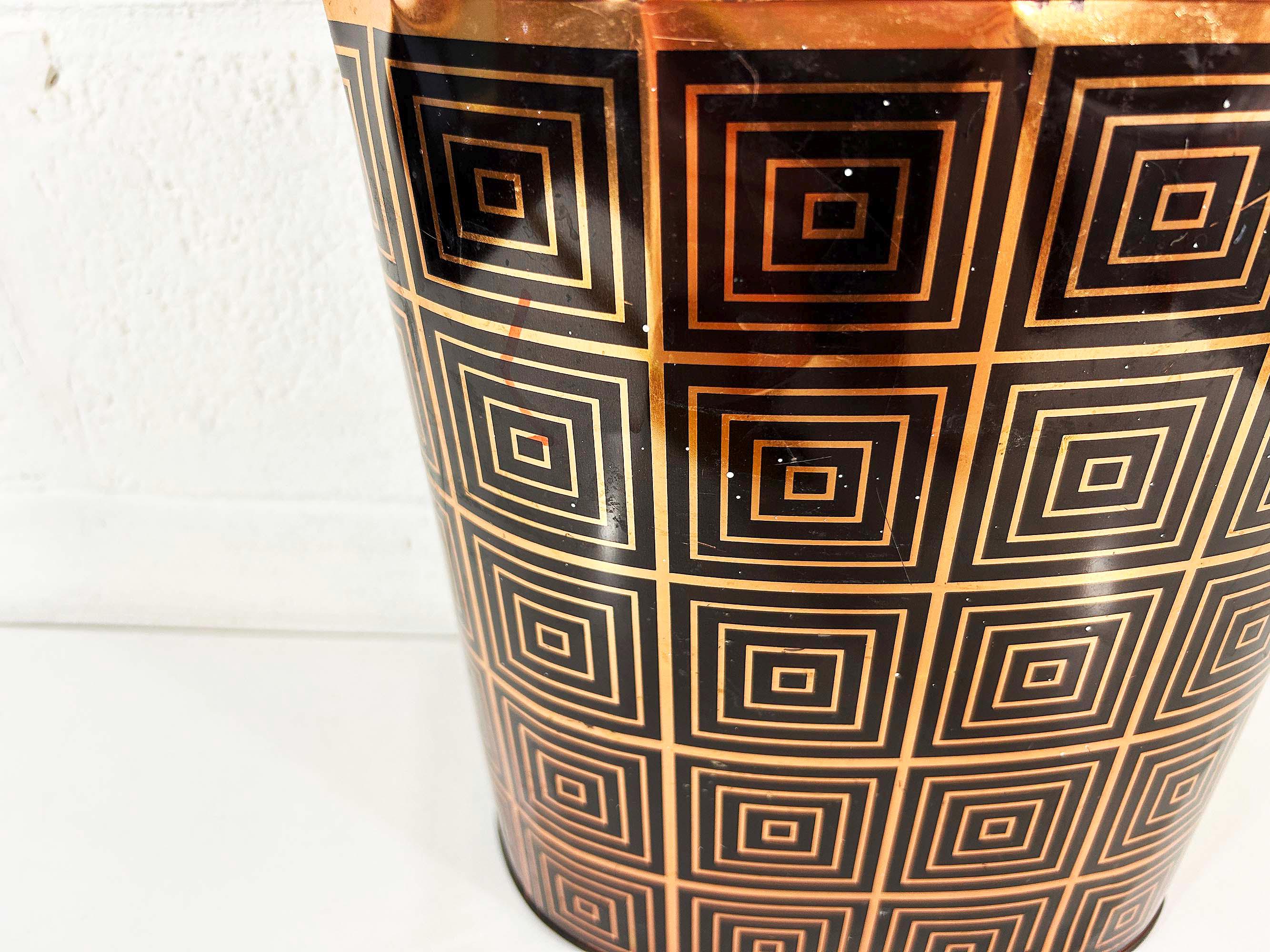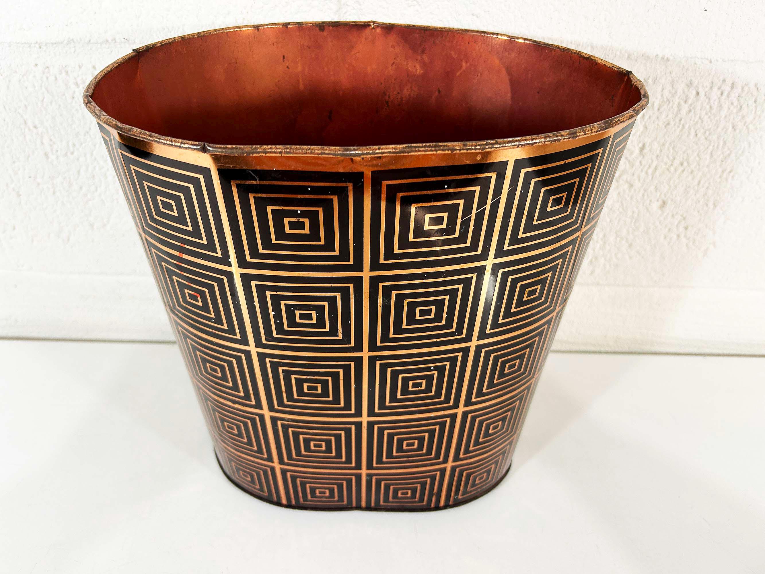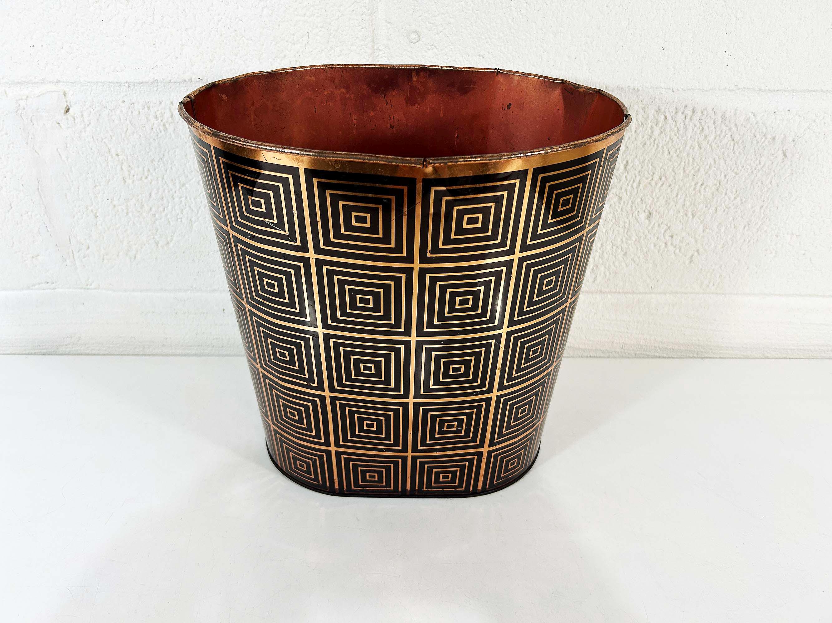 Super cute black and copper geometric metal trash can. Great for a bathroom, office, or kid's room! In fair vintage condition with some scuffs, scratches, and rust mostly on the bottom of the inside. There are a few spots where the rim of the trash can has split - please be sure to inspect all photos closely. The trash can is approximately 11 1/2 inches tall, 11 inches wide, and 8 inches deep.